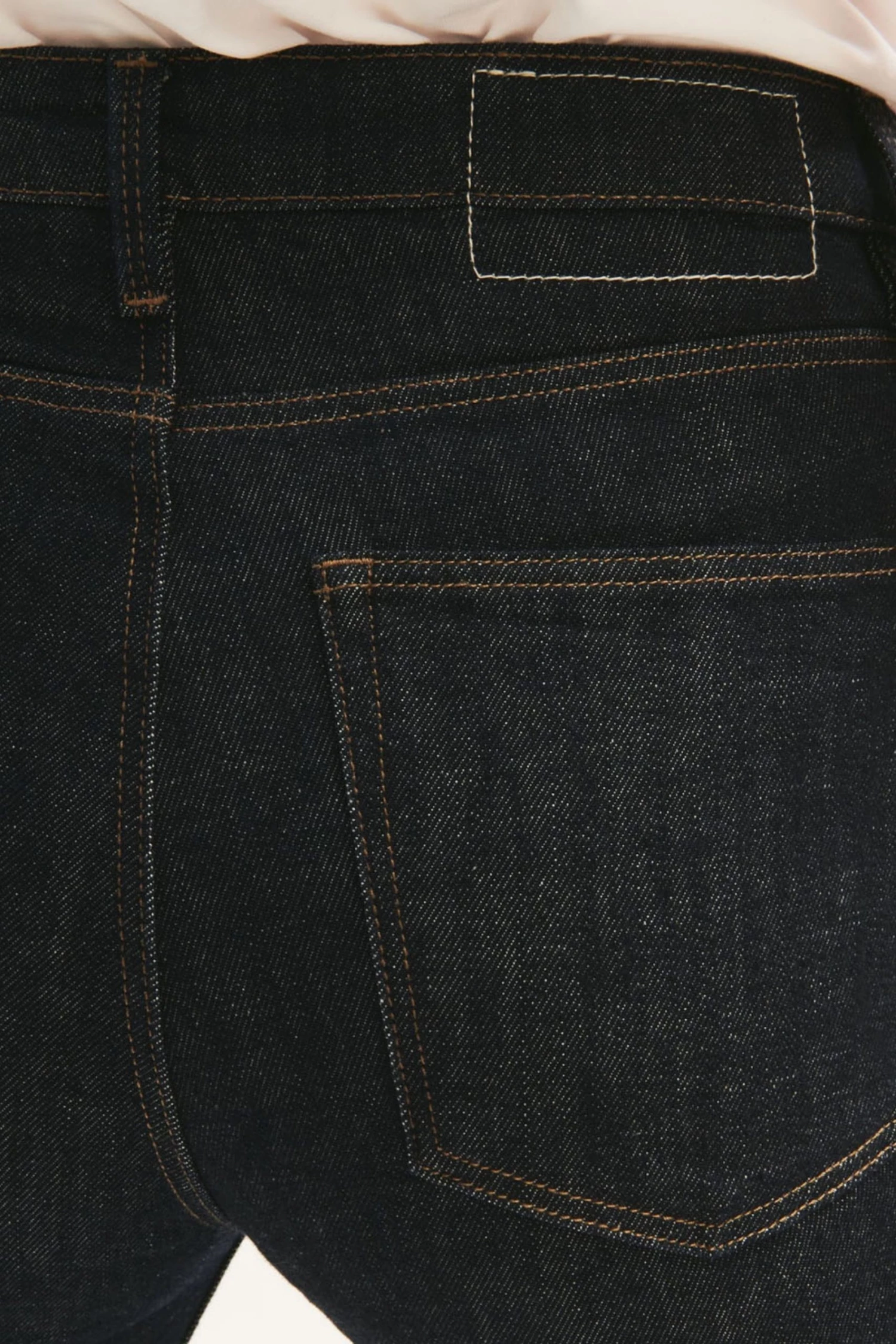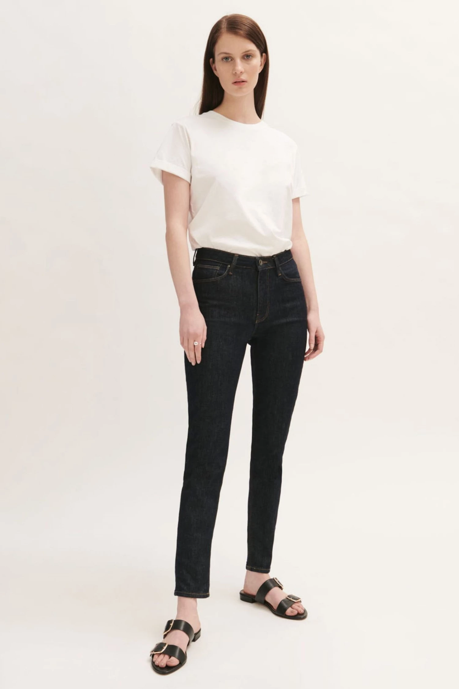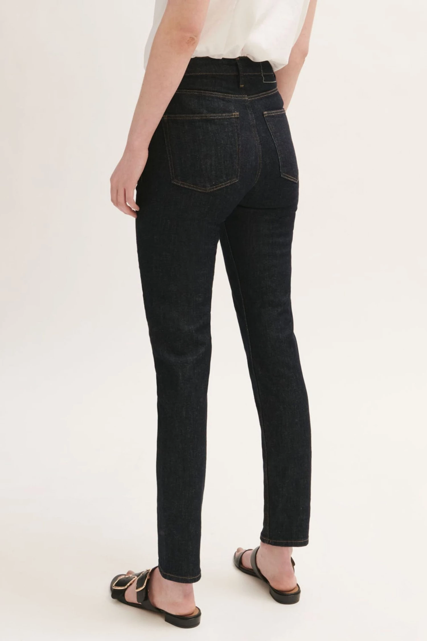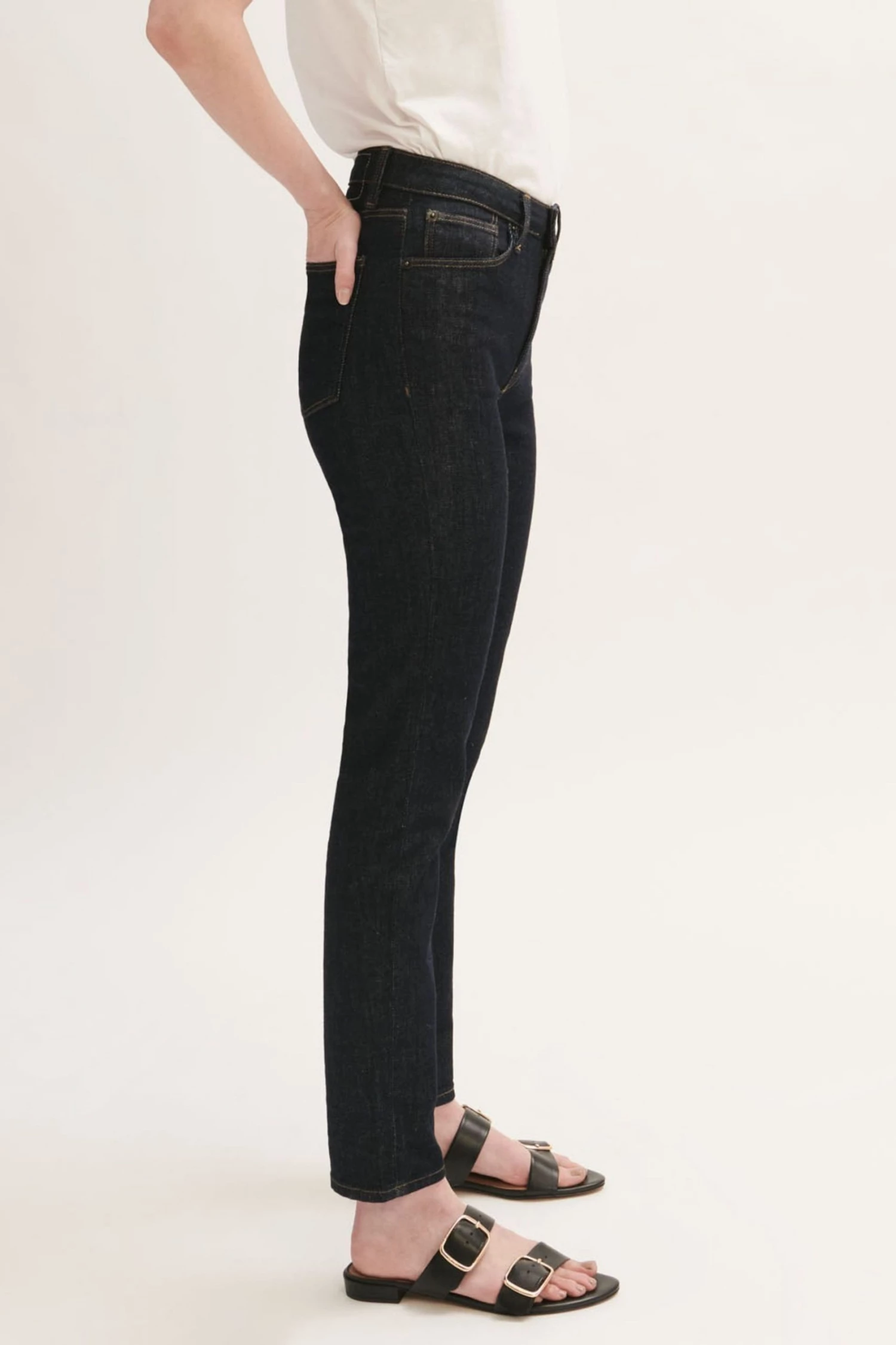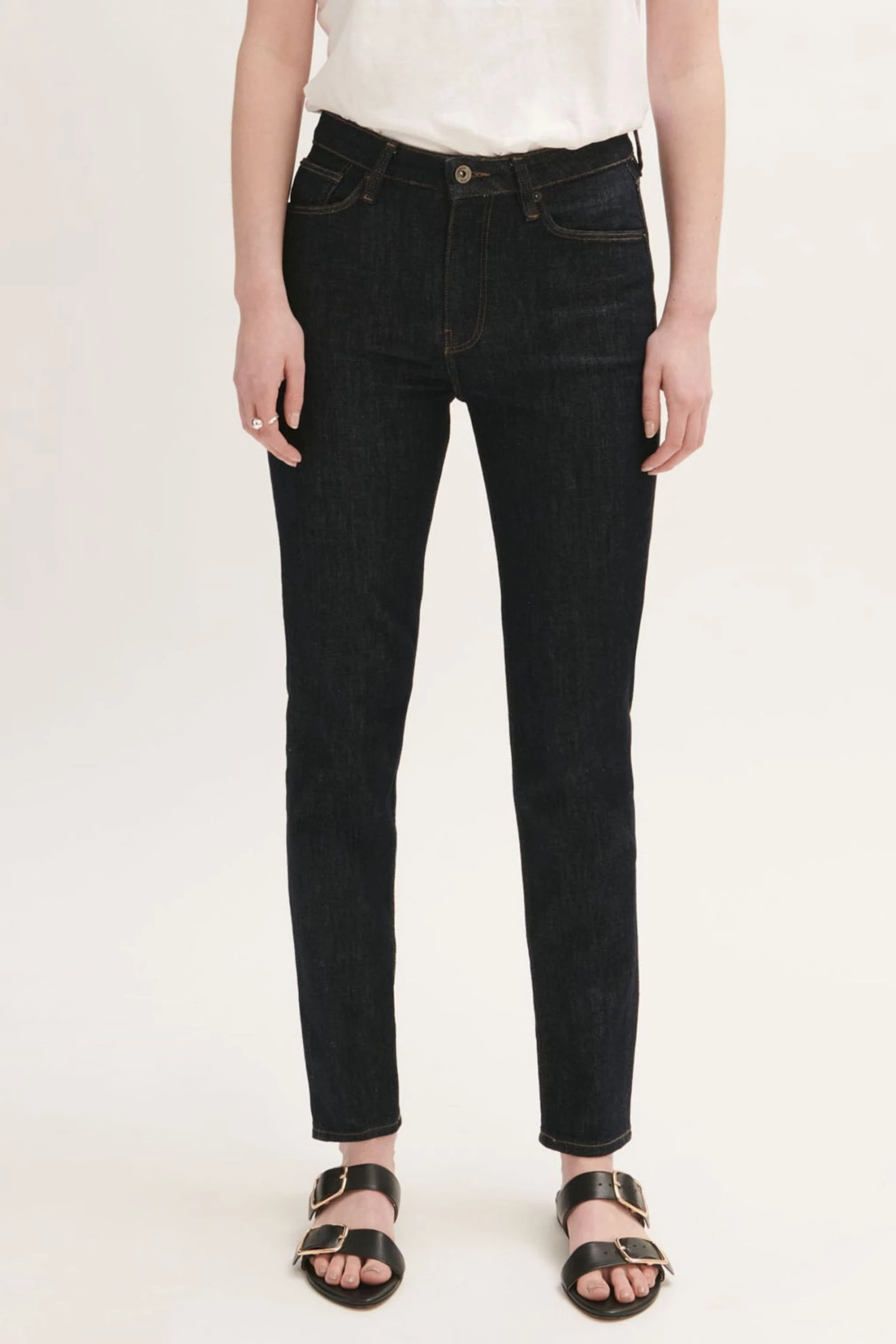 Classic slim leg ankle crop. Medium-high rise. Skinny fit from hips to knees. Slim fit from knees to hem. Comfort stretch denim. Main fabric is sustainable cotton, produced with recycled polyester sewing threads and zip tapes. Produced with low EIM (Low Environmental Impact Measuring) score.