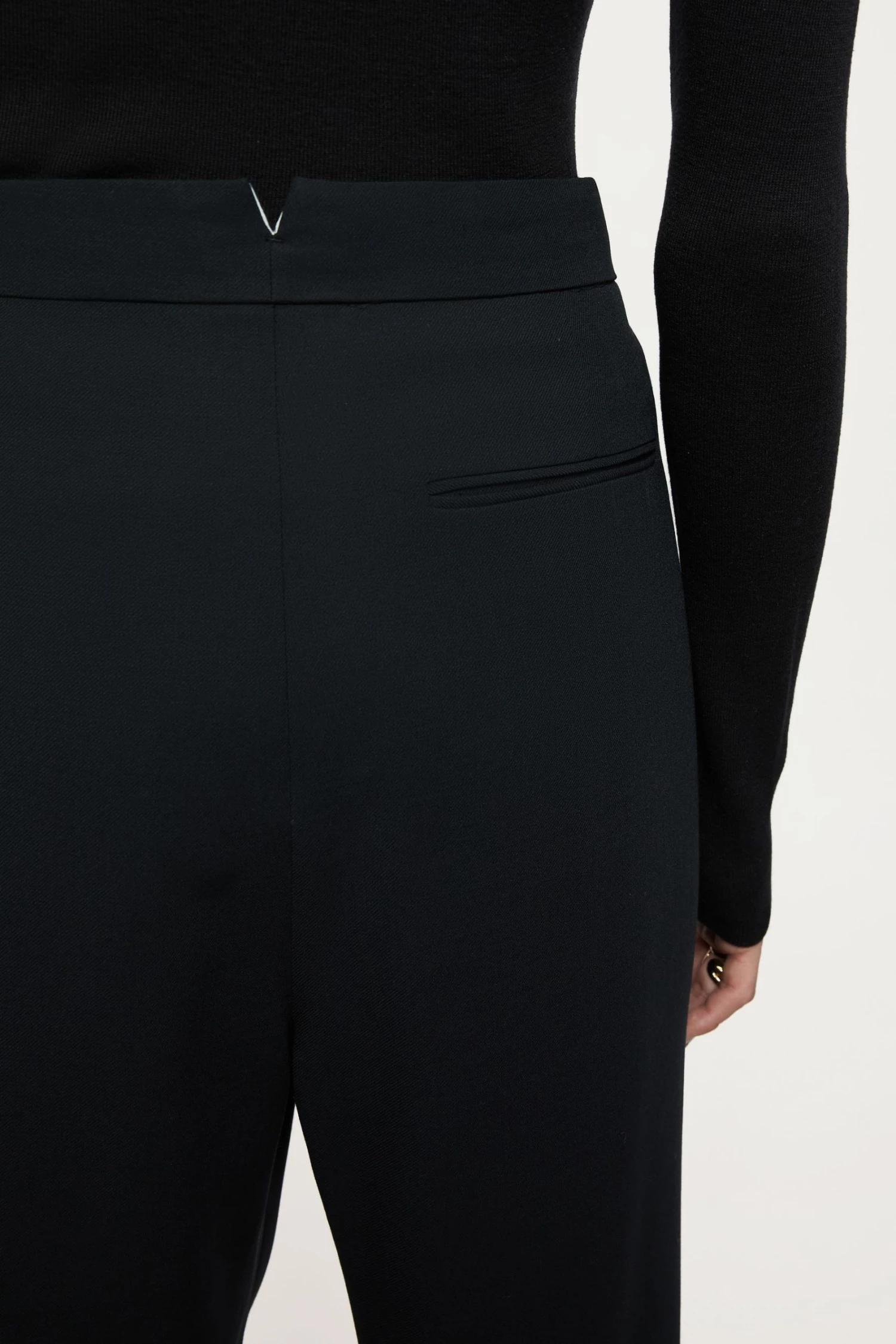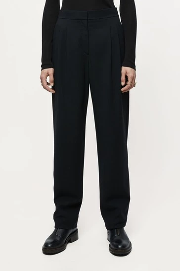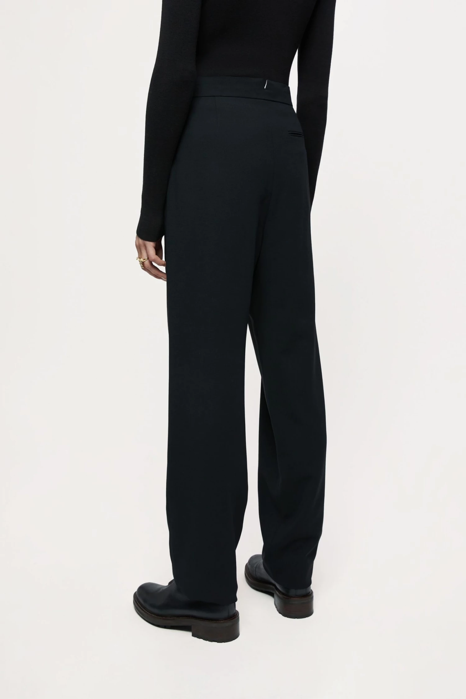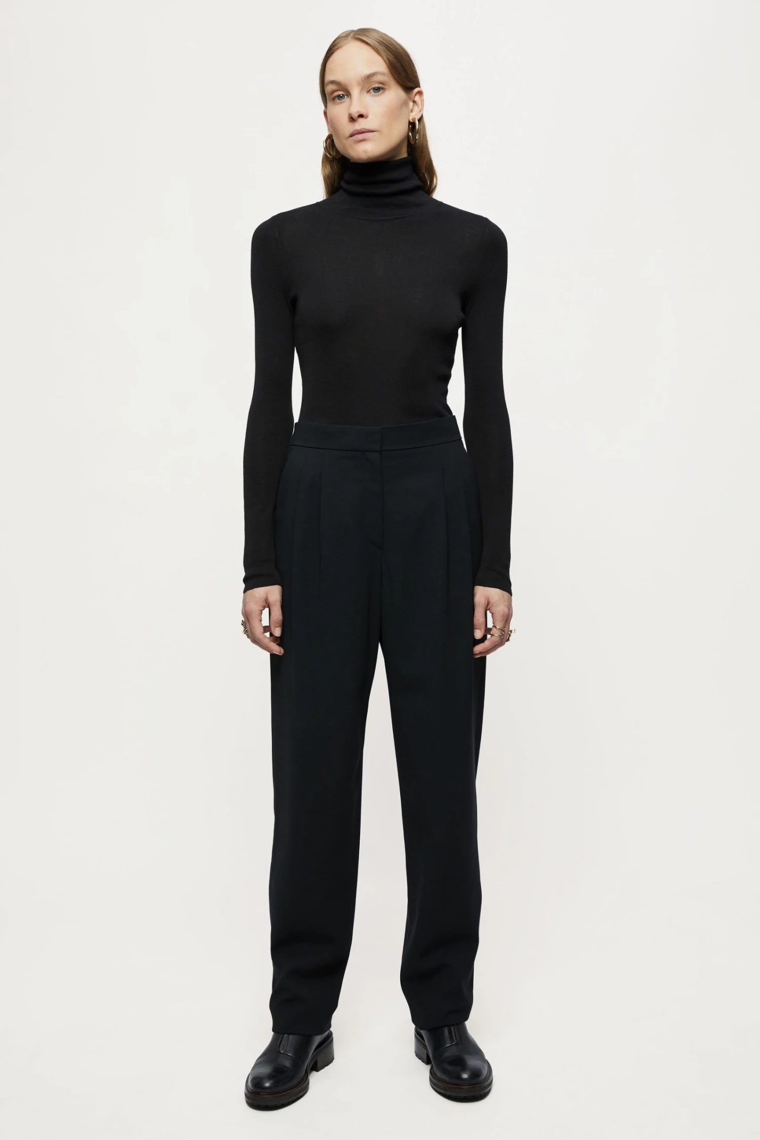 Relaxed pleat front trouser in soft wool with a fluid twill weave. Designed with a wide leg and tailored waistband, fly front with concealed hook and bar closure. Features practical side and back pockets. Style with a leather blazer or as a suit.