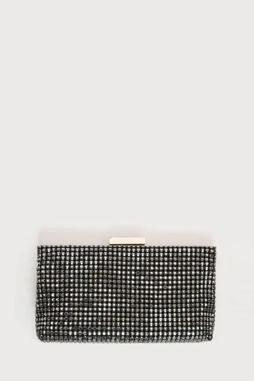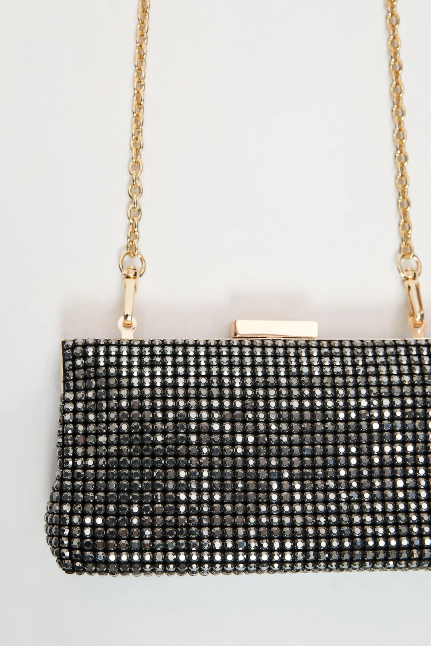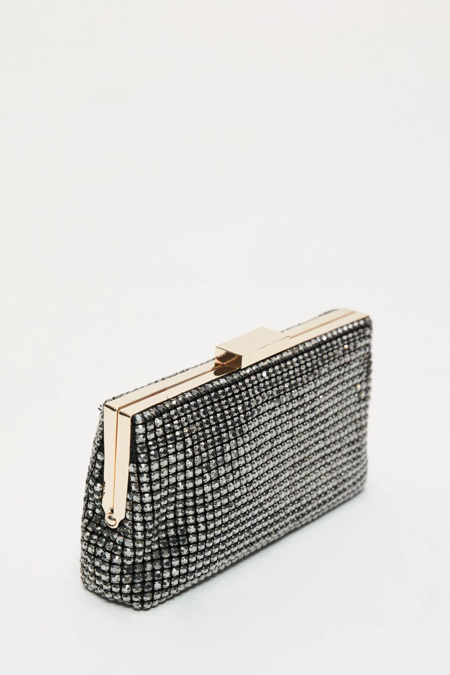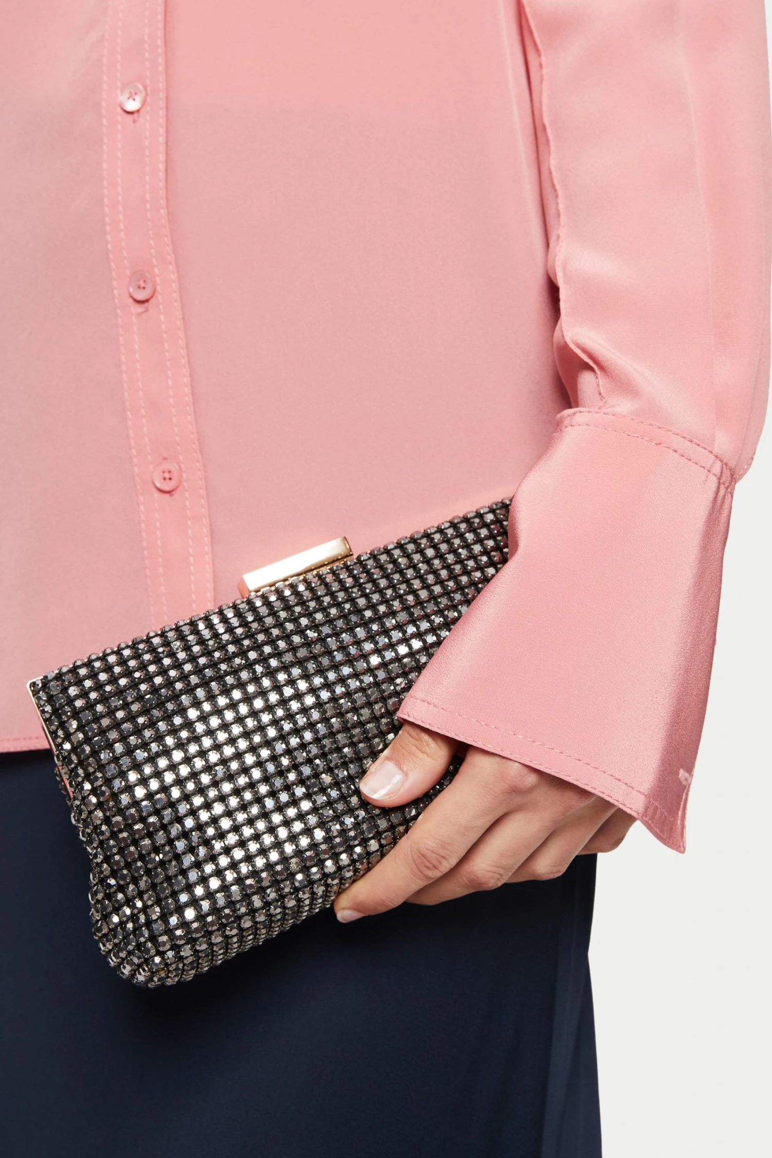Crystal evening bag crafted from smoke coloured crystal mesh which allows for a soft structure, enclosed in a silver metal frame with a clasp closure and lined with satin feel fabric. This clutch perfectly fits your phone and essentials for any event. Finished with a detachable chain strap, wear yours on the shoulder or carried in hand for the ideal evening look.