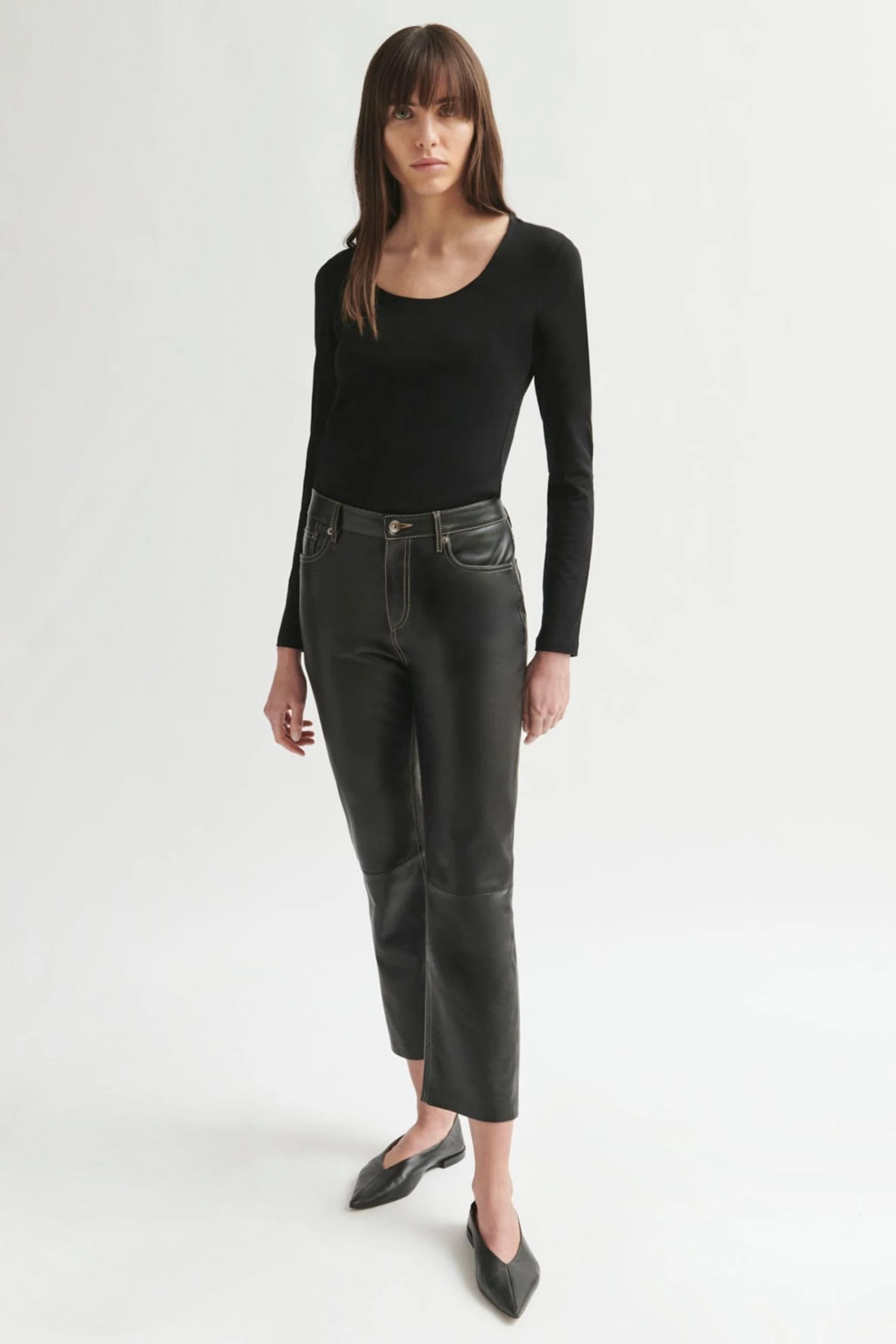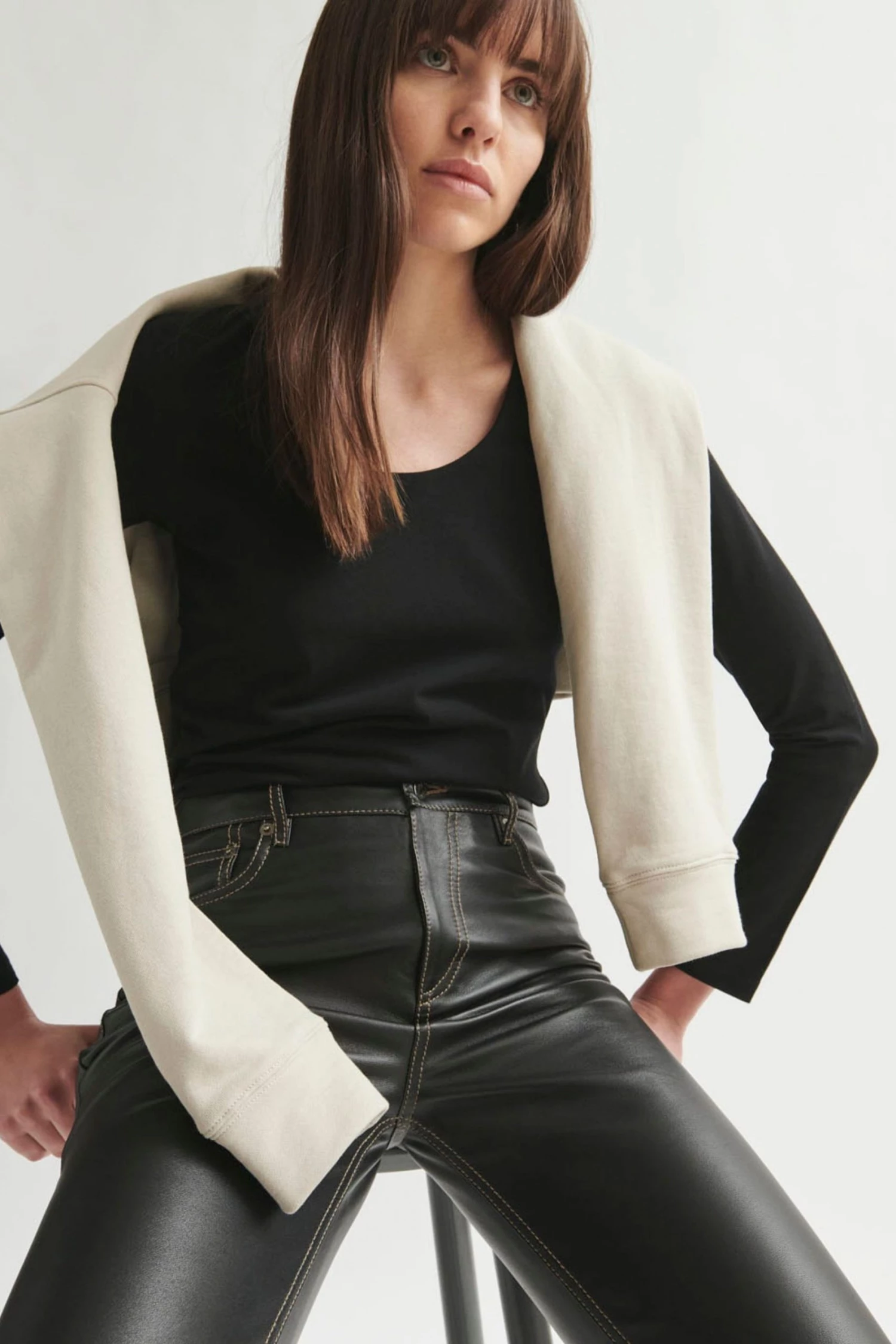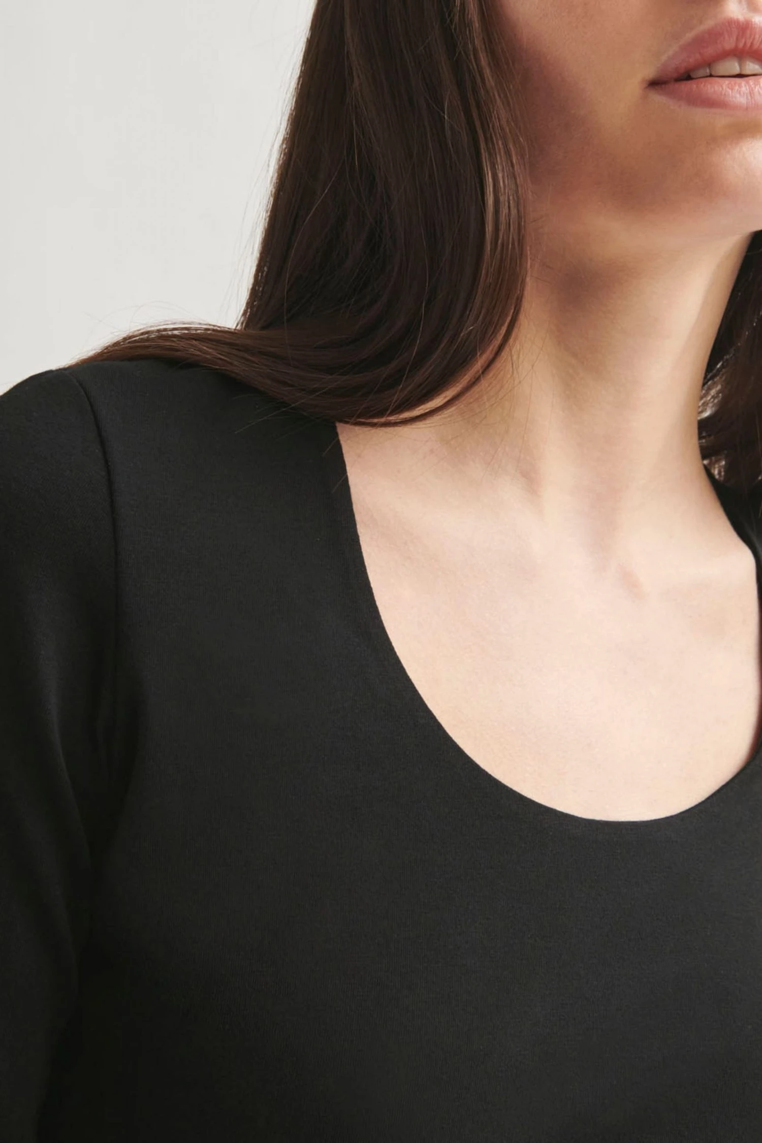 Soft, stretch cotton jersey tee. Double fronted design. Scoop neck. Long sleeves. Layering piece.