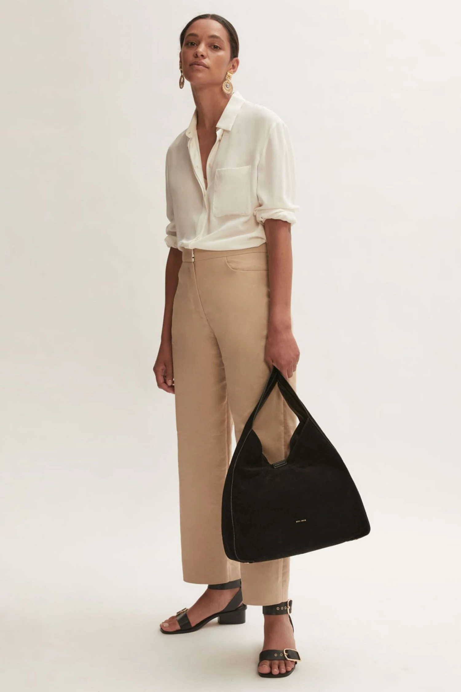 A soft slouch bag made from suede leather with a full cotton fabric lining. This roomy style has a magnet closure, internal zipped back pocket and flat front facing pocket for easy access. Metal feet on the base to prevent the suede from getting dirty.