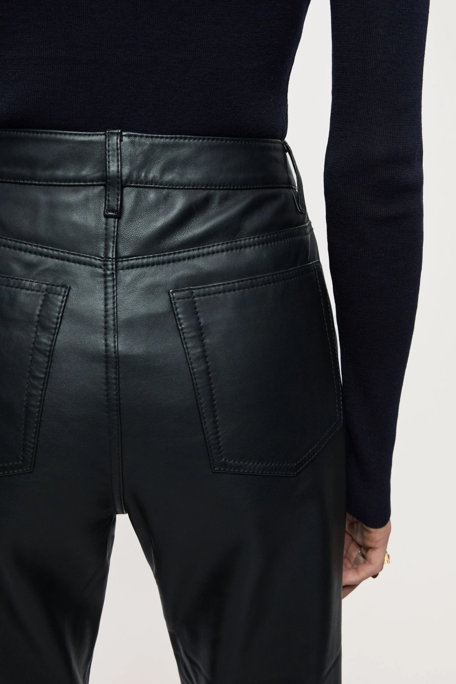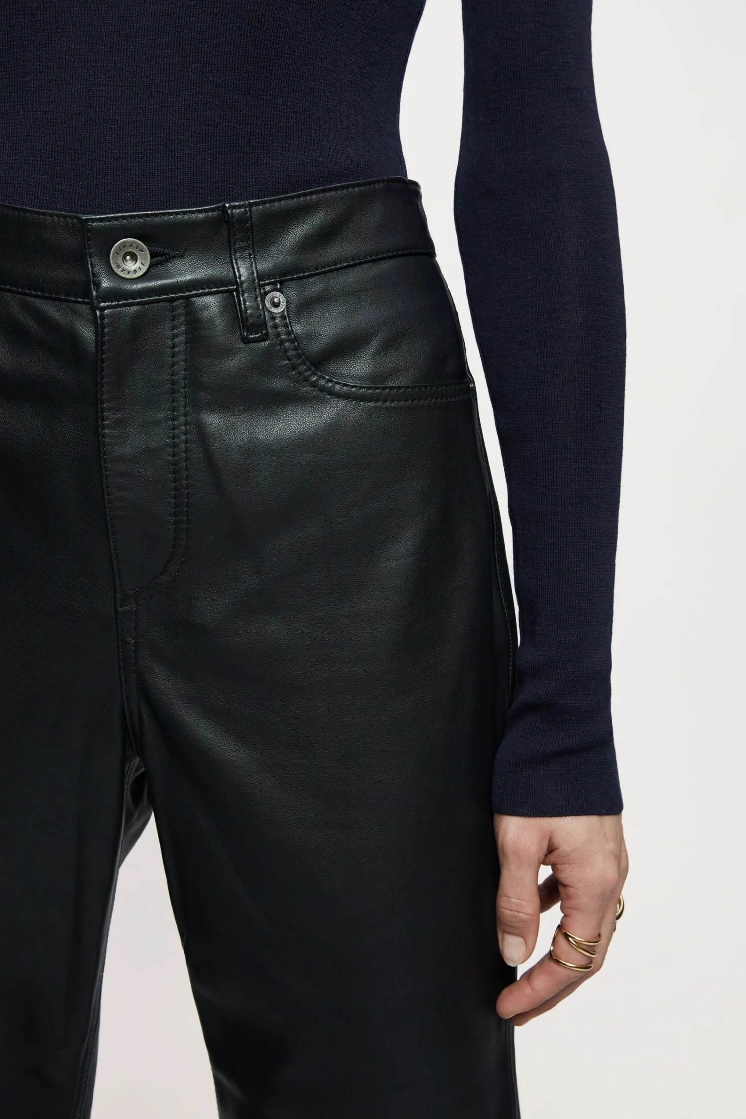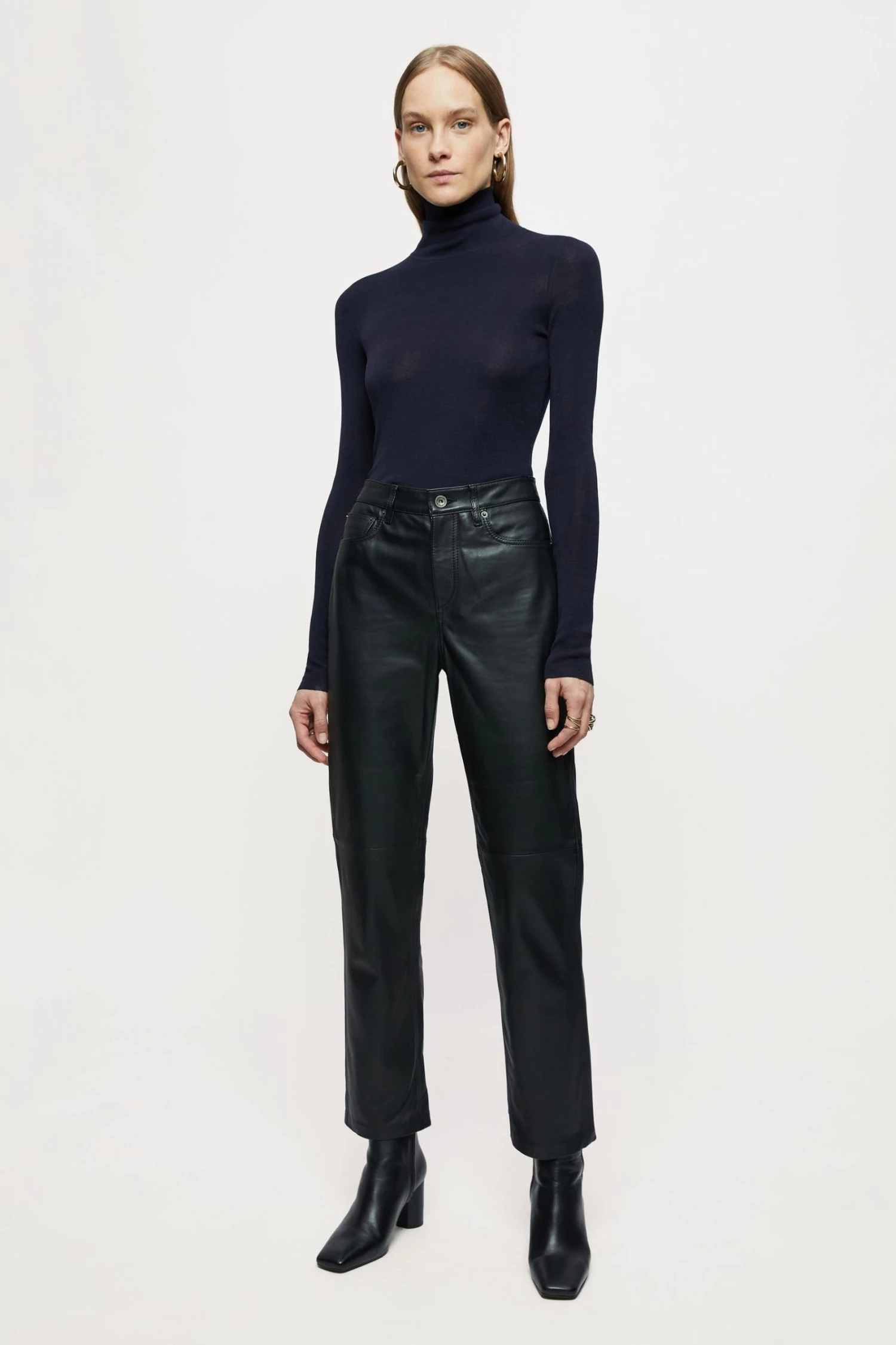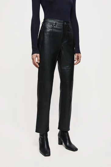 Original fit jean in soft leather, with metal trims and tonal top stitch thread. Designed with a straight cut, cropped length and five pocket detailing. Style with a classic white shirt or seasonal knitwear.