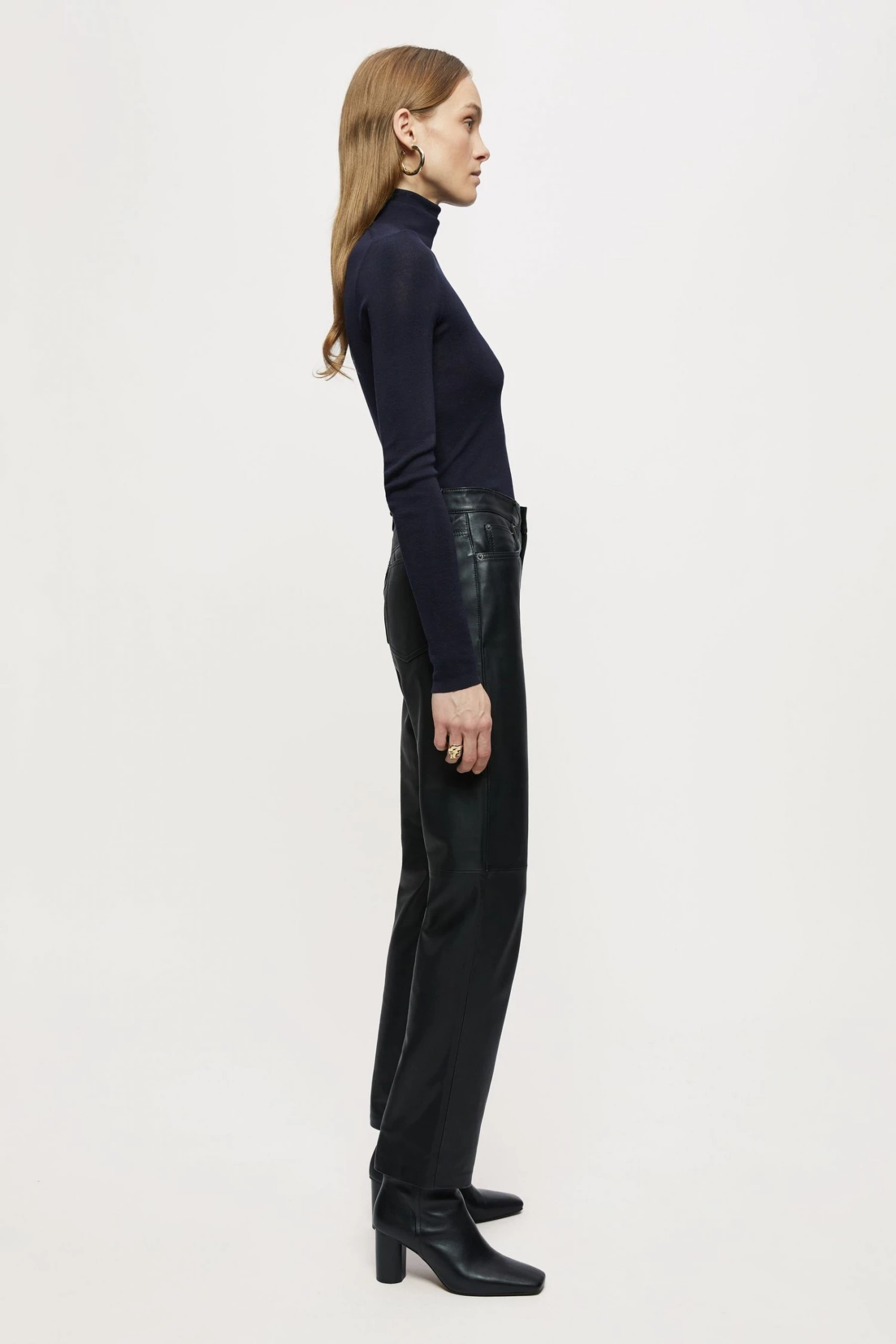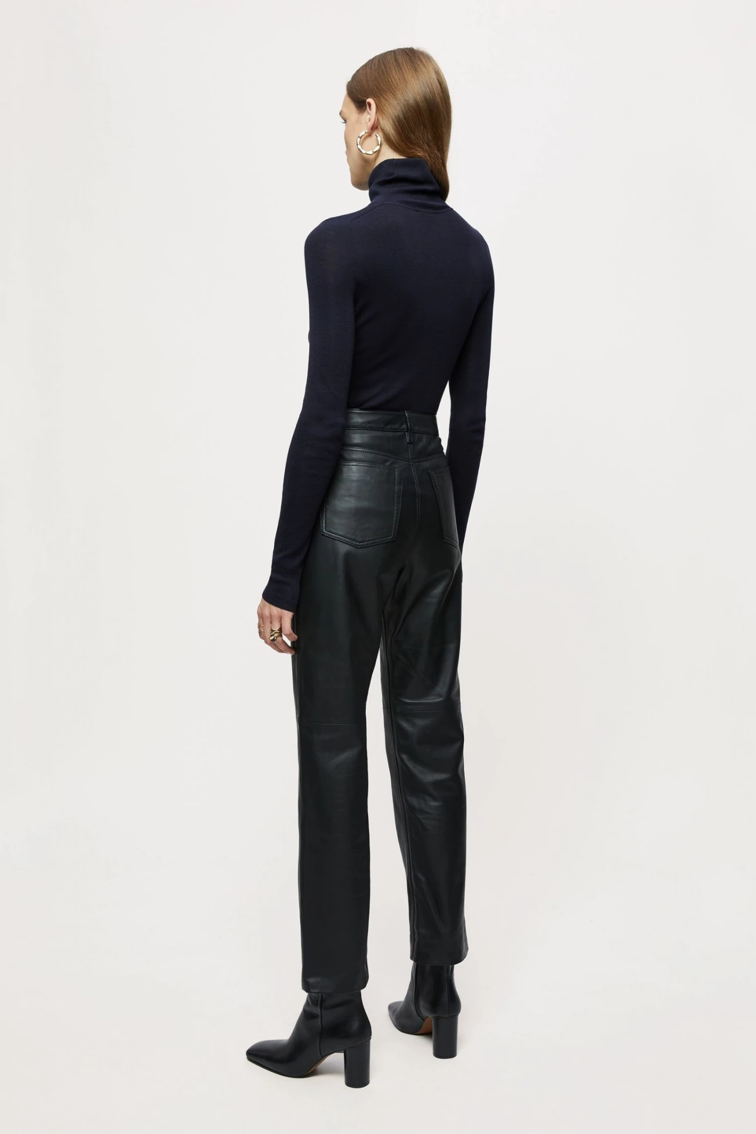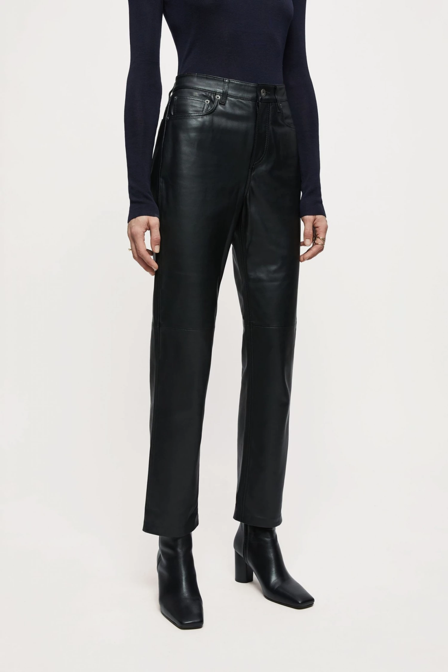 Original fit jean in soft leather, with metal trims and tonal top stitch thread. Designed with a straight cut, cropped length and five pocket detailing. Style with a classic white shirt or seasonal knitwear.