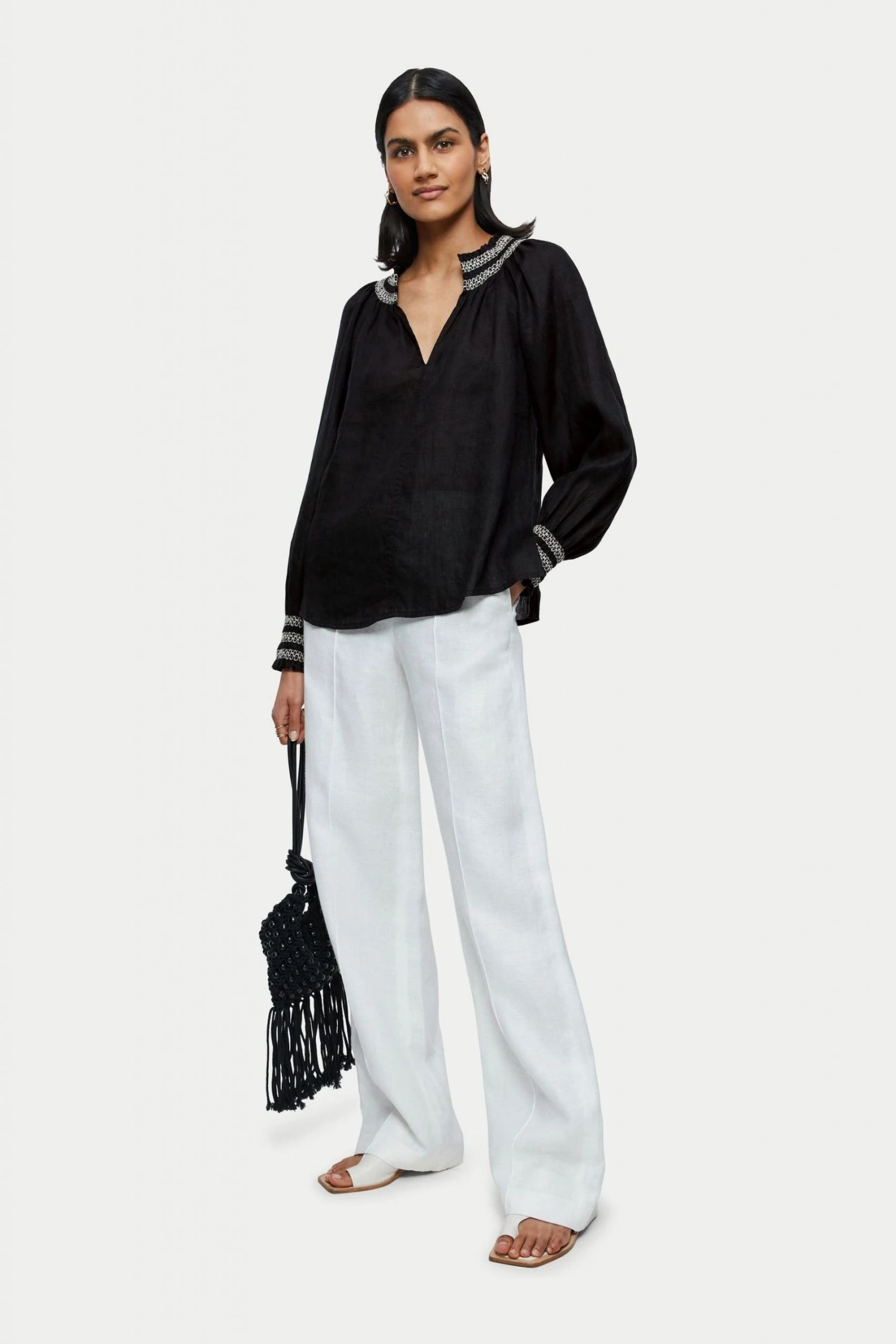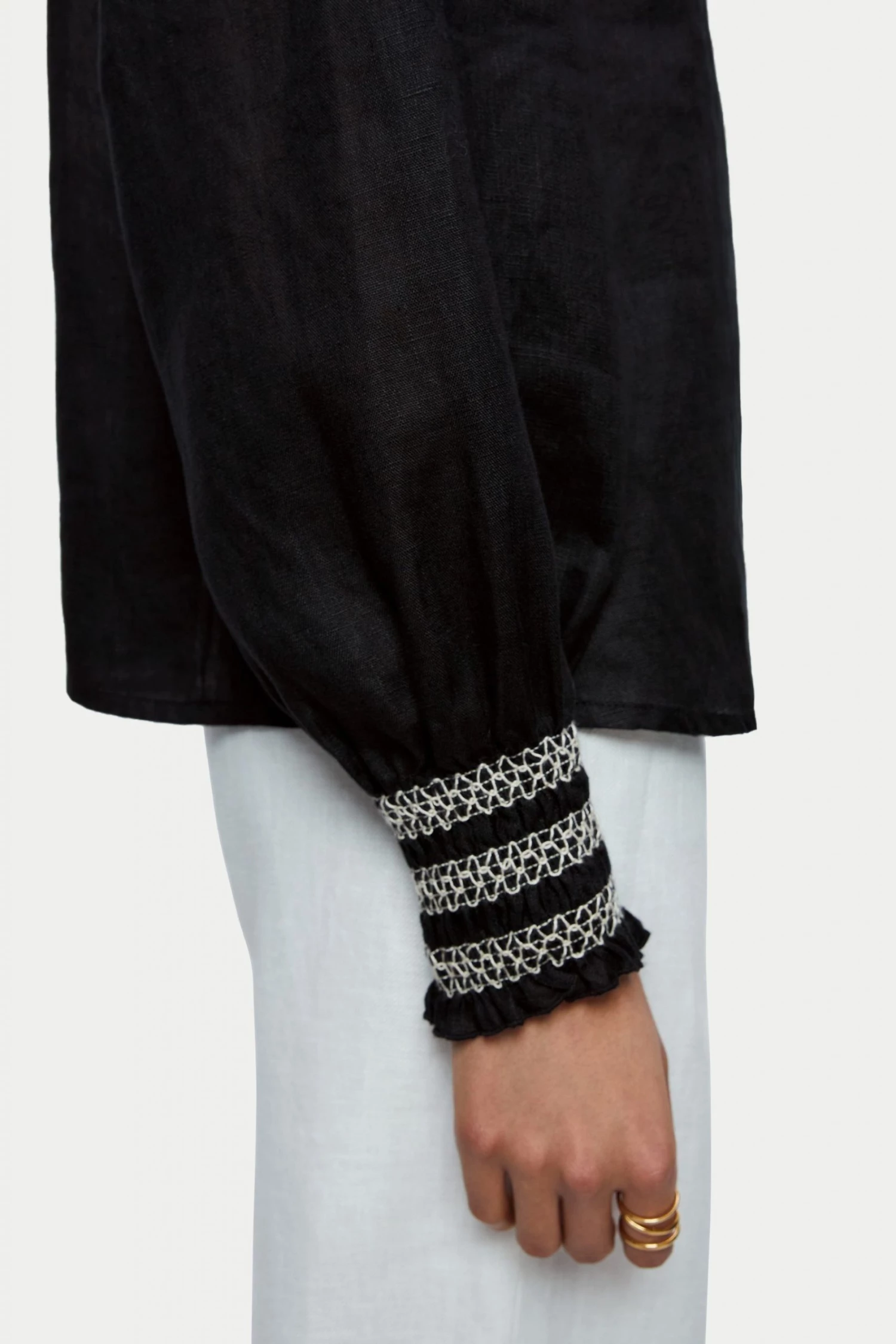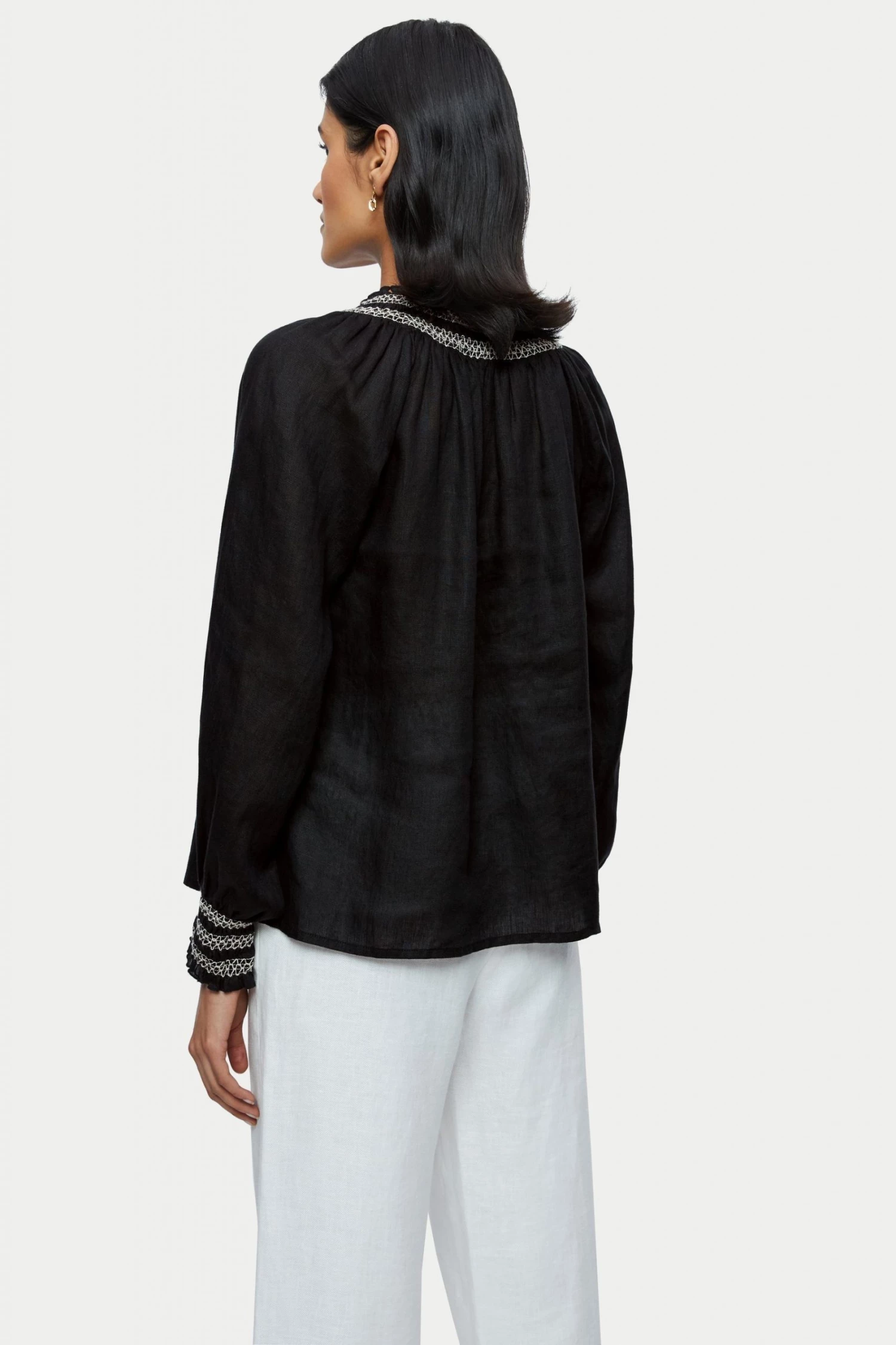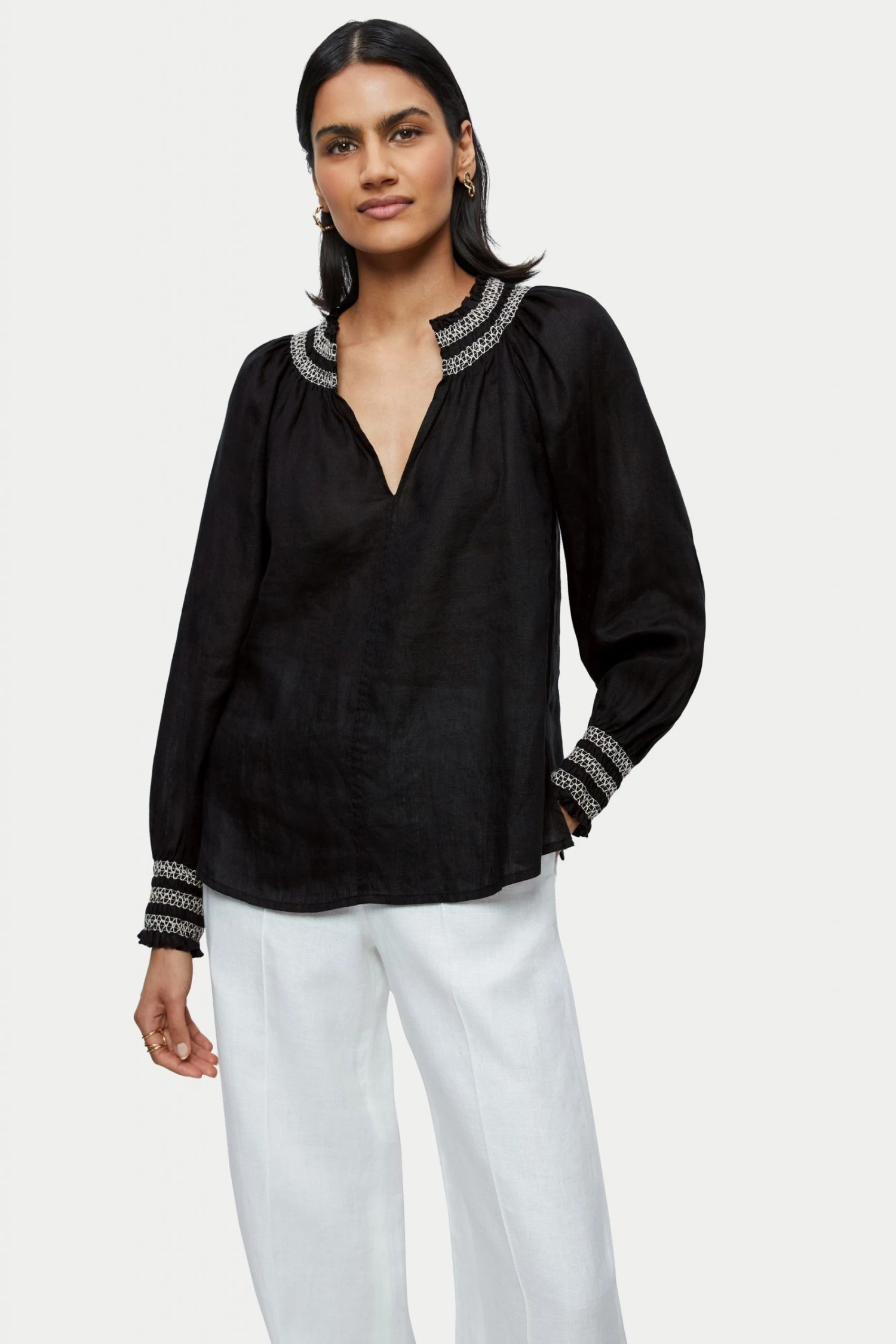 Lightweight linen top with intricate contrast smocking detail around the neckline and on the cuffs. The smocking makes the sleeves easy to push up if desired. Easy fitting body shape. Great with shorts and denim.