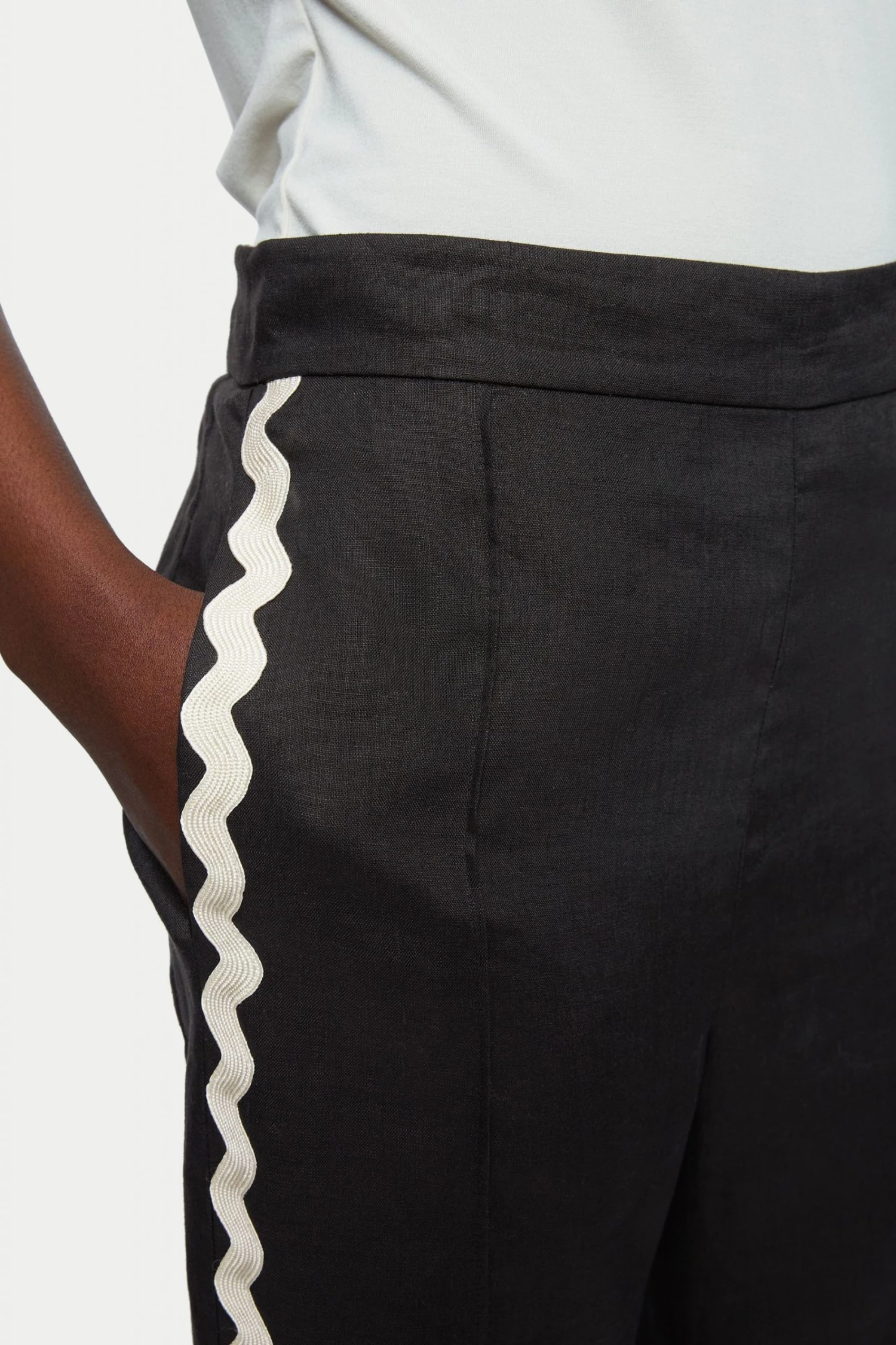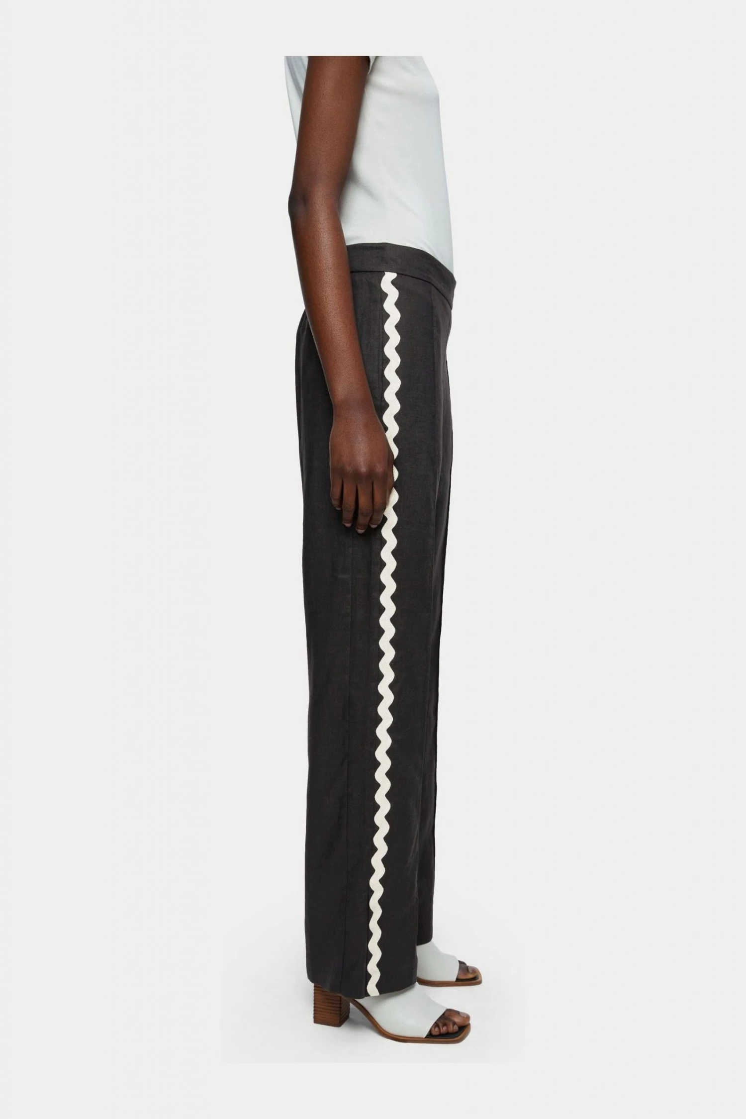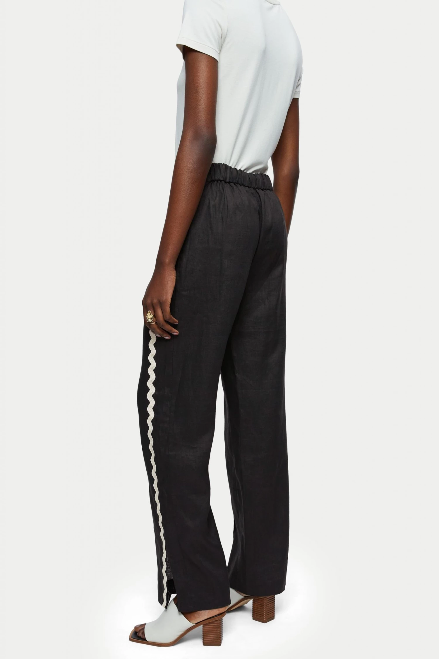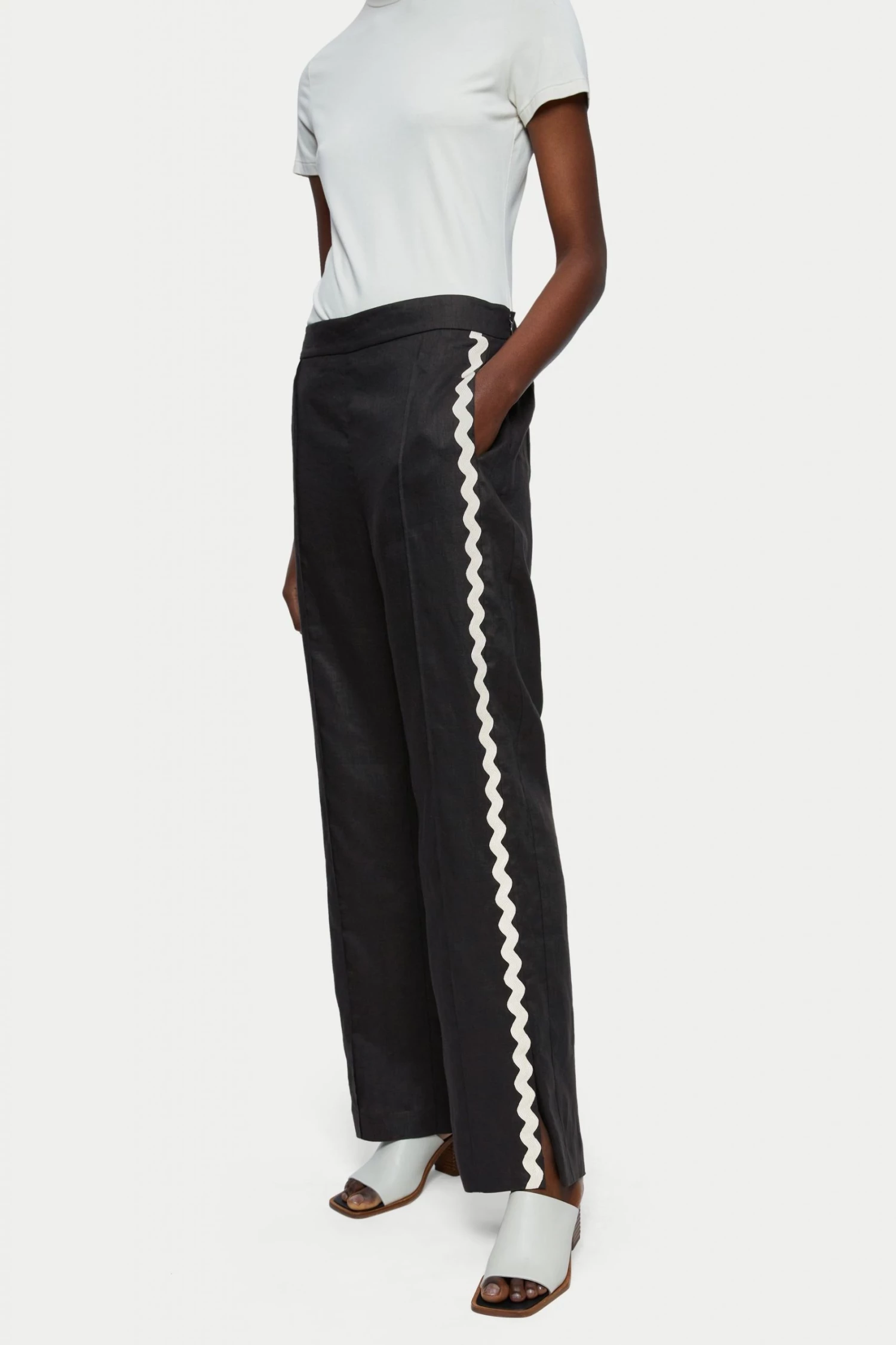 100% linen loose leg trouser with lower leg split. Invisible side zip fastening and gathered back waistband. Featuring a stunning contrast Ric Rac side leg trim detail.