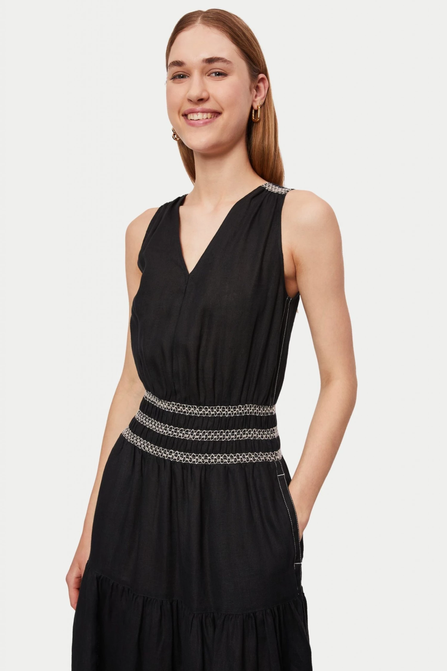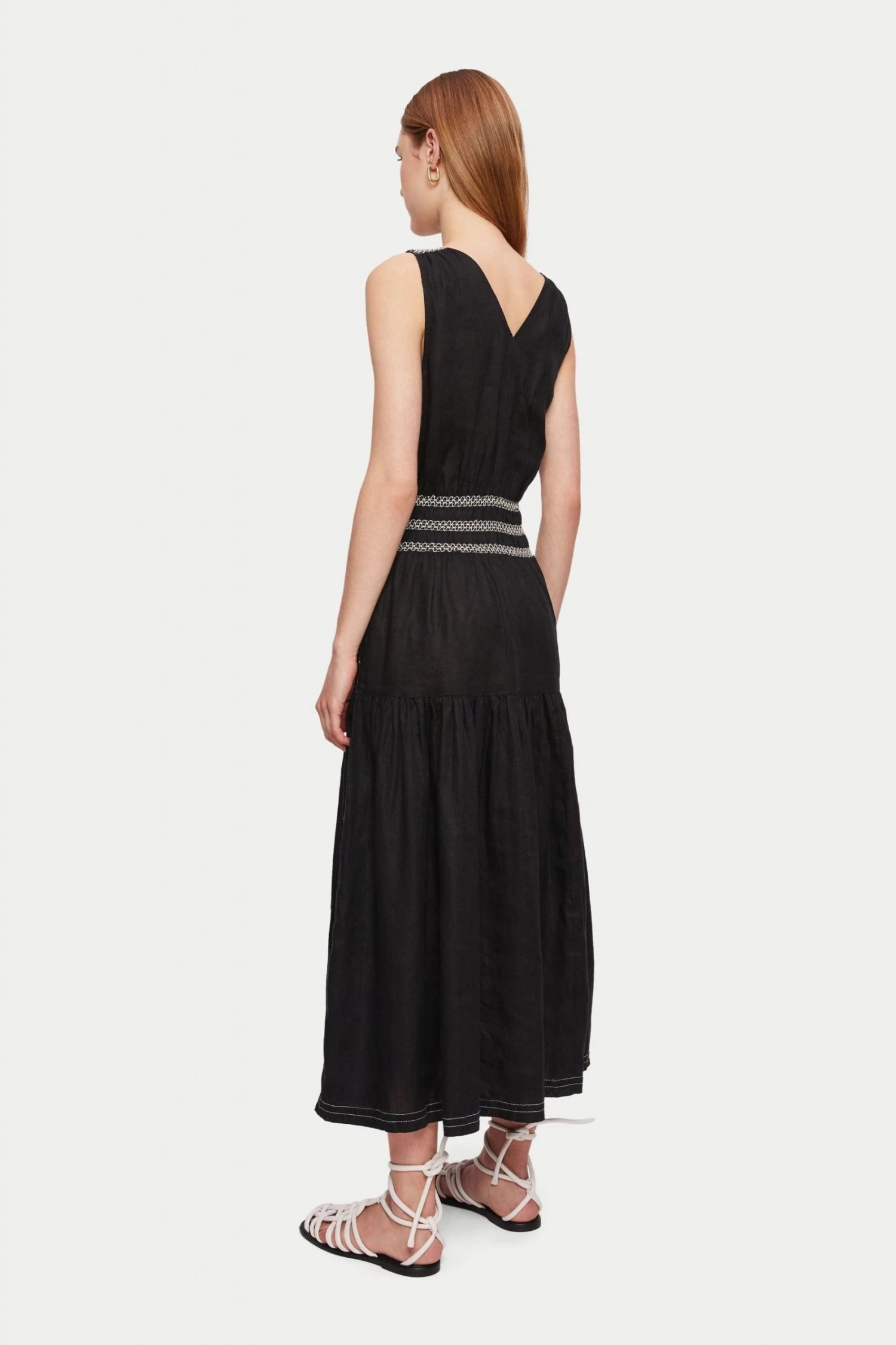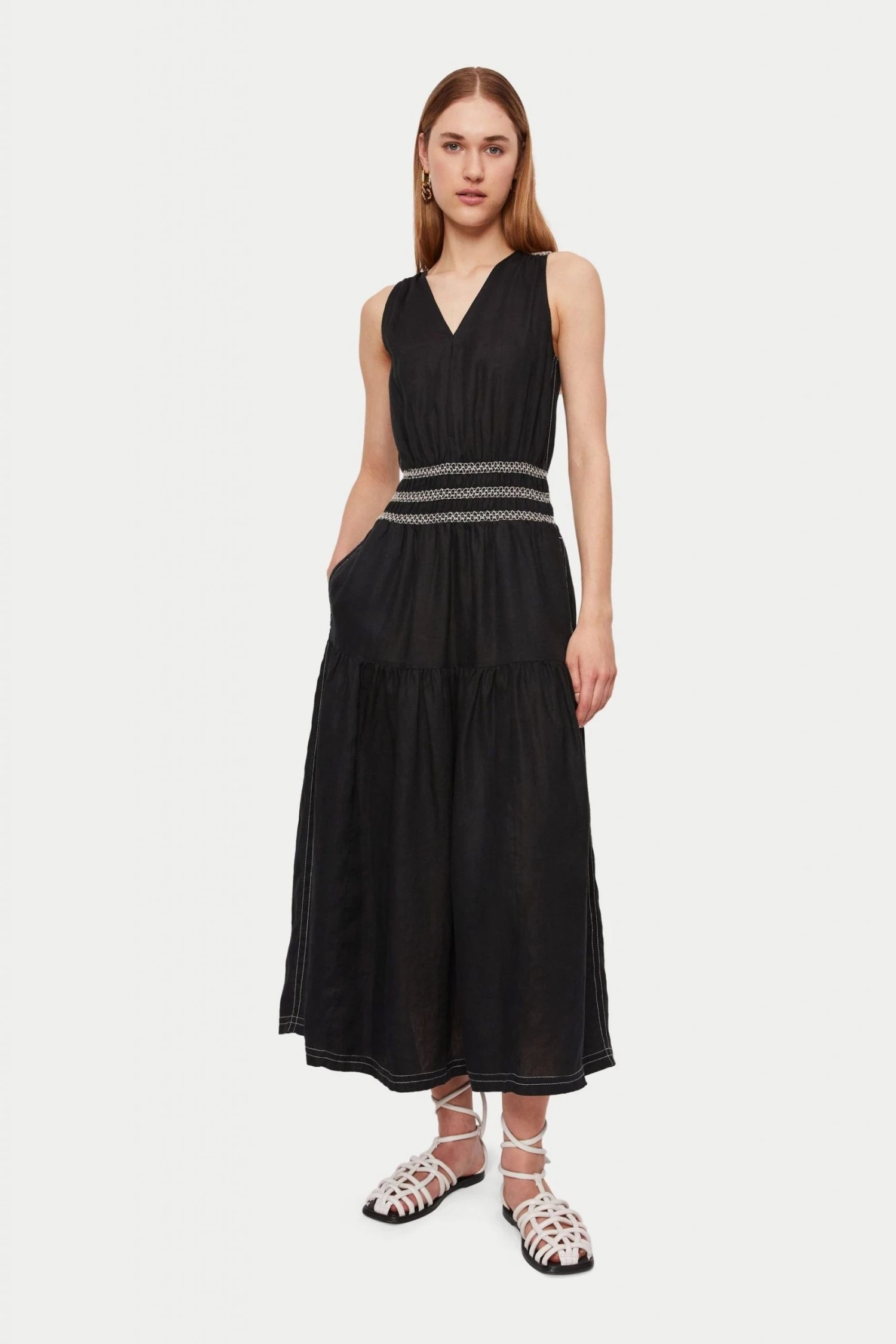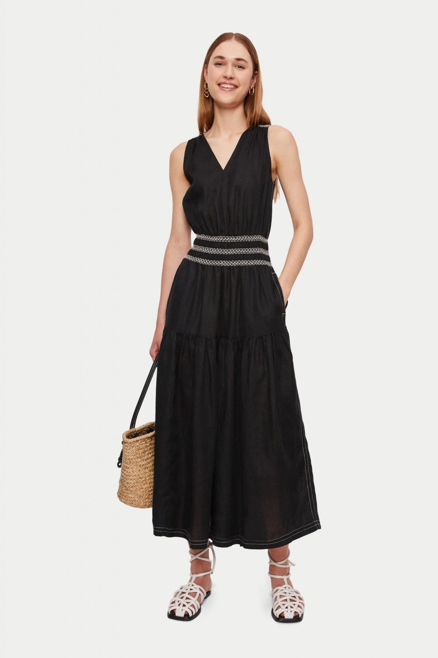 Stylish resort linen maxi dress with beautiful contrast embroidery smocking. Designed with a low V-neckline, sleeveless and gathered skirt. Style with sandals or over swimwear.