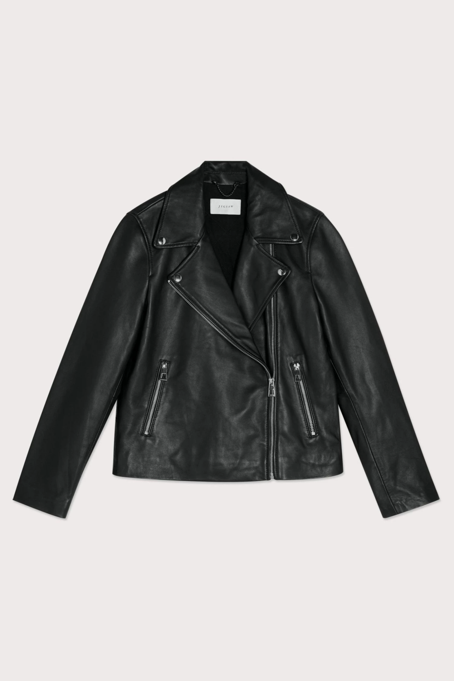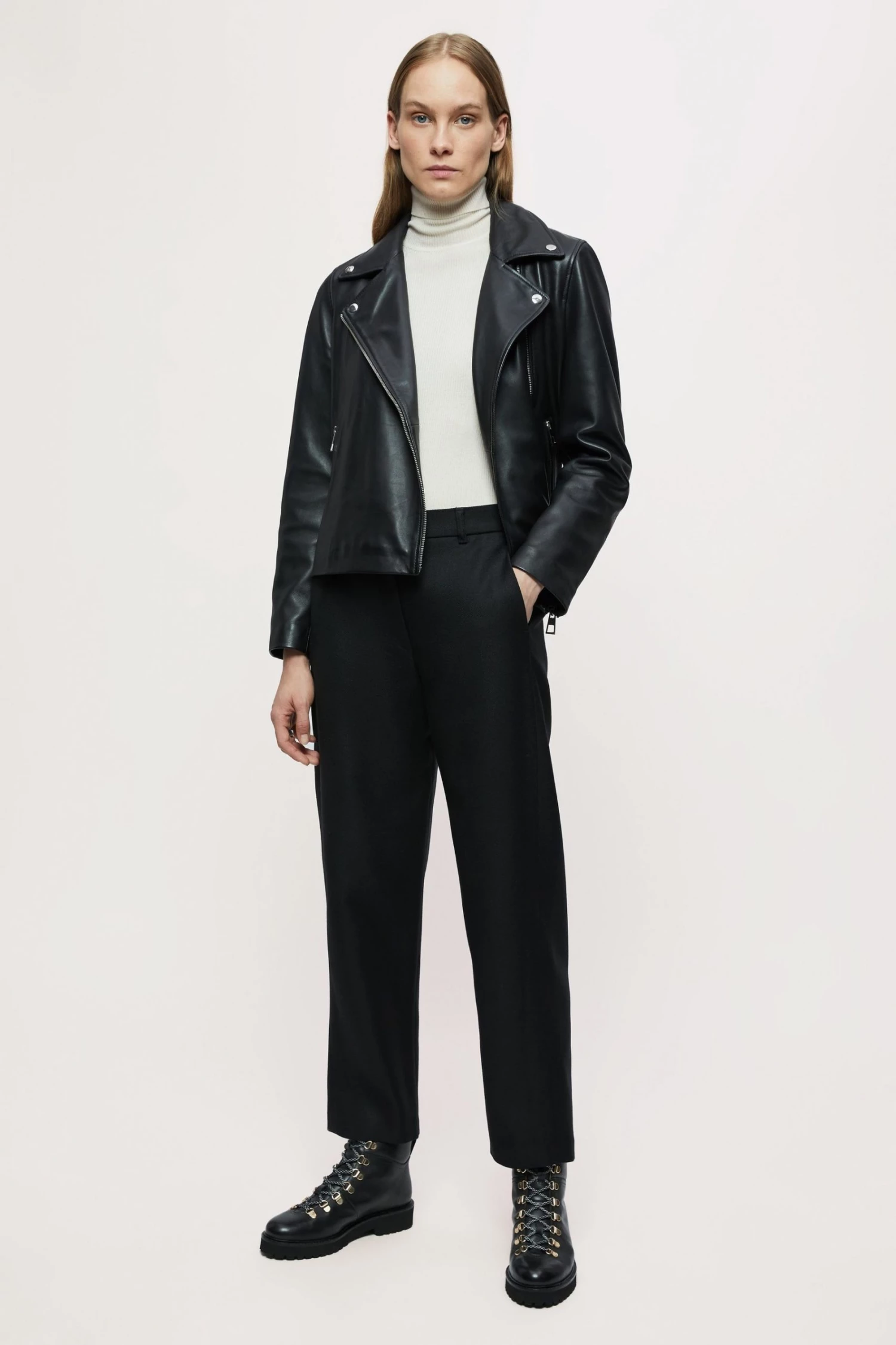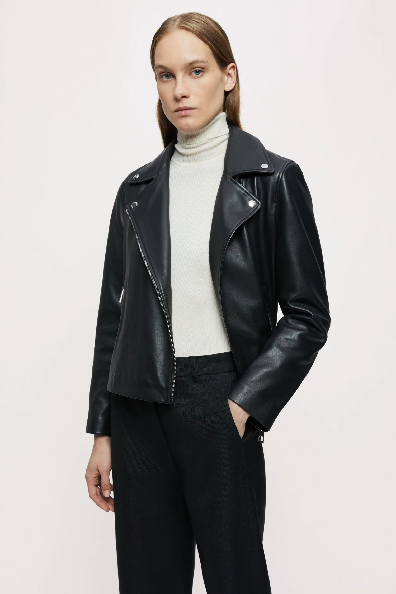 Classic biker jacket in soft leather, with shiny nickel trims. Straight fit, long sleeves with zip front closure, metal snaps, side pockets and sleeve vents with zips.