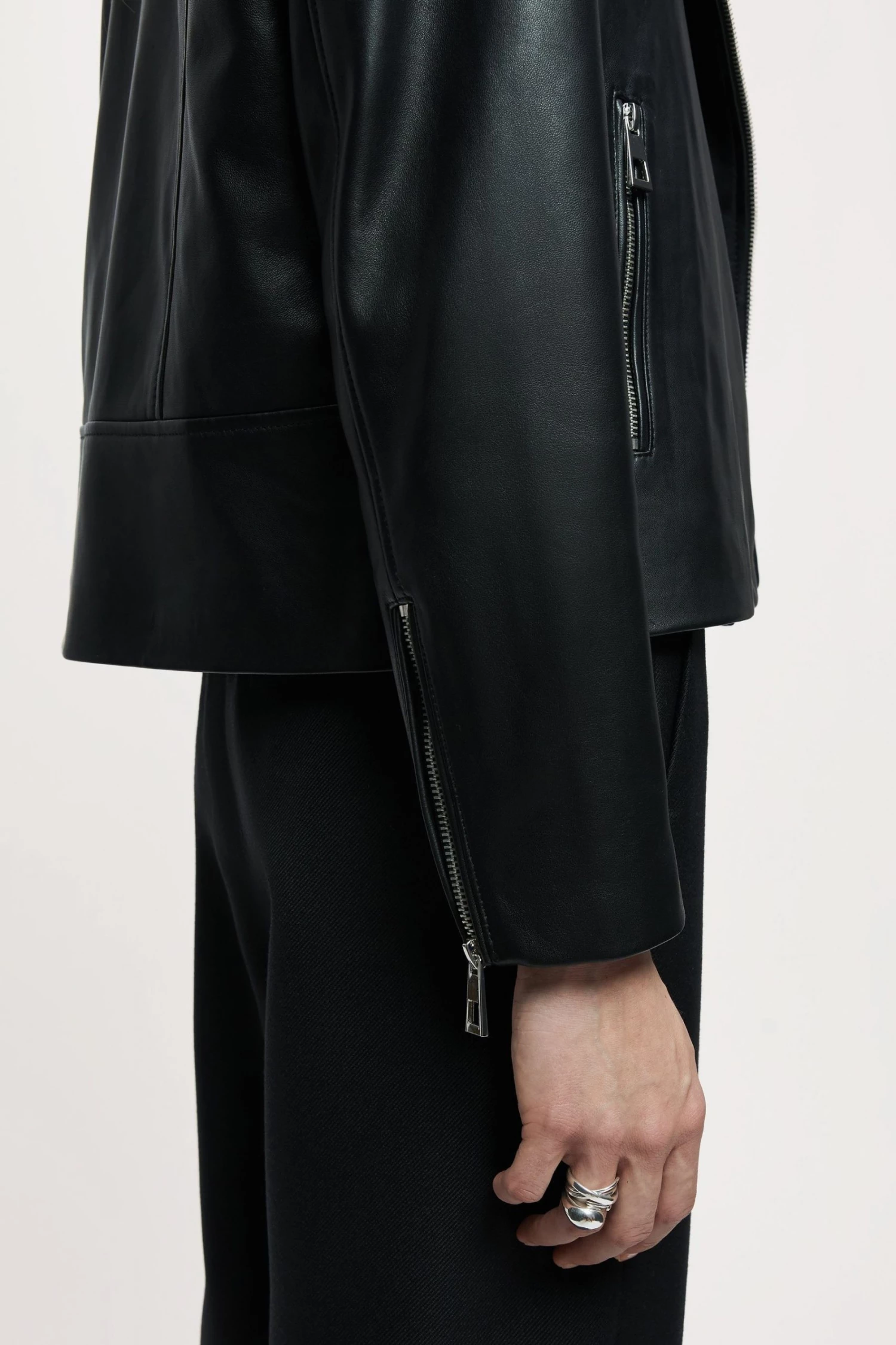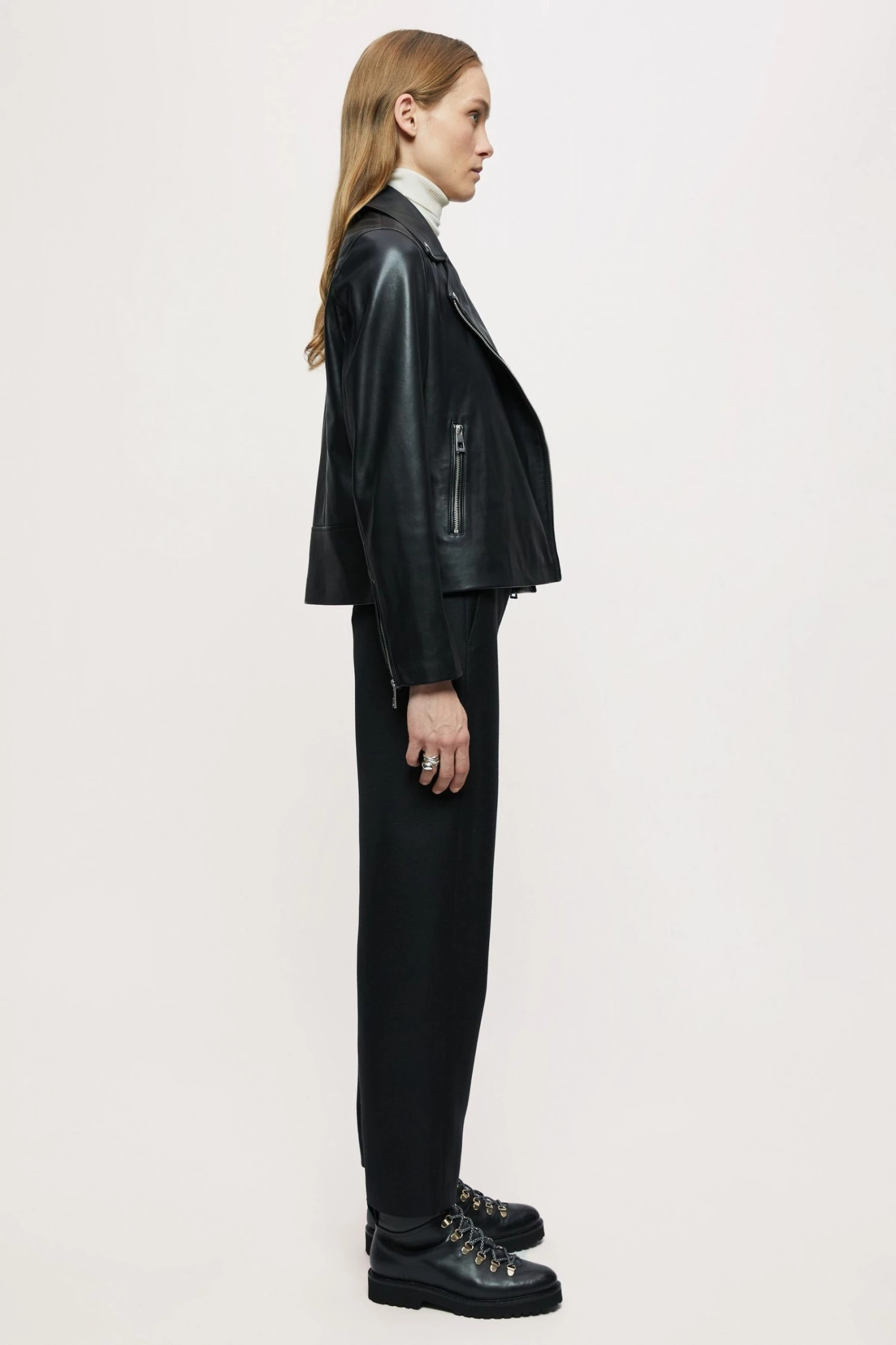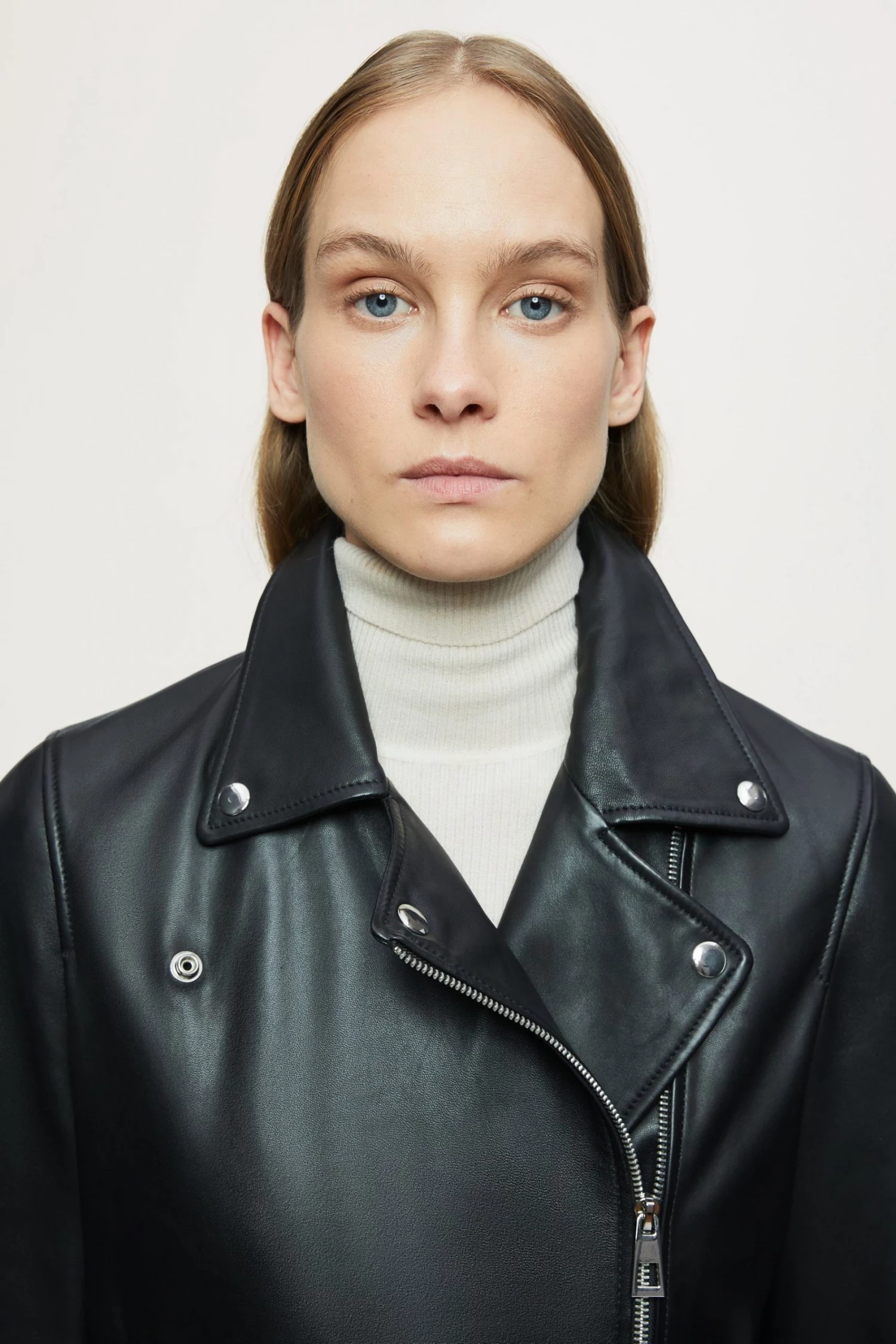 Classic biker jacket in soft leather, with shiny nickel trims. Straight fit, long sleeves with zip front closure, metal snaps, side pockets and sleeve vents with zips.