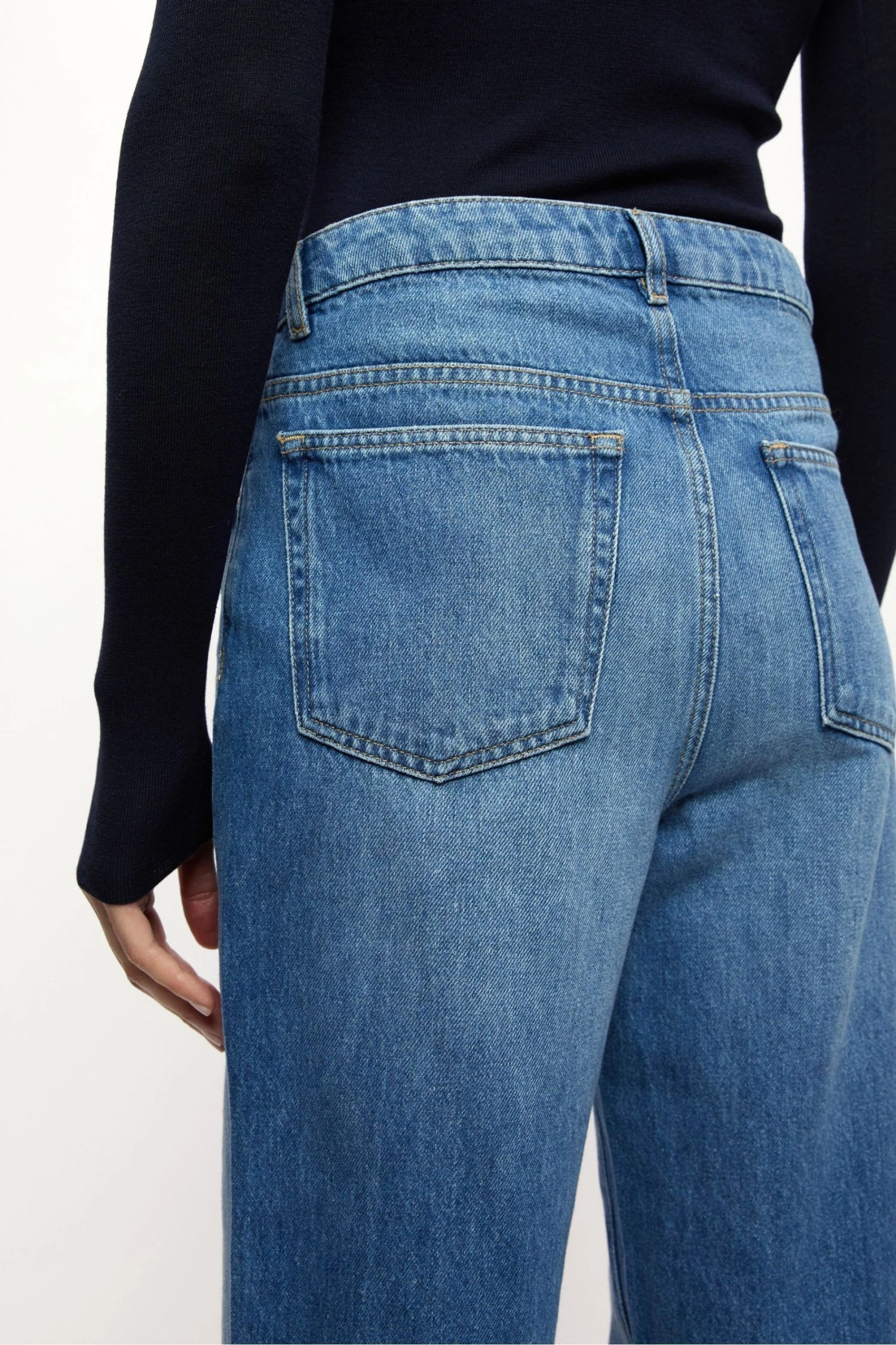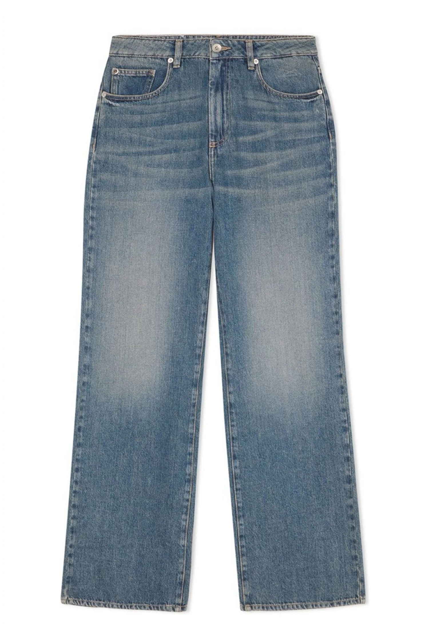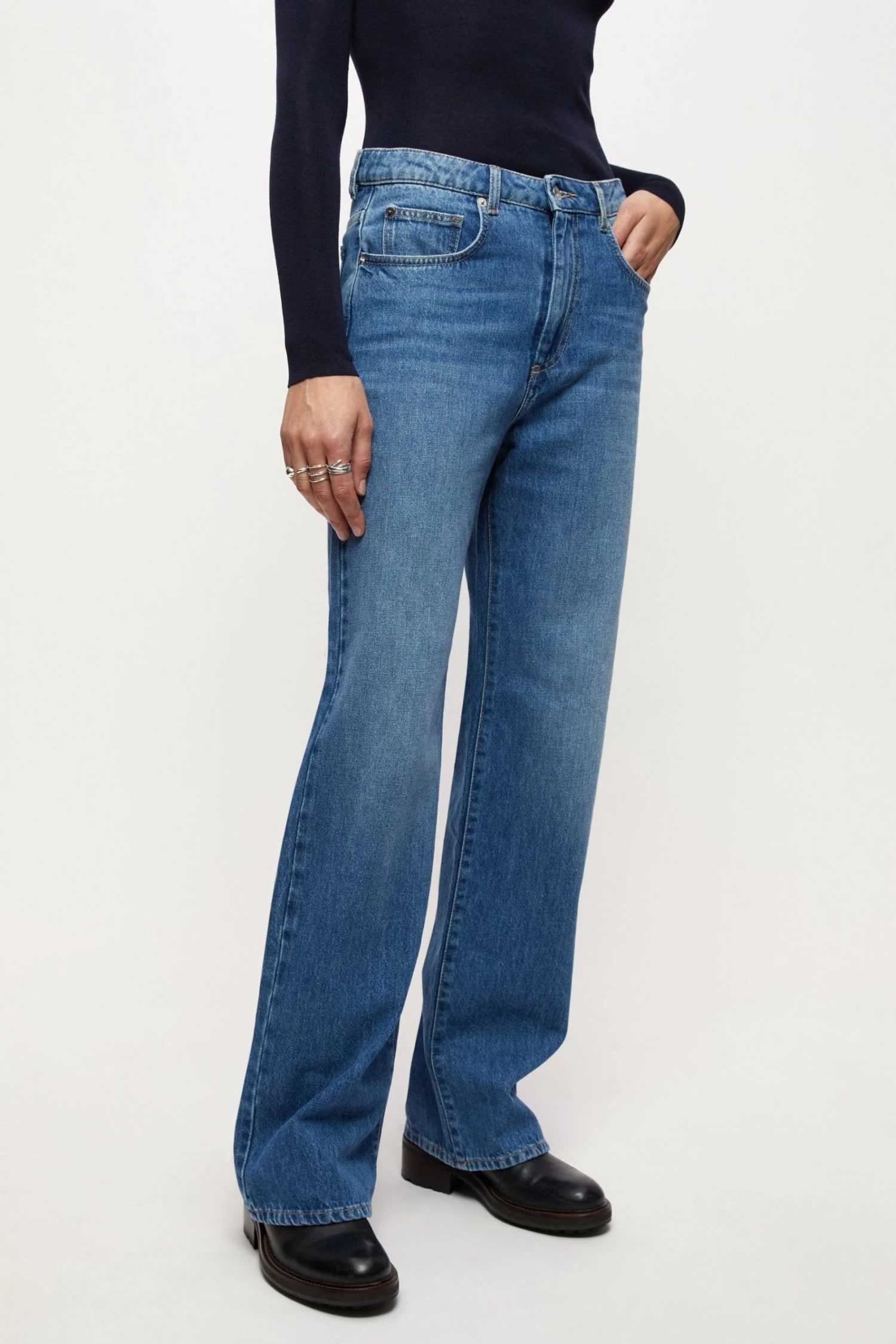 Sustainable full-length jeans with five pockets. Flattering through waist and hips with stylish wide leg silhouette. Discreet zip fly. Made from recycled, non-stretch and soft denim.