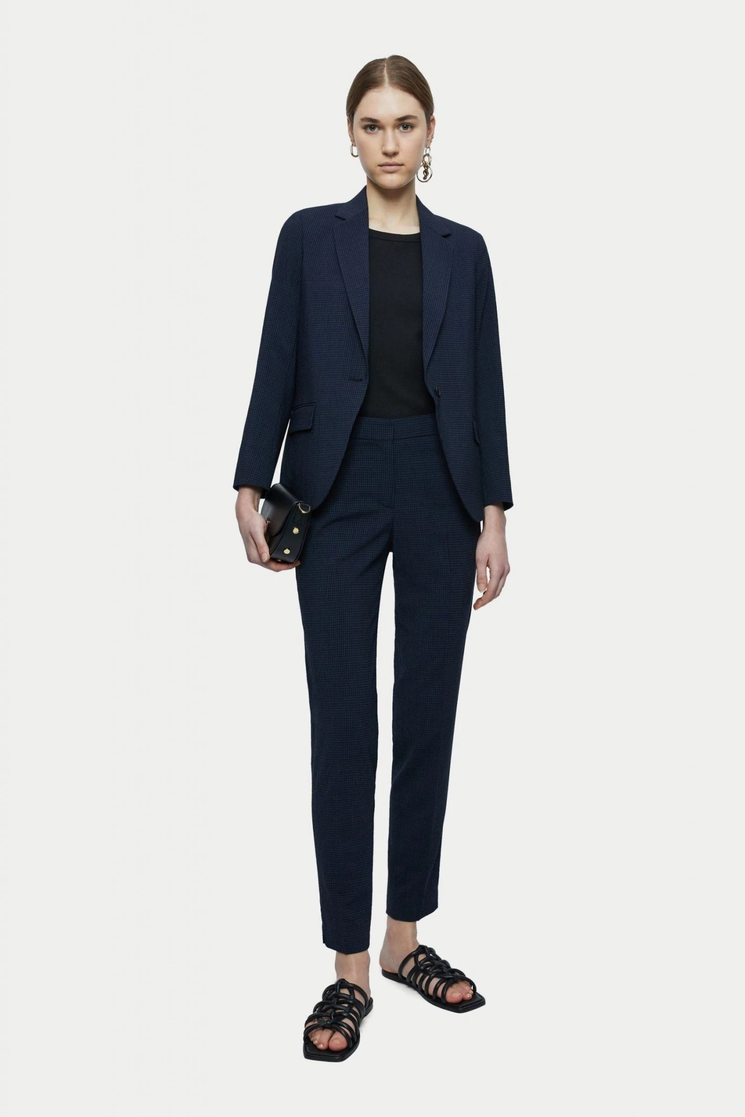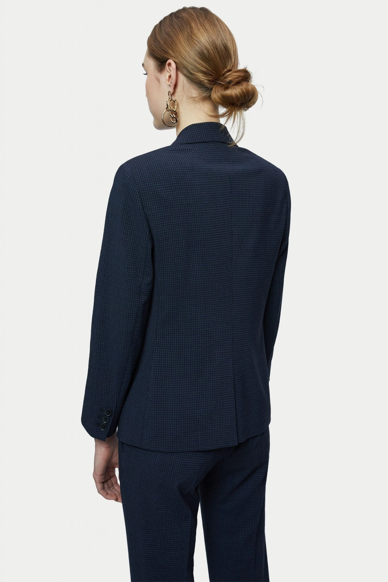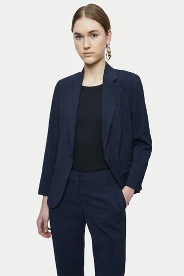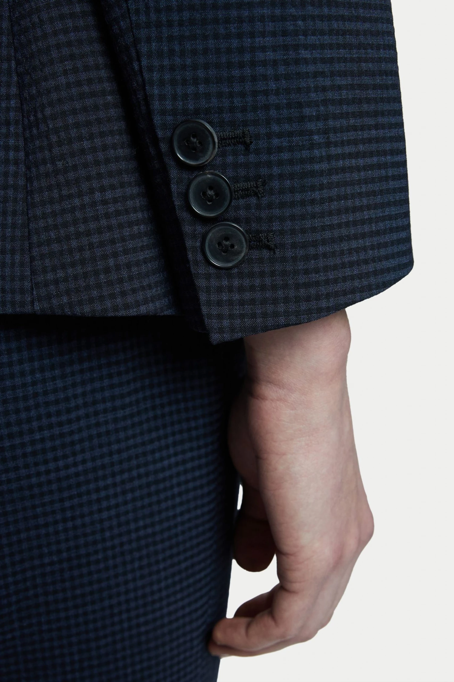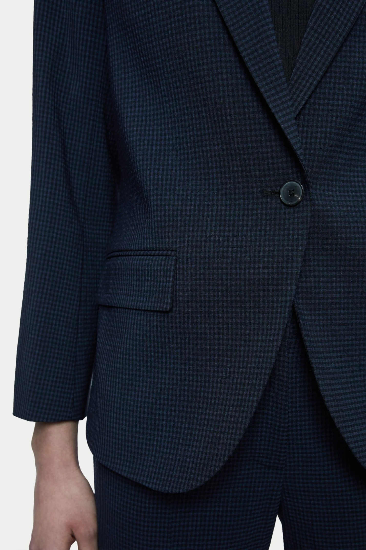 Tailored short blazer cut from virgin wool blend with a gingham weave by Italian heritage mill MARZOTTO. Designed with bracelet length sleeves and beautiful stripe lining. Featuring a single button fastening, notch lapel, jet flap pockets and back vent.