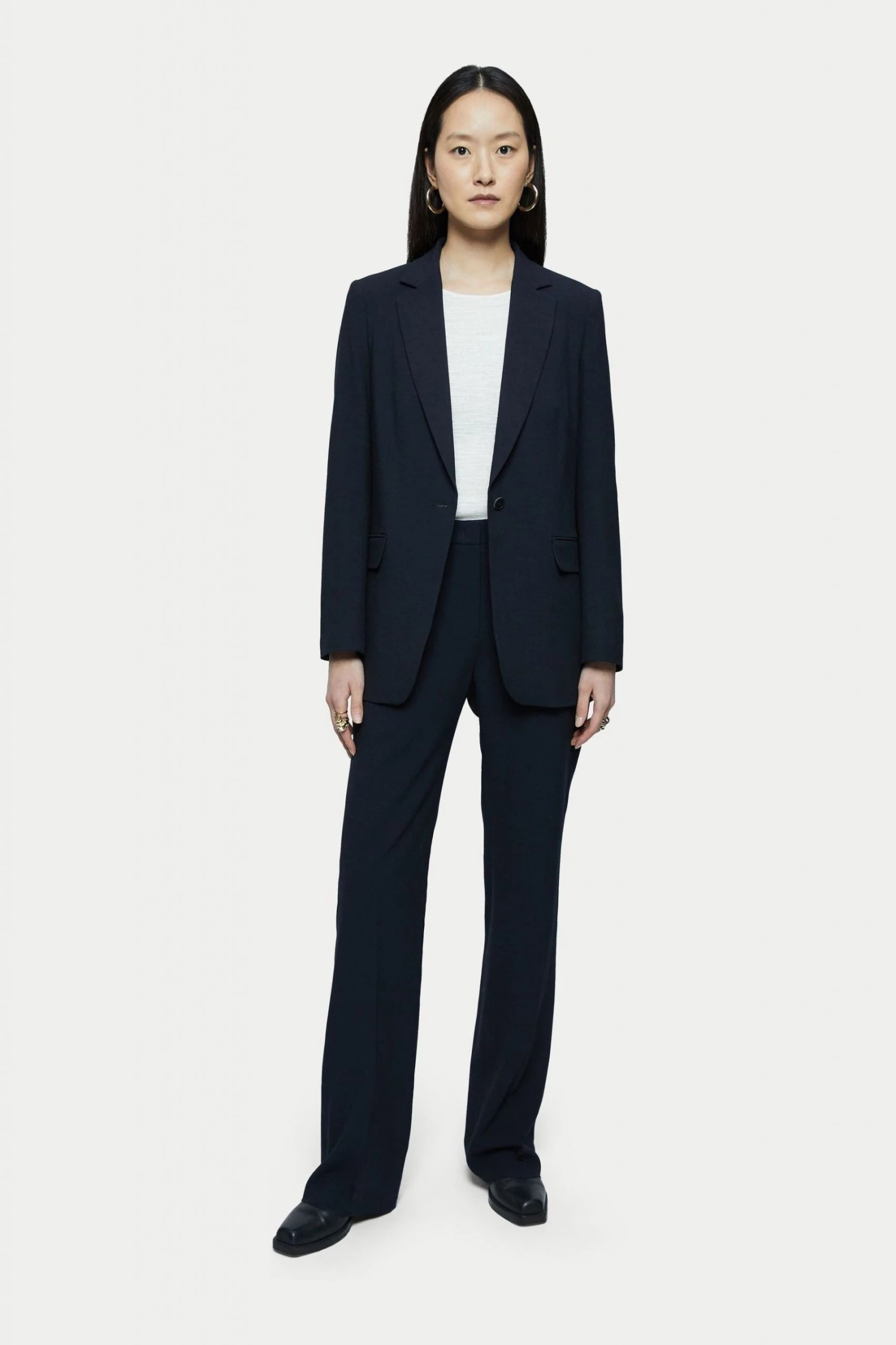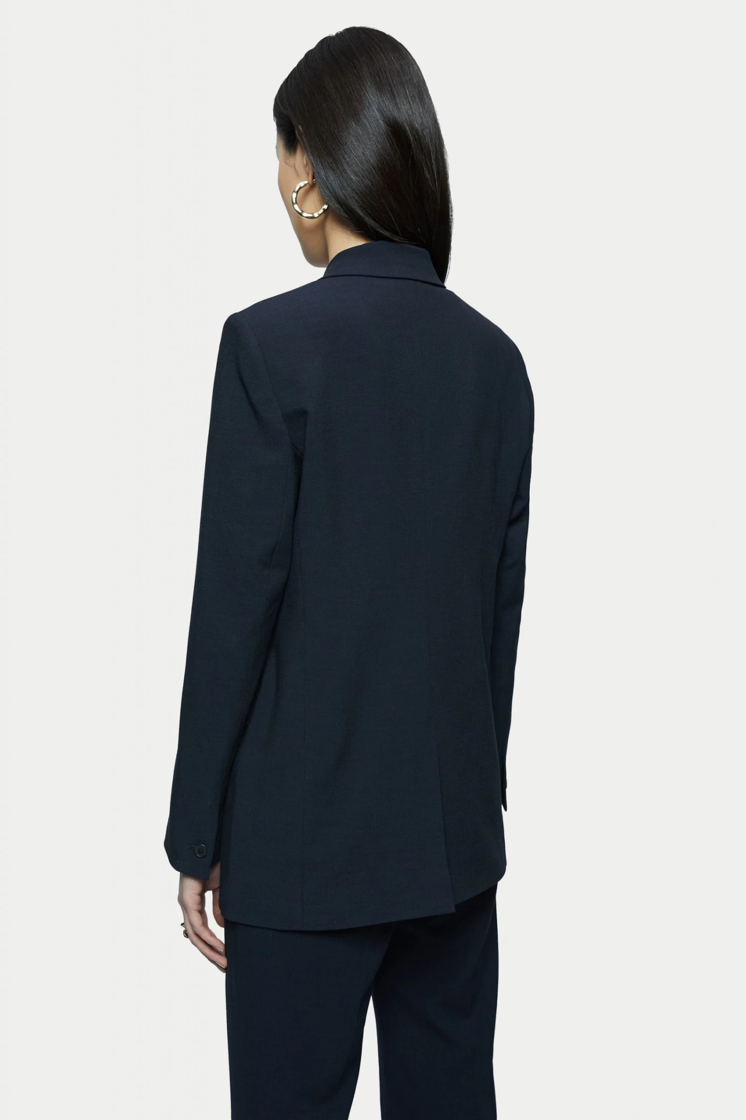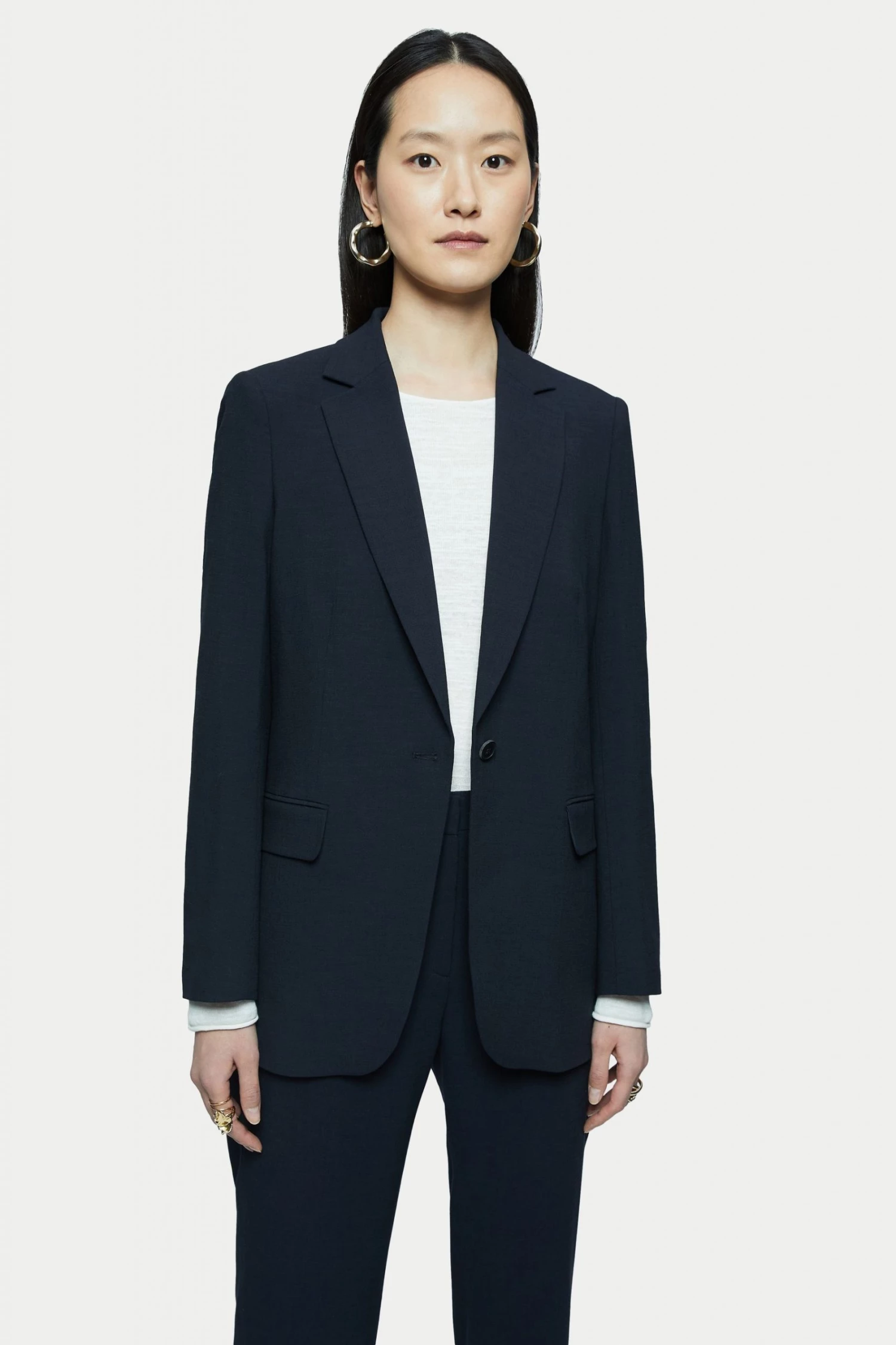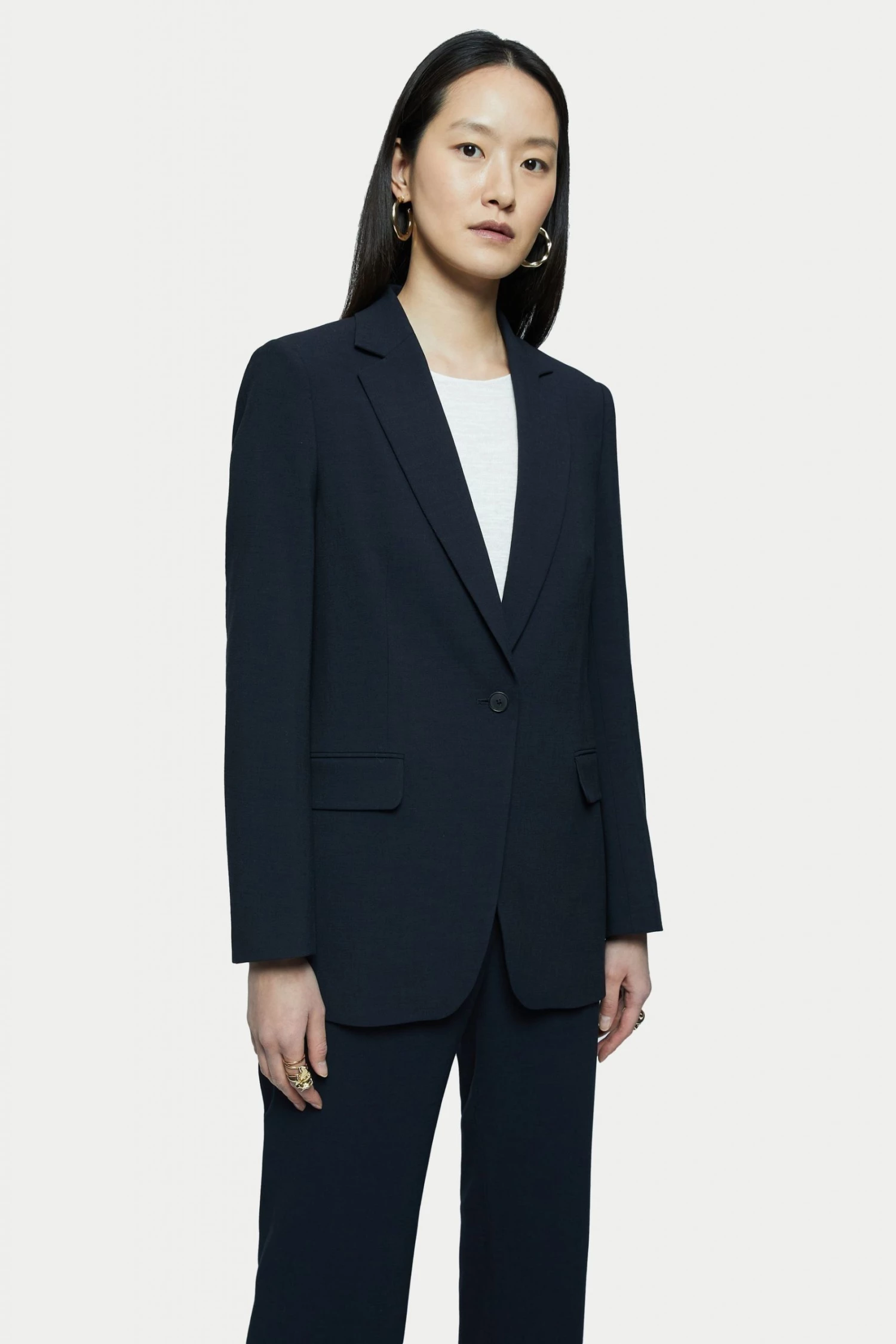 Tailored blazer cut from a sustainable Viscose-blend with a crosshatch weave by Portuguese heritage mill RIOPELE. Featuring a single-breasted front with button closure, back vent, jet flap pockets, notch lapel and melton under collar. A smart casual blazer that is fully lined, perfect for light layering. Style with denim or as a suit with a matching pair of trousers.