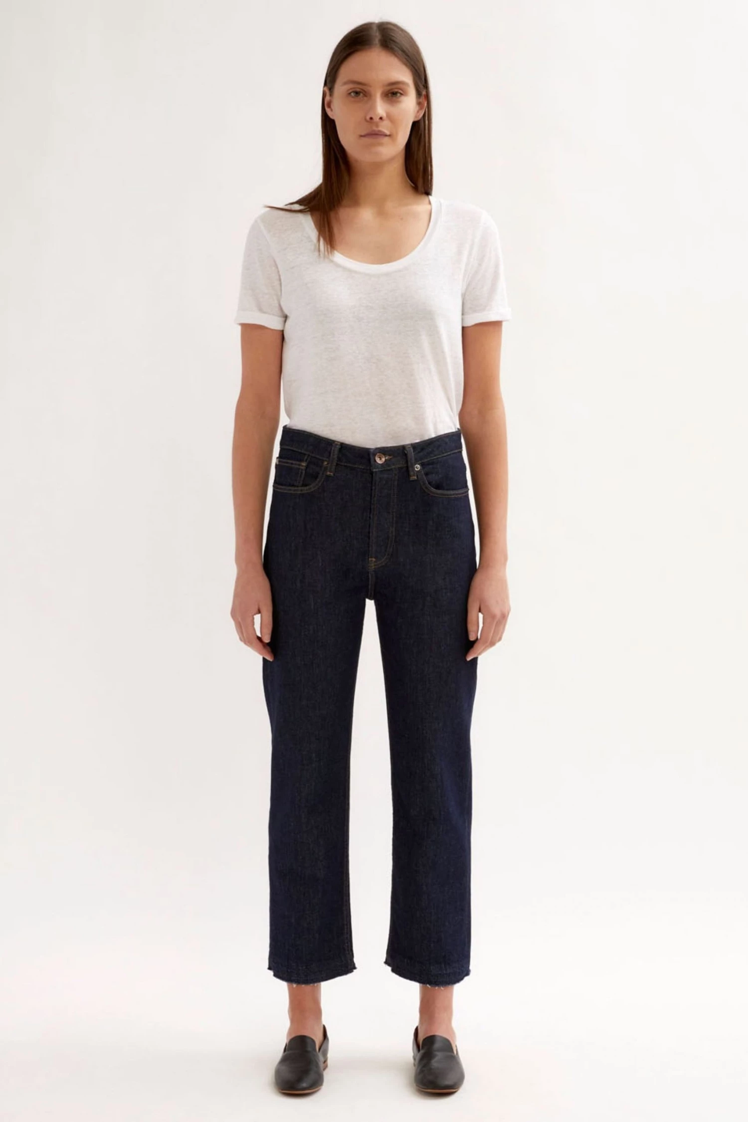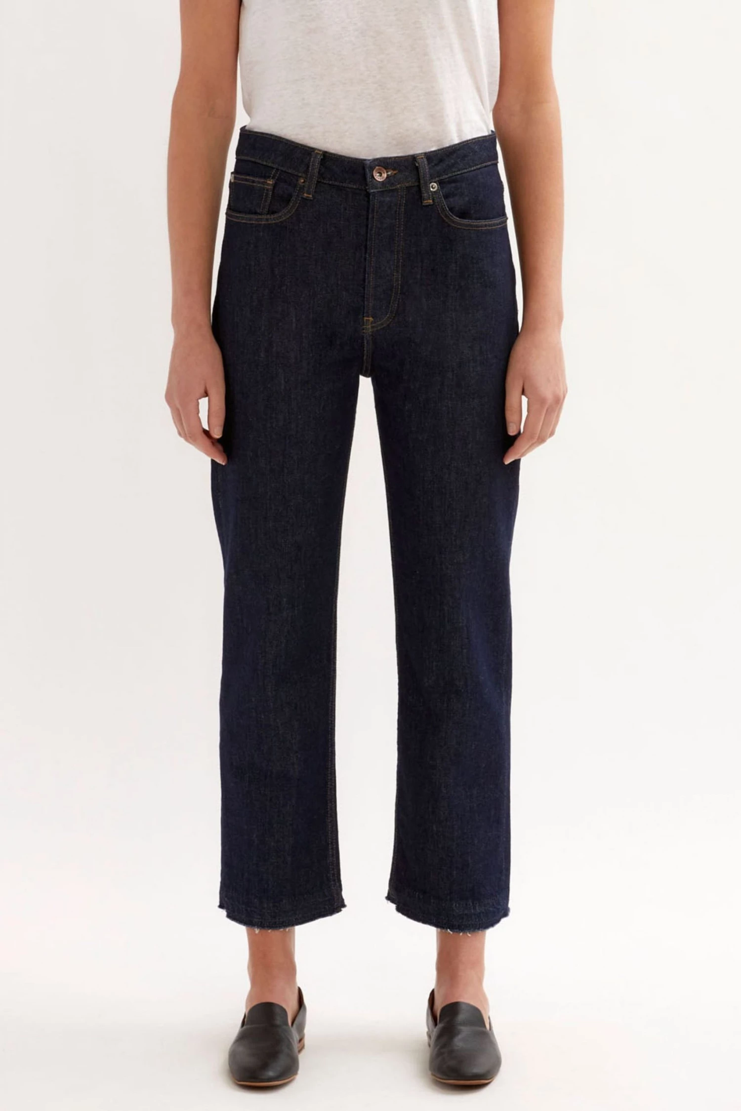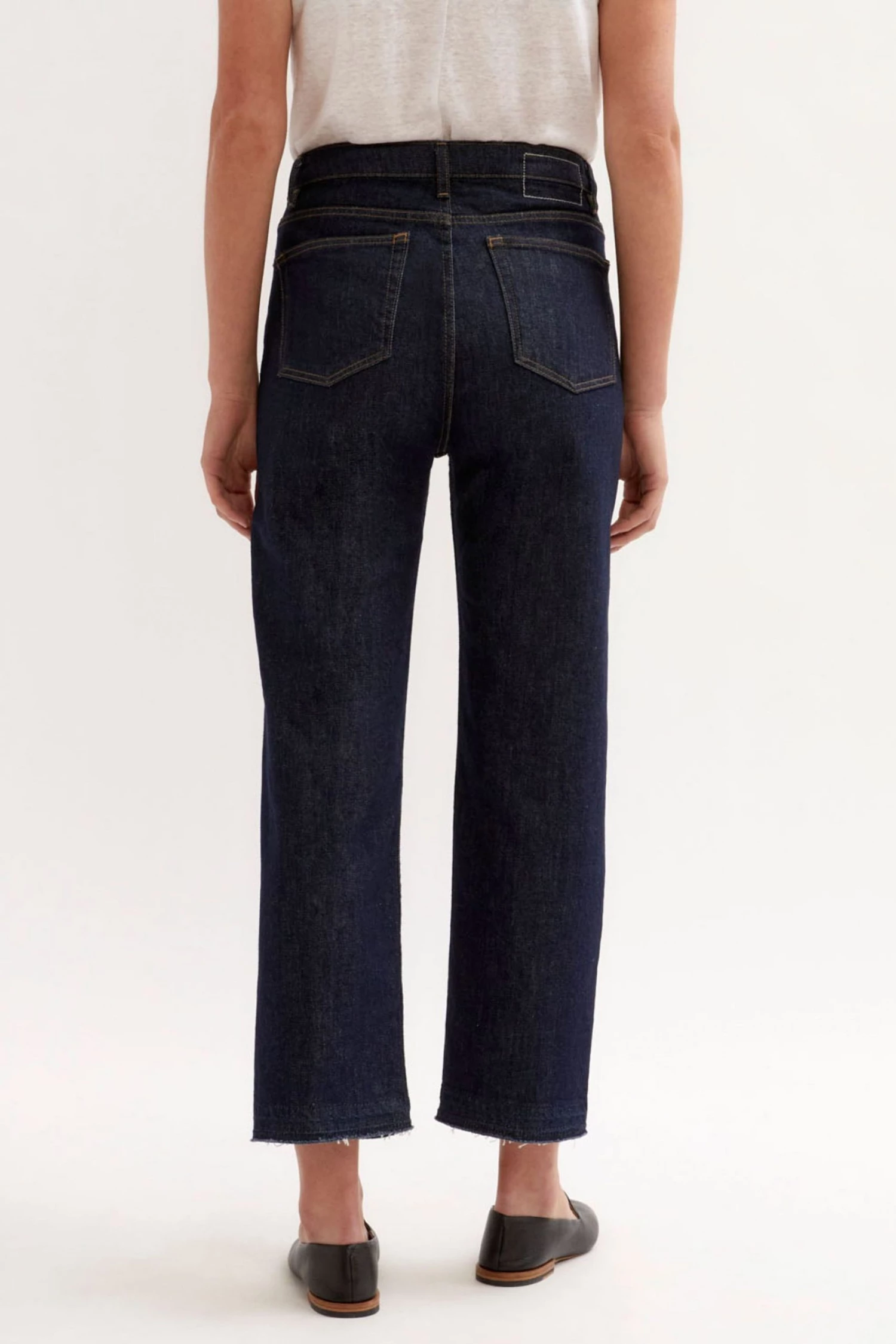 Classic mid-rise straight leg. Slim through the hips. Straight cut from hip to hem. High ankle crop length. Comfort stretch denim. Main fabric is sustainable cotton, produced with recycled polyester sewing threads and zip tapes. Produced with low EIM (Low Environmental Impact Measuring) score.