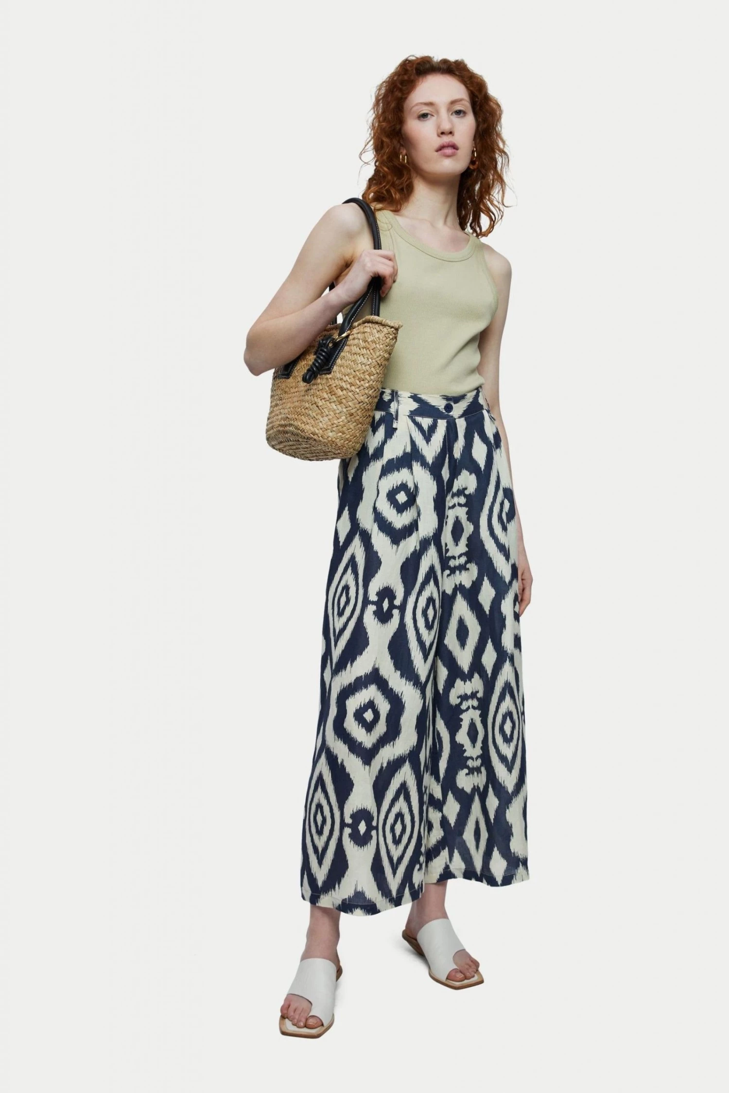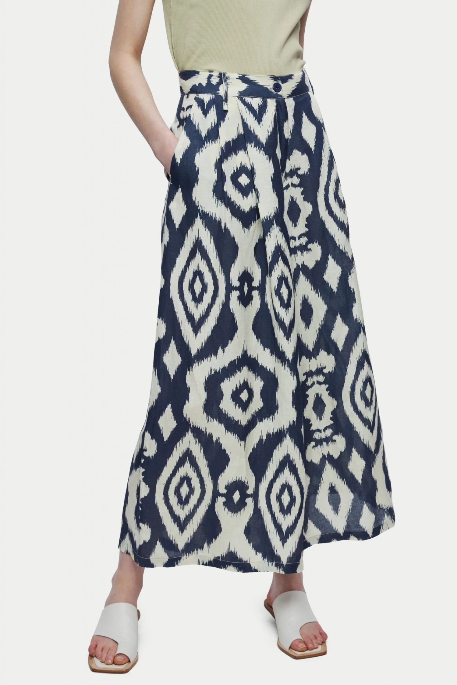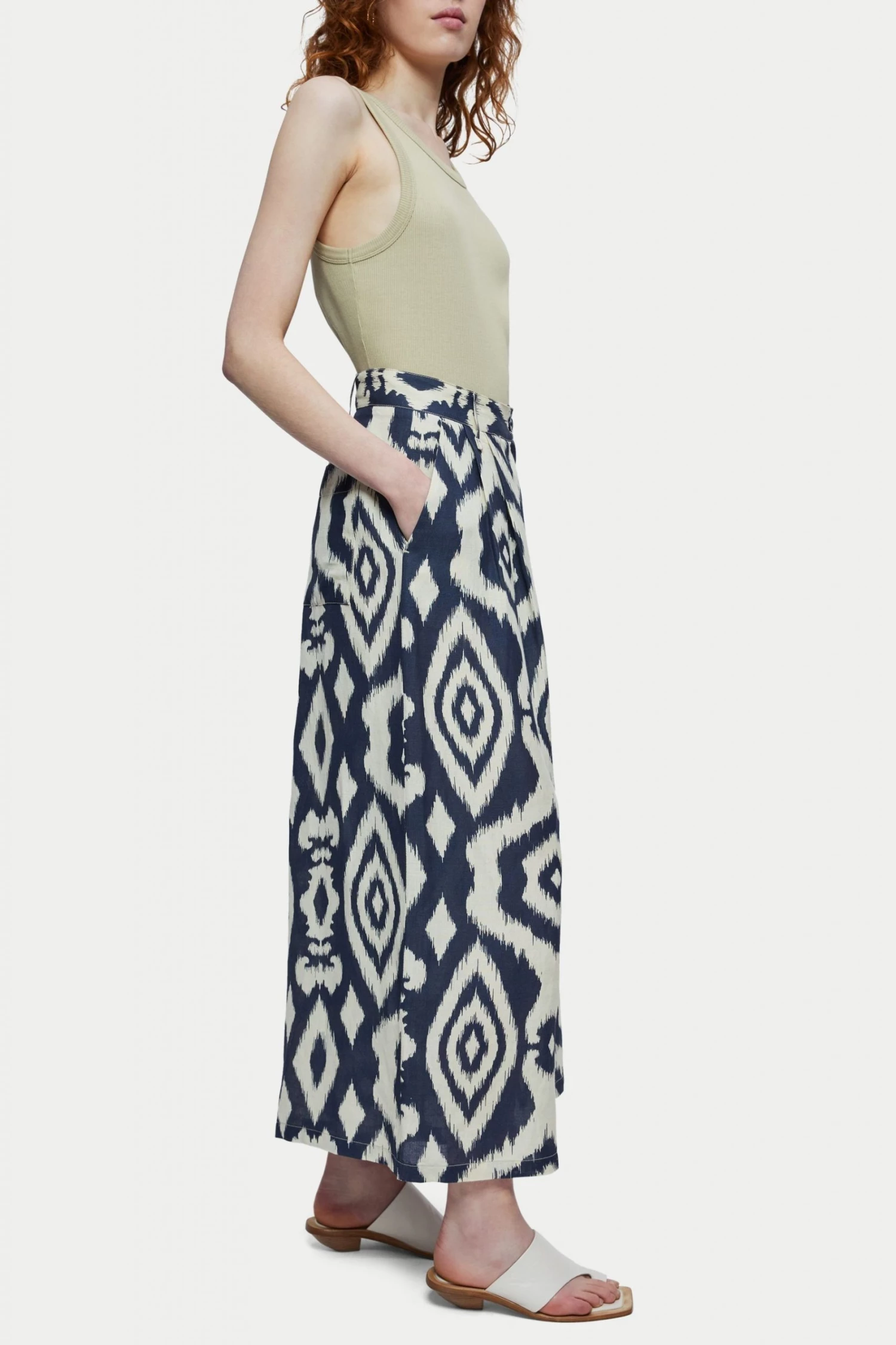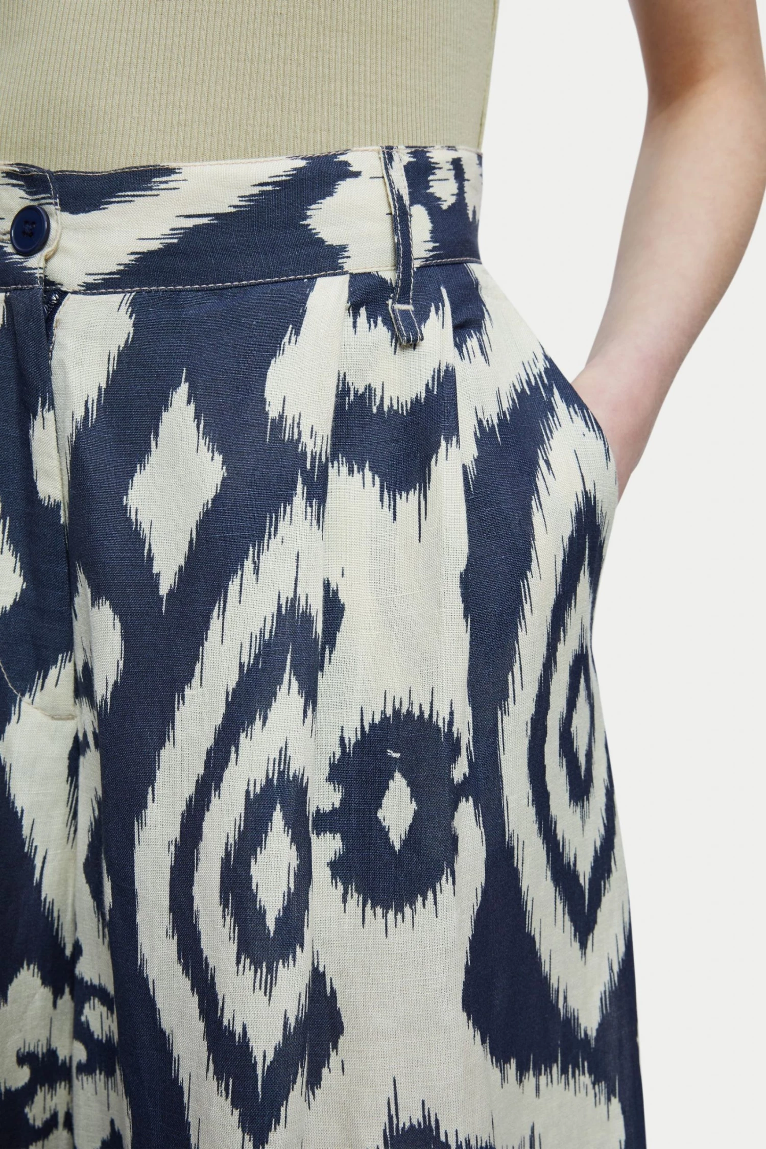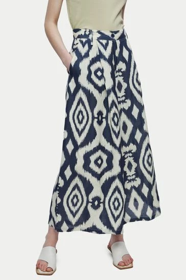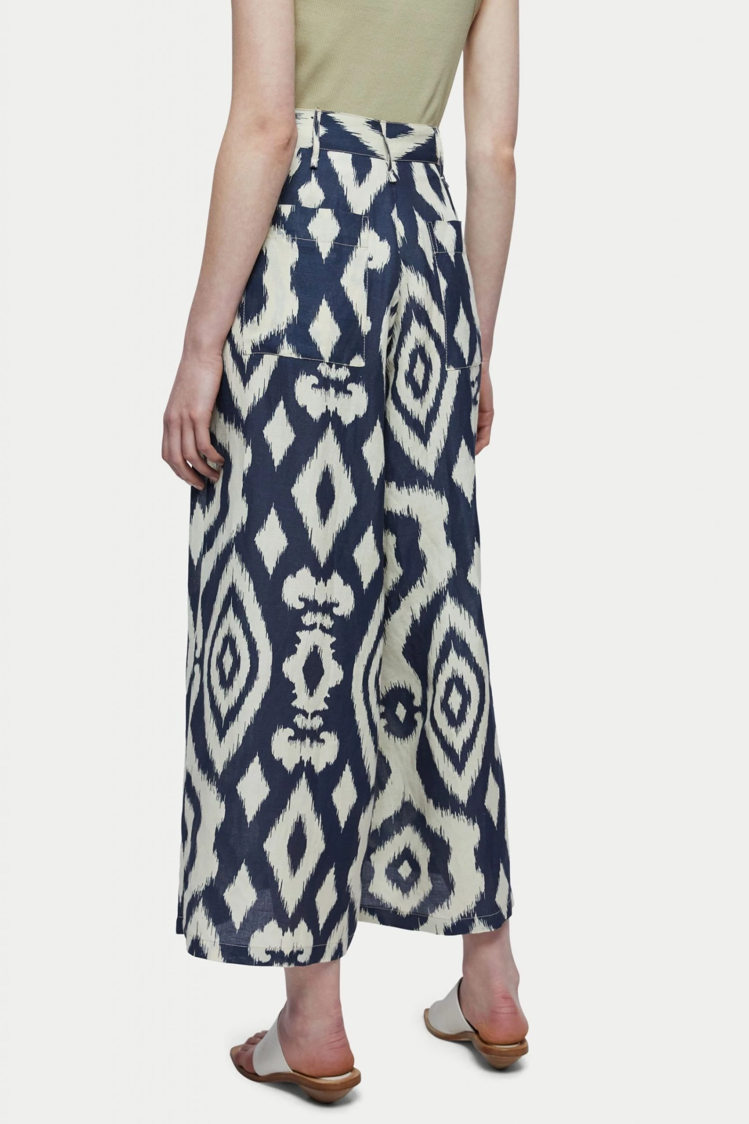 Linen viscose mix loose leg culotte in Jigsaw’s Ikat print. Loose and easy fit ankle length culotte with front pleat. Back patch pockets and front side pockets.