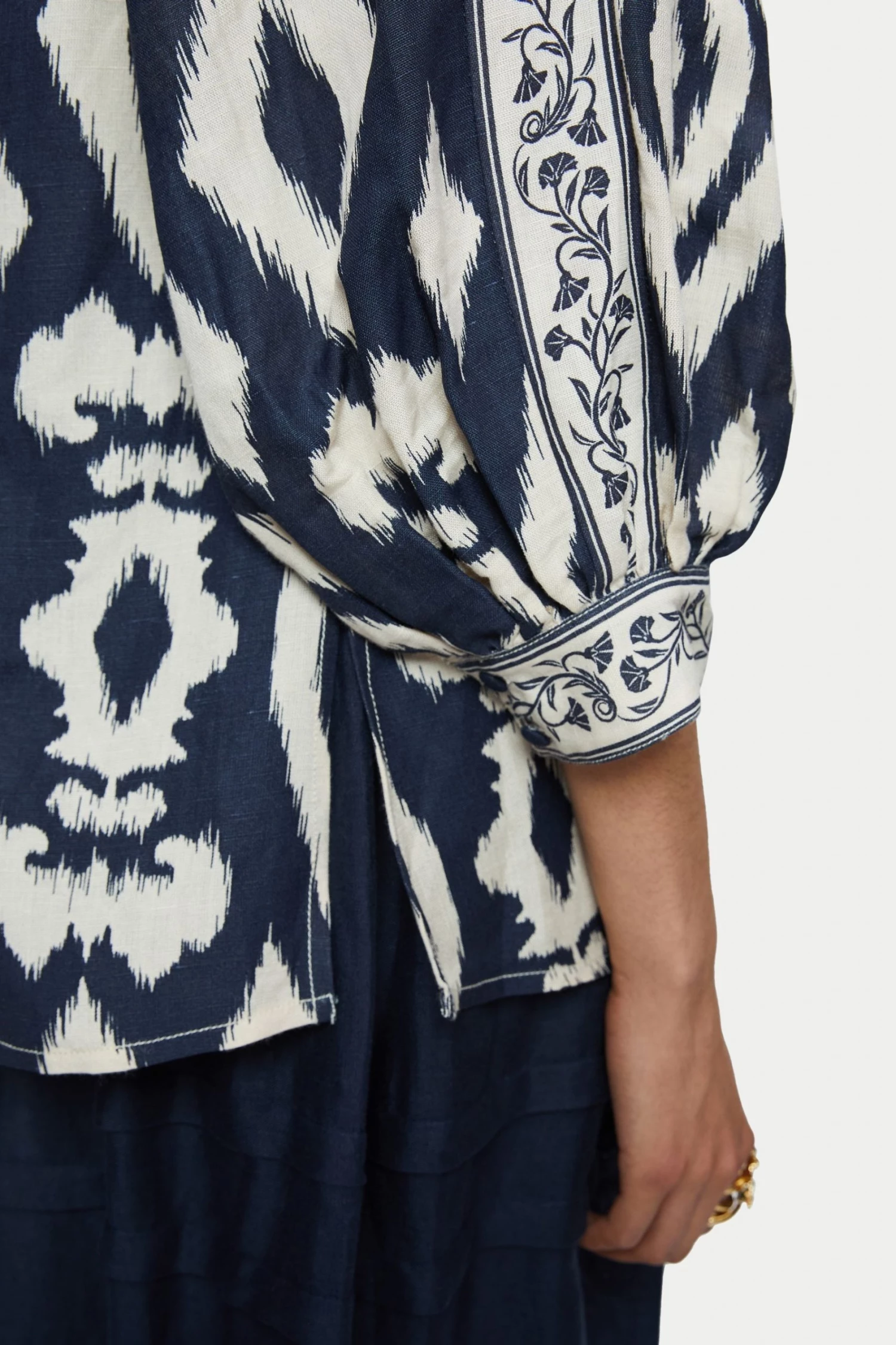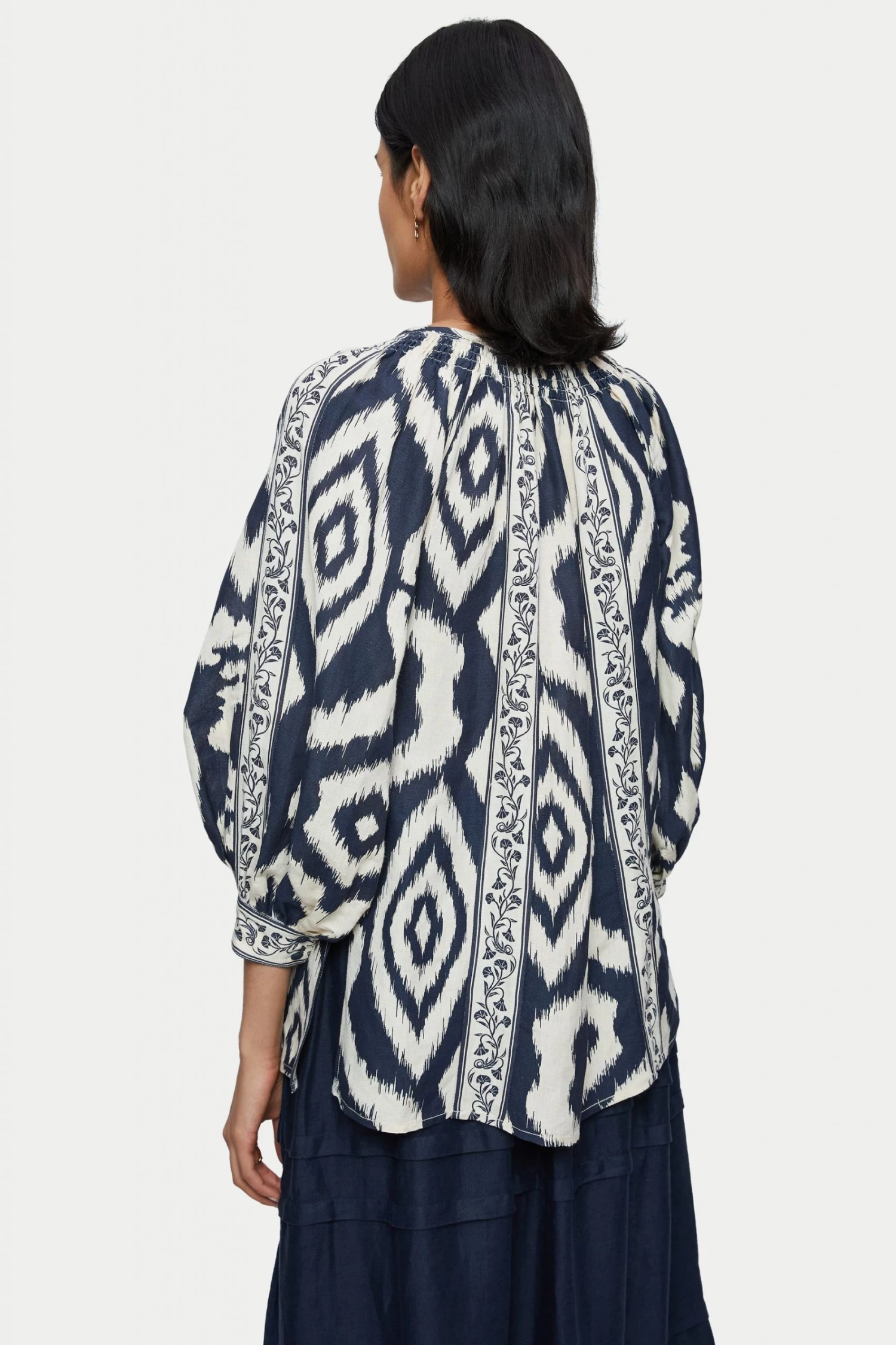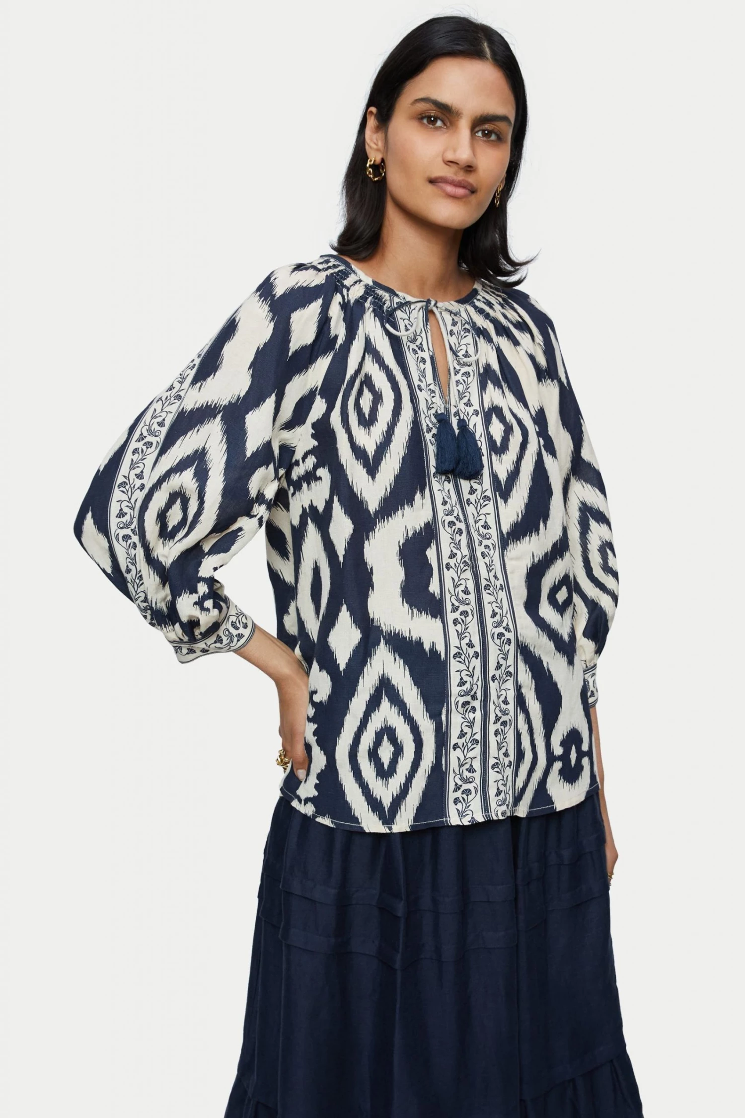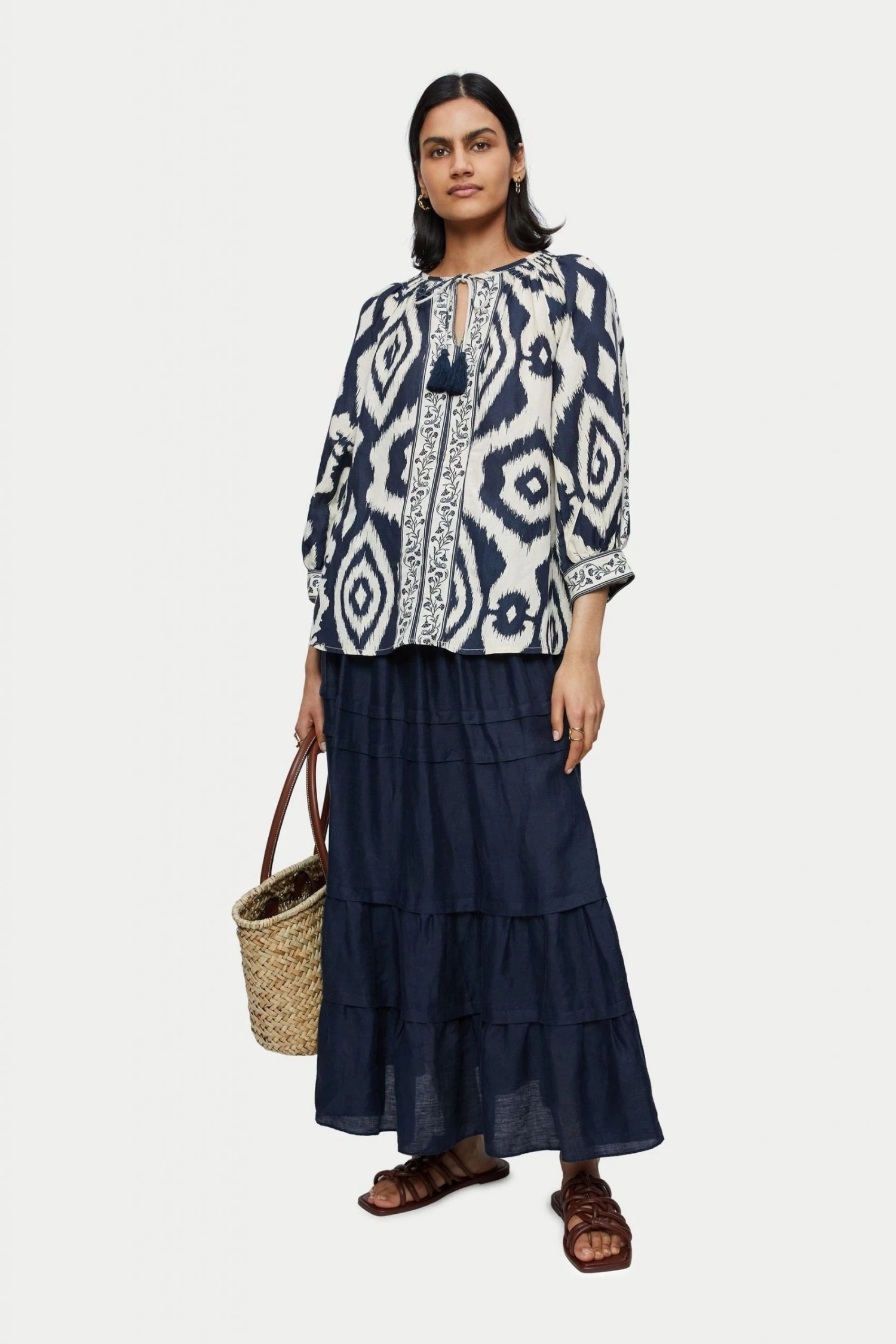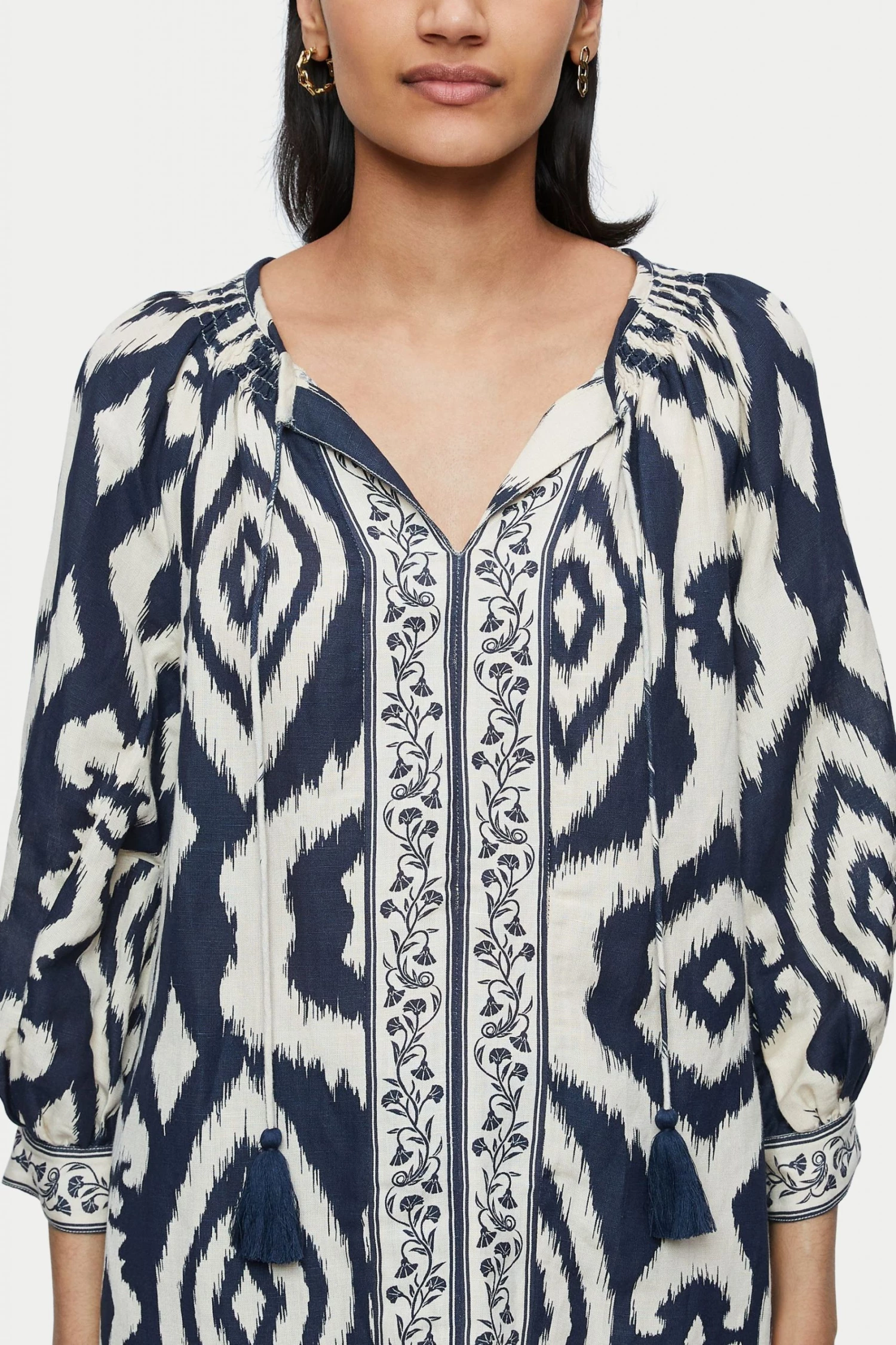 Linen viscose top in their Ikat print. Easy fit with short sleeves and round neck with tassle tie detail. The unique Ikat print was developed in house. Featuring contrast panel inserts on front and back.