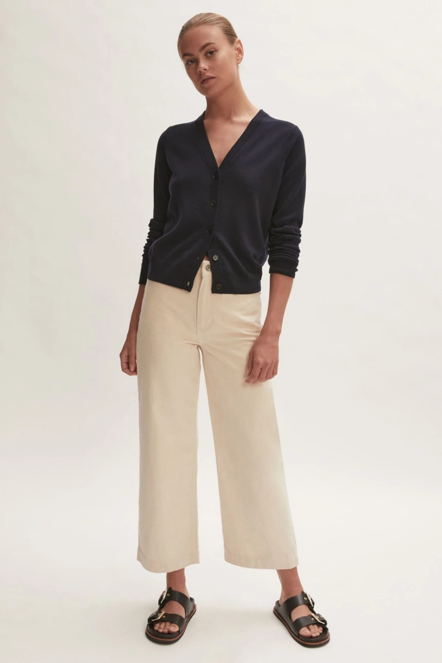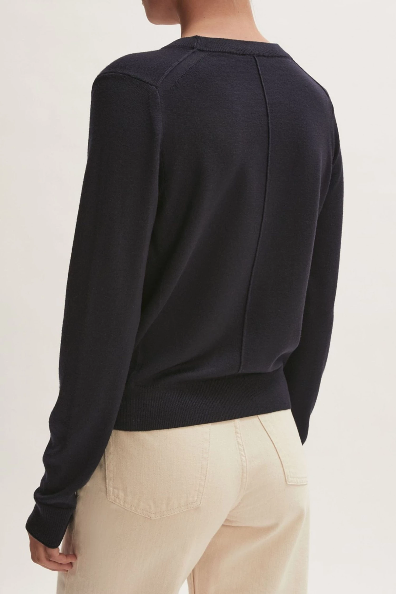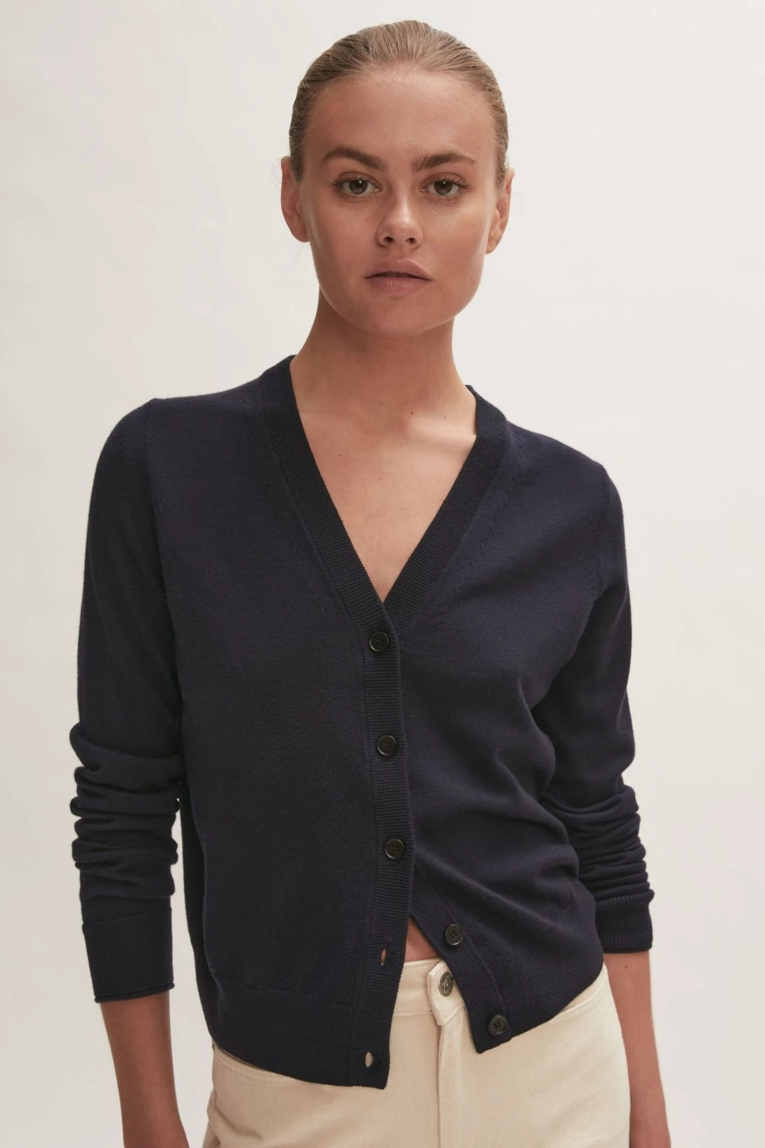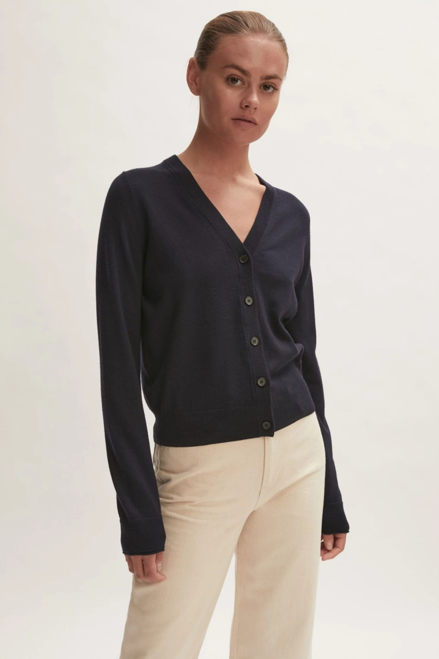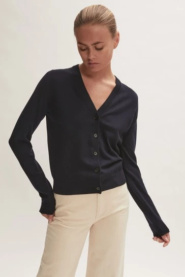 This cardigan is crafted with 100% Merino wool yarn. Features a V-neck, long sleeves and a fine ribbed placket. Regular fit. Essential piece for layering.