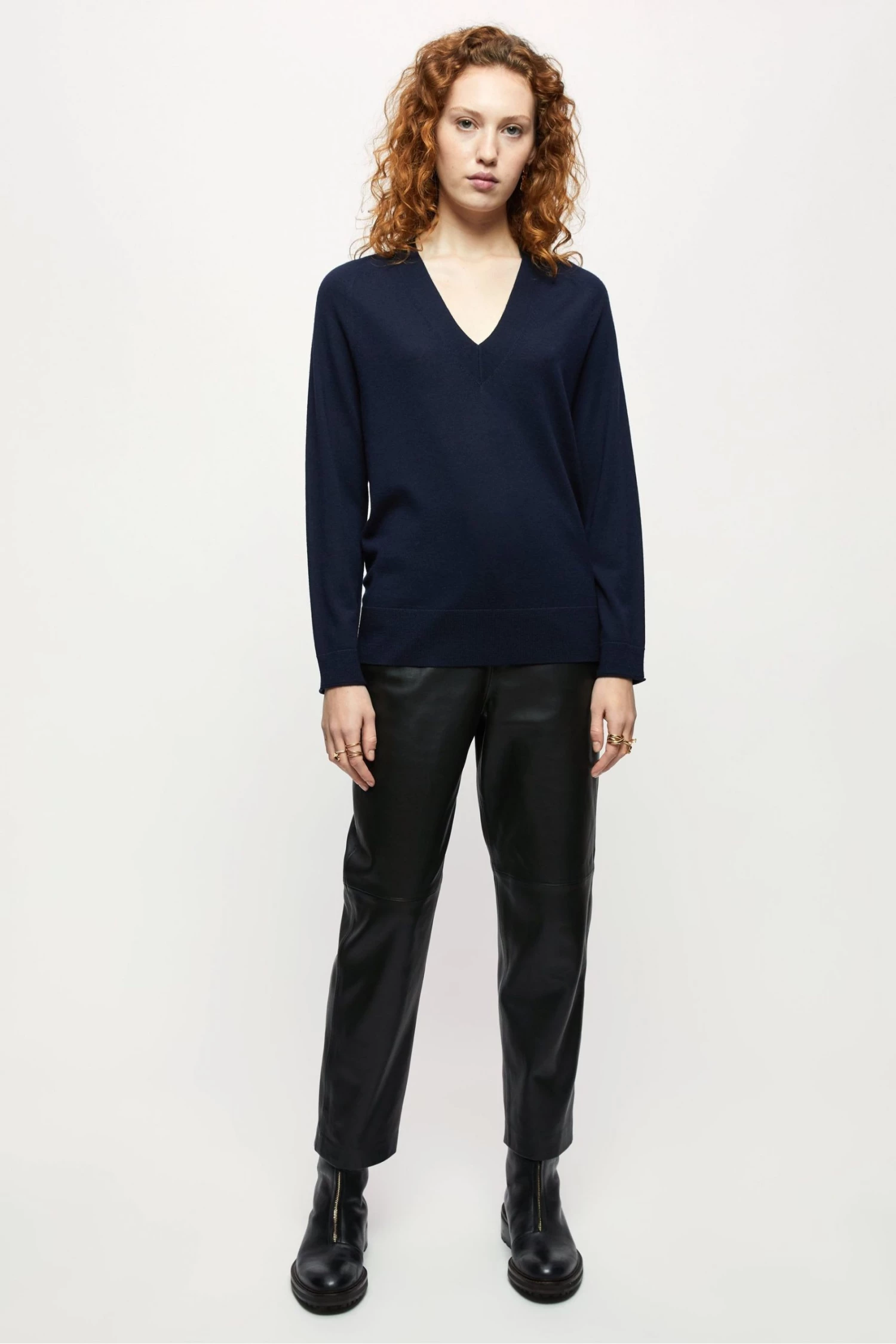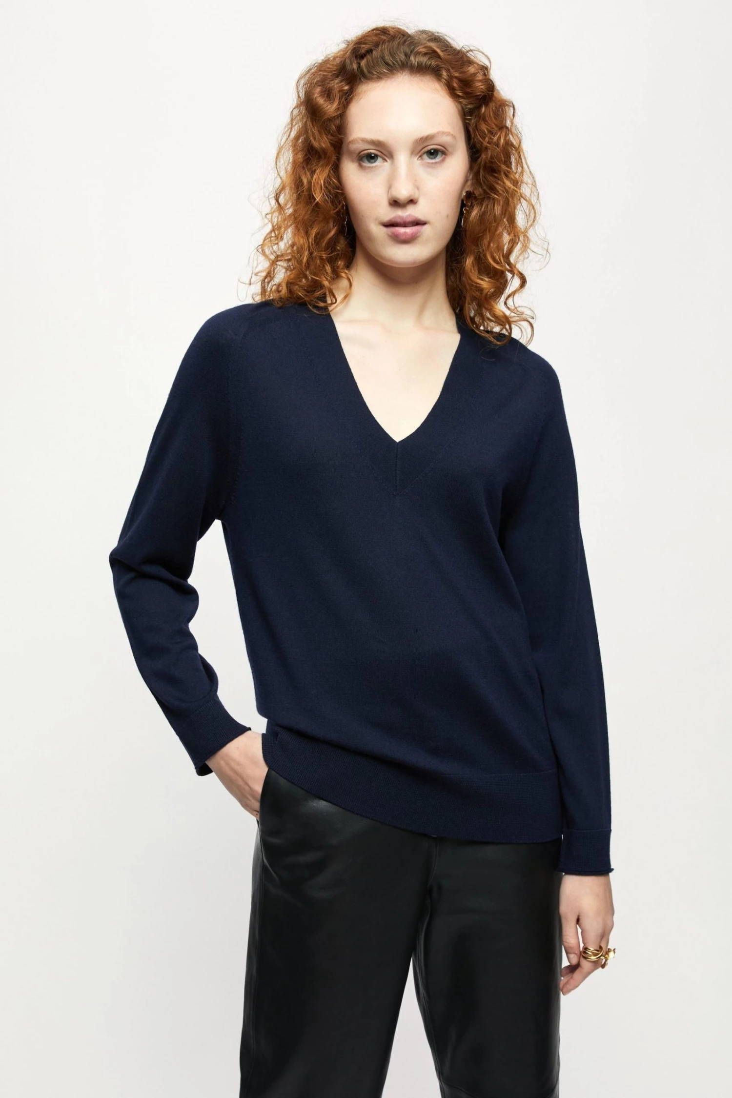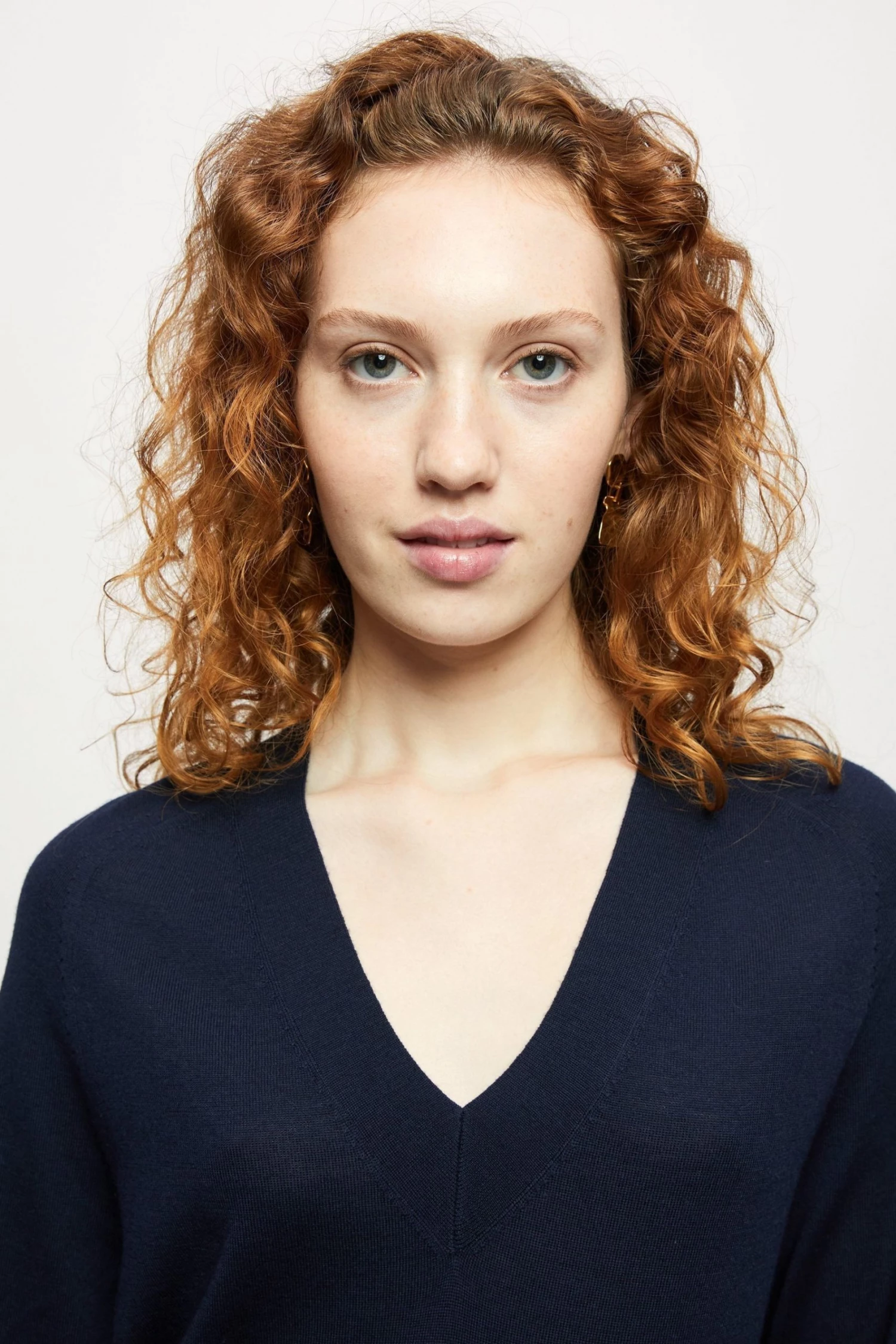 Slouchy V-neck jumper made from 100% ZQ Merino wool. Dropped shoulders, rolled edge cuffs and rib detail at the neckline and hem. Finished with exposed seam detail. Oversized fit for a warm and cosy feeling.