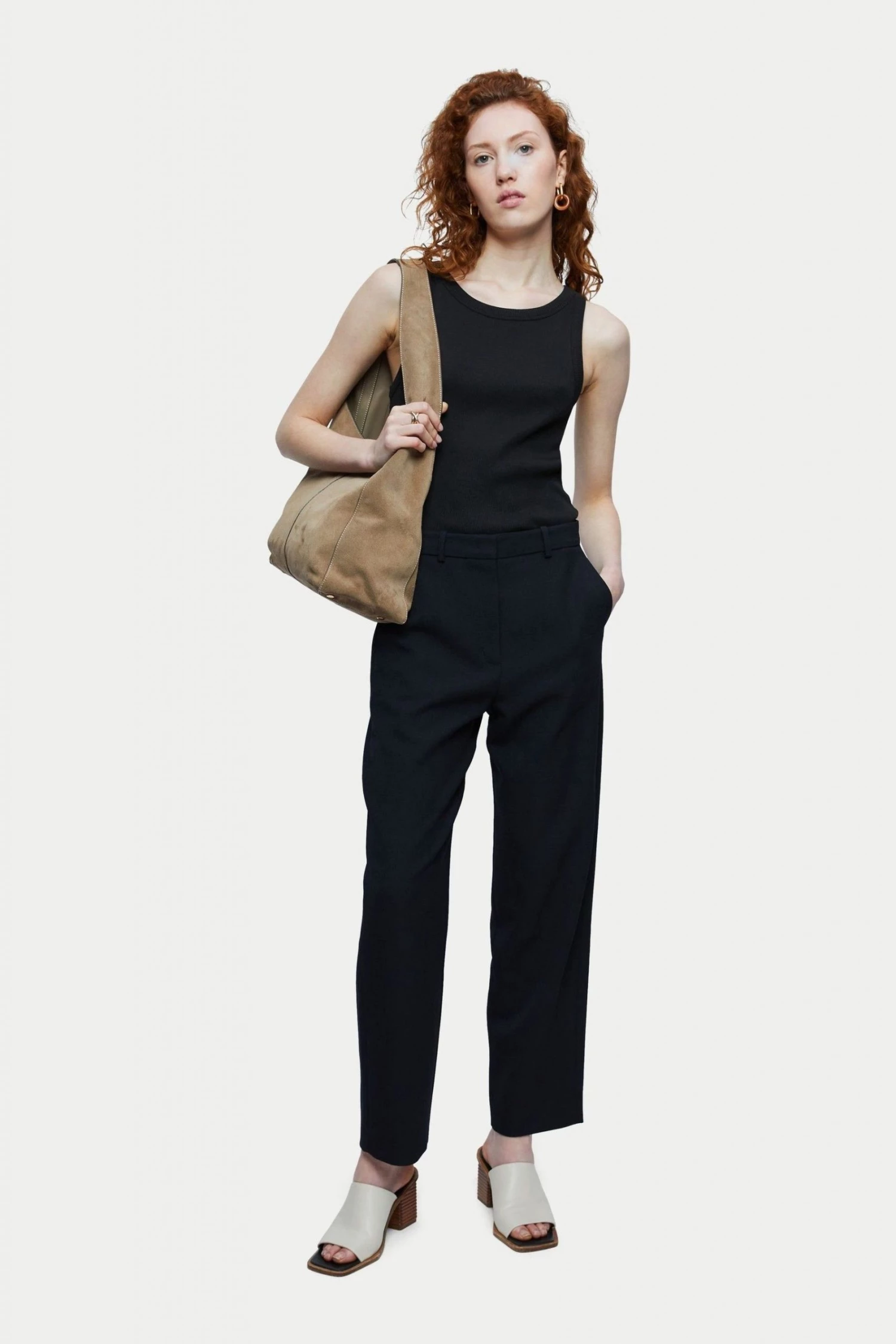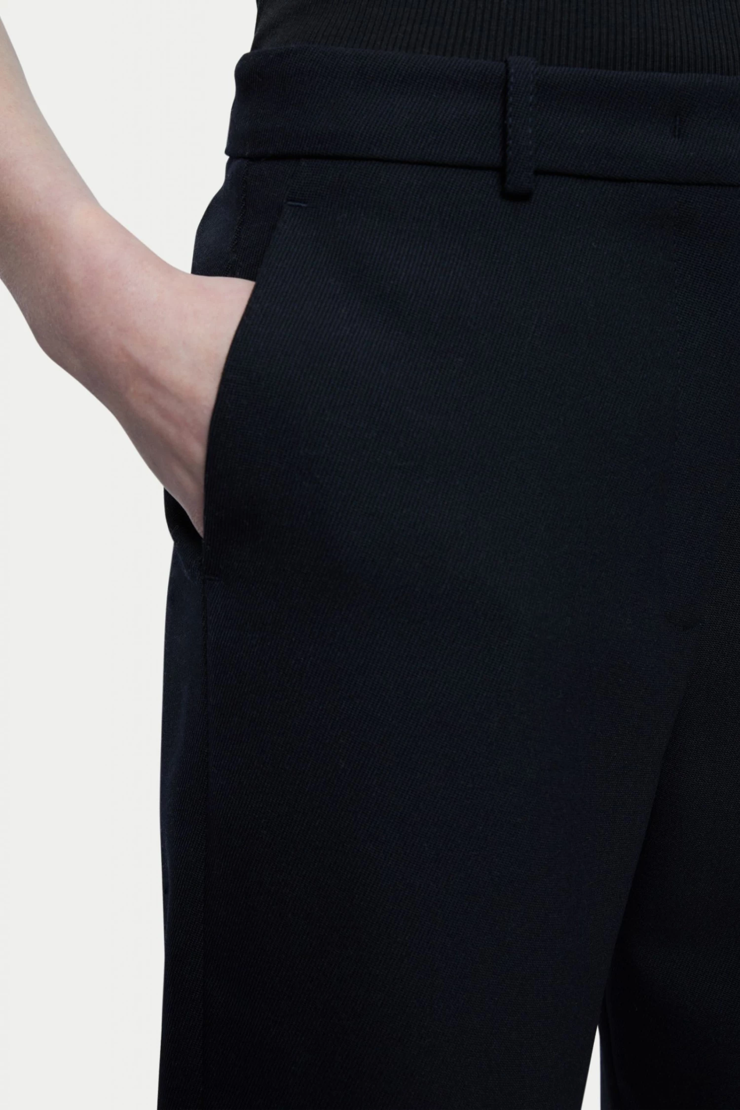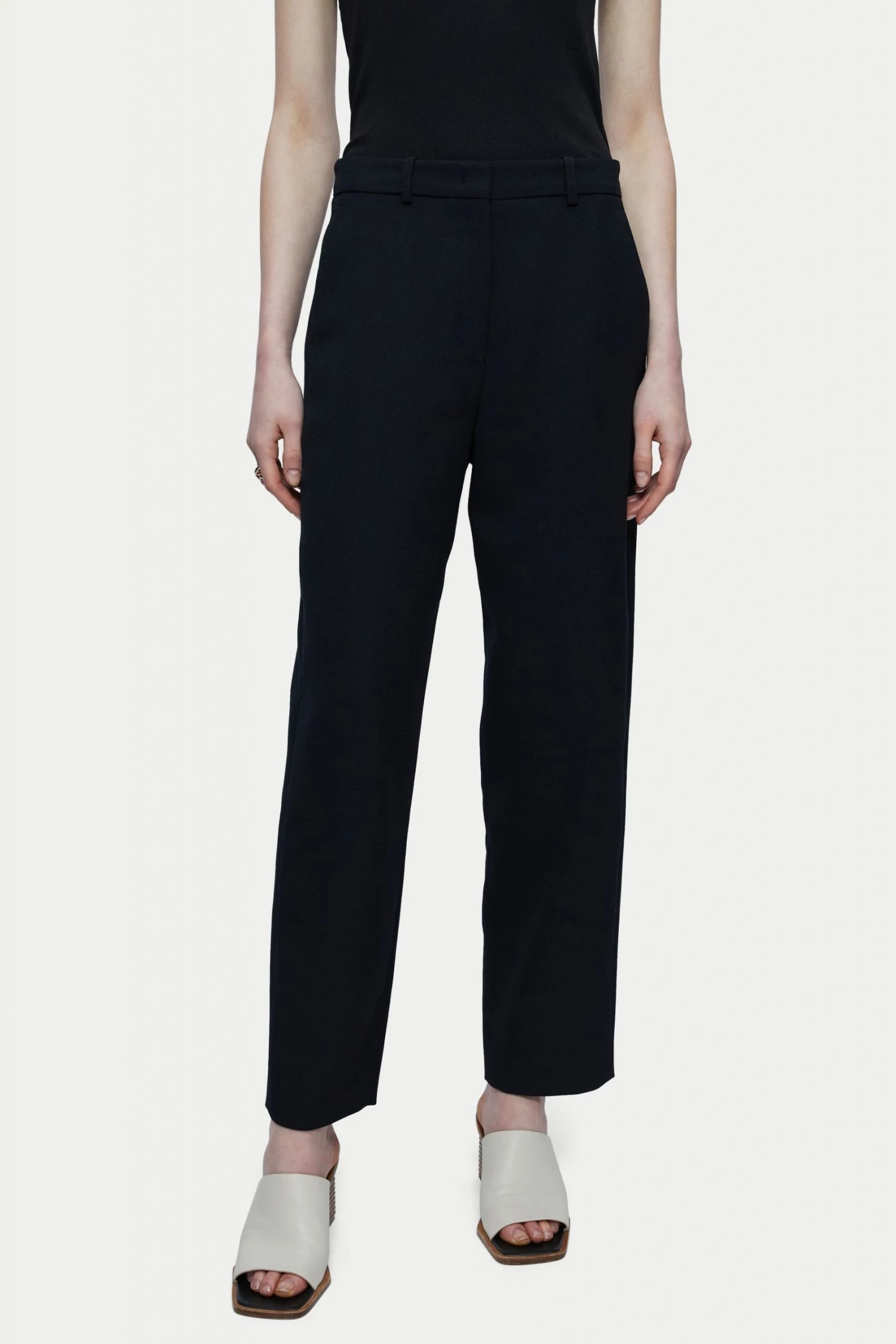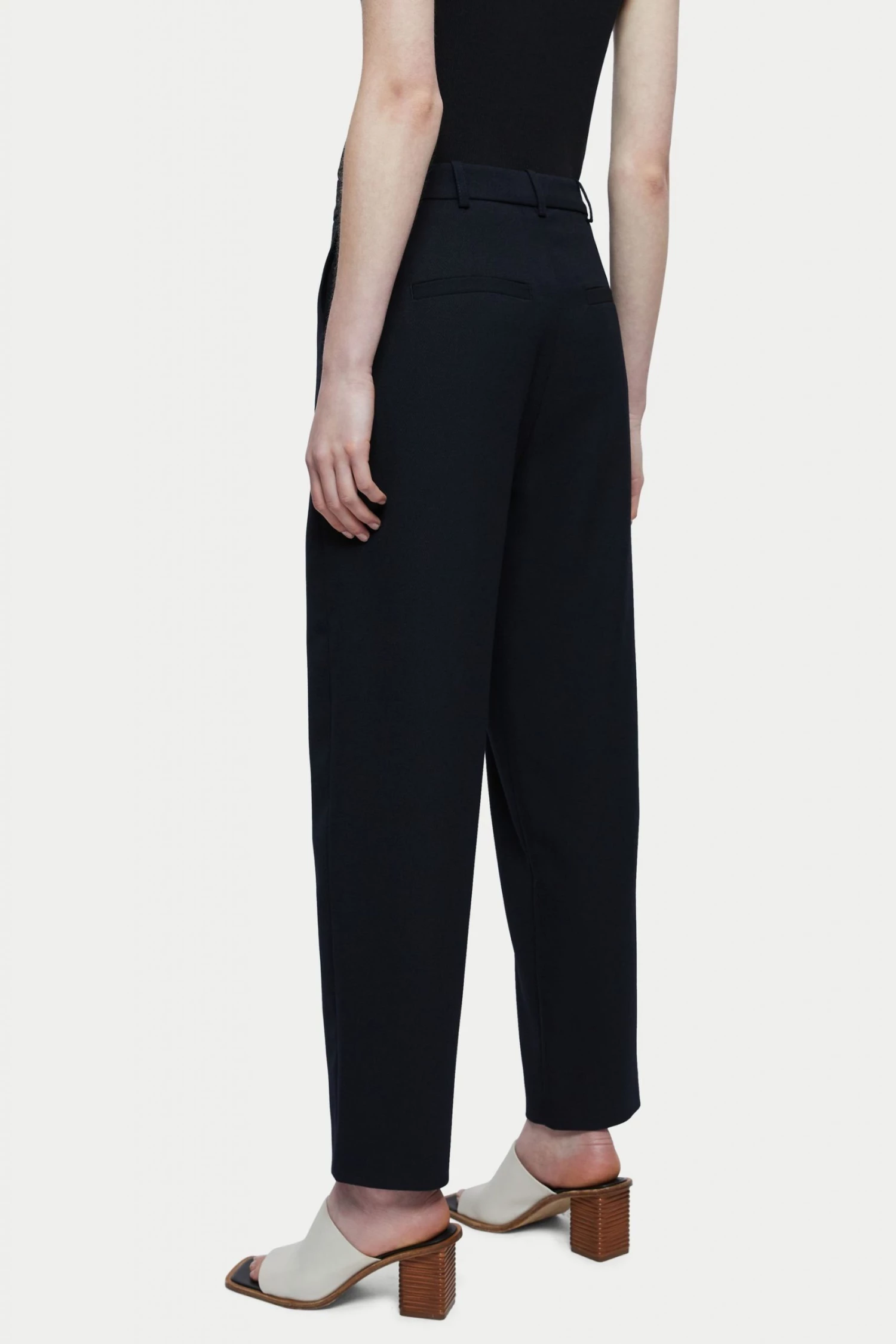 Barrel leg tapered trousers in soft wool with a twill weave. Features a tailored waistband, belt loops, fly front with hook and bar fastening. Practical front slant pockets and a jetted pocket on the right back side.