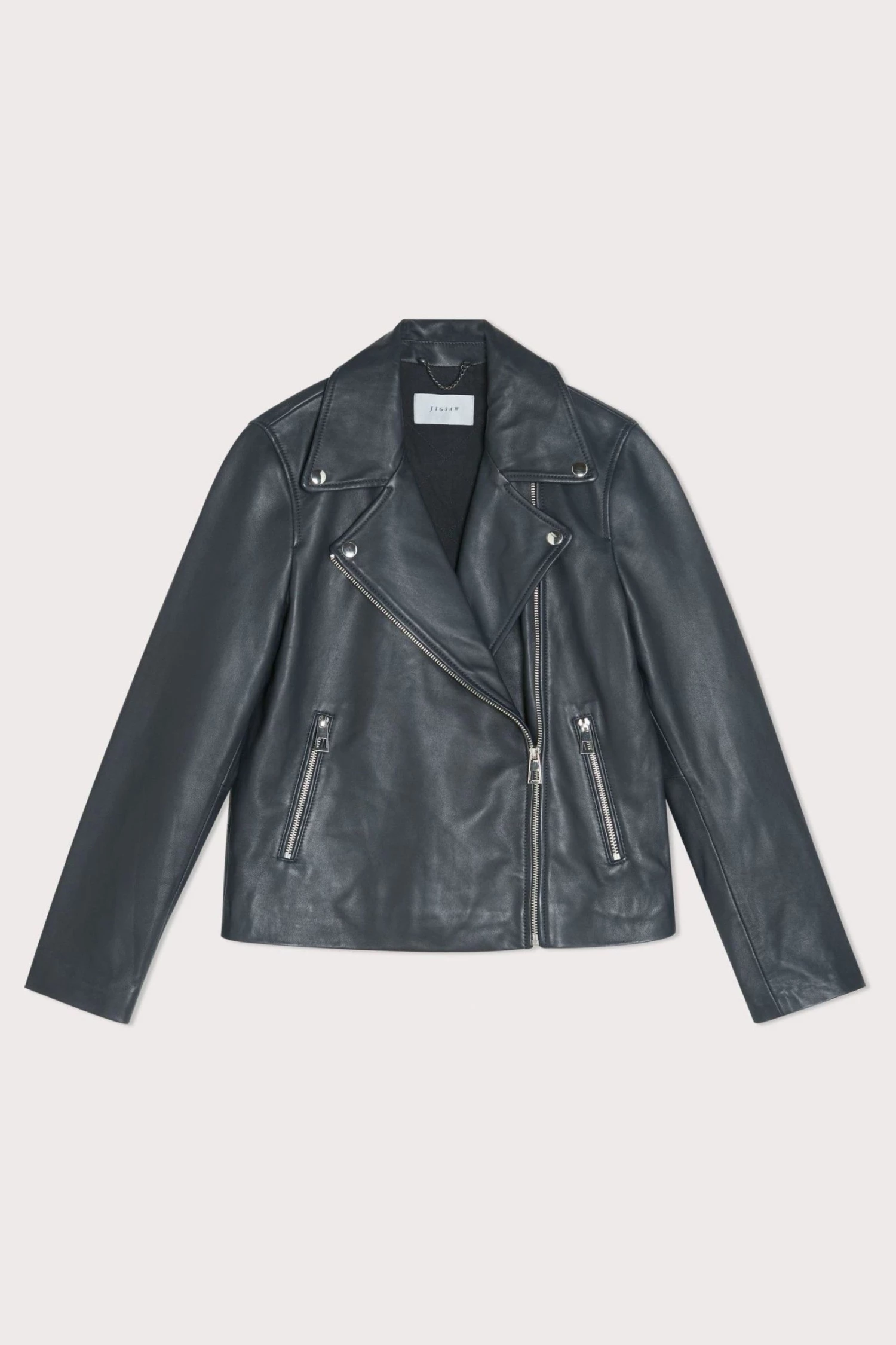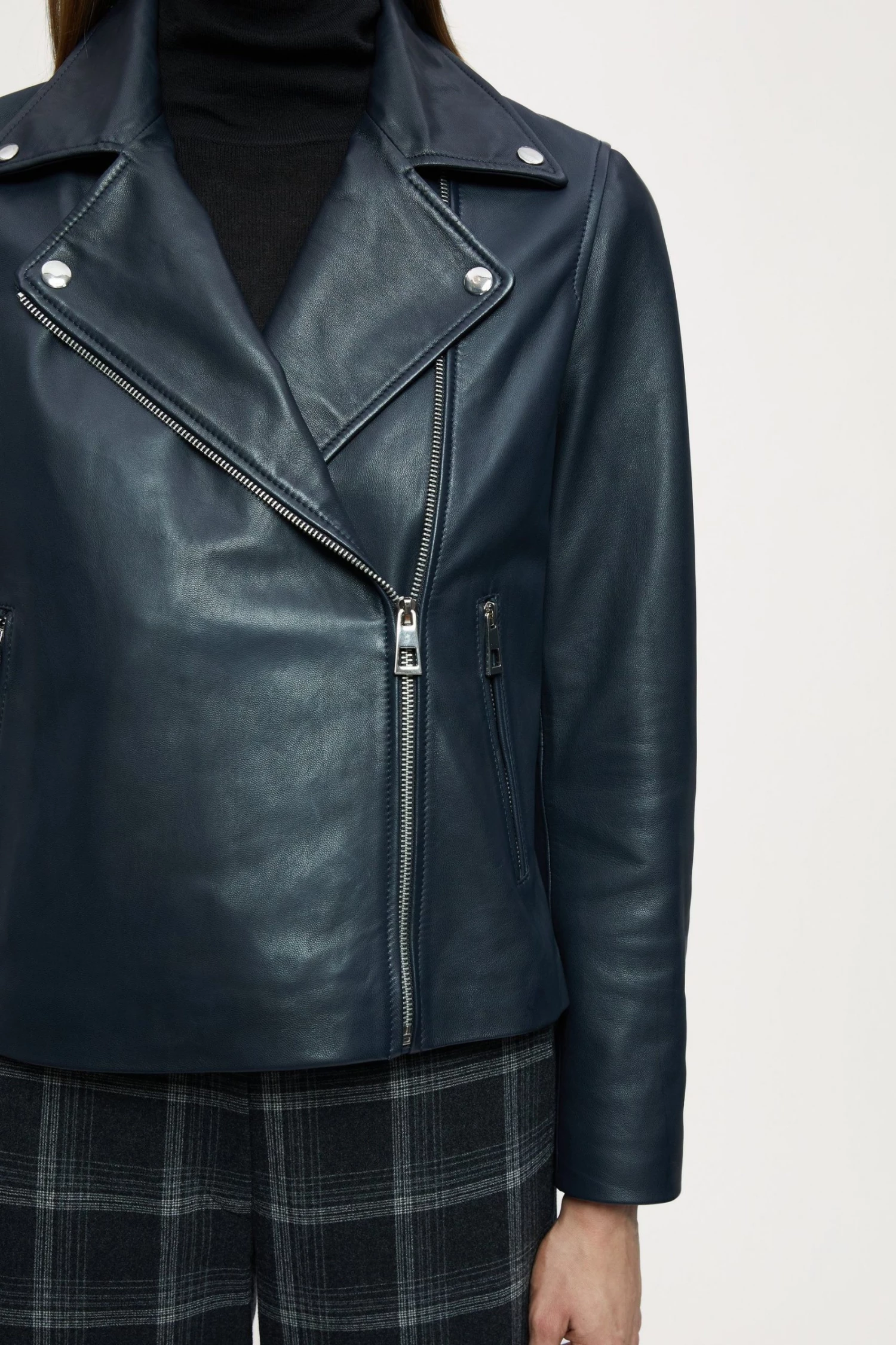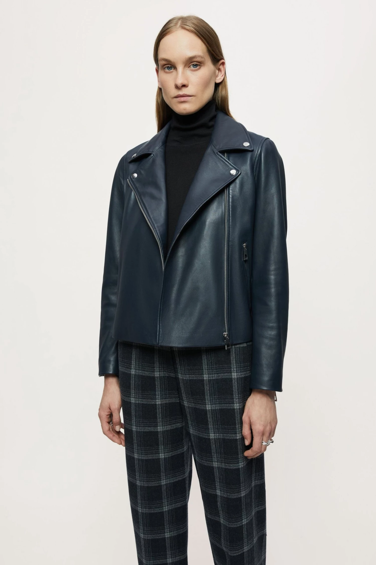Classic biker jacket in soft leather, with shiny nickel trims. Straight fit, long sleeves with zip front closure, metal snaps, side pockets and sleeve vents with zips.
