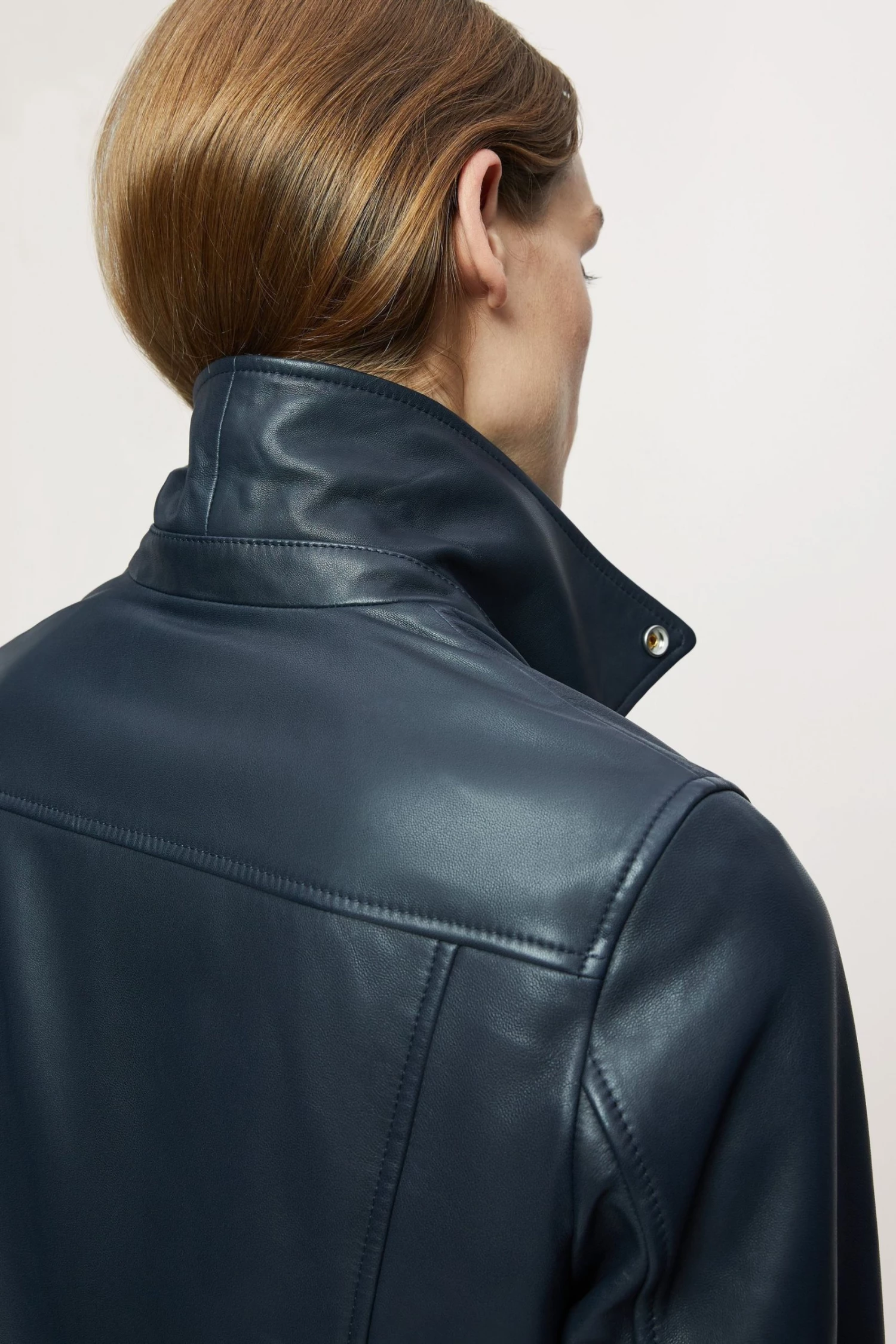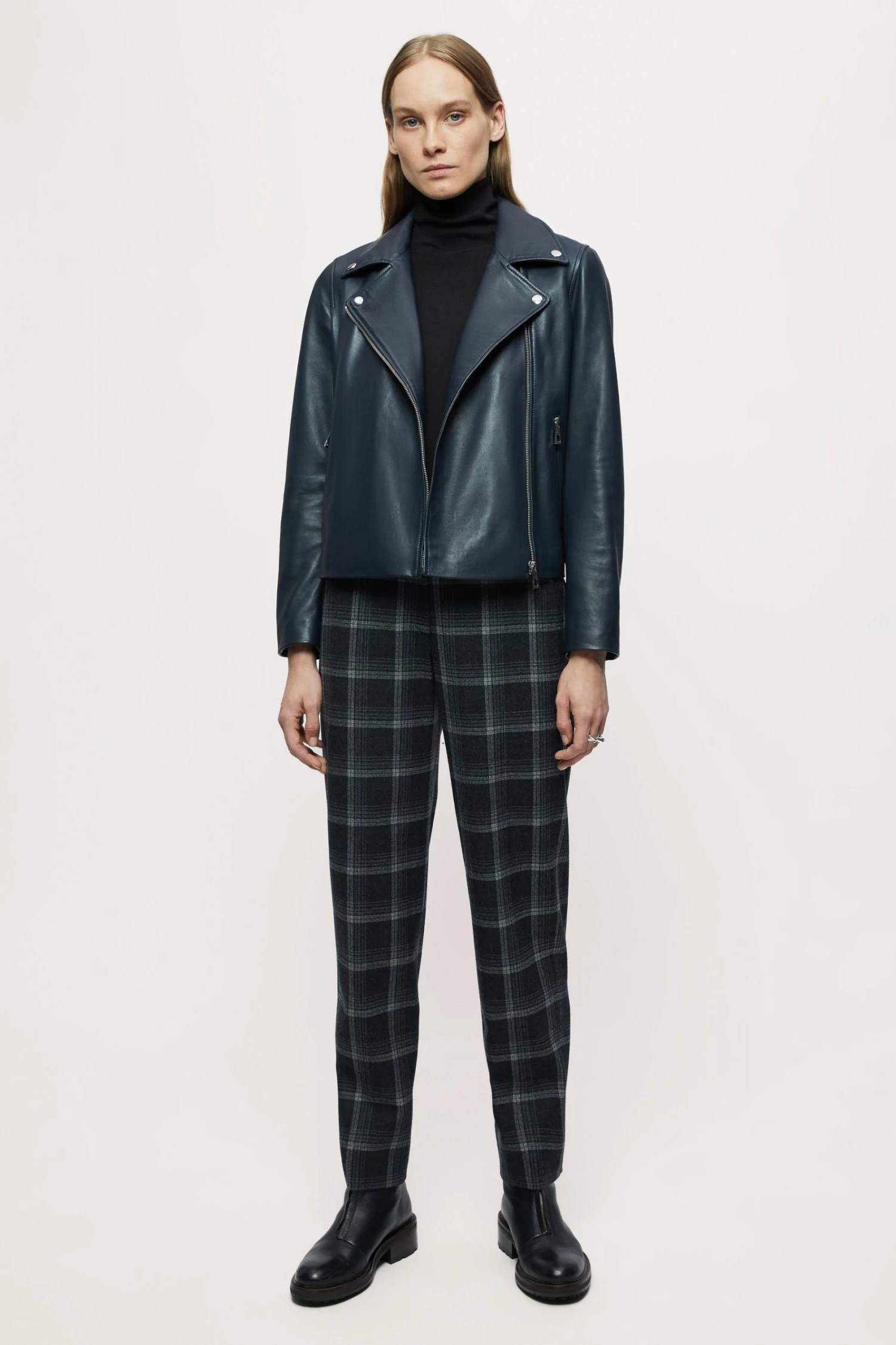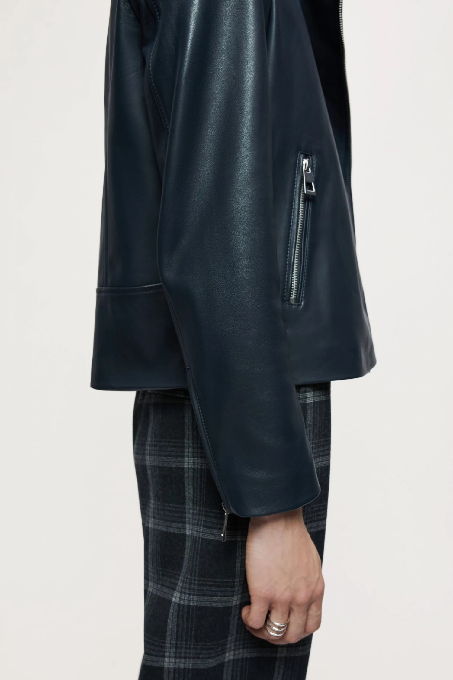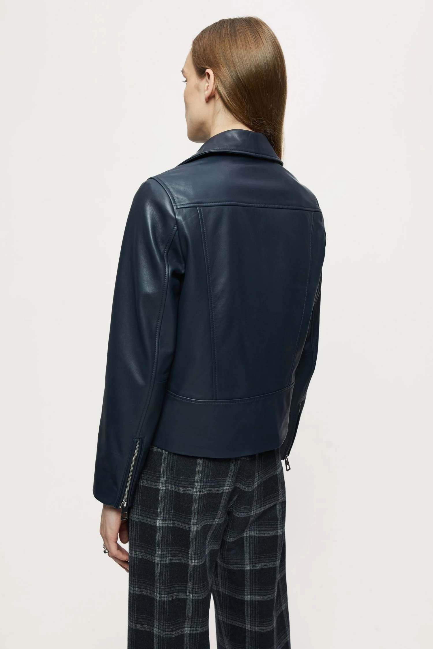 Classic biker jacket in soft leather, with shiny nickel trims. Straight fit, long sleeves with zip front closure, metal snaps, side pockets and sleeve vents with zips.