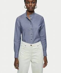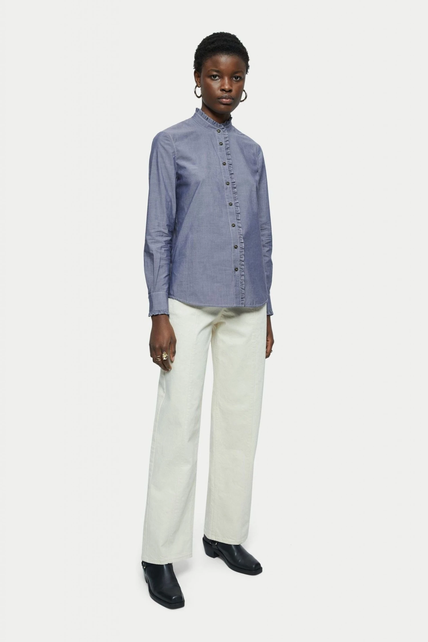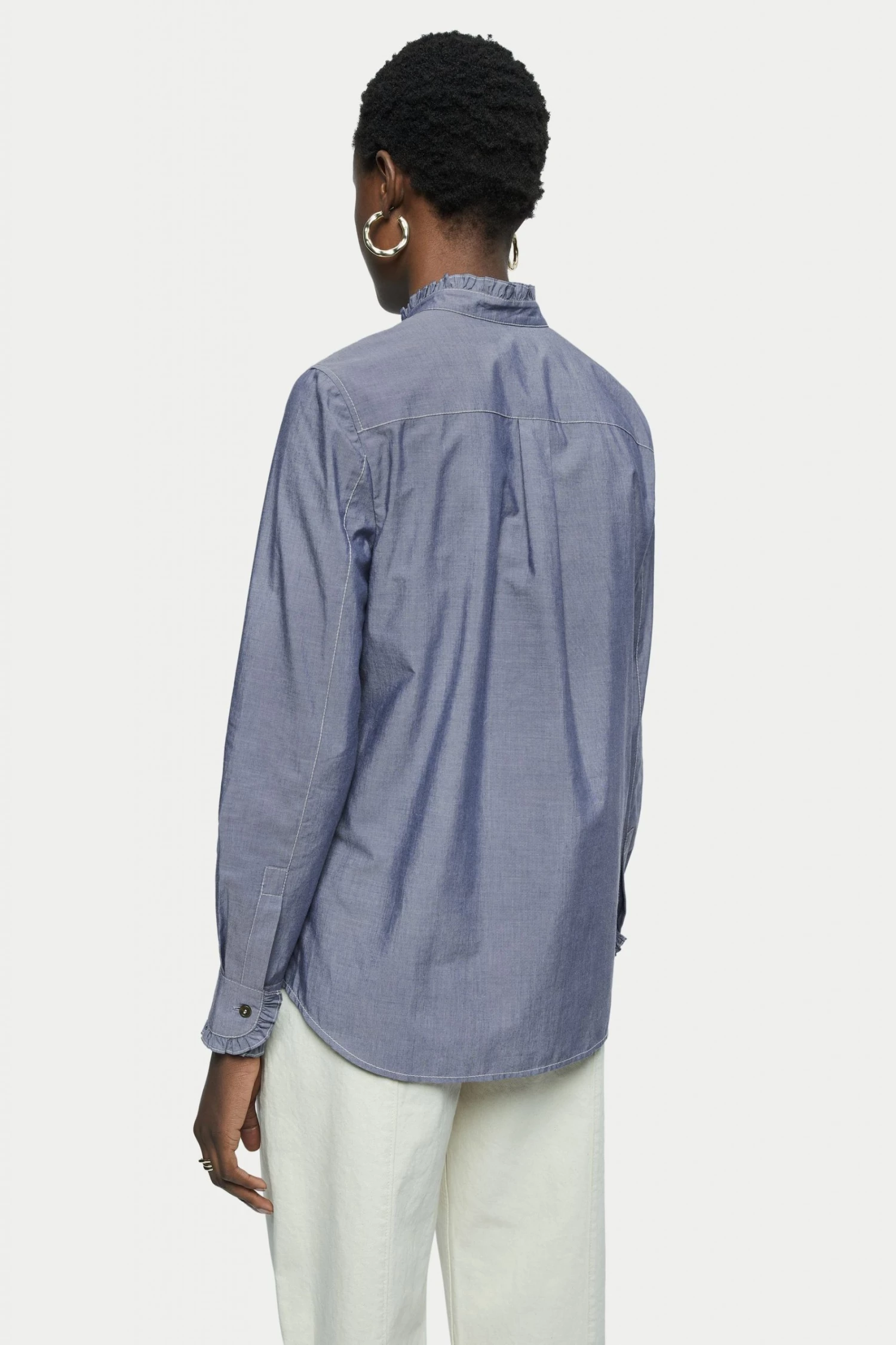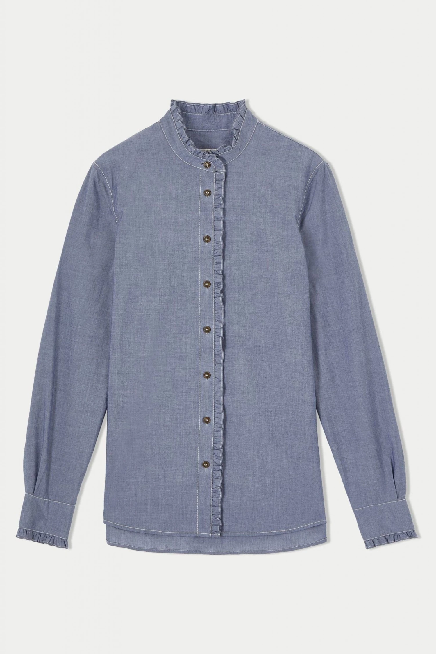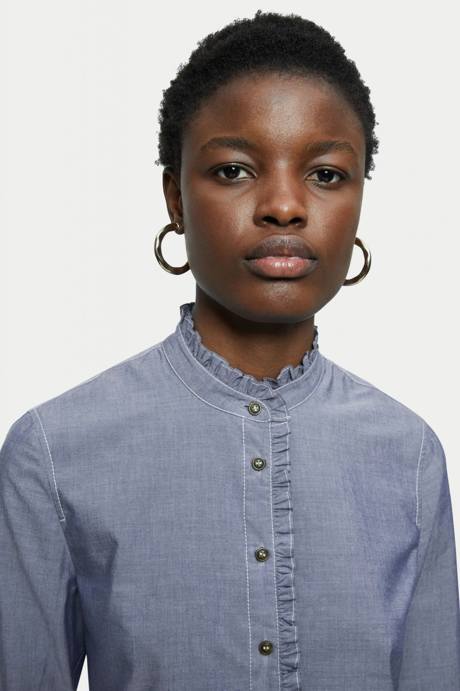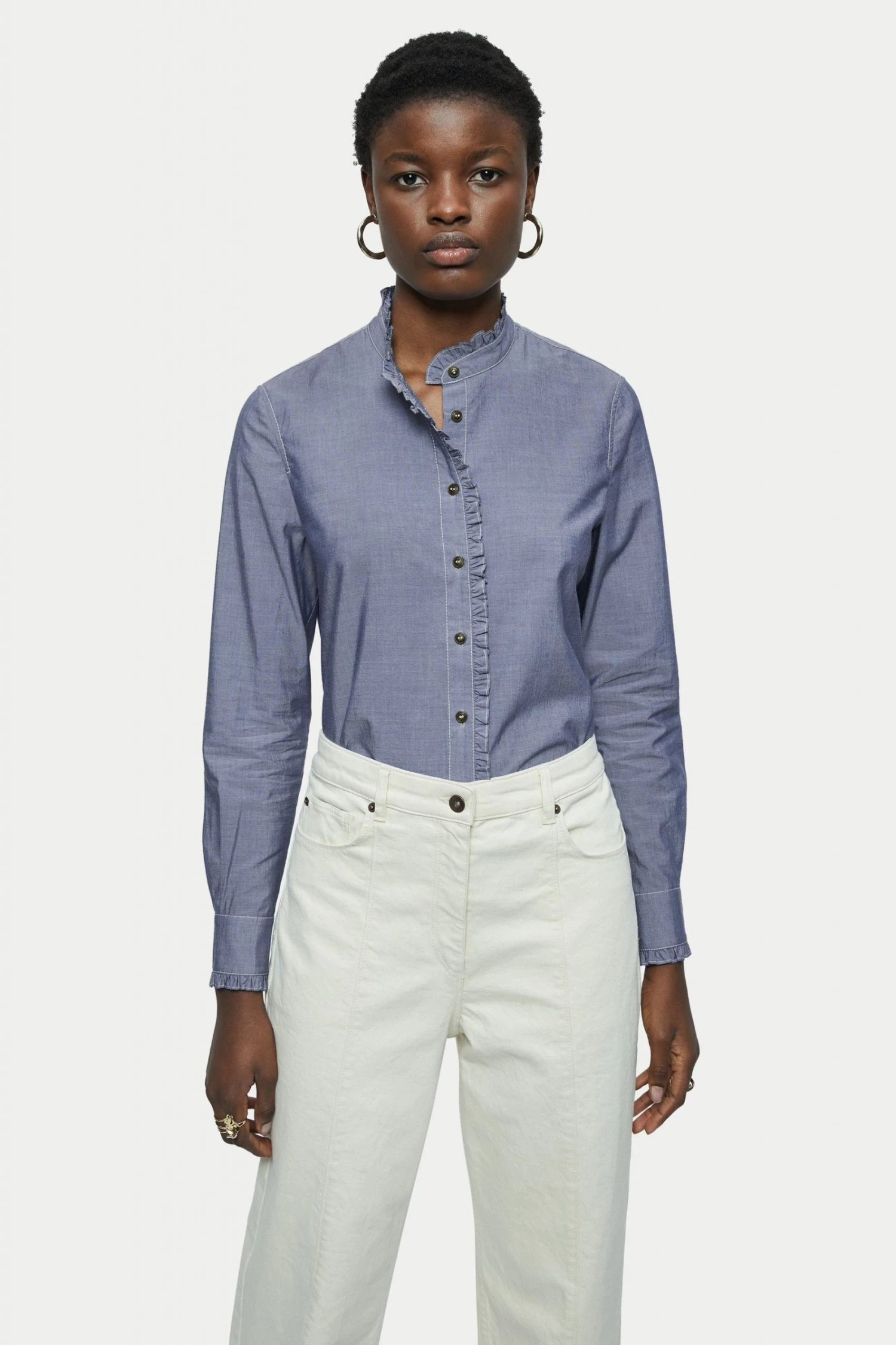 Light chambray ruffle shirt featuring romantic ruffle detail on the collar. The shirt is loose fitting with a straight silhouette. The perfect shirt for dressing up or dressing down.