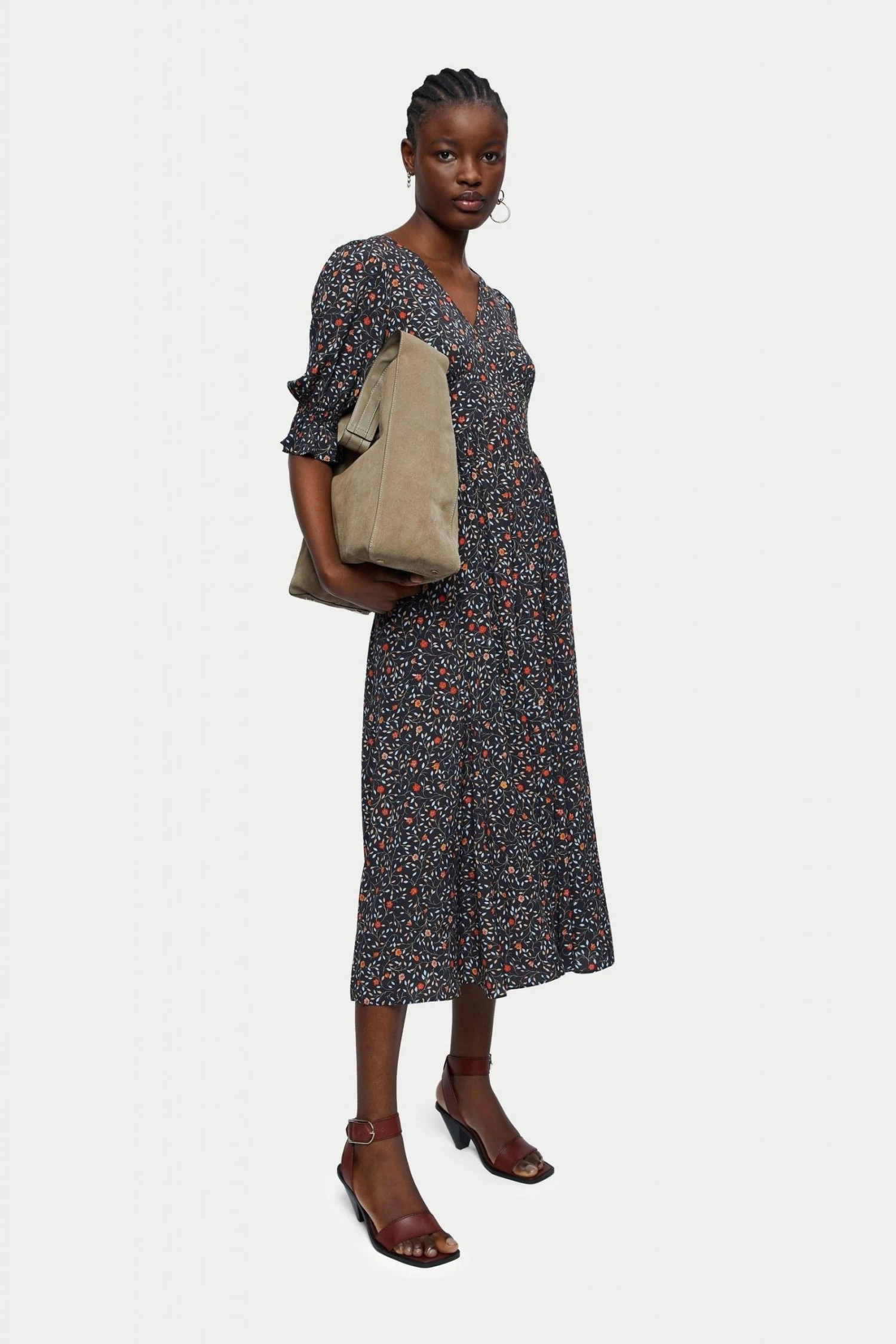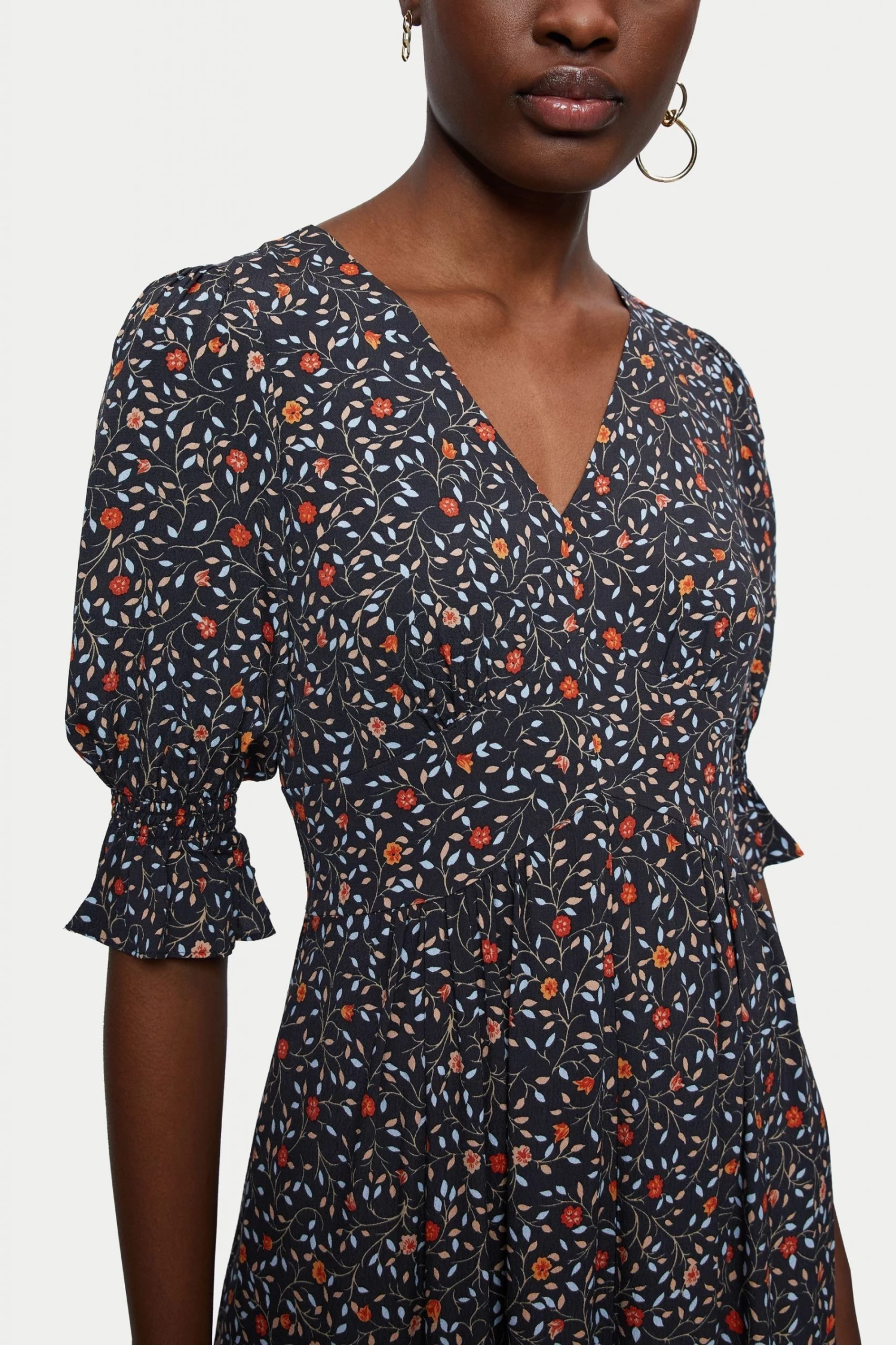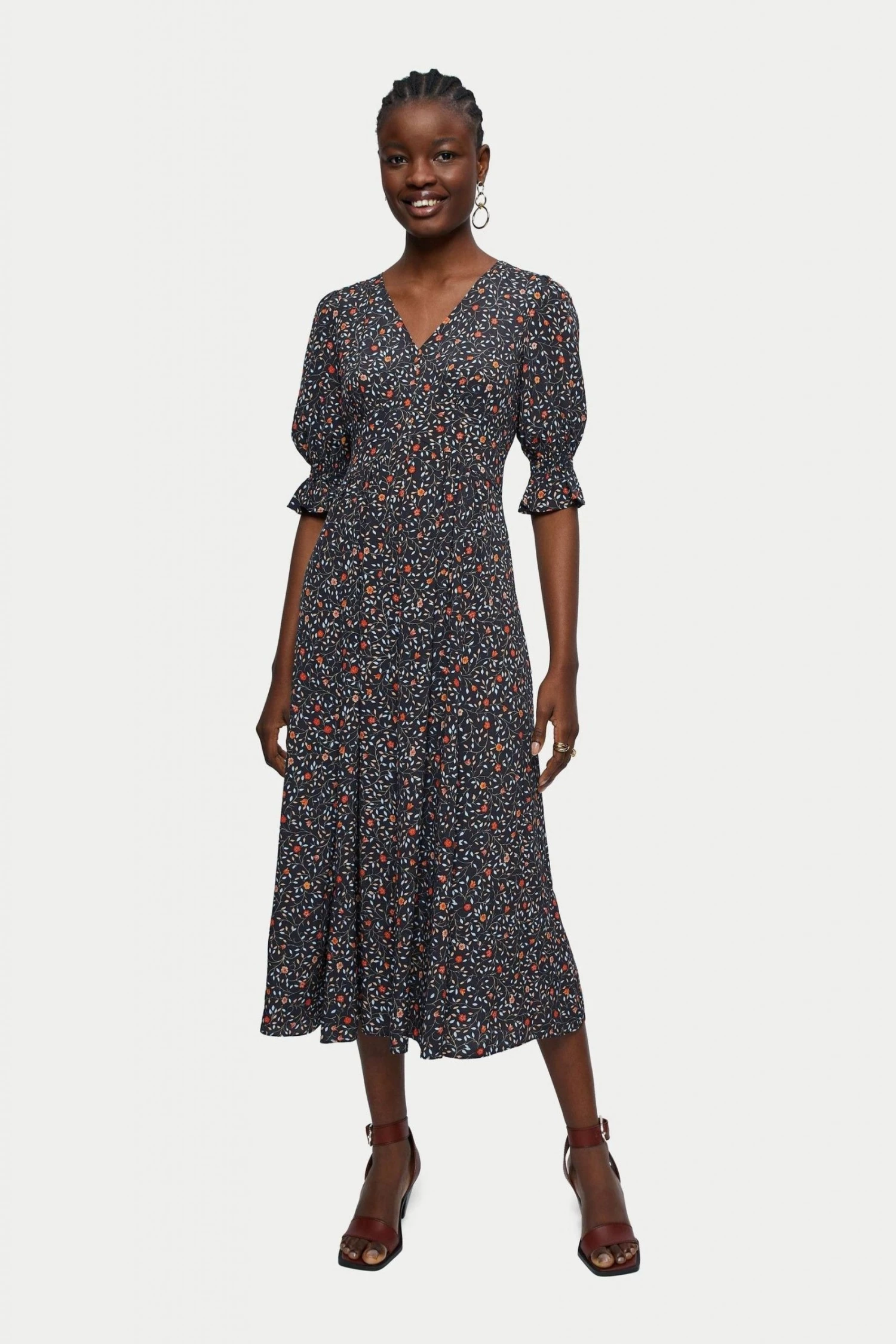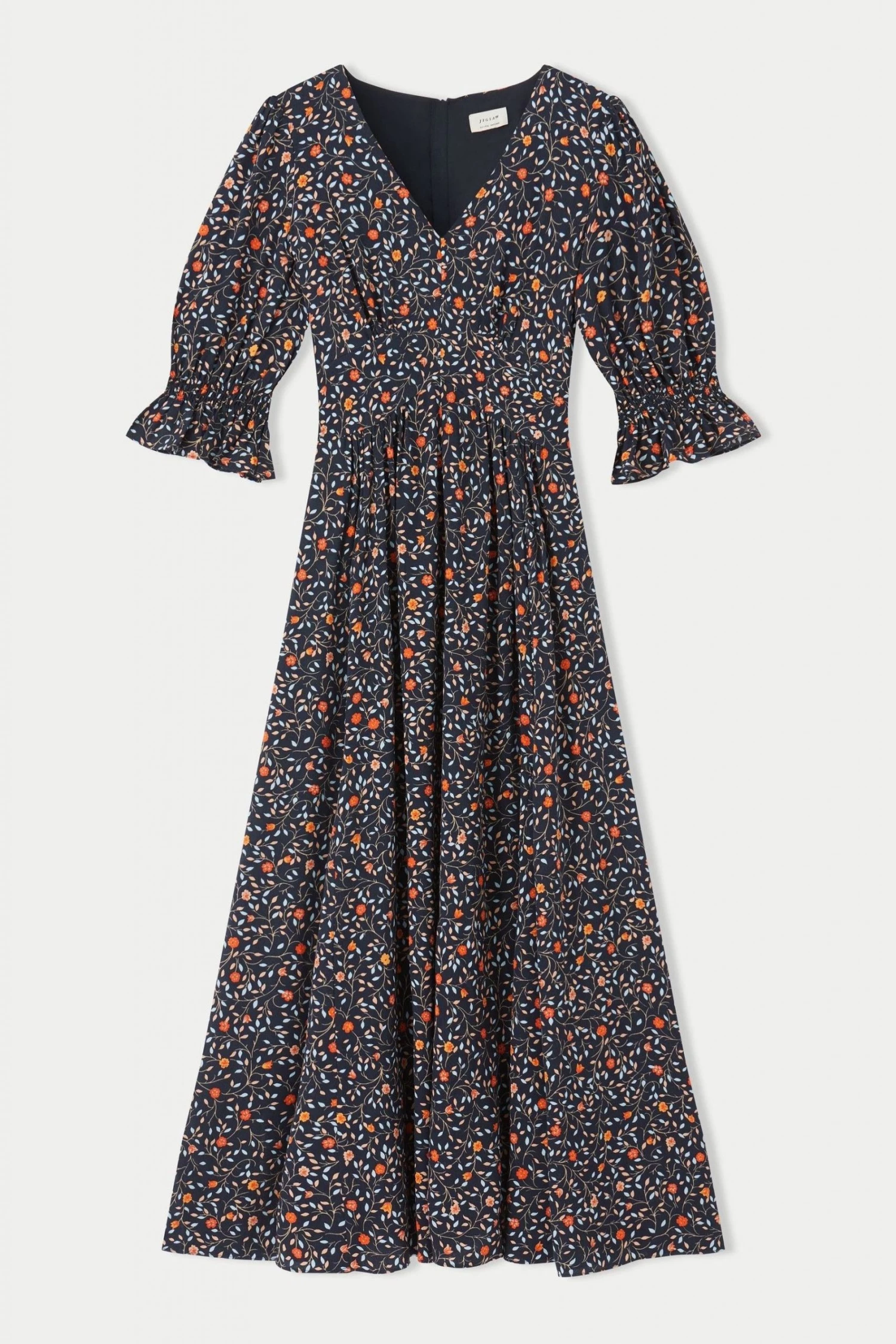 Midi length flared tea dress in Jigsaw’s Stem Ditsy print. Flattering low v-neck and elbow-length sleeves with a shirring and ruffle detail. Pair with sandals and a tote.