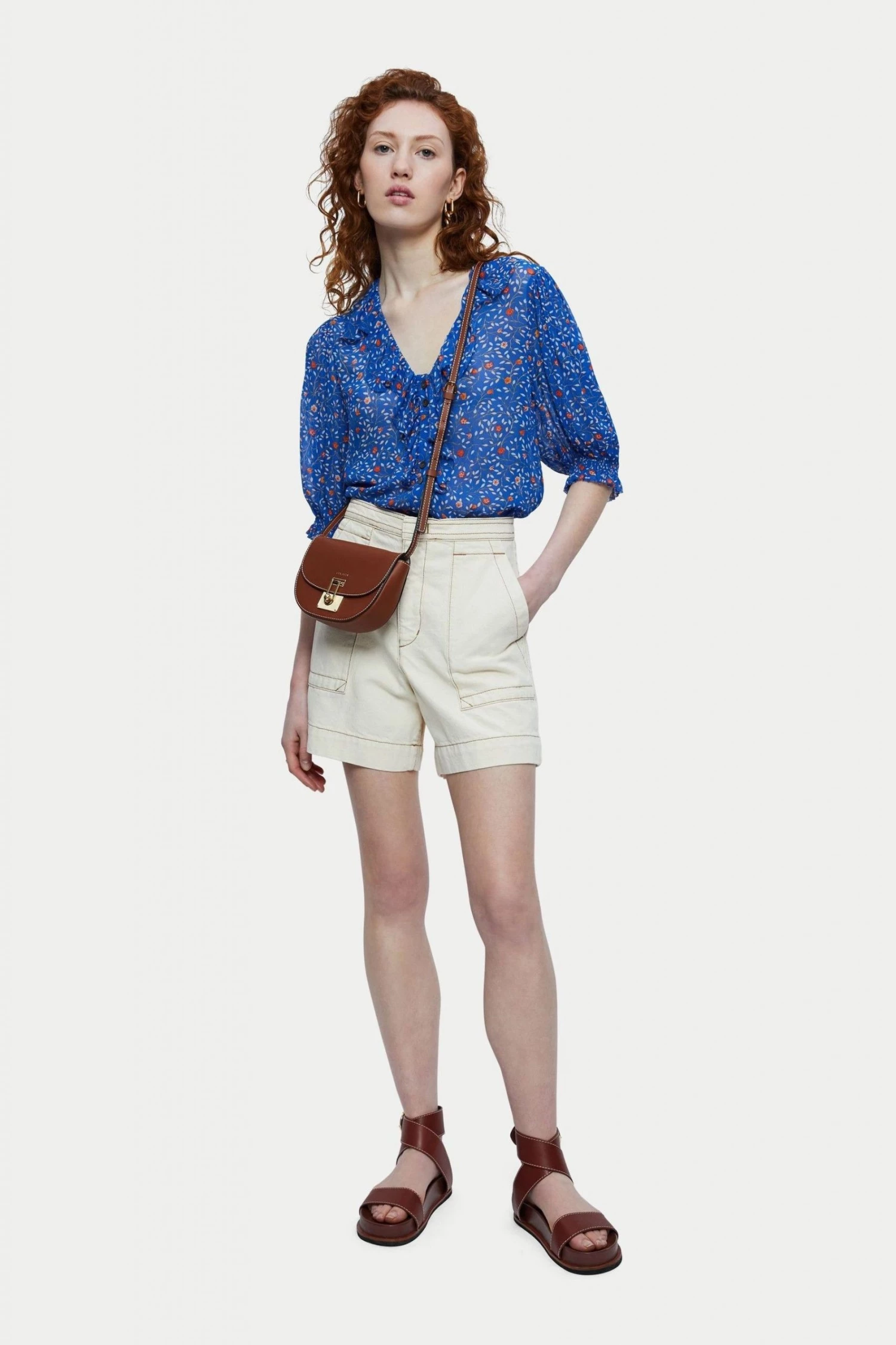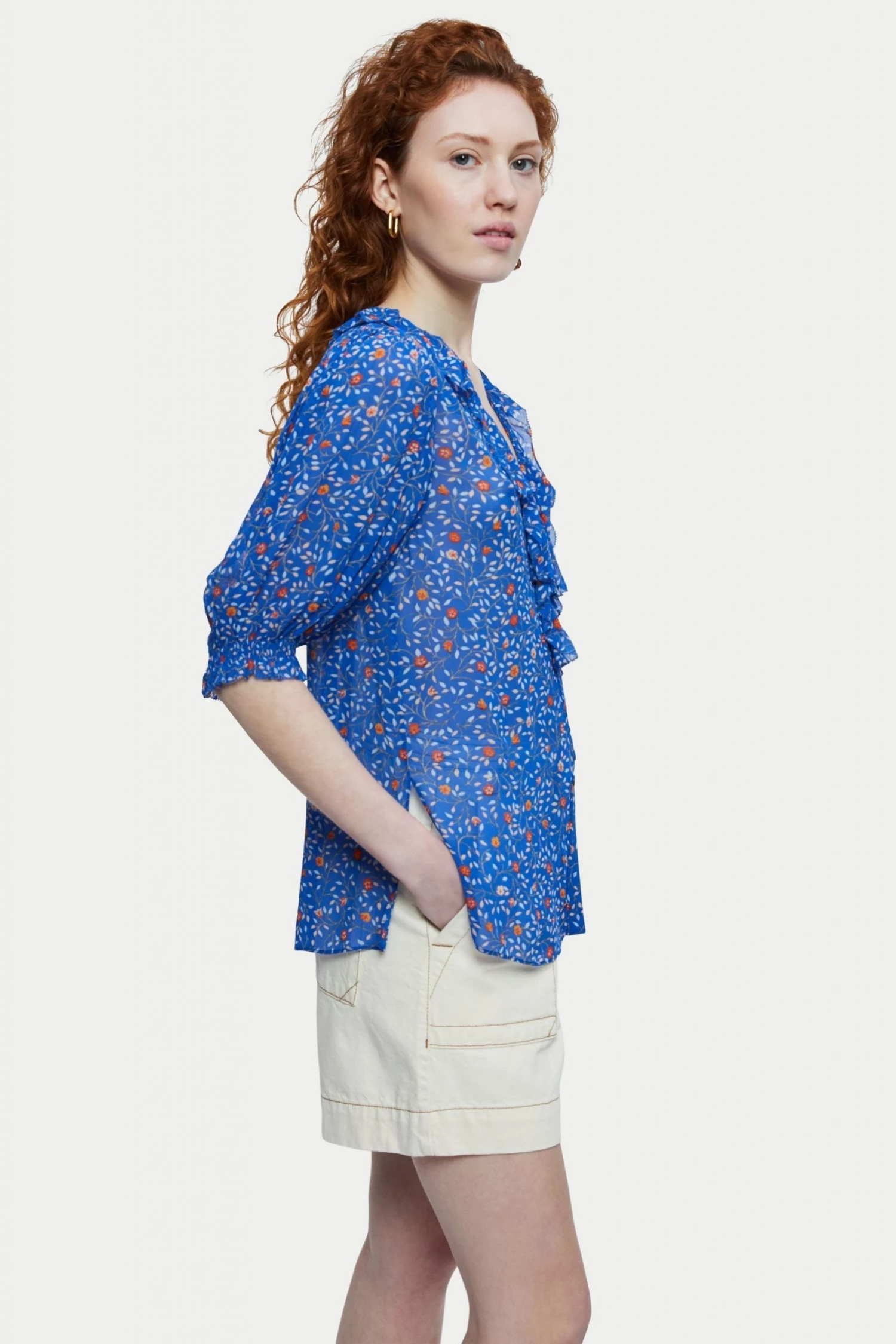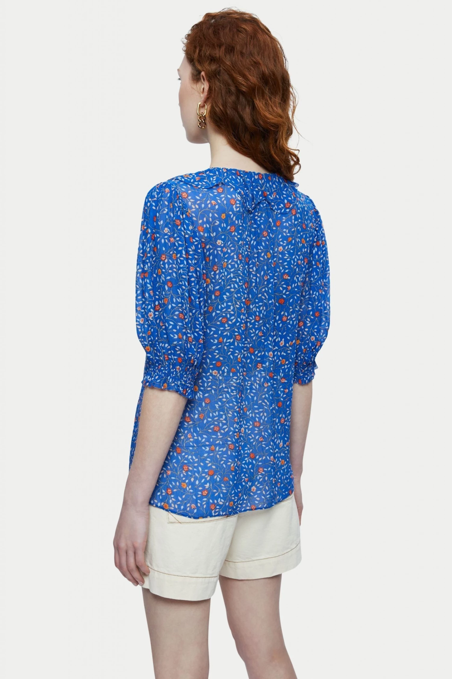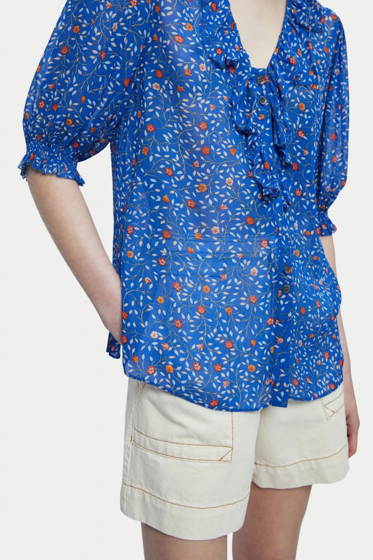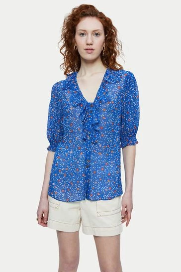 Viscose printed crinkle georgette top in our stem ditsy print. Fluid easy fit and silhouette with a beautiful scalloped ruffle detail V-neck. Short full gathered sleeves and twin mother of pearl centre front button closure. Featuring deep side splits for front tuck option.