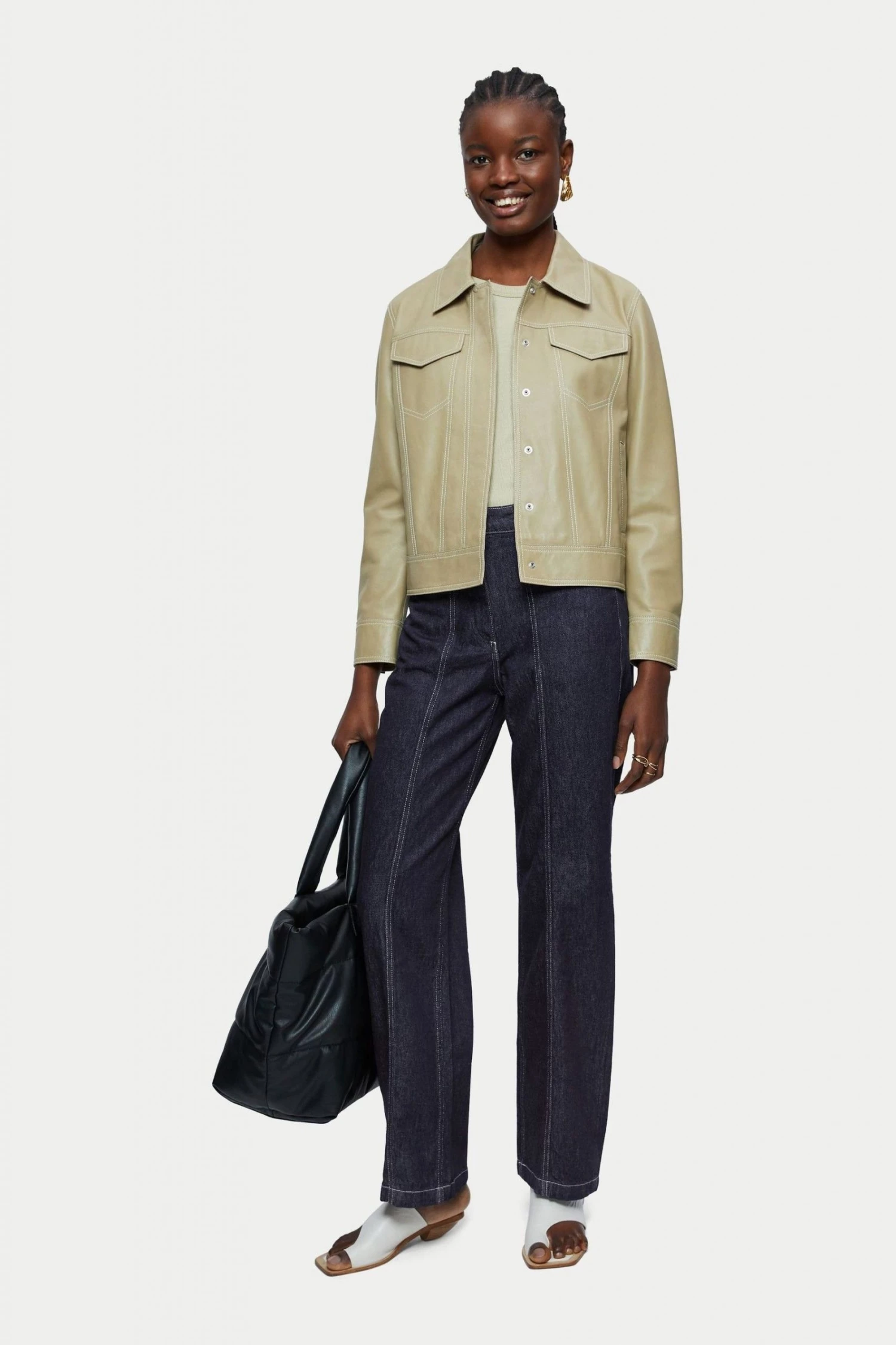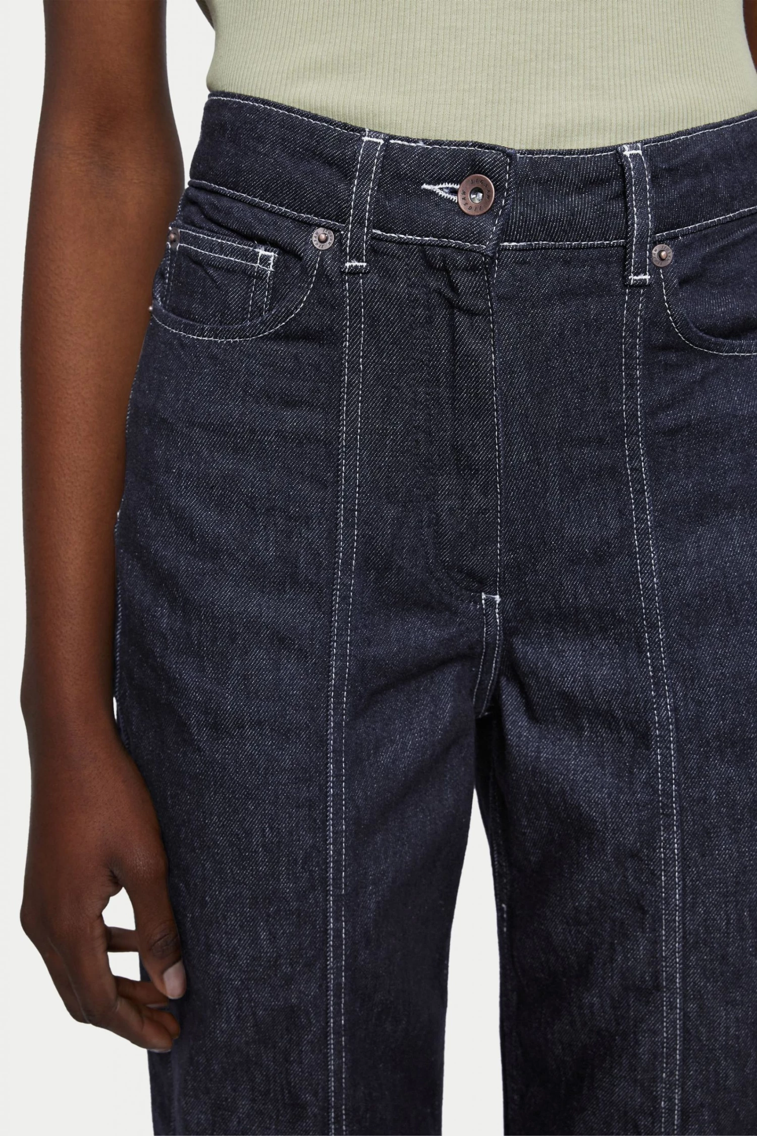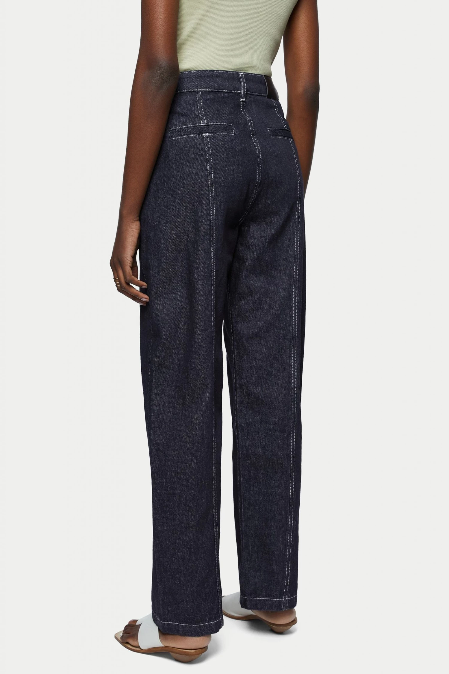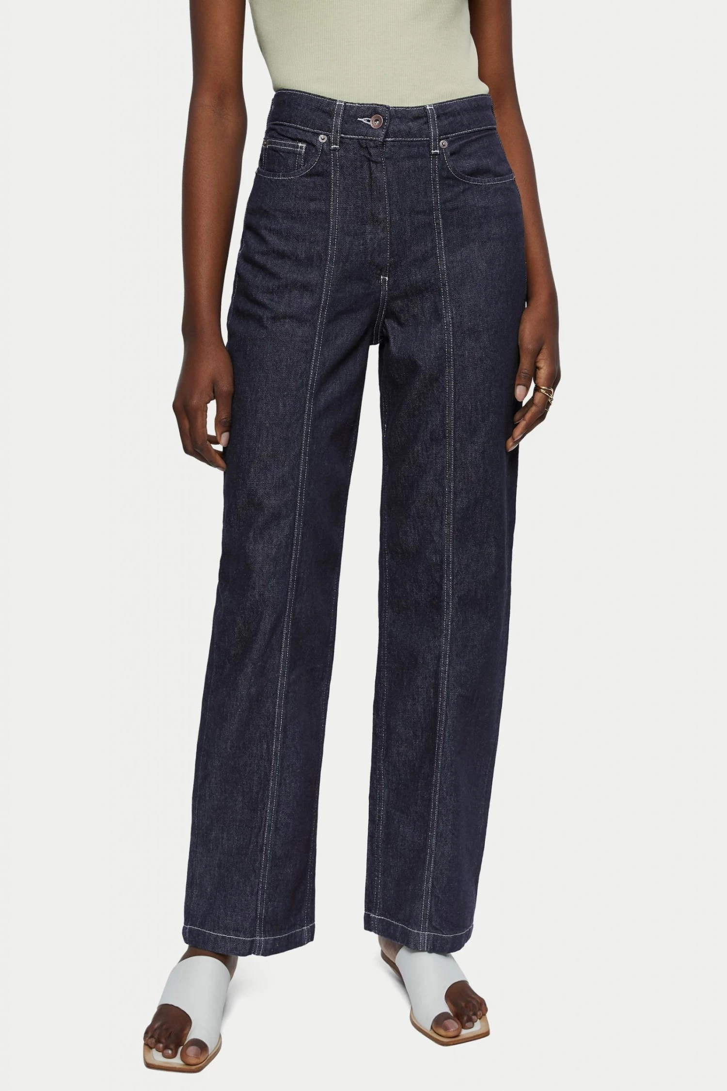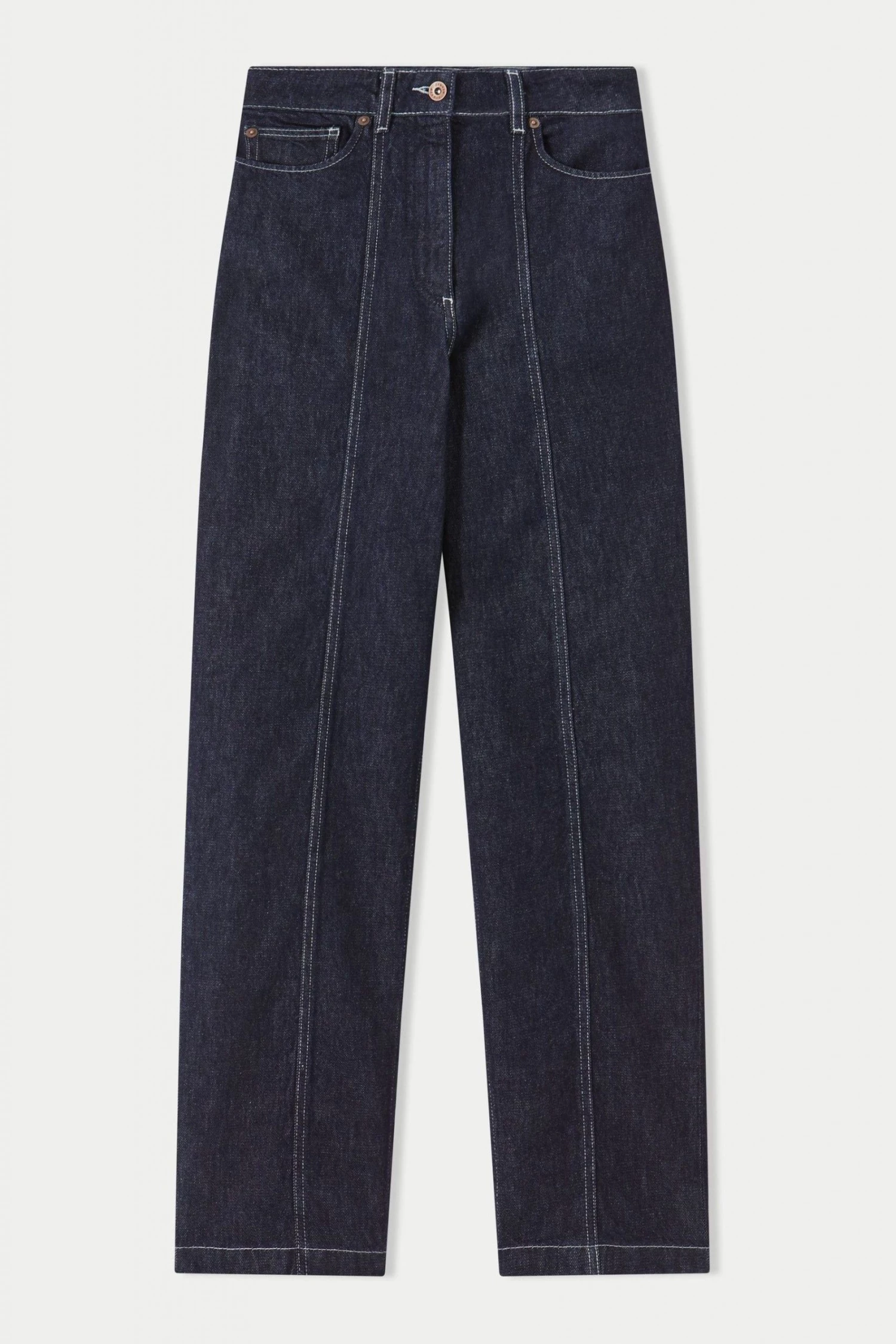 Authentic 5 pocket detail loose leg jean in our ethically sourced rich indigo denim. A tailored regular rise, with straight loose leg and contrast ecru top stitched vertical front and back leg seams. An instant classic.