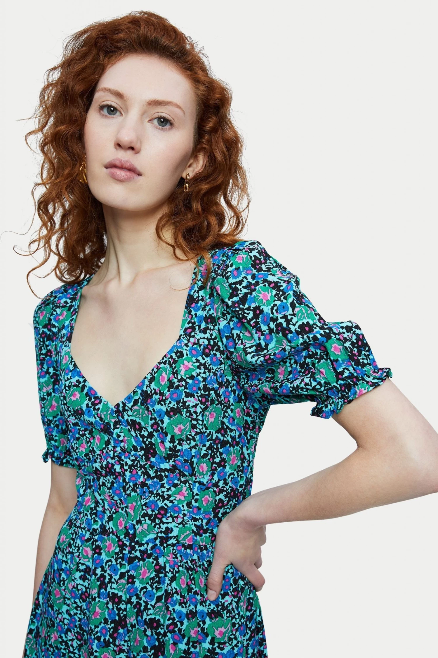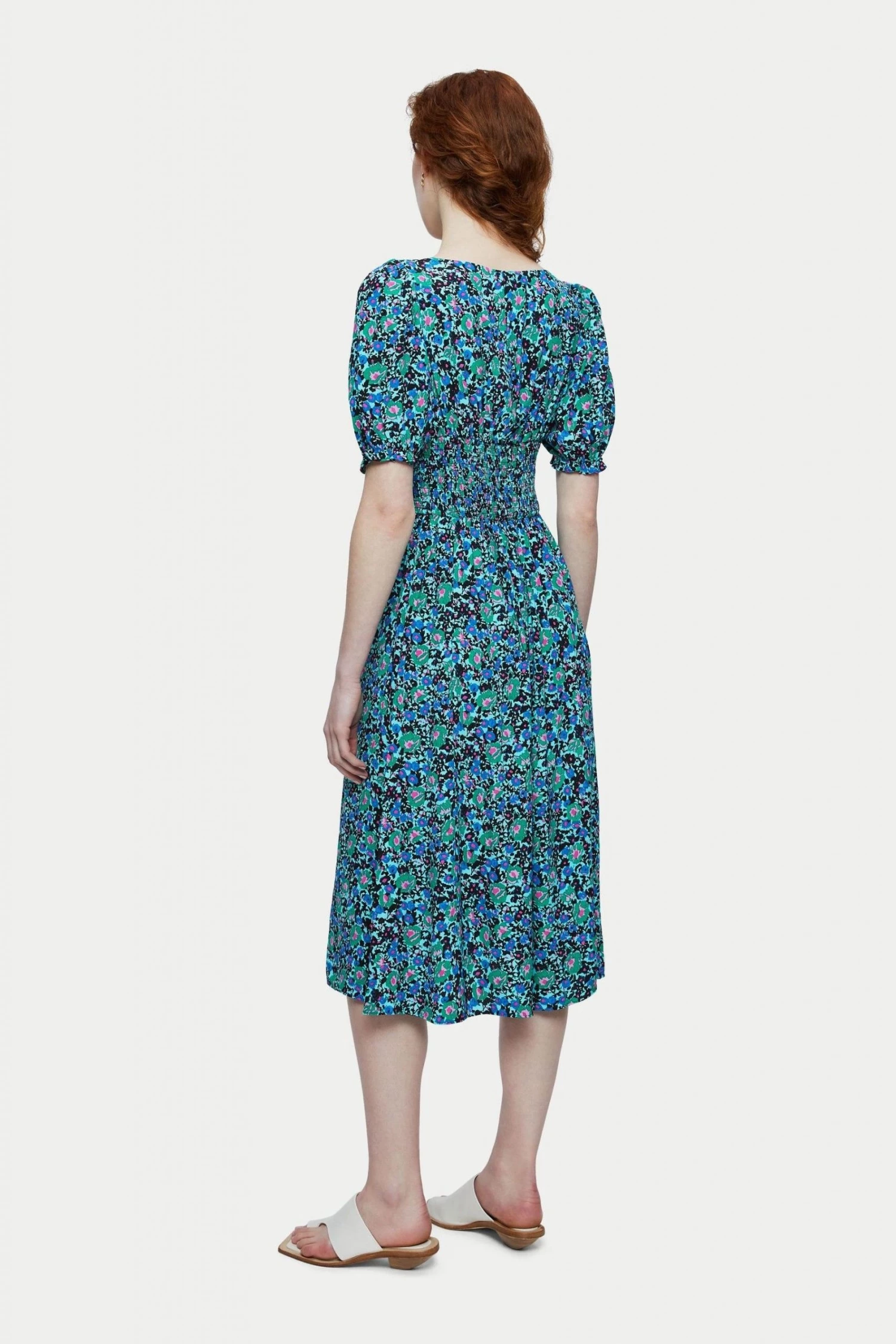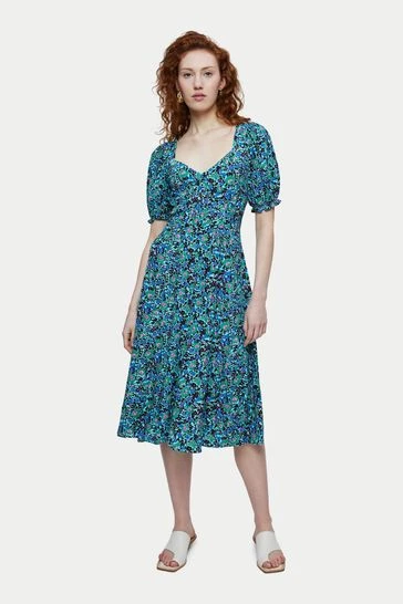 Viscose printed crinkle georgette dress in Jigsaw’s vintage poppy print. Fit and flare silhouette, fitted waist with loose fluid shirt. Featuring short gathered sleeves and open neckline. The perfect summer dress.