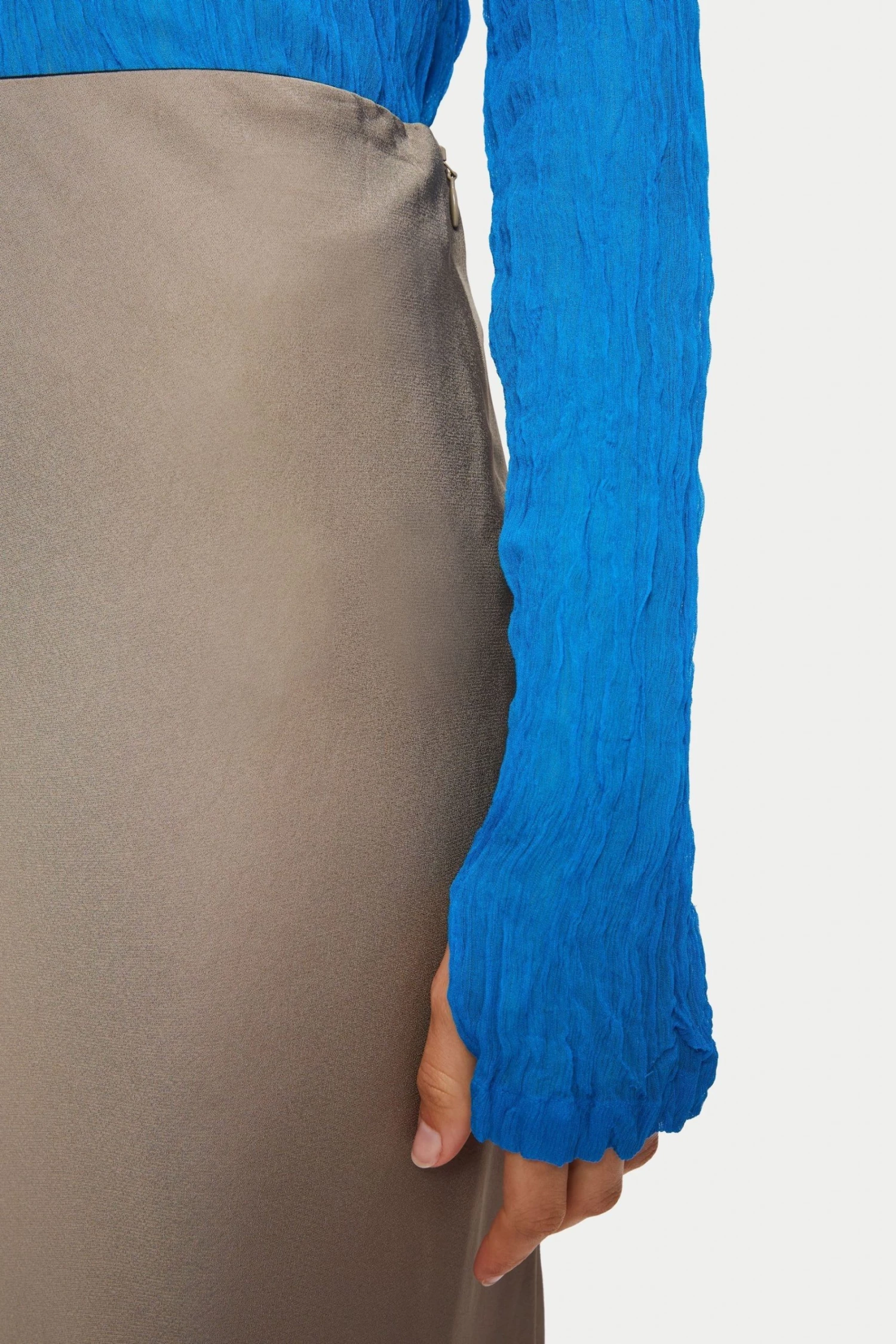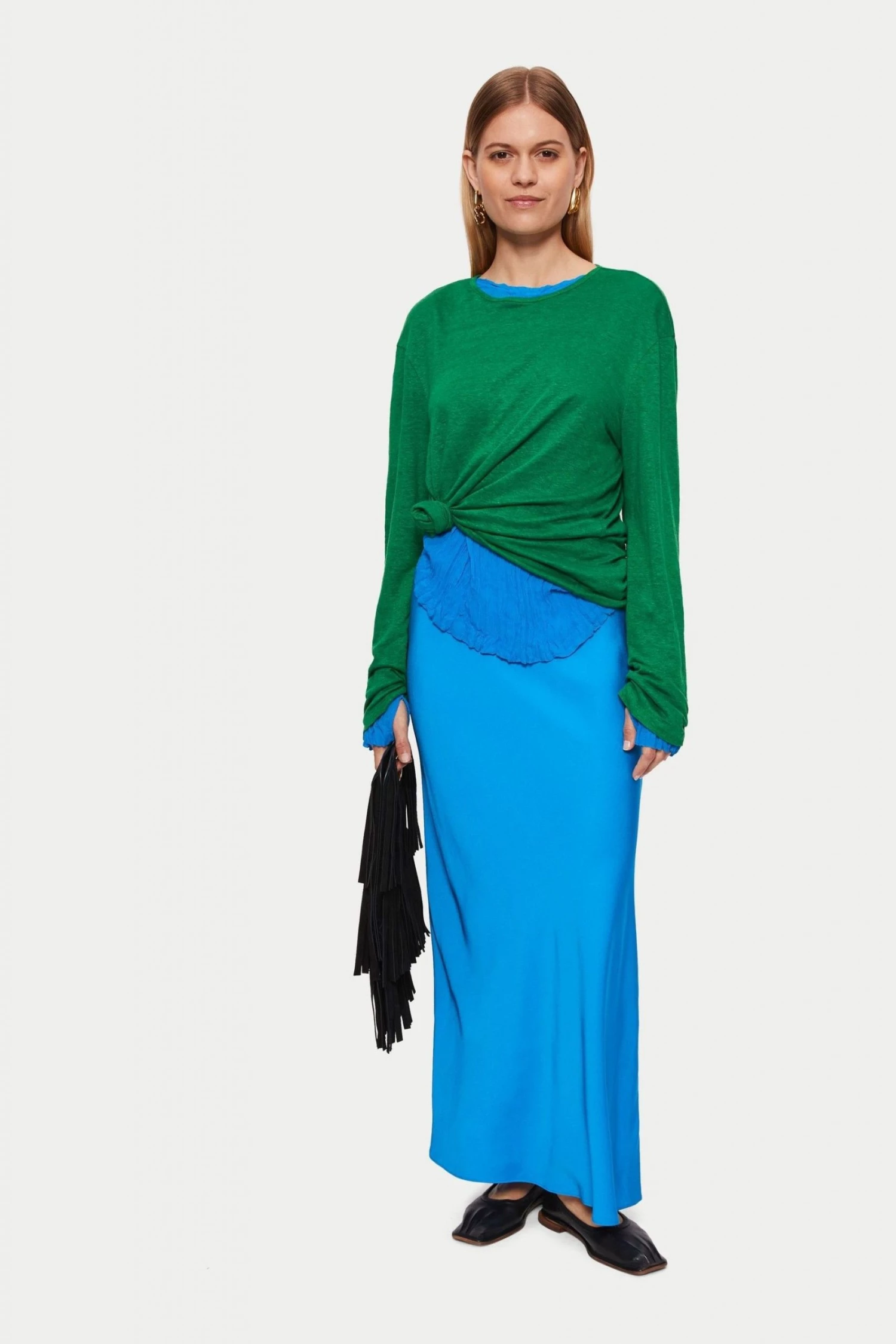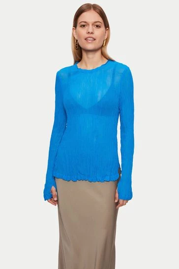 Long sleeve top woven from crinkled viscose georgette. Features a split hem, button at cuff and back of neck. Designed as a colourful layering piece, style under tea dresses or over vest tops. Includes a storage bag which makes it perfect for packing whilst maintaining the crinkle finish.
