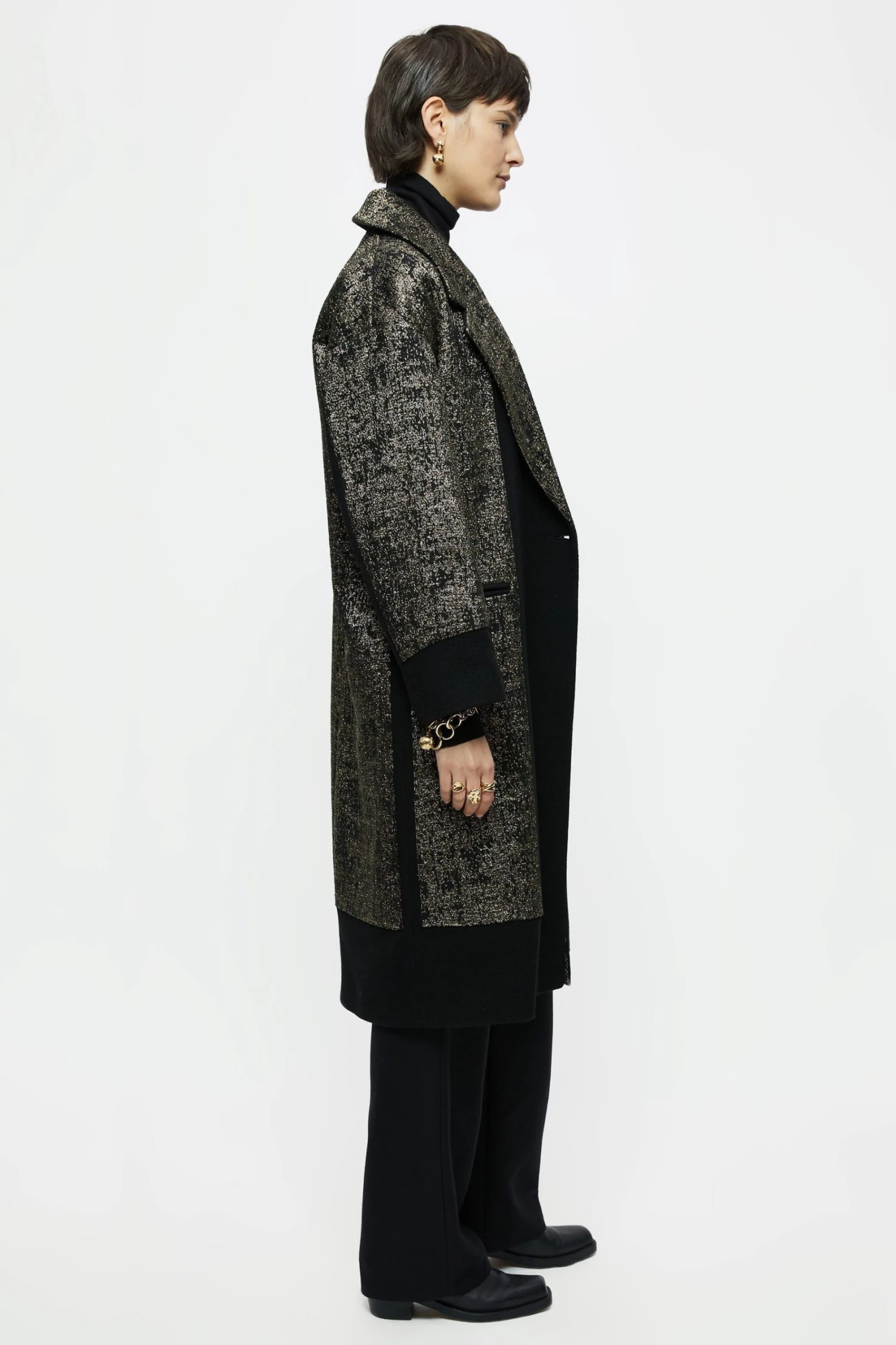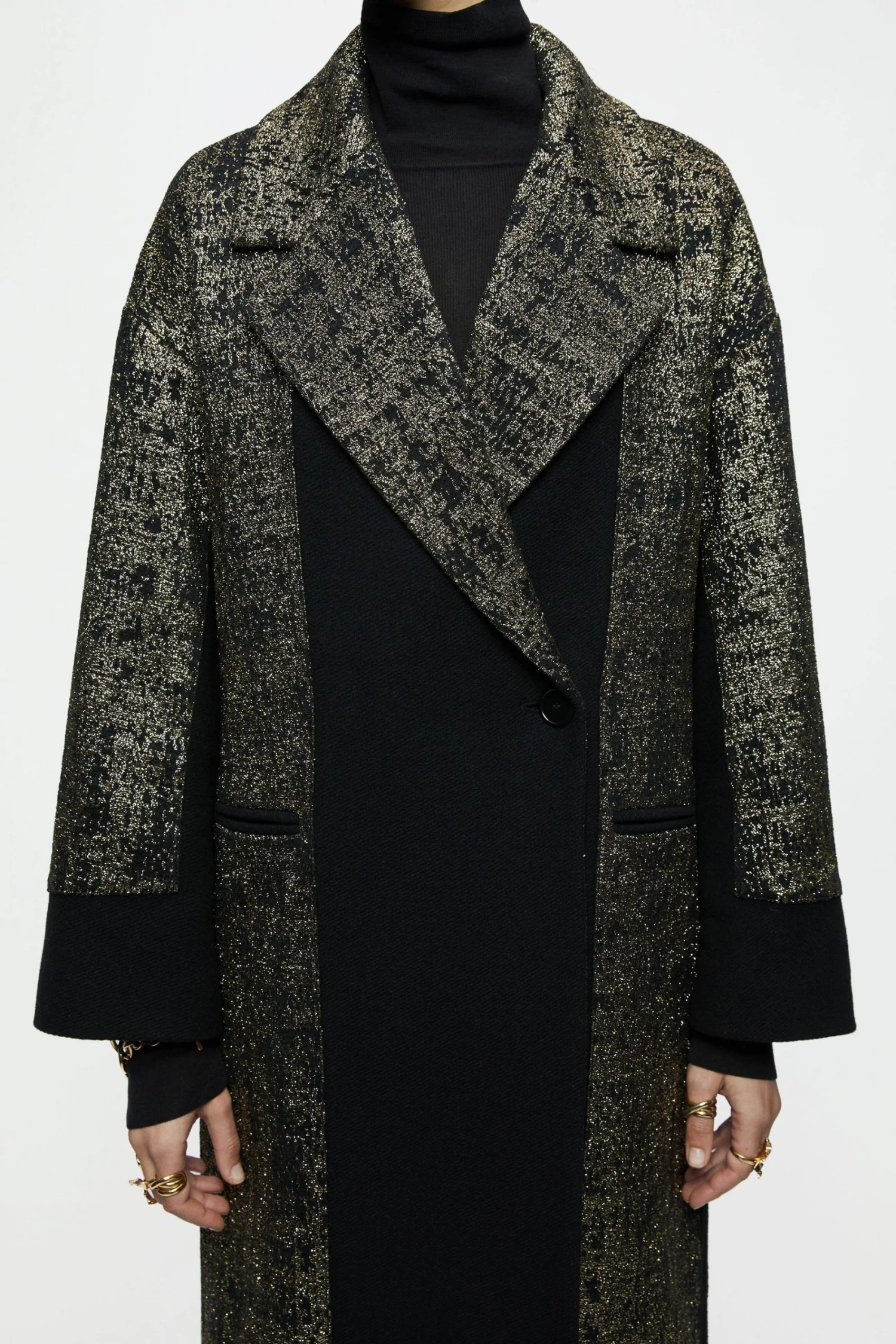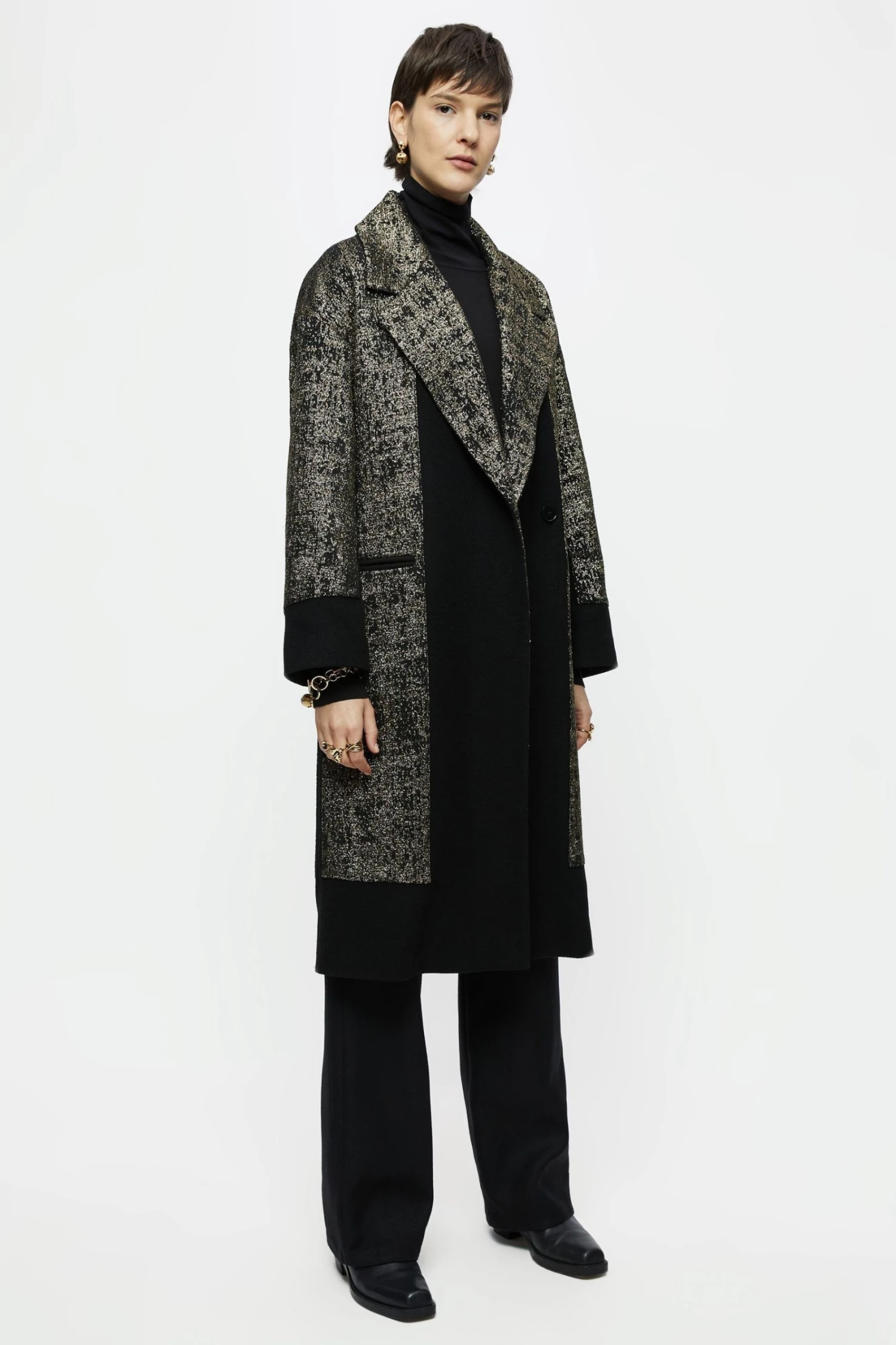 Stylish evening coat cut from soft wool twill and contrast gold brocade panelling. Designed with a wide lapel, single button closure and jet pockets. The perfect autumn winter occasion coat.
