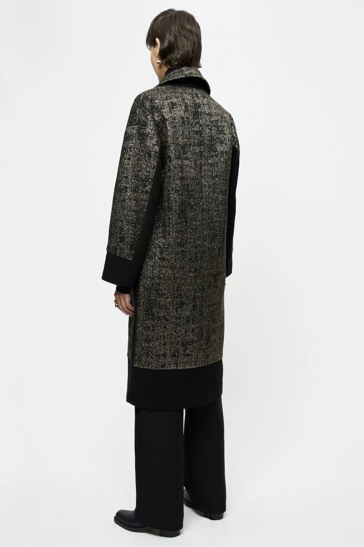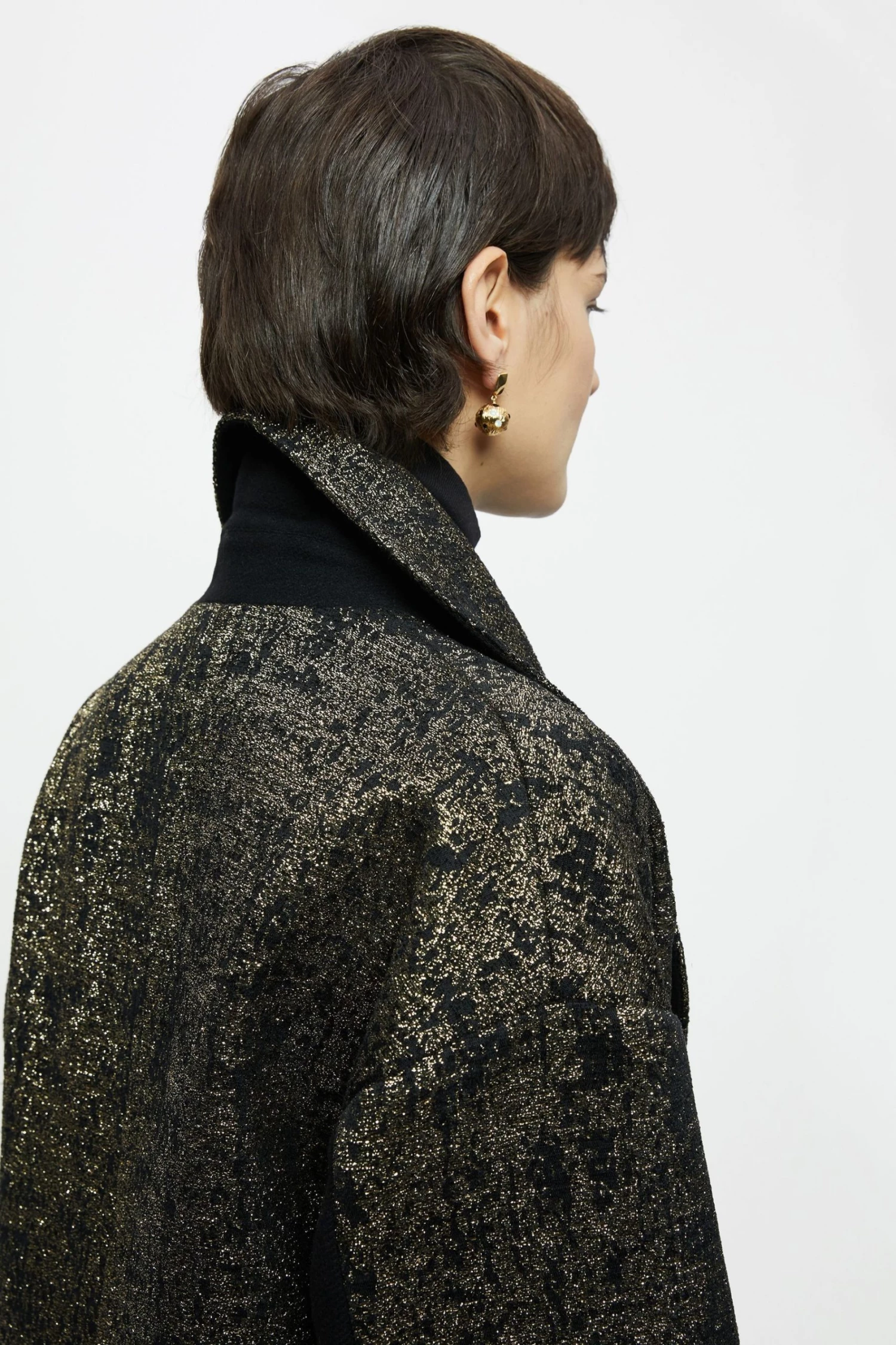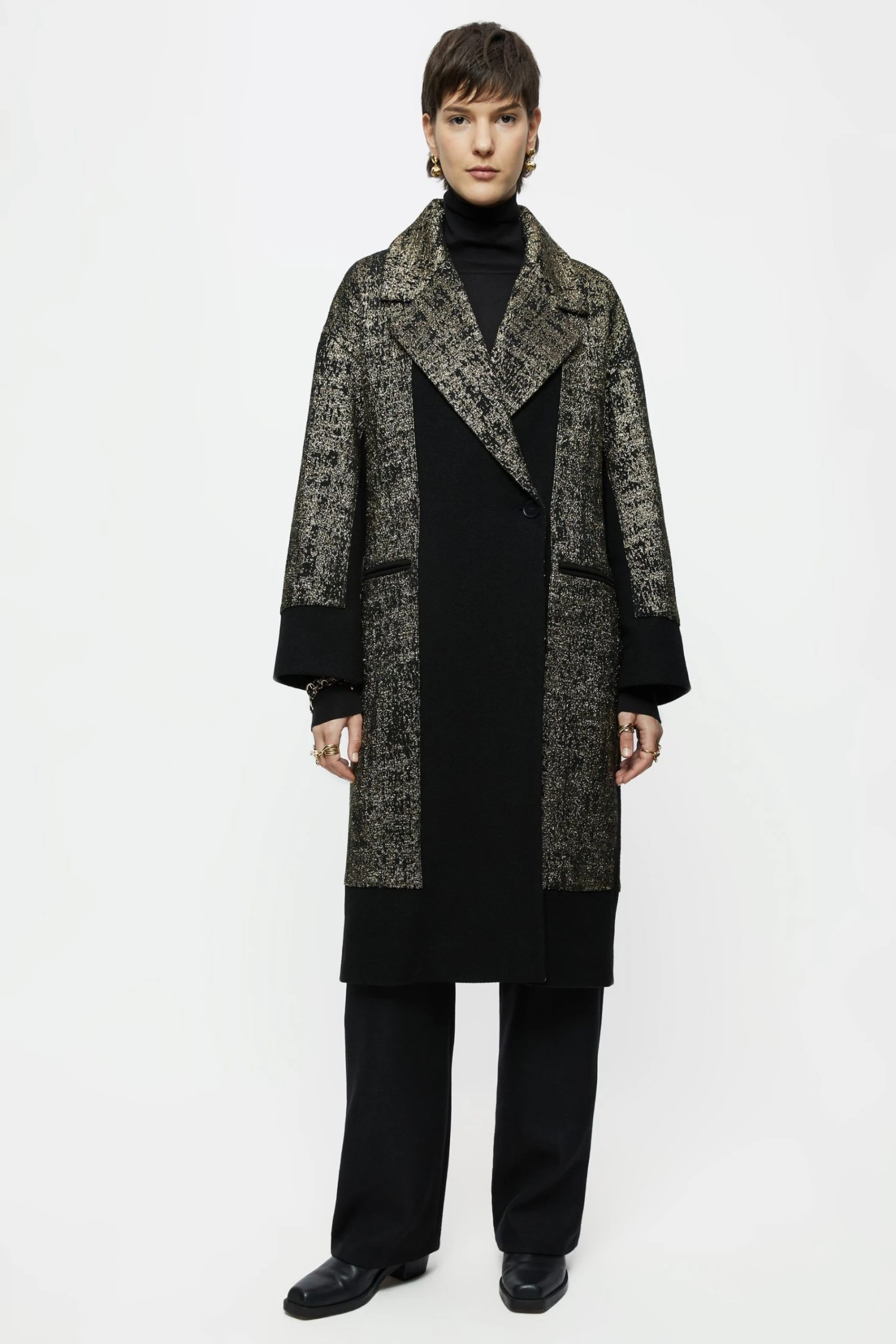 Stylish evening coat cut from soft wool twill and contrast gold brocade panelling. Designed with a wide lapel, single button closure and jet pockets. The perfect autumn winter occasion coat.