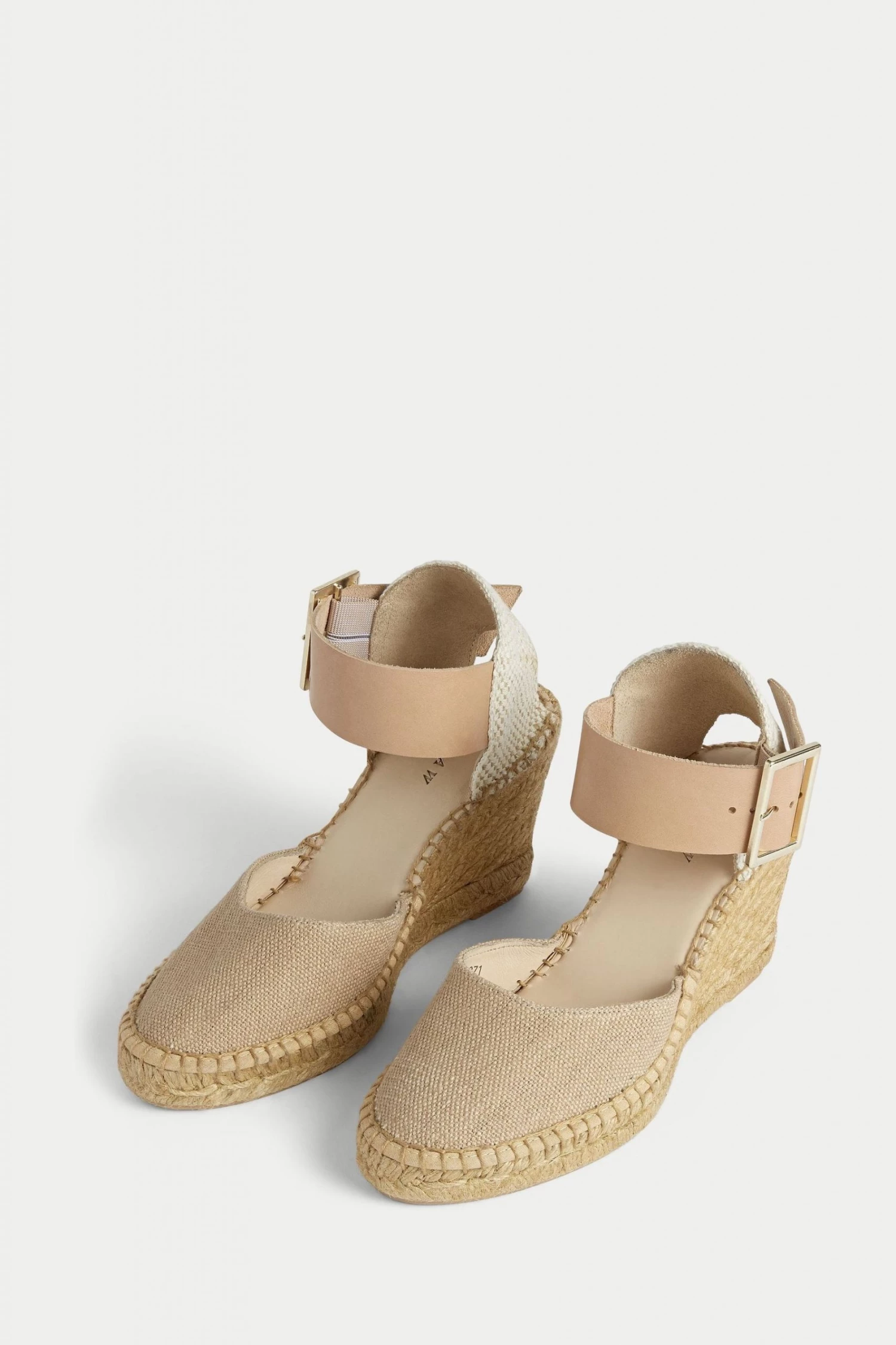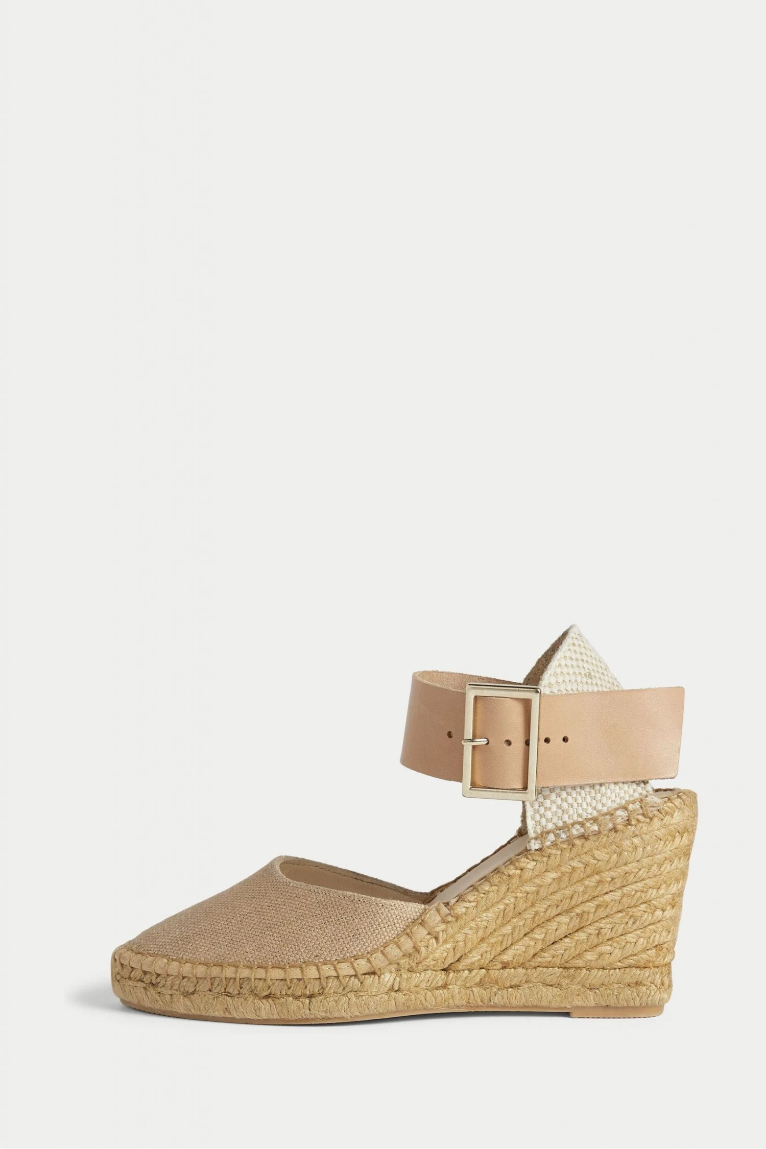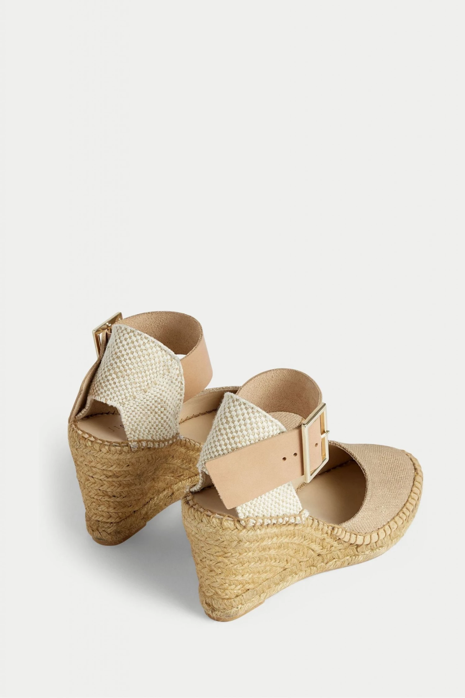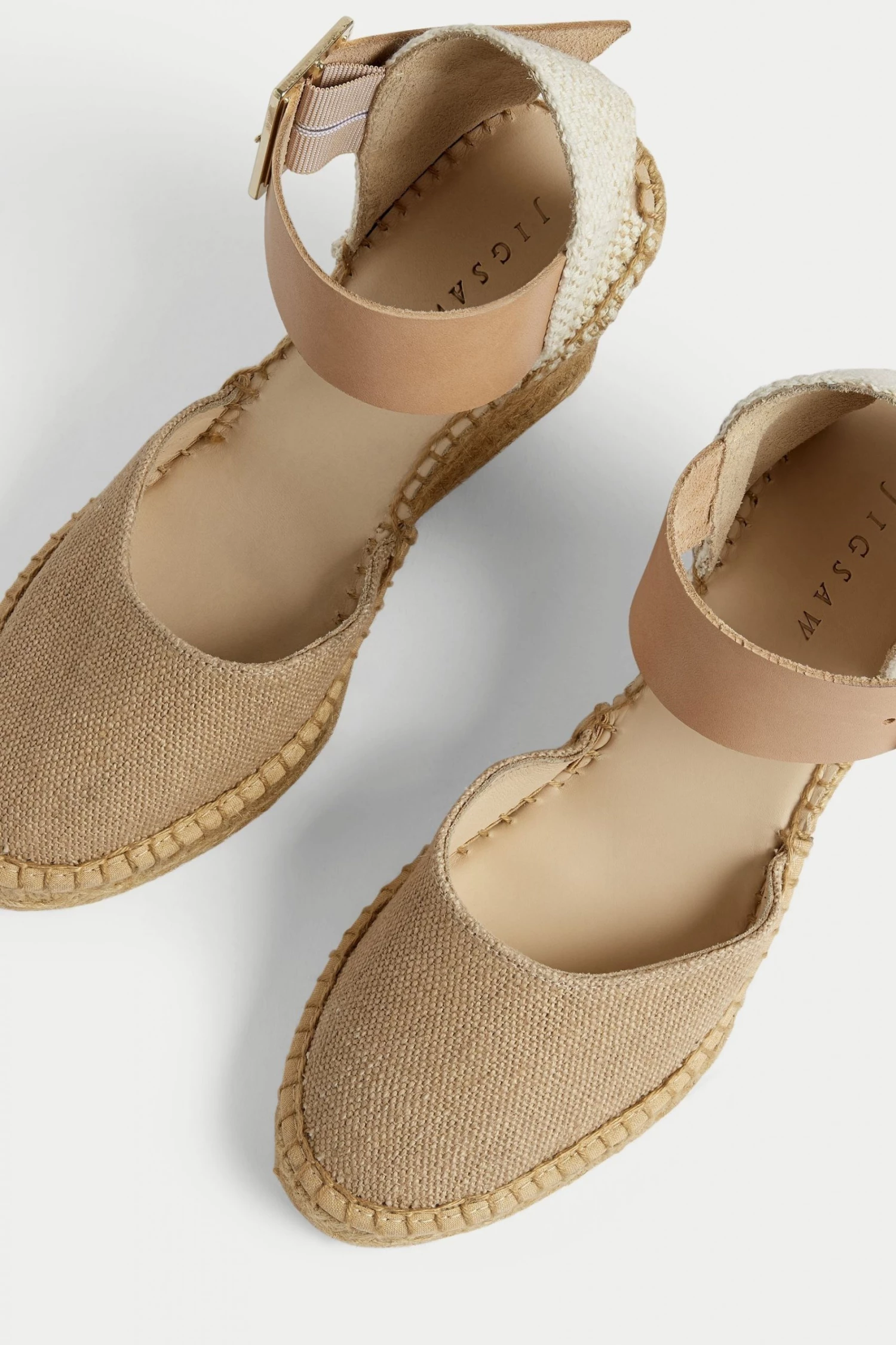 A classic espadrille sandal with a Jigsaw twist. Made in Spain, this beautiful heel uses the finest canvas and leather. Canvas toe lined in butter-soft tonal leather and wide heel strap lined in suede for added comfort and ease of wear. Leather buckled ankle strap.