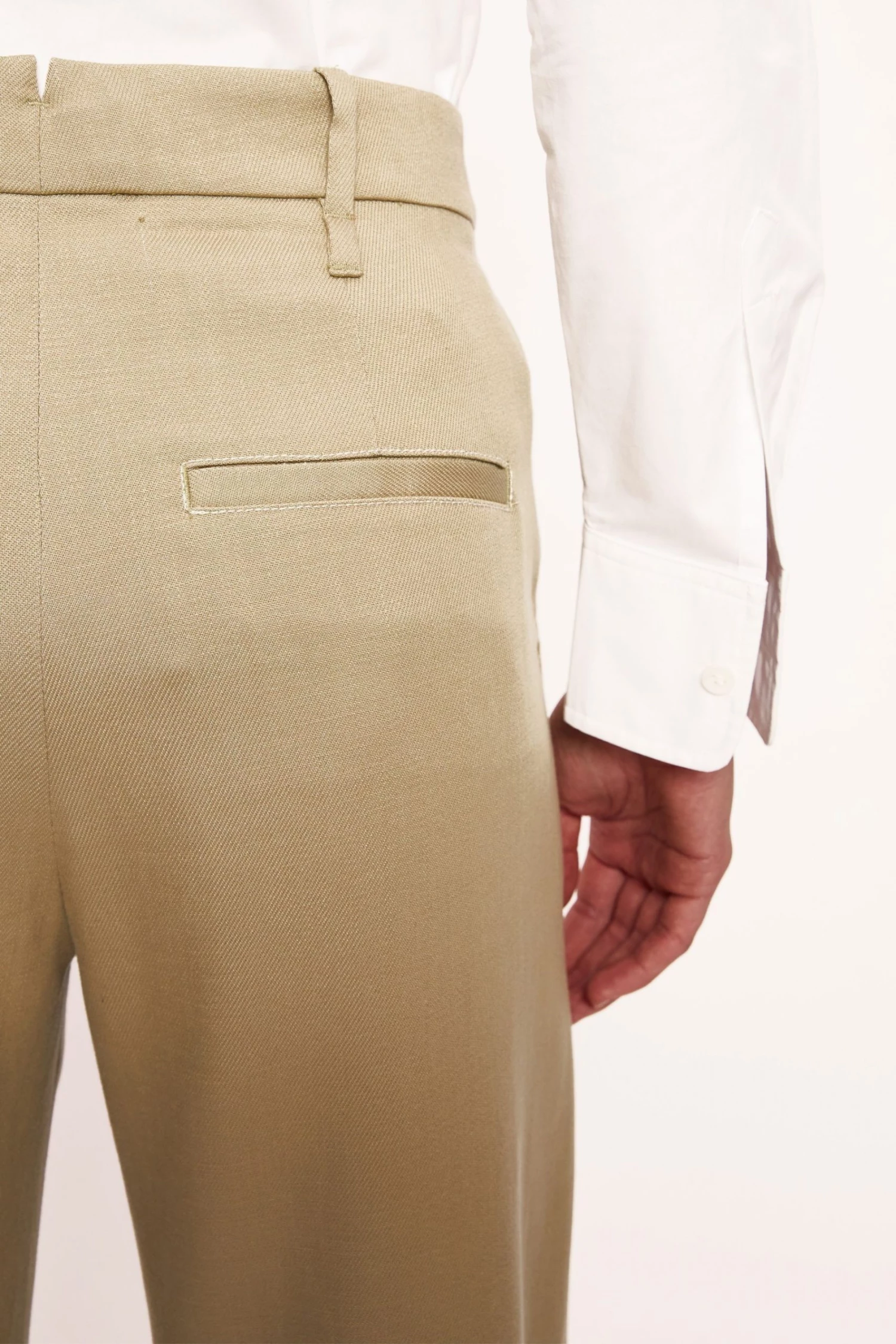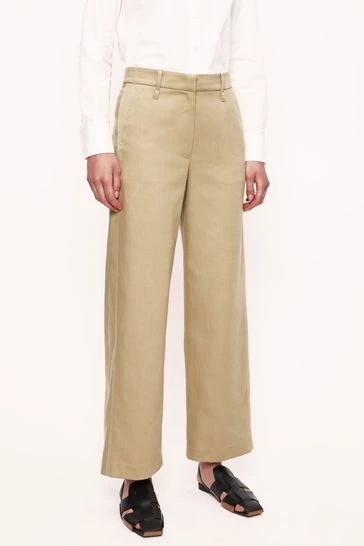 Cropped straight leg trouser in lyocell cotton with a twill weave. Features contrast twin stitching, a tailored waistband, belt loops, fly front with hook and bar fastening. Practical front slant pockets and a jetted pocket on the right back side.