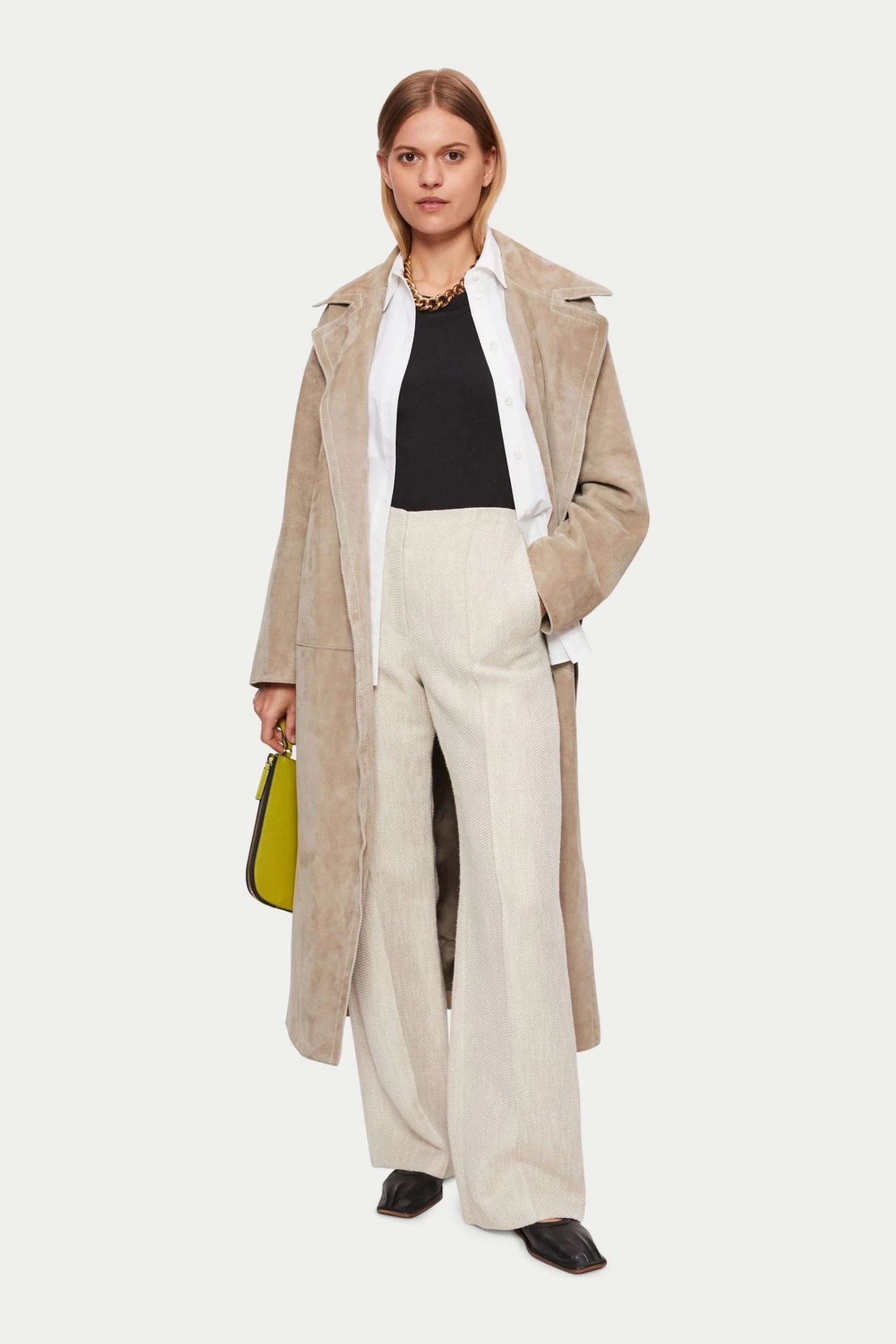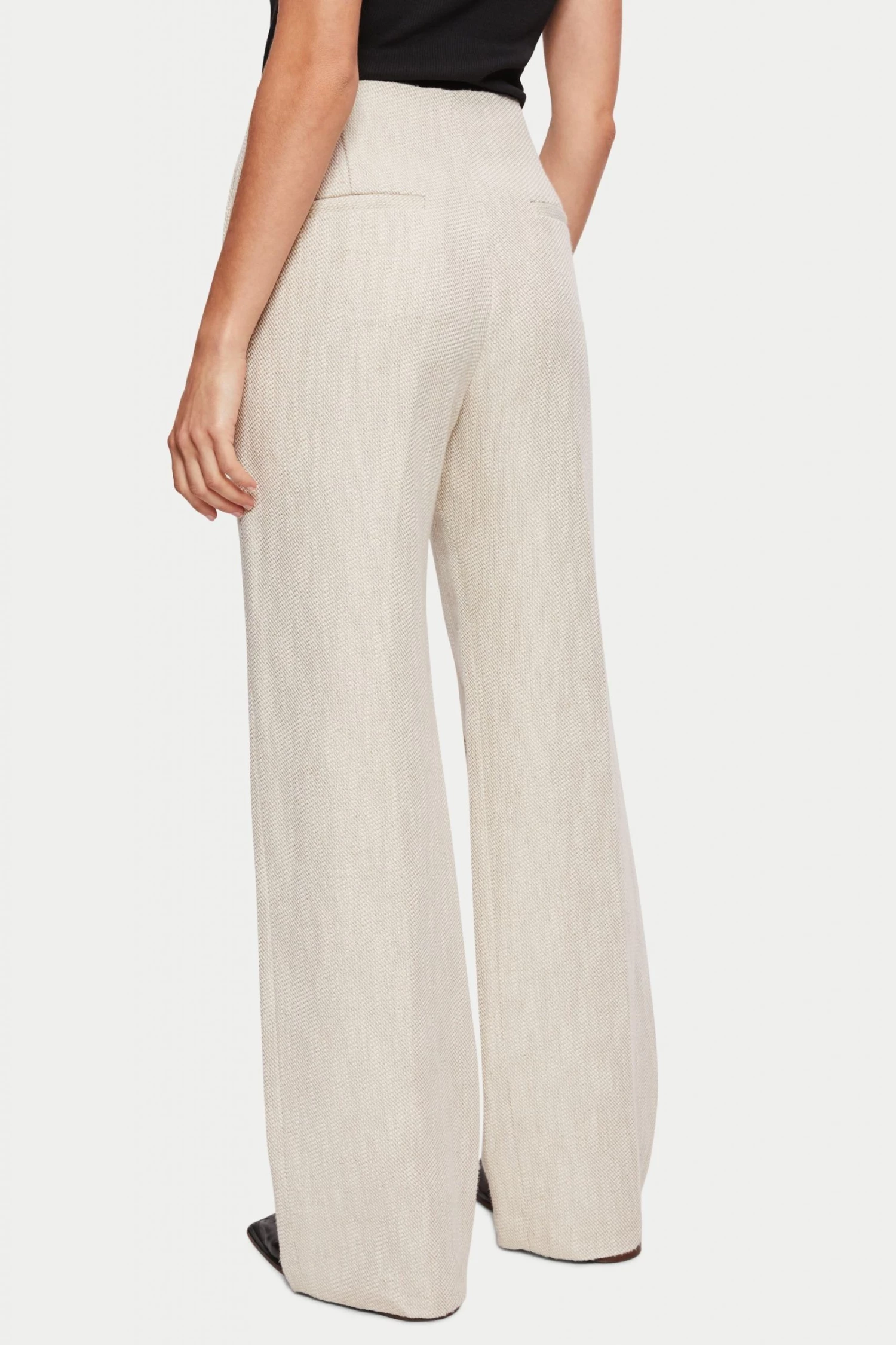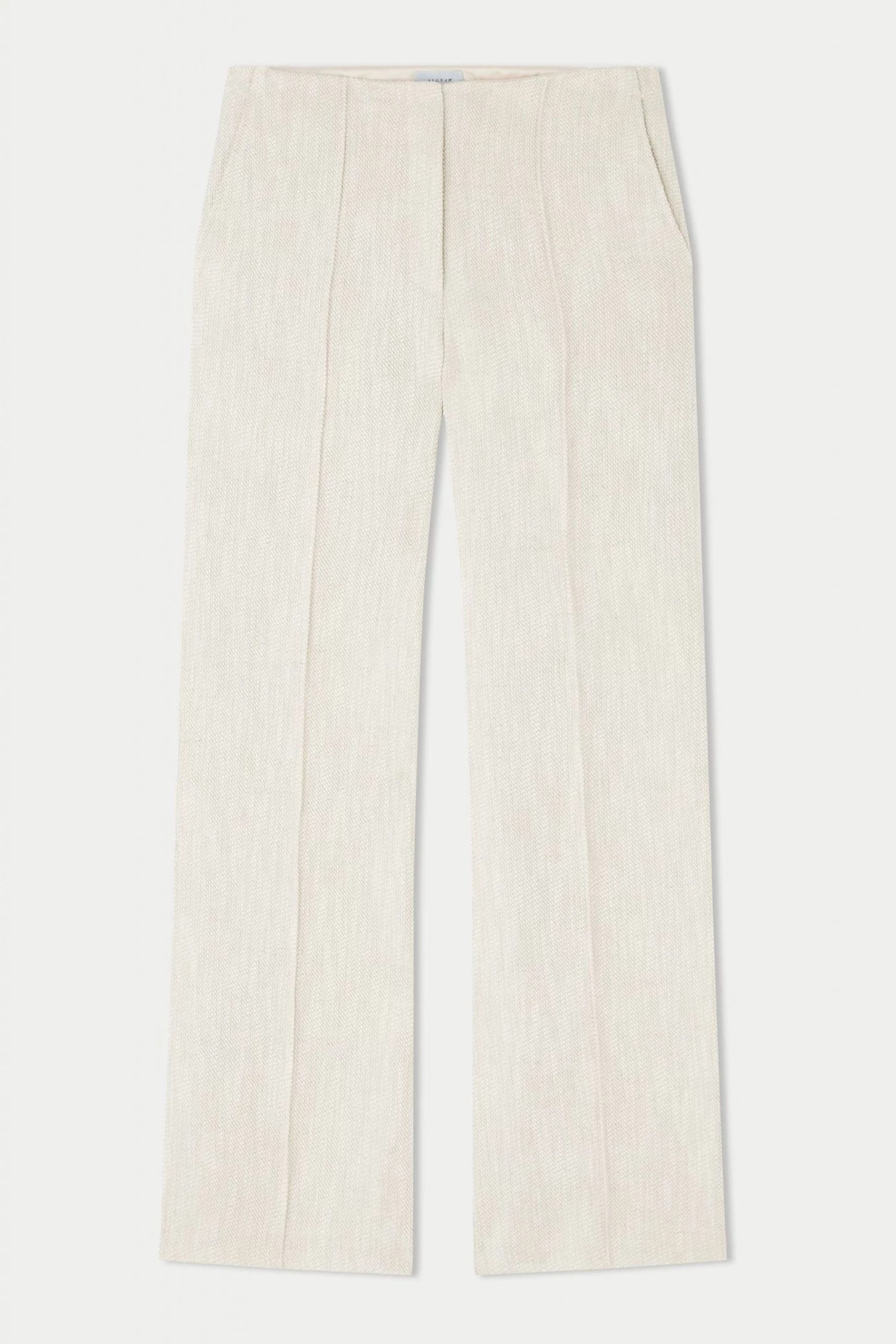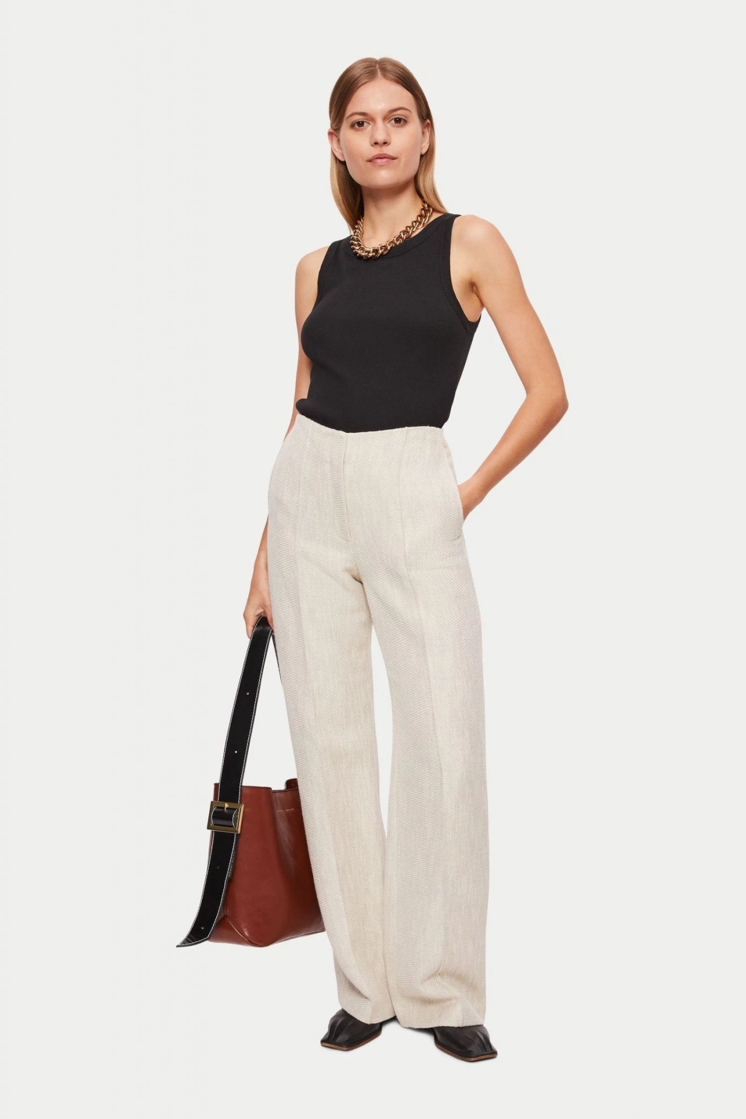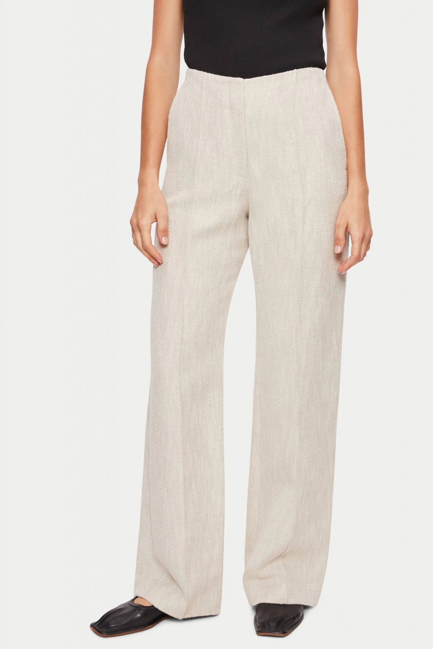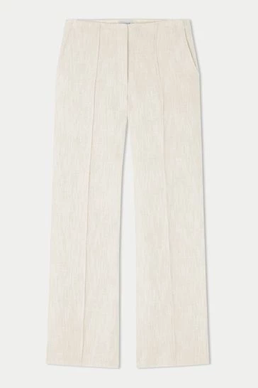 Smart casual trouser cut from cotton linen blend with a textured weave. Designed a straight leg and high waist. Features a concealed zip fly, front angled pockets and rear welt pockets. Style with everything from neutral knitwear or a white T-shirt.