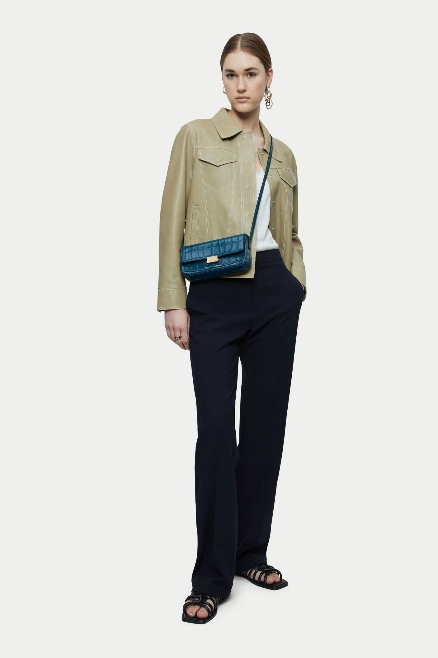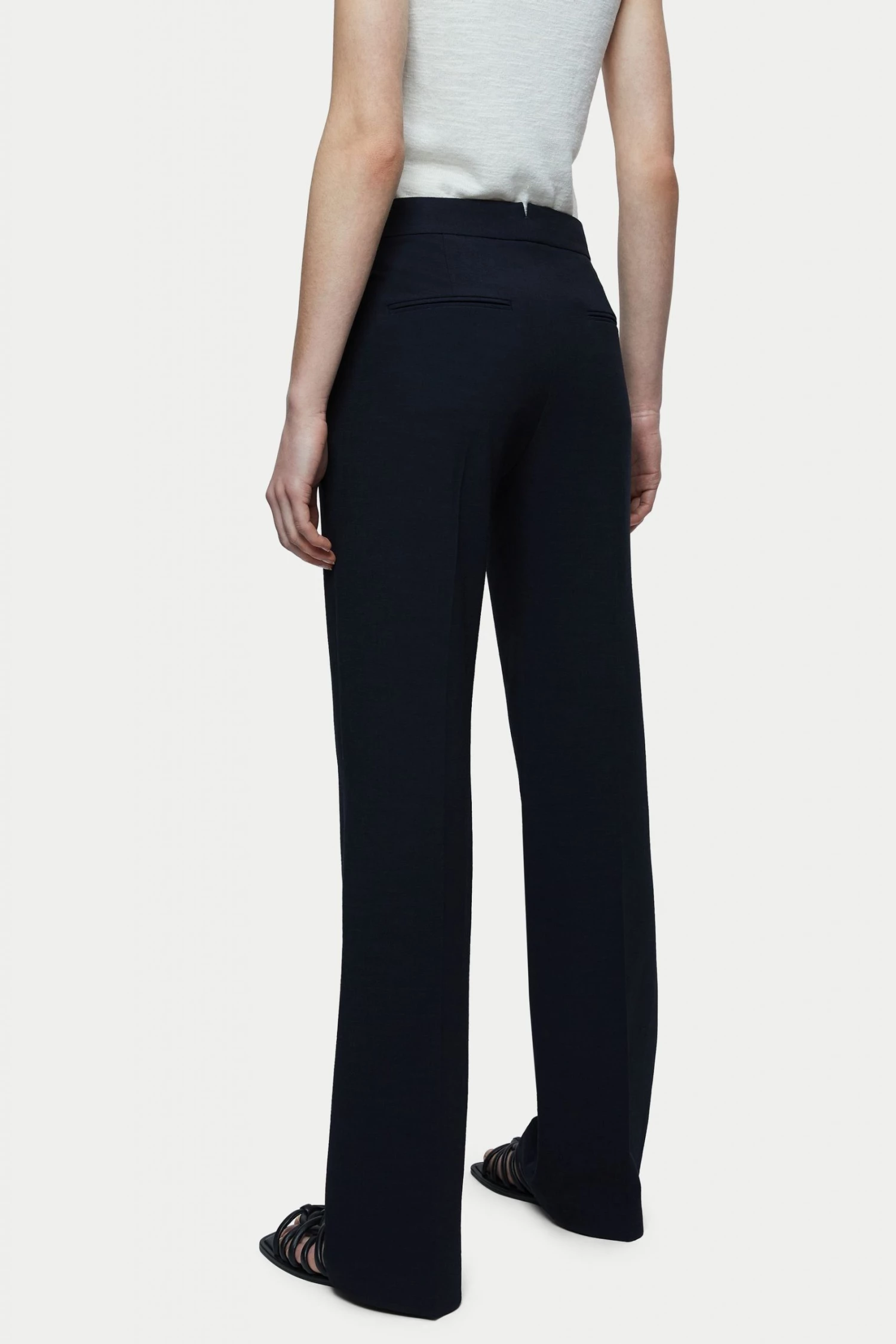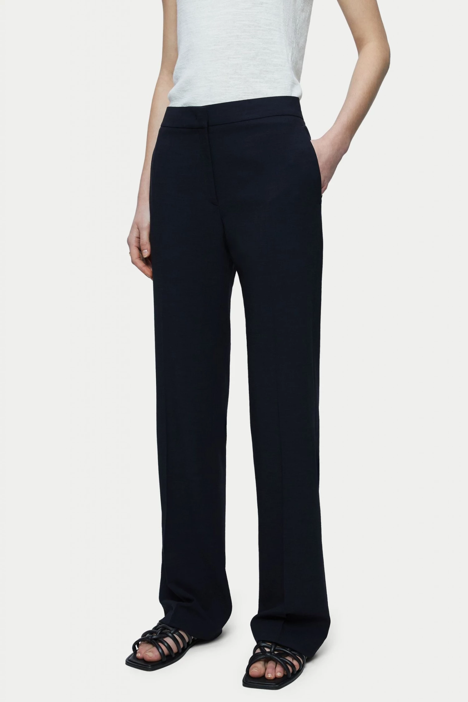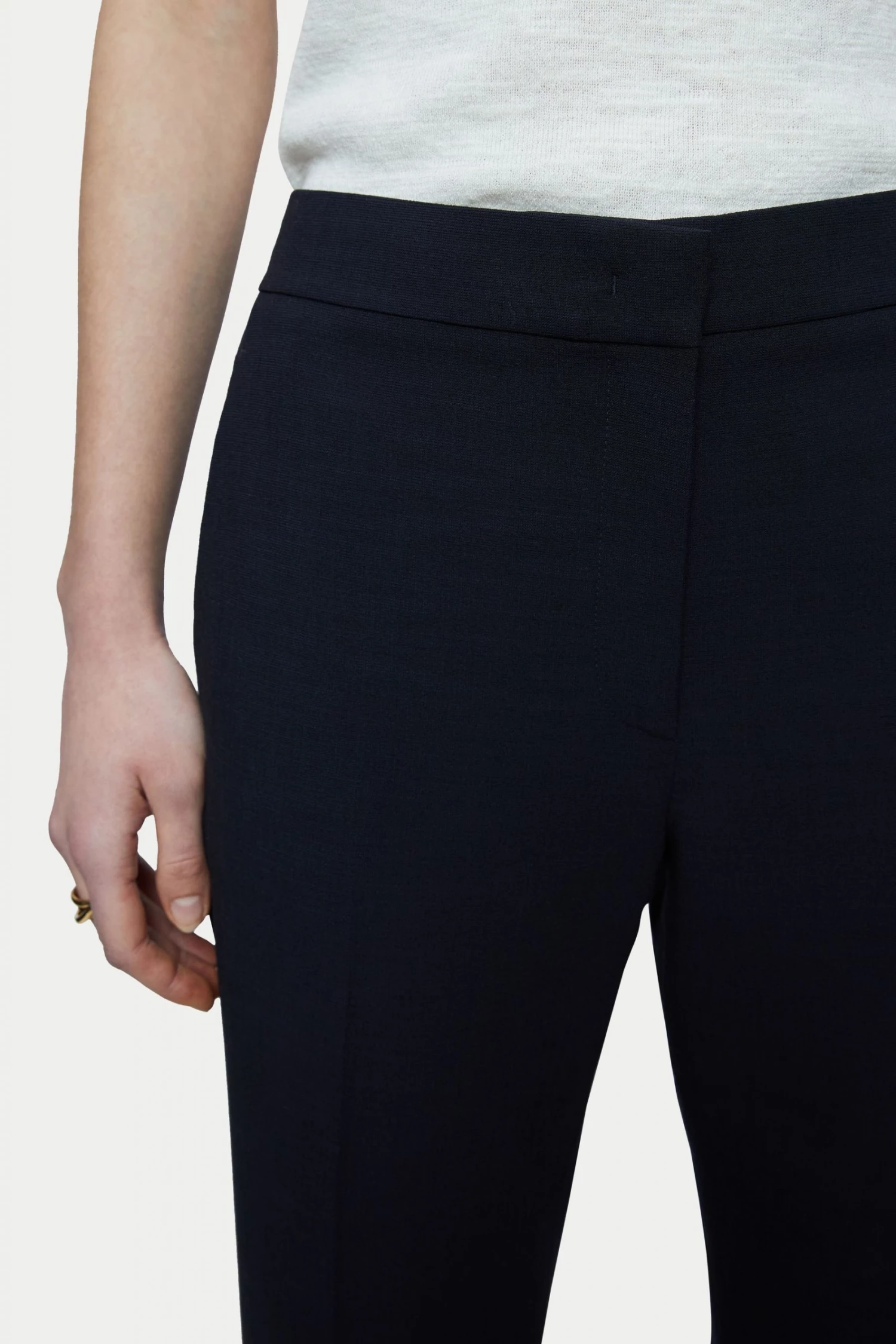 Tailored trouser made from a sustainable Viscose-blend with a crosshatch weave by Portuguese heritage mill RIOPELE. The Mason trouser is designed with a tailored slim silhouette and kick hem. Featuring, zip fastening with hook and bar detail and functional side pockets. Style with knitwear or as a suit with a blazer.