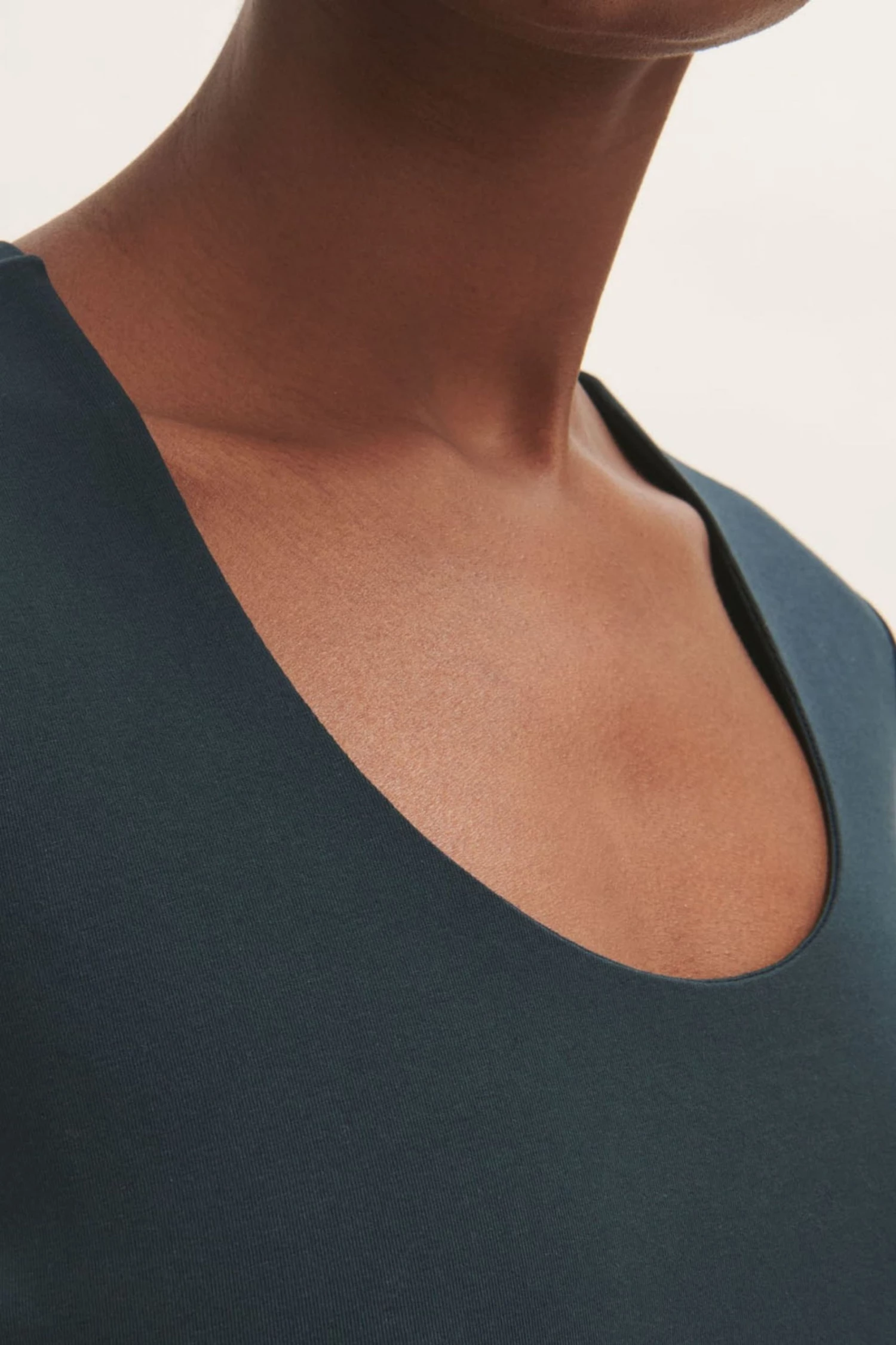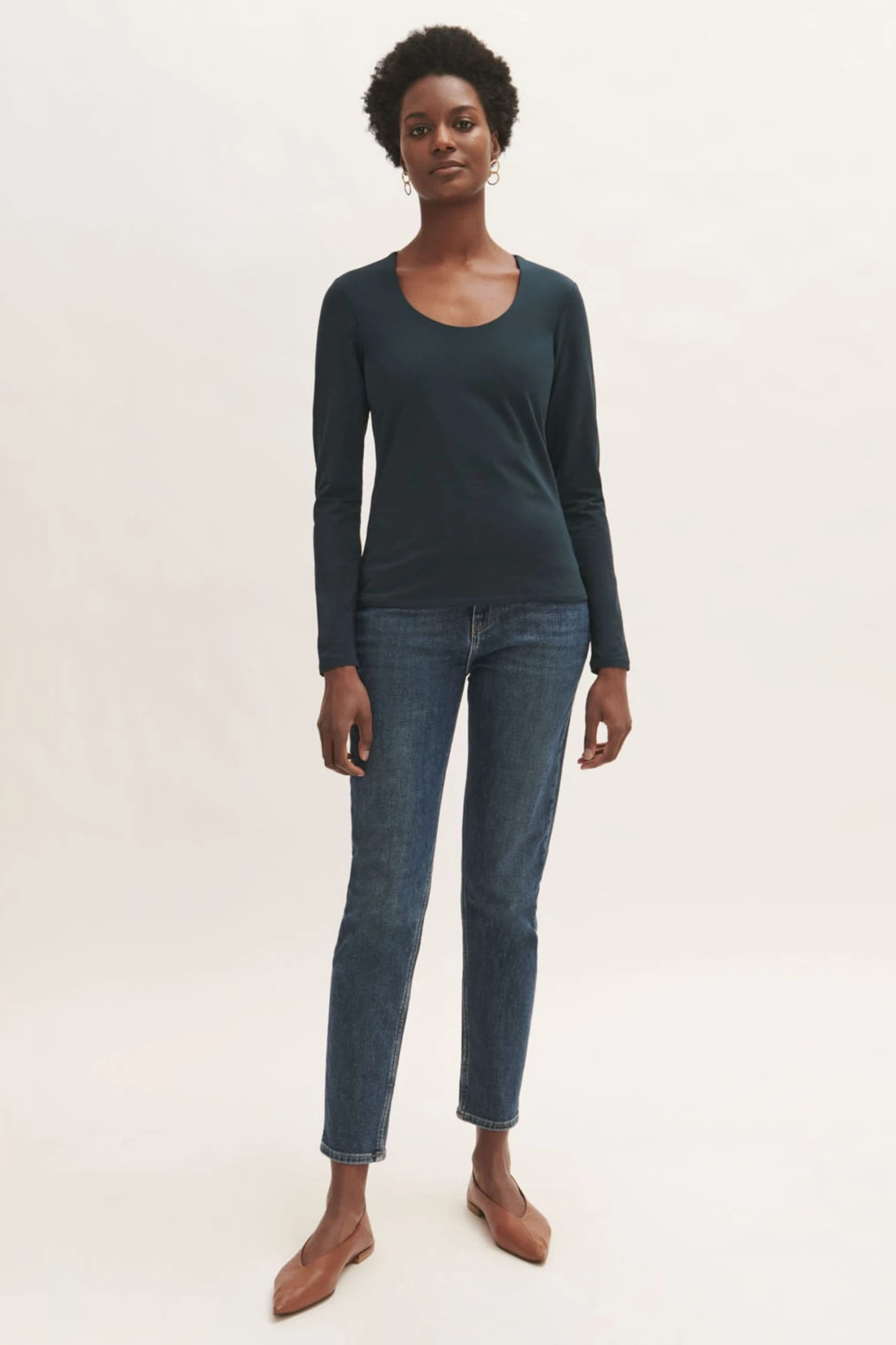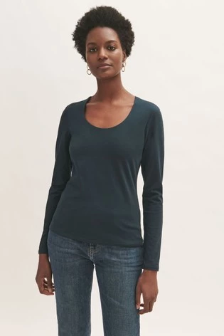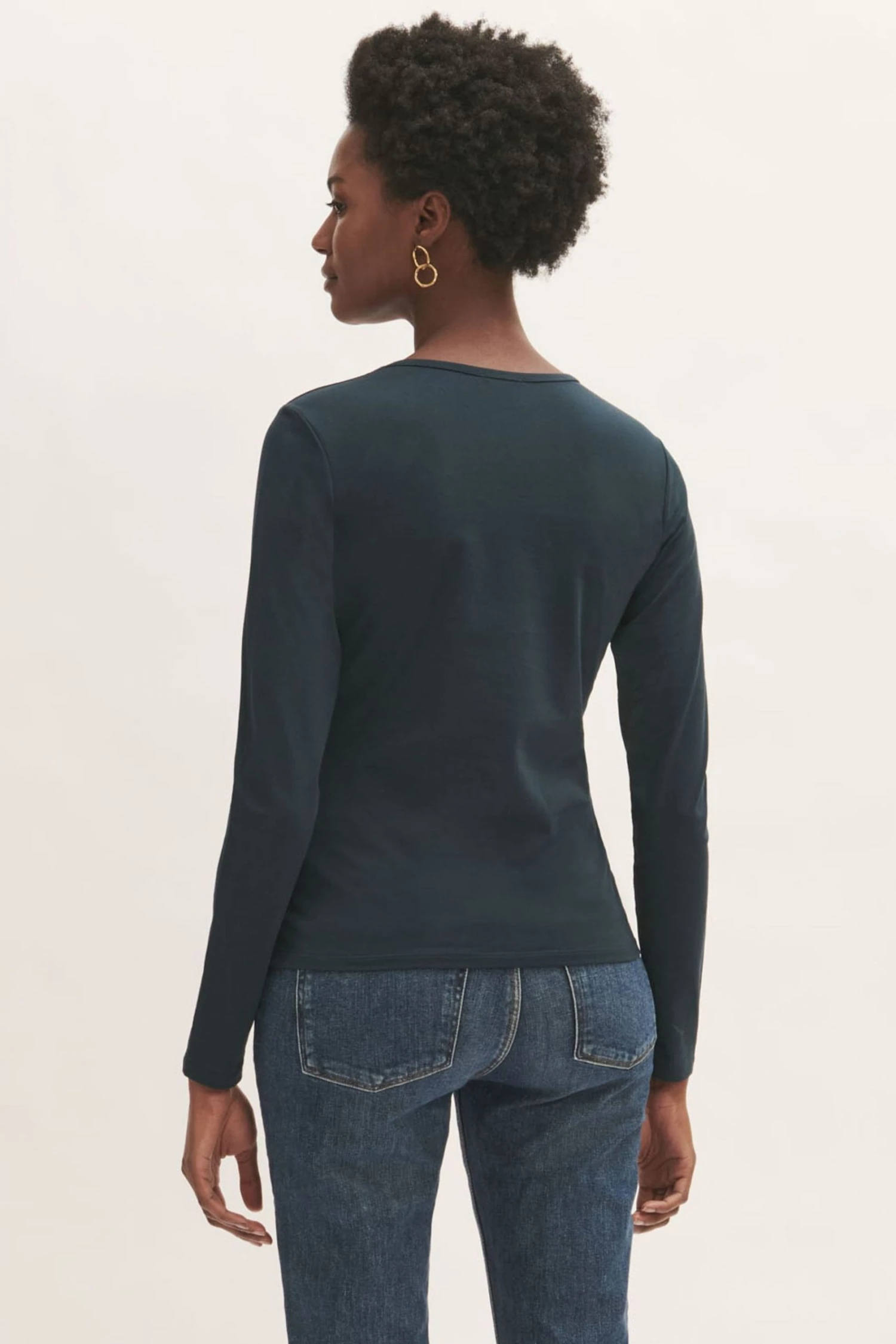 Soft, stretch cotton jersey tee. Double fronted design. Scoop neck. Long sleeves. Layering piece.