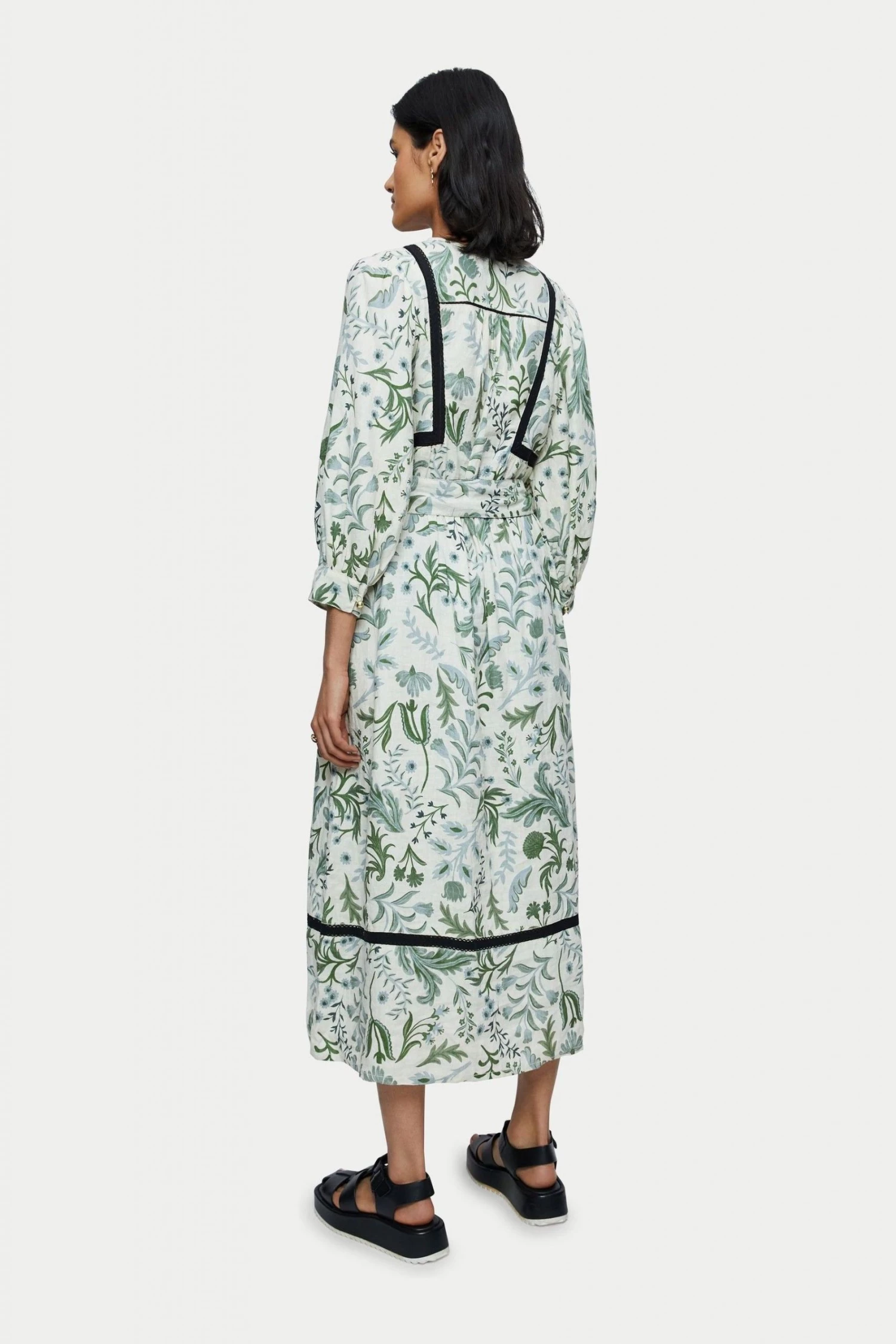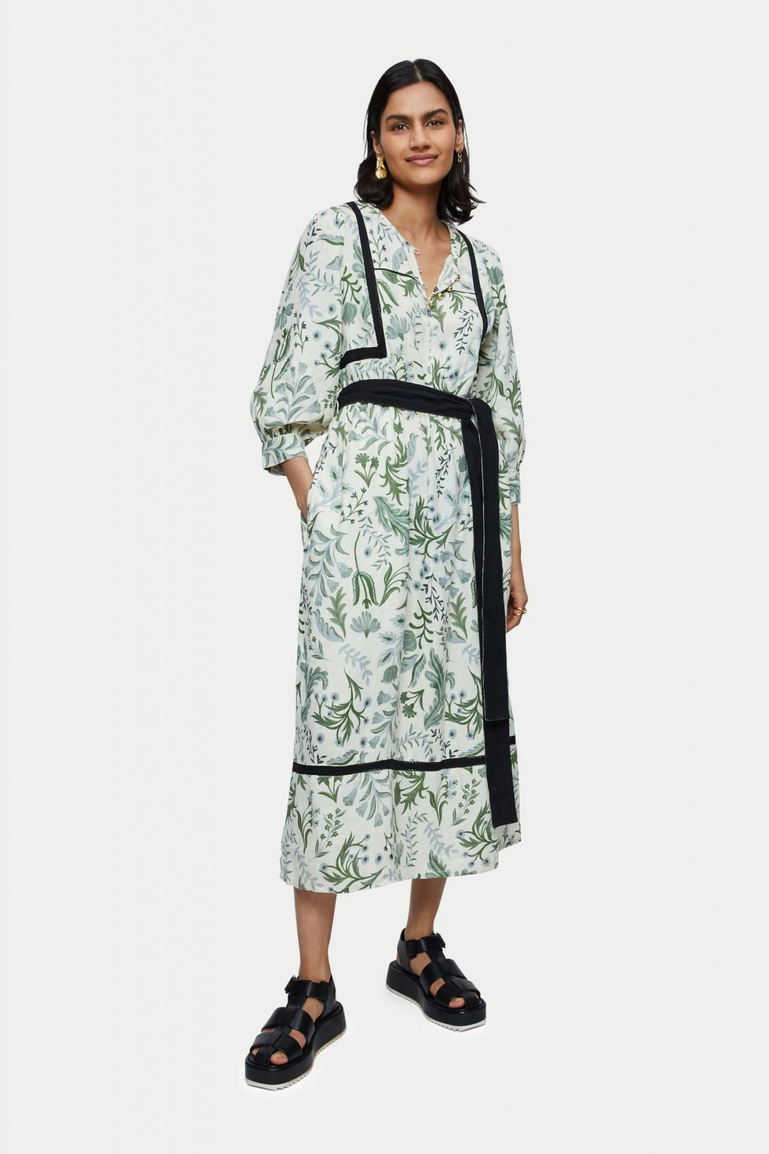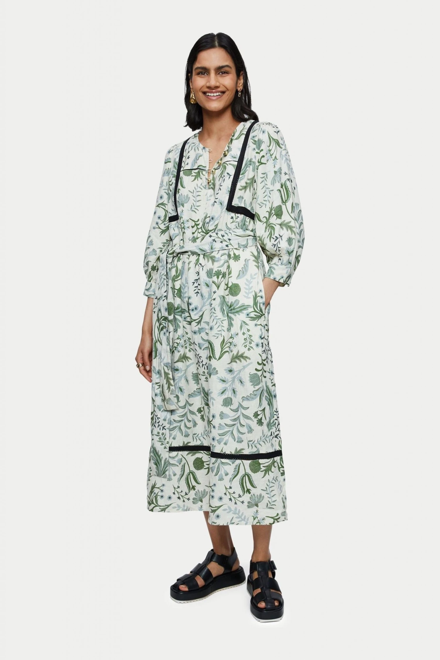 100% pure linen dress in the Jigsaw exclusive Botanist print. Medium weight linen and is a loose easy fluid pop over style. Featuring full 3/4 sleeves and optional self tie belt. Inserted black contrast trim and white gold ball buttons on neck and cuff opening.