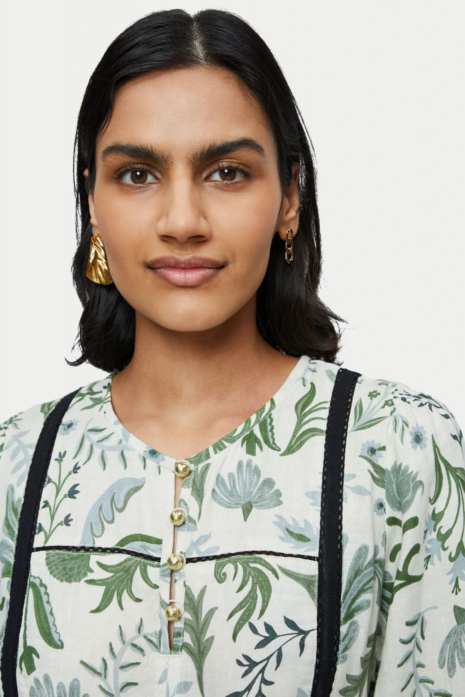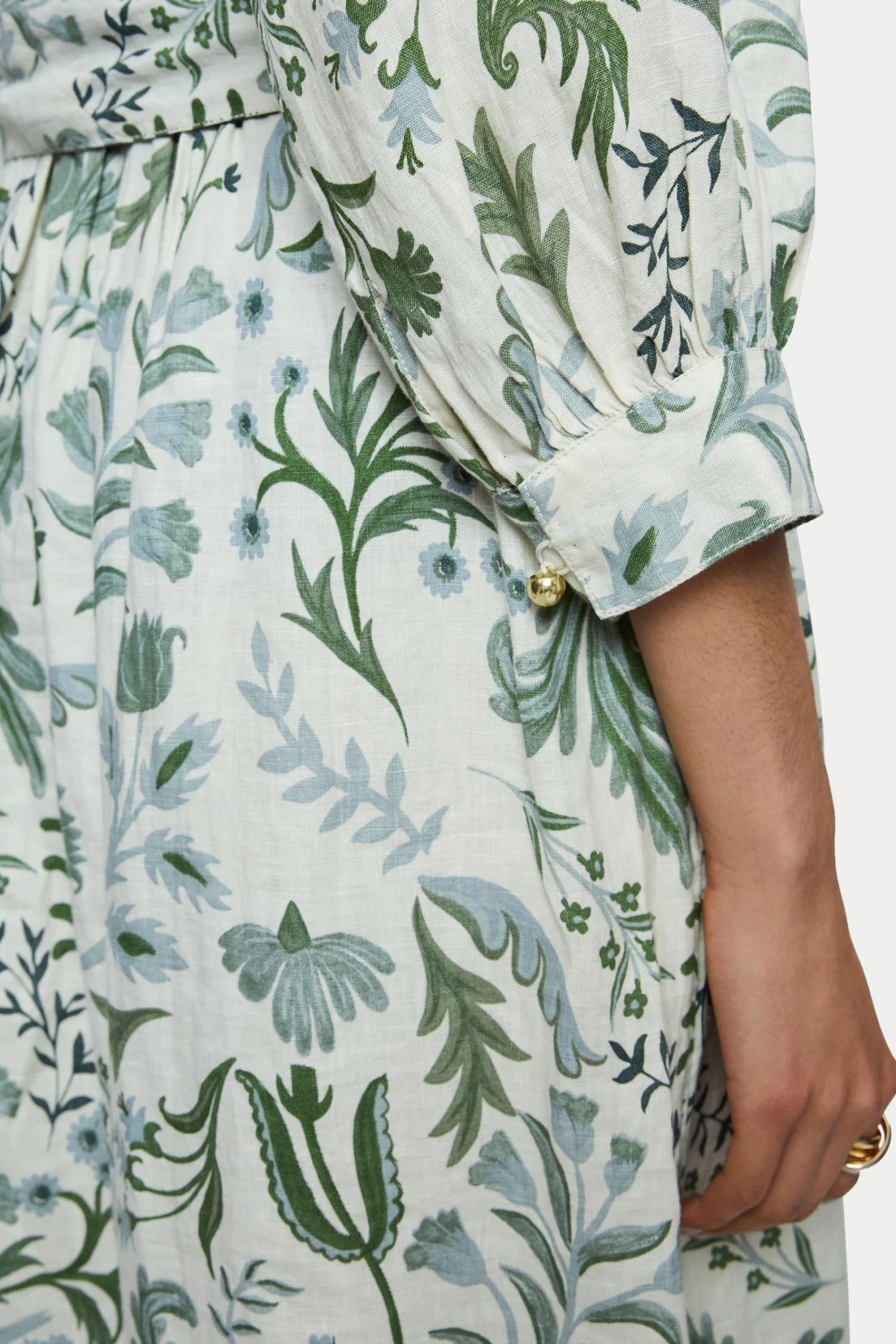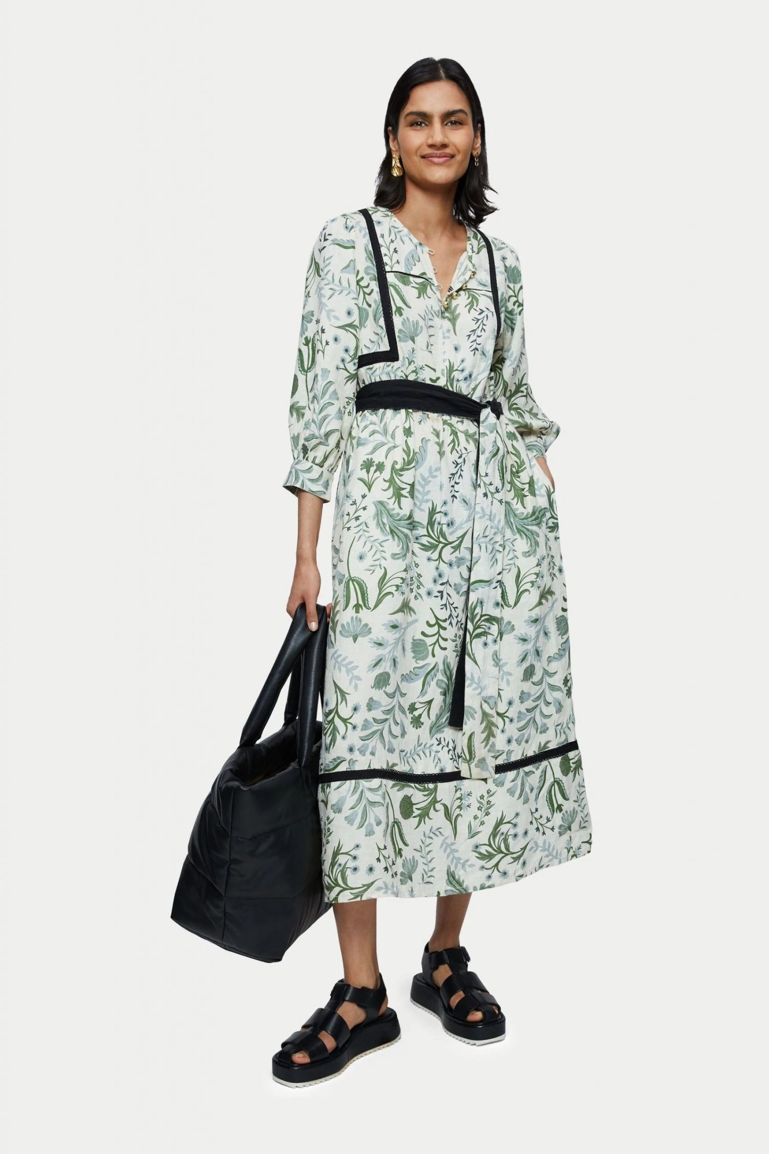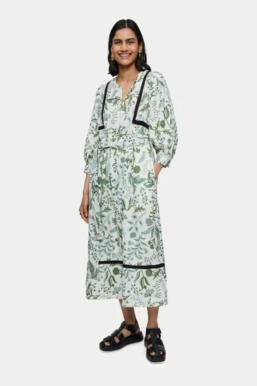 100% pure linen dress in the Jigsaw exclusive Botanist print. Medium weight linen and is a loose easy fluid pop over style. Featuring full 3/4 sleeves and optional self tie belt. Inserted black contrast trim and white gold ball buttons on neck and cuff opening.