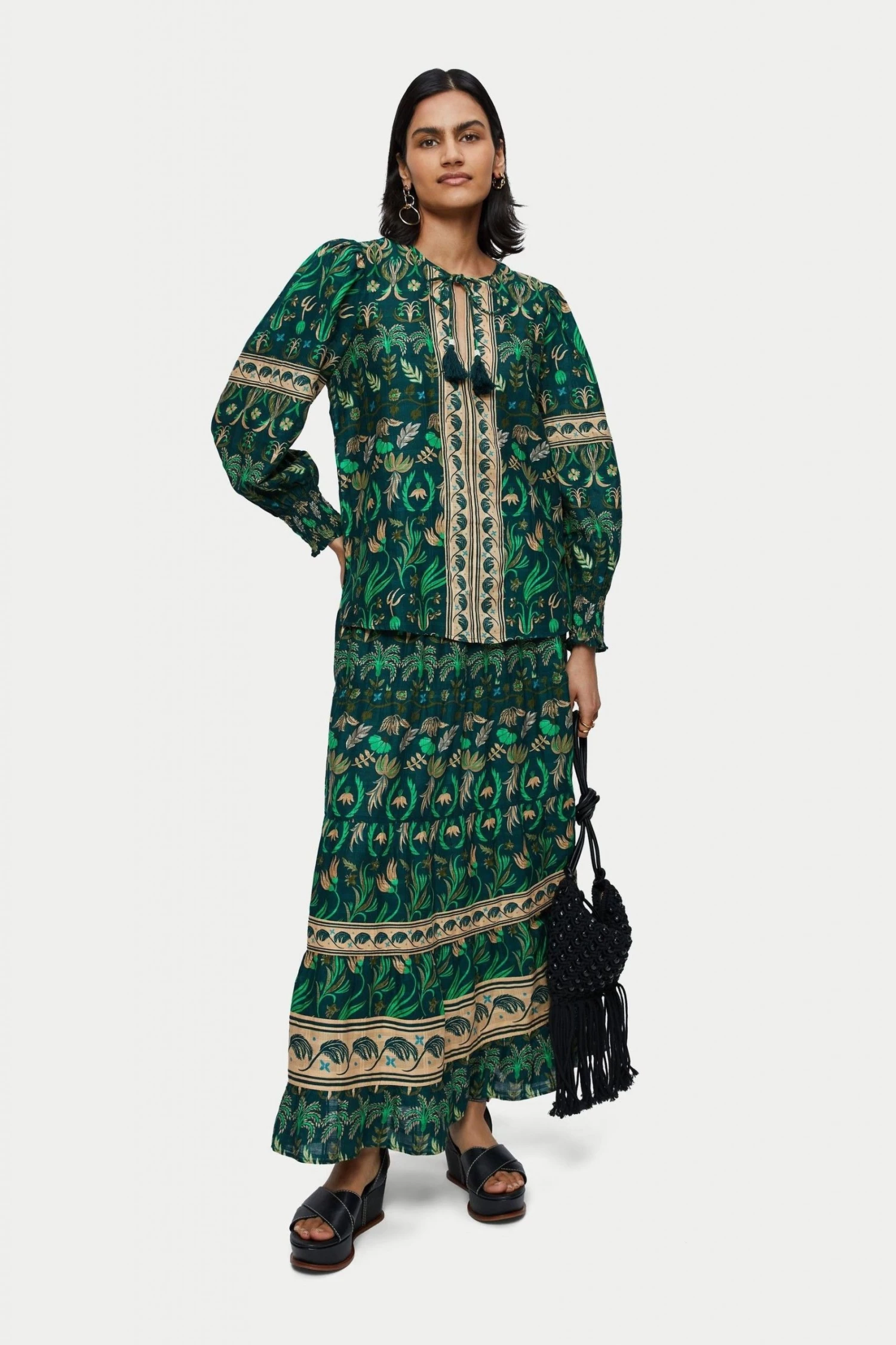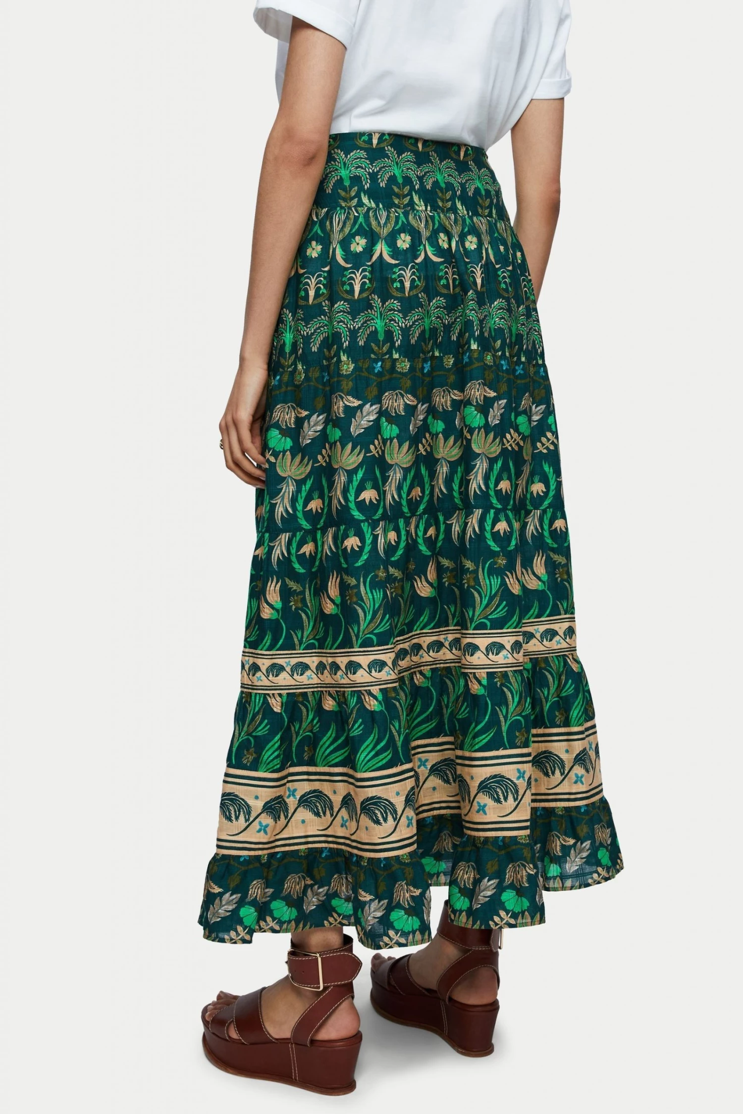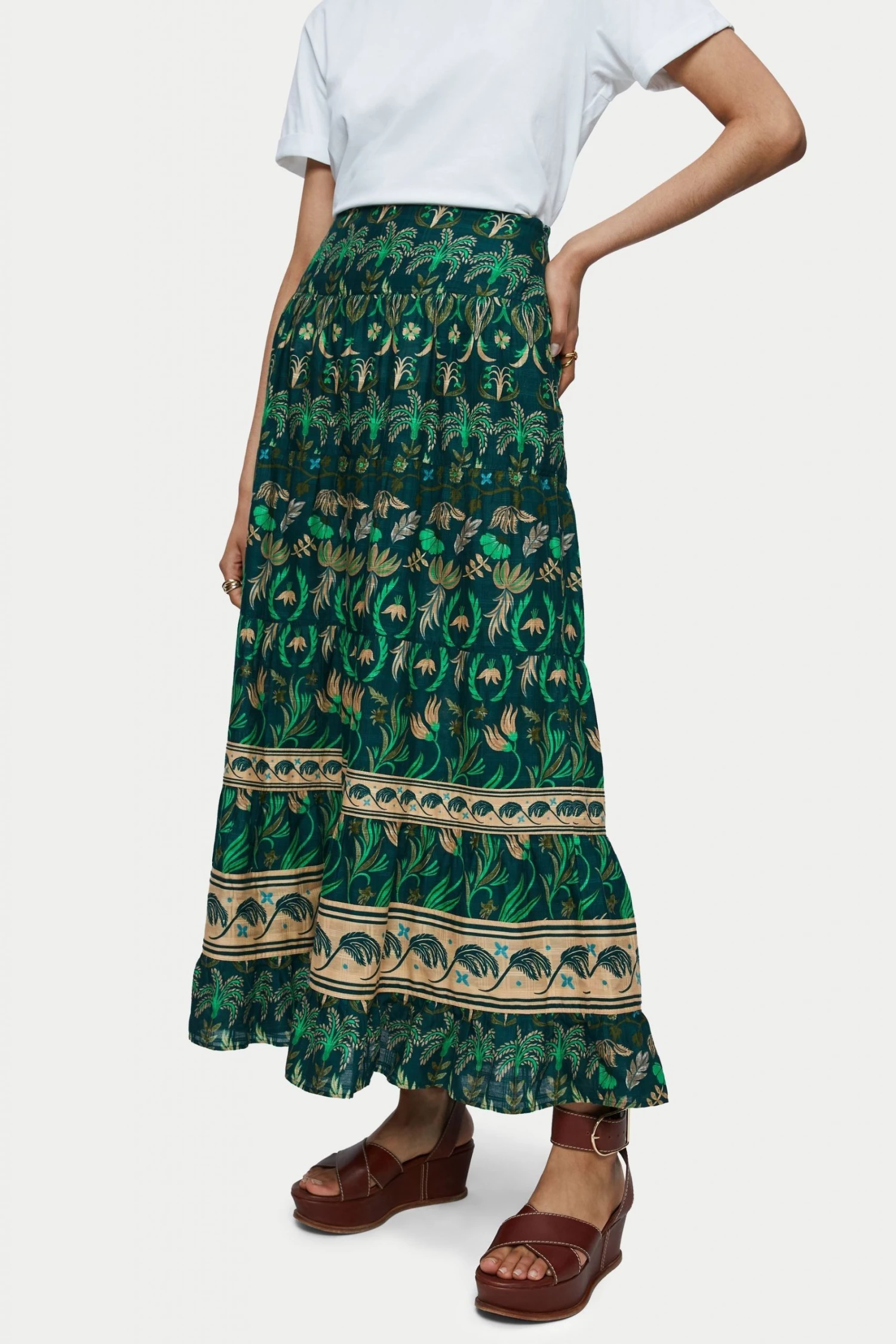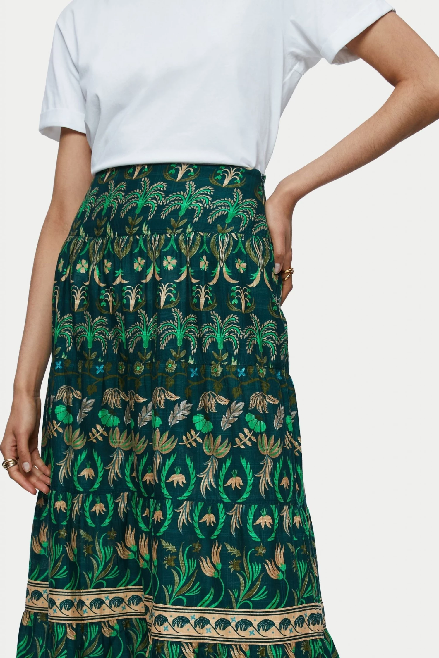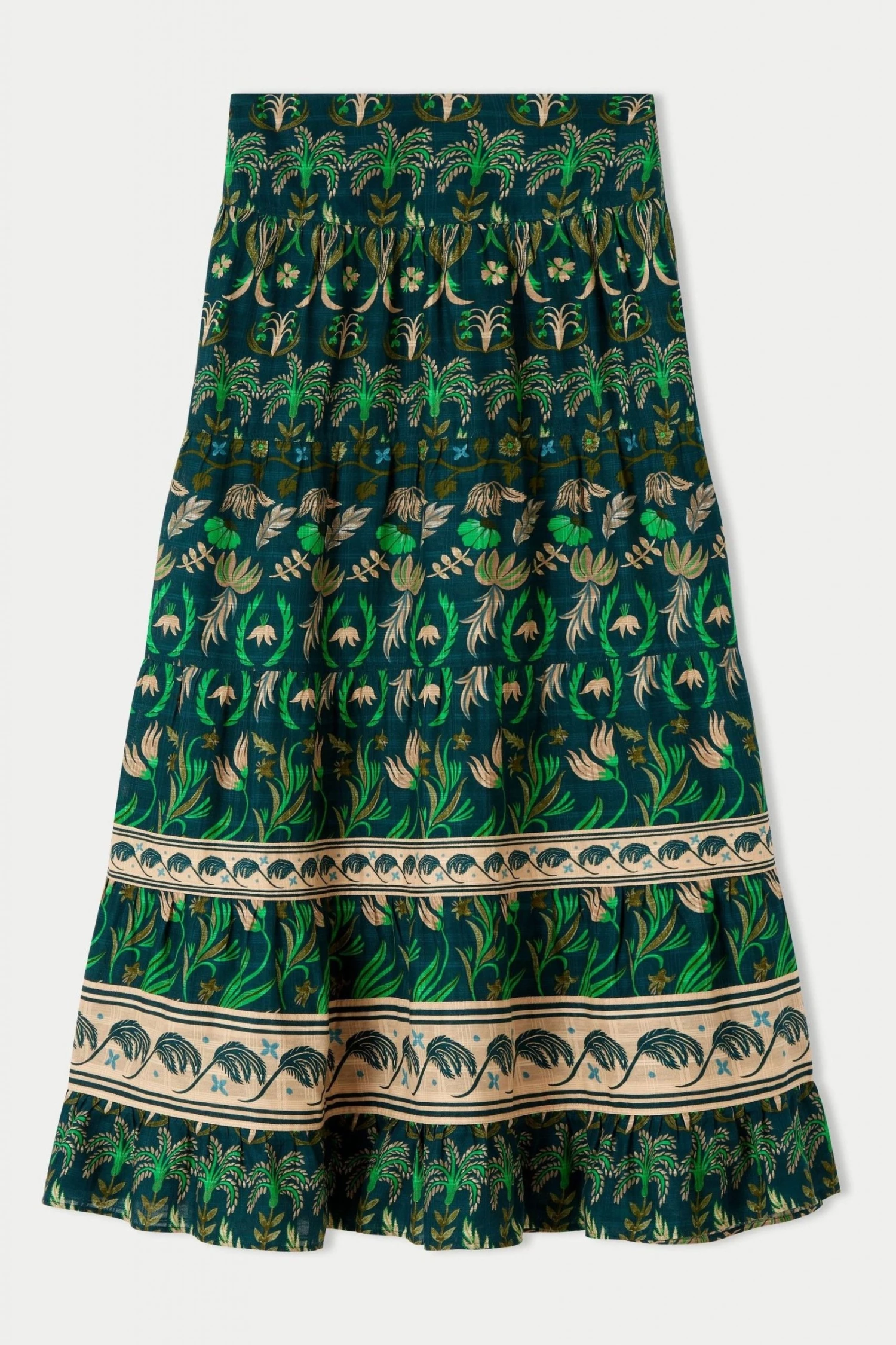 Tiered maxi skirt in Botanical print on soft cotton with a window pane check. Designed with soft gathering across each tiered panel and an invisible side zip fastening.