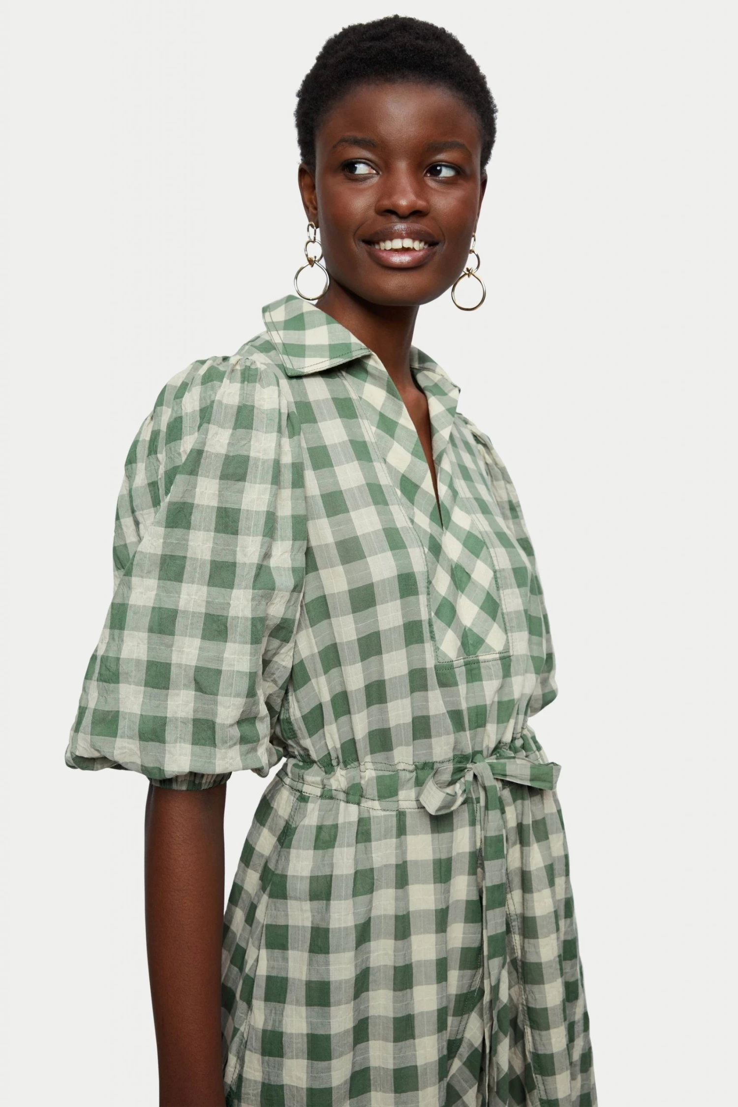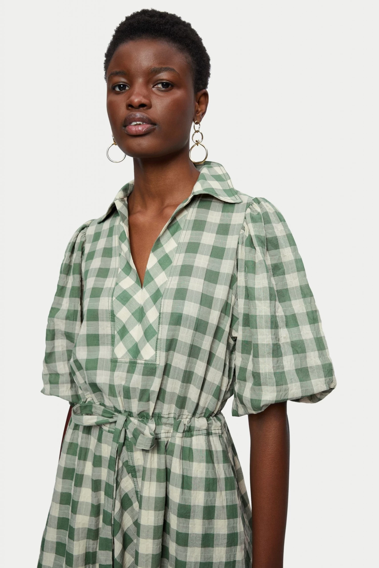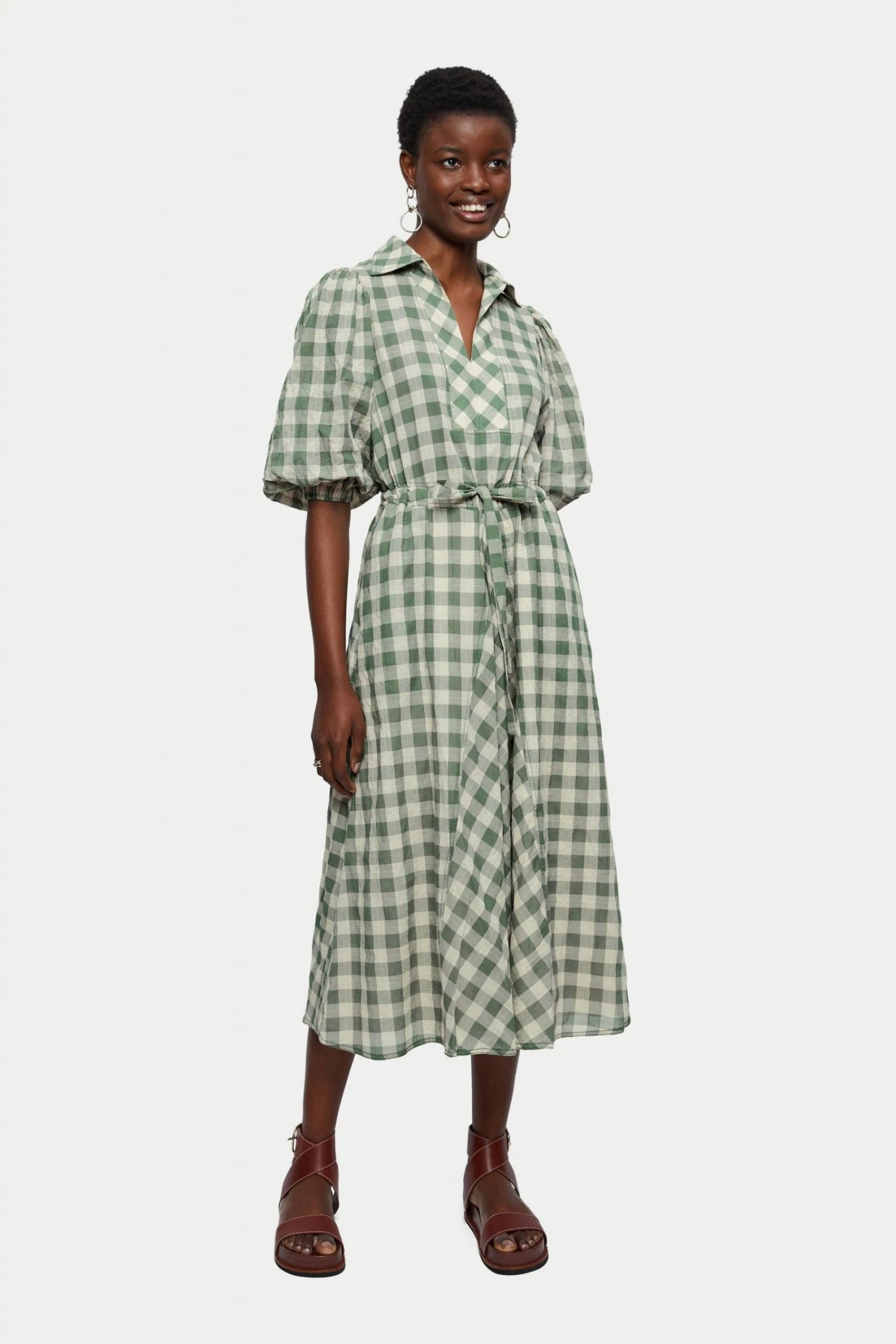 Beautiful shirt dress cut from soft cotton with a gingham weave. Designed with a wide placket V-neck line and shirt collar. Features an adjustable waist with belt, long voluminous sleeves, flowing skirt and side pockets. The perfect day to evening dress, style with boots or trainers.