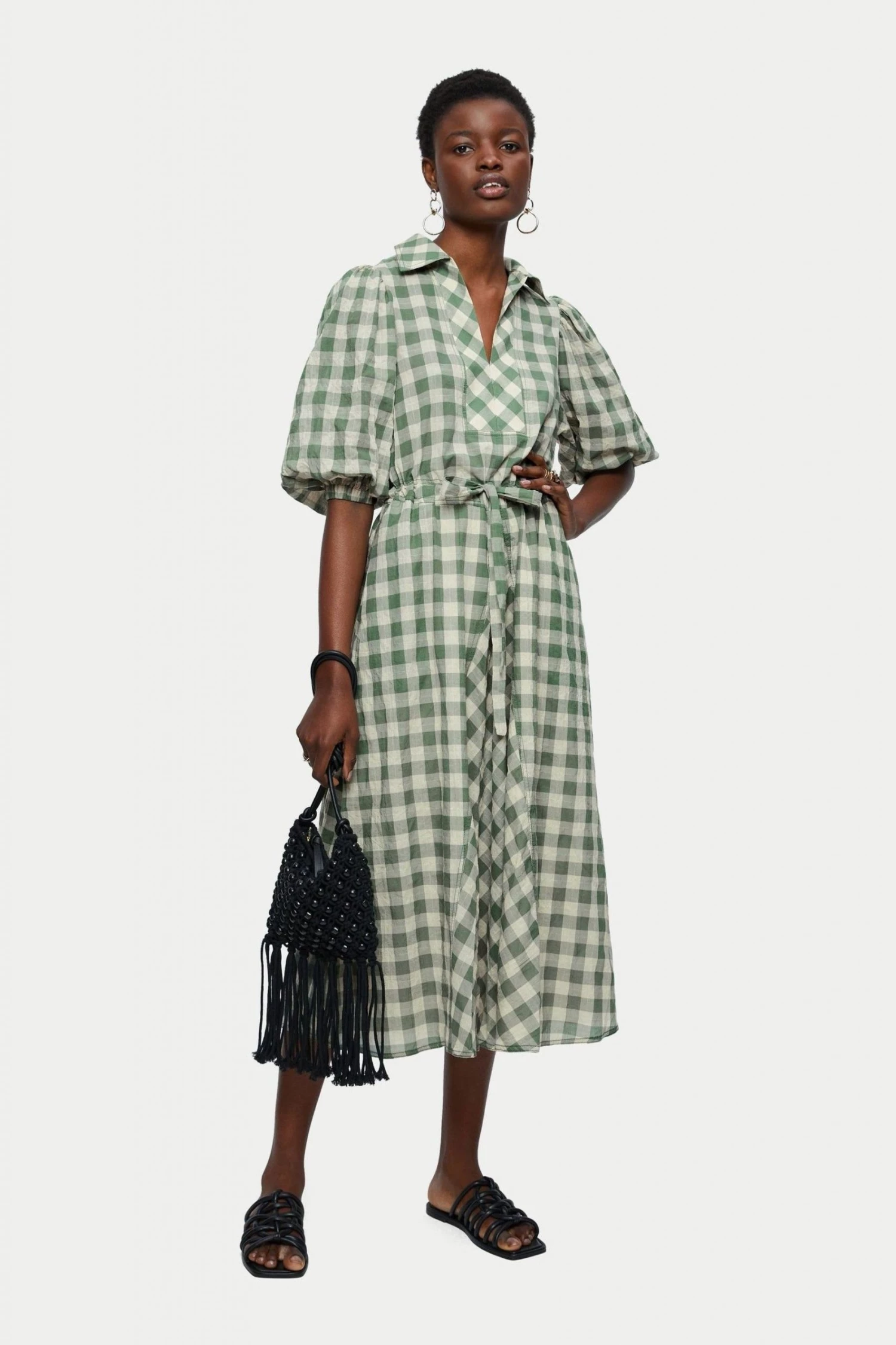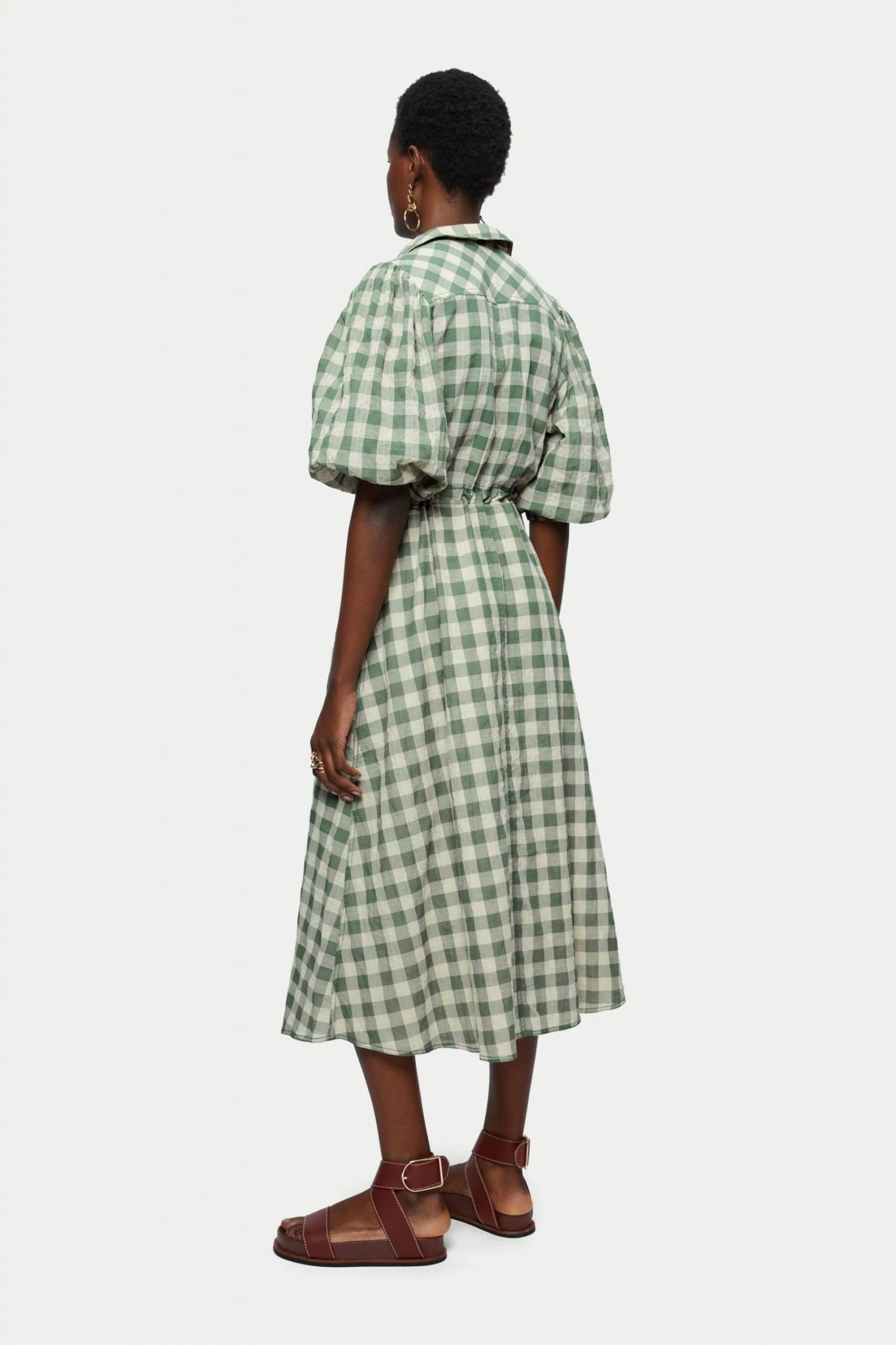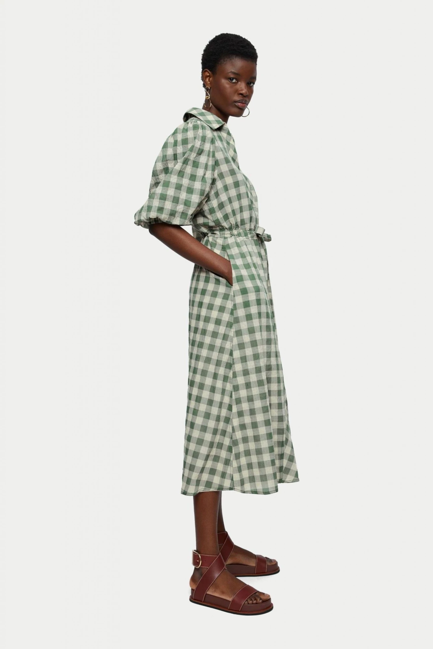 Beautiful shirt dress cut from soft cotton with a gingham weave. Designed with a wide placket V-neck line and shirt collar. Features an adjustable waist with belt, long voluminous sleeves, flowing skirt and side pockets. The perfect day to evening dress, style with boots or trainers.