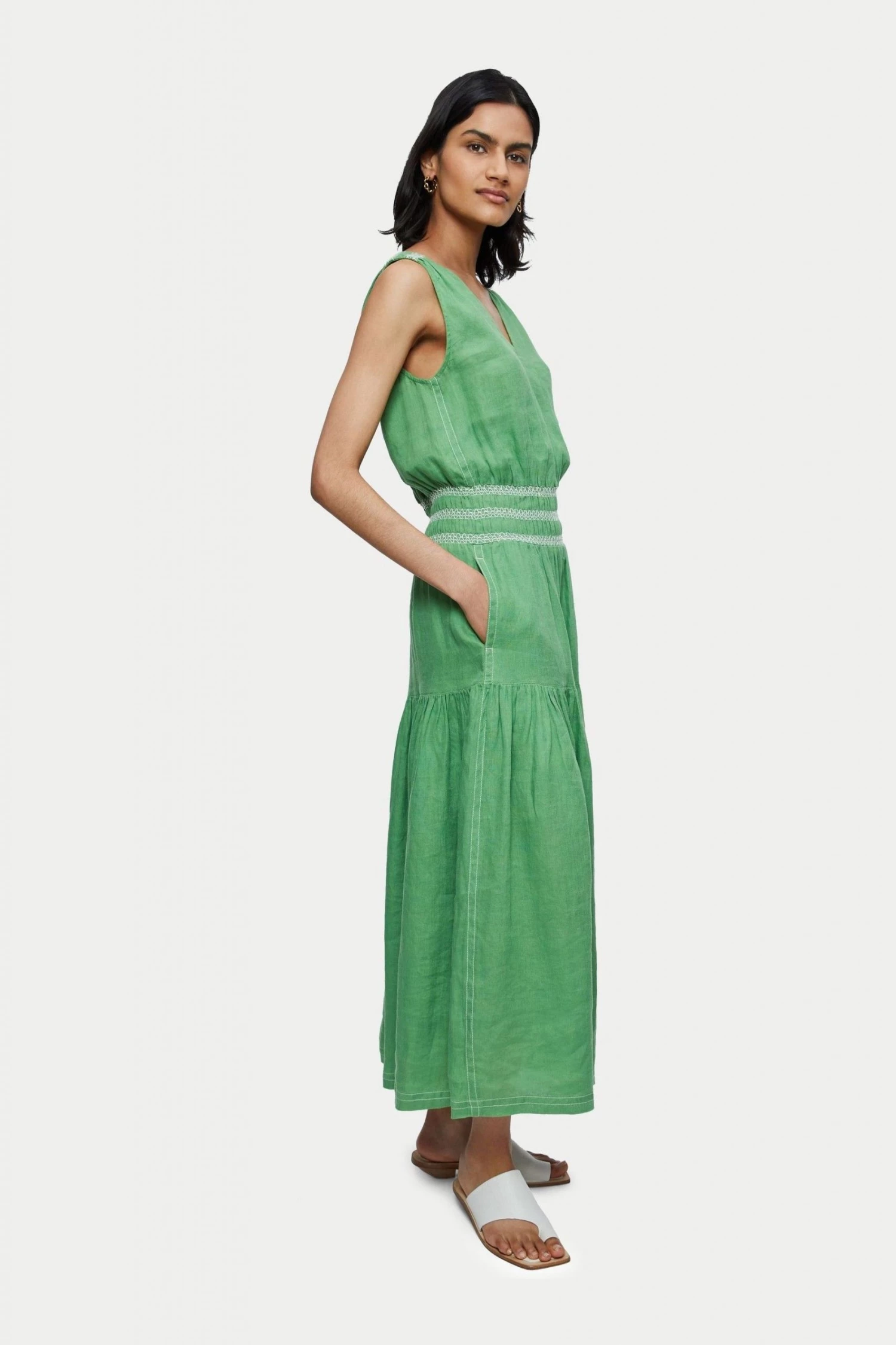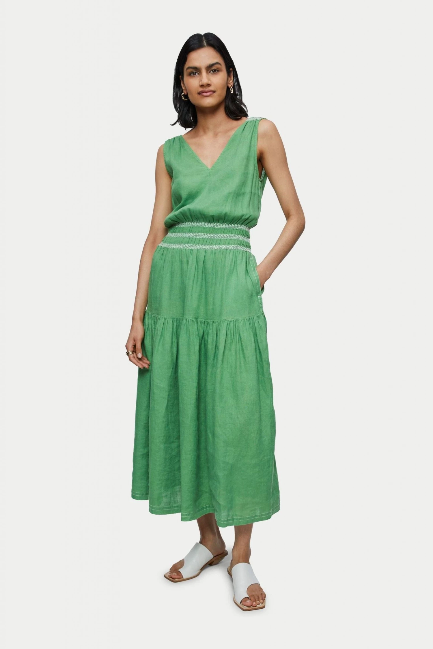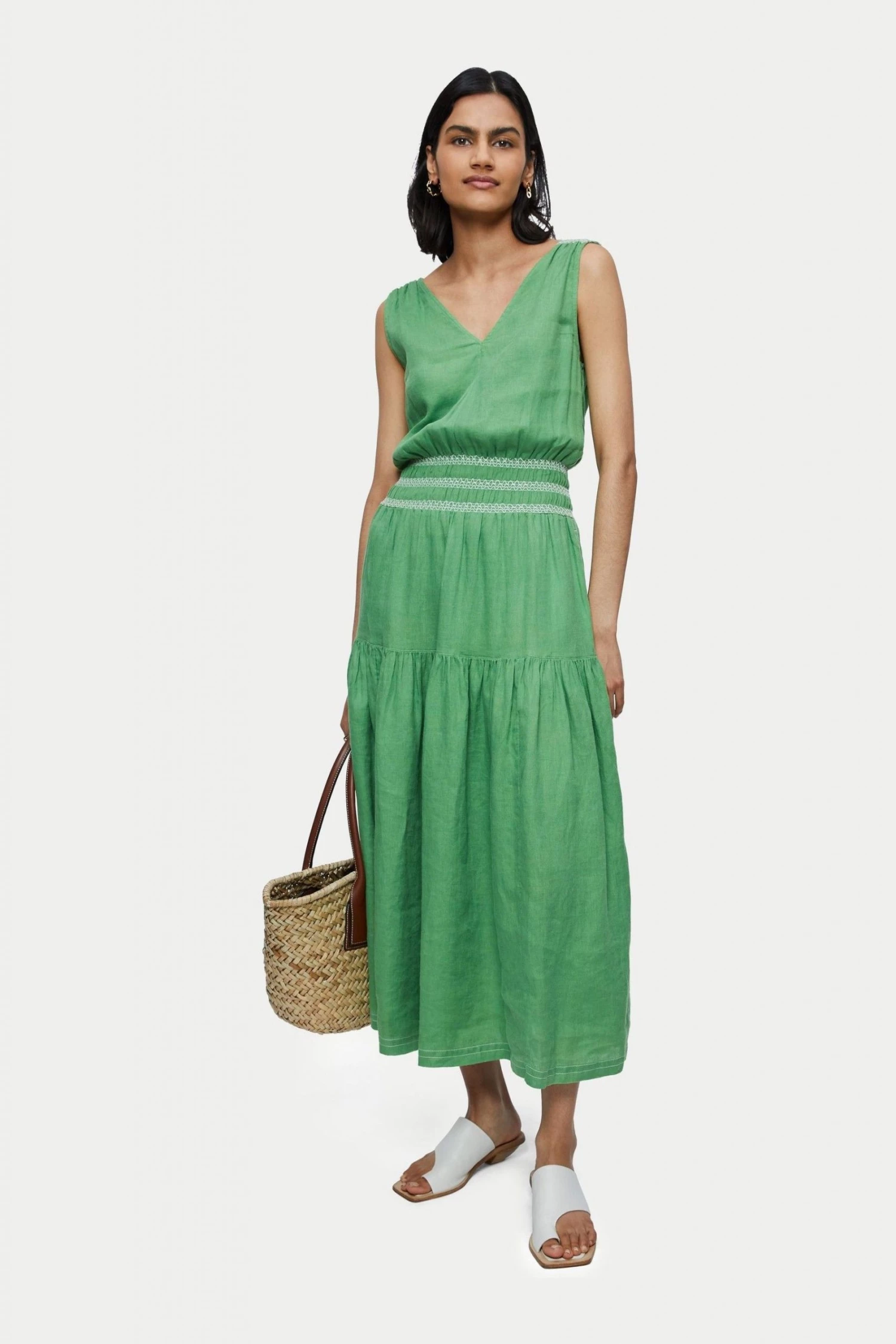 Stylish resort linen maxi dress with beautiful contrast embroidery smocking. Designed with a low V-neckline, sleeveless and gathered skirt. Style with sandals or over swimwear.