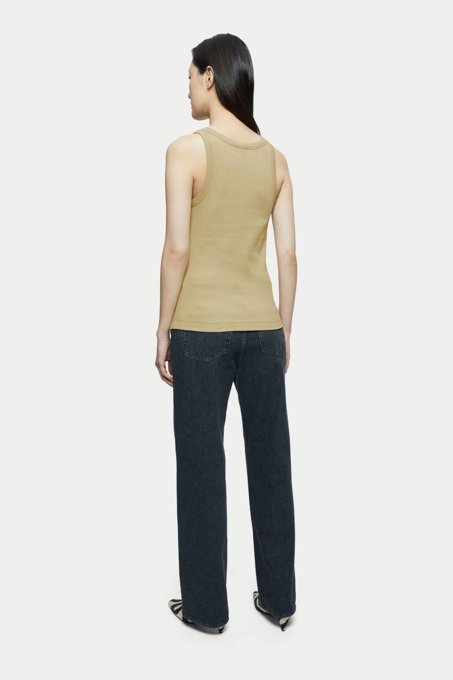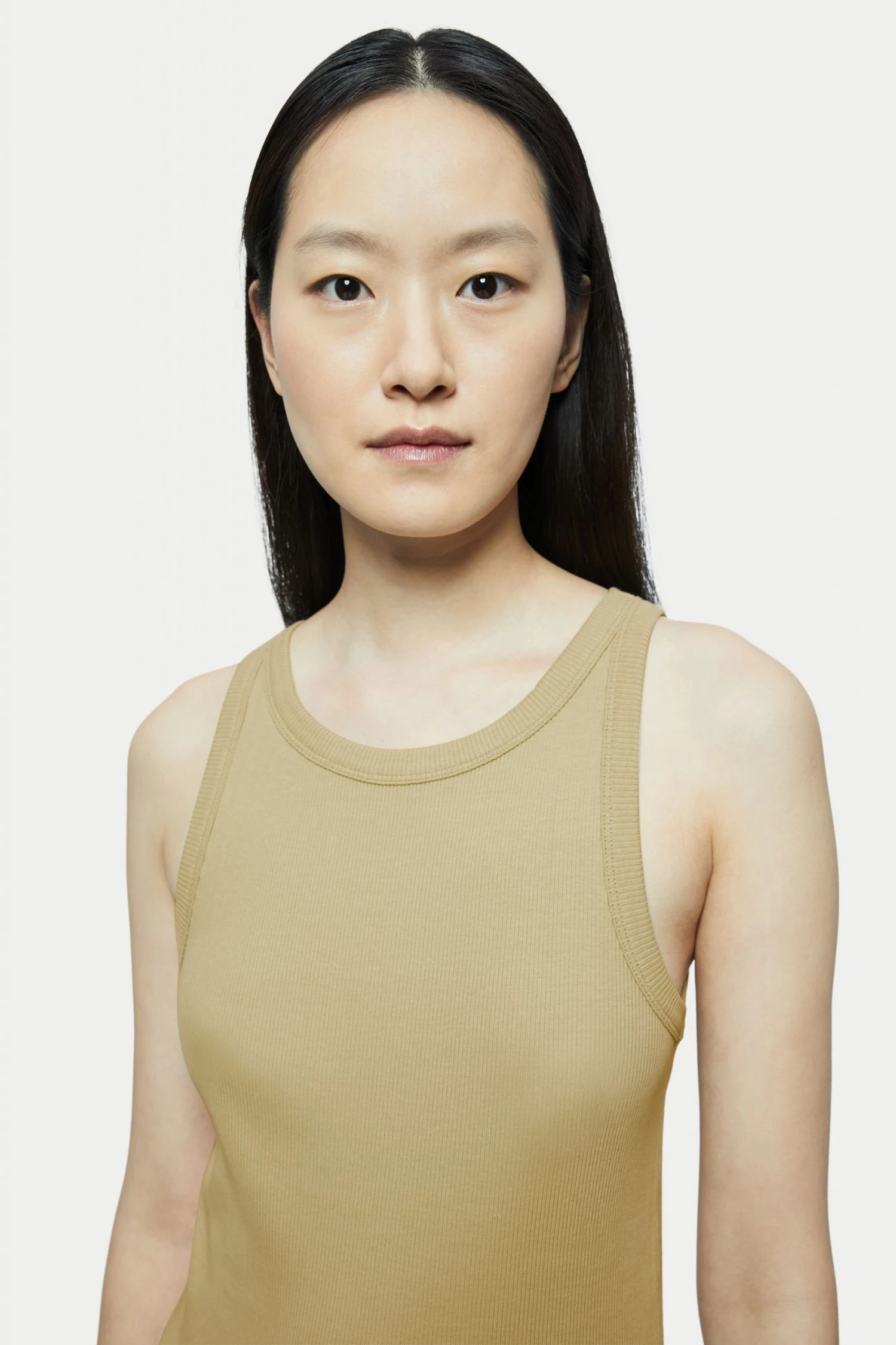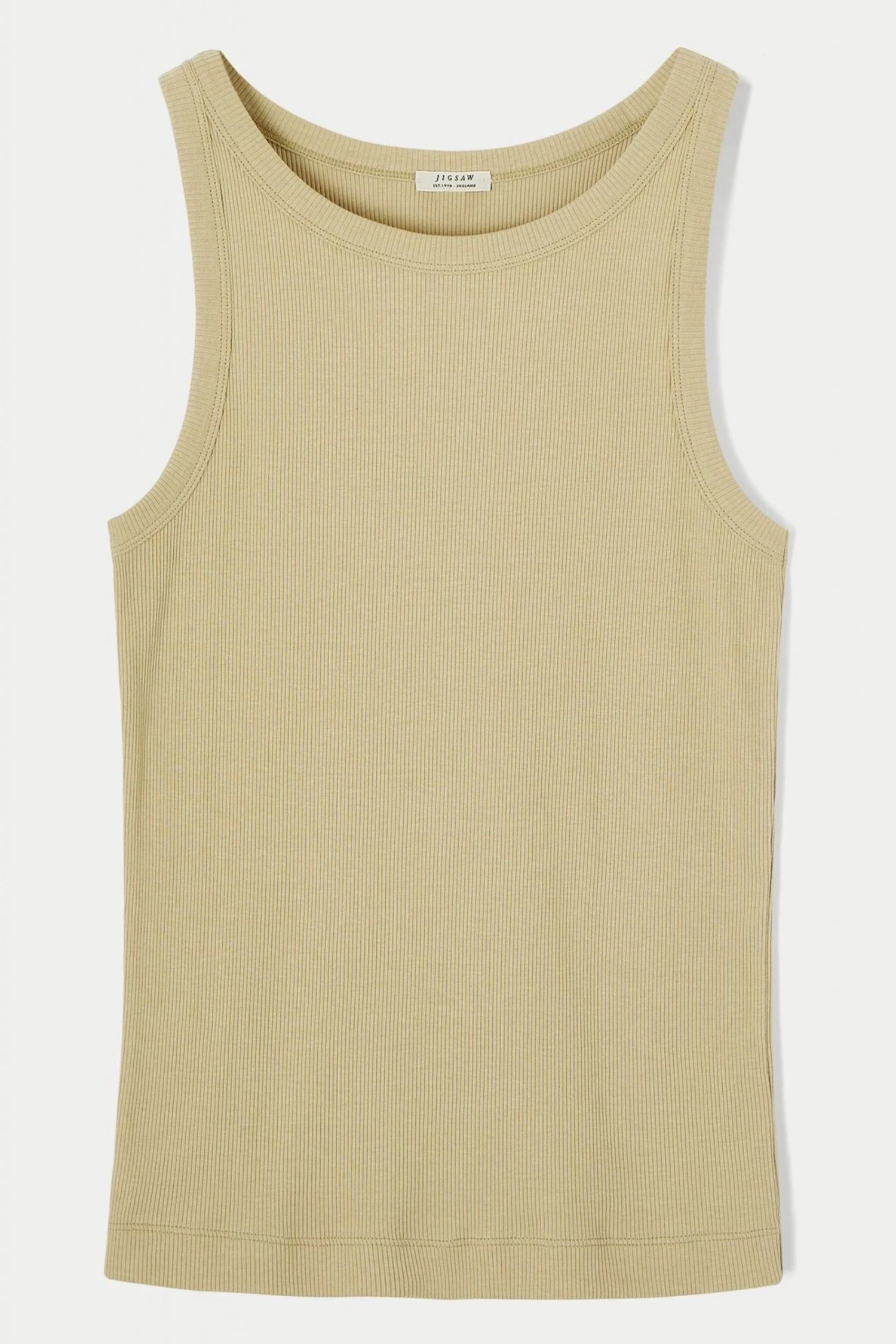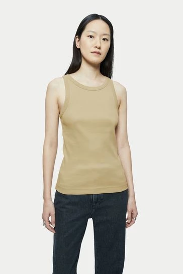 Ribbed tank made from organic cotton jersey. Cut with a slim fit and slightly cutaway armholes to give a flattering line at the shoulders while still providing coverage for bra straps. This jersey style is designed for effortless layering. Wear with wide tailored trousers and a relaxed blazer or use it to underpin this seasons chunky knits.