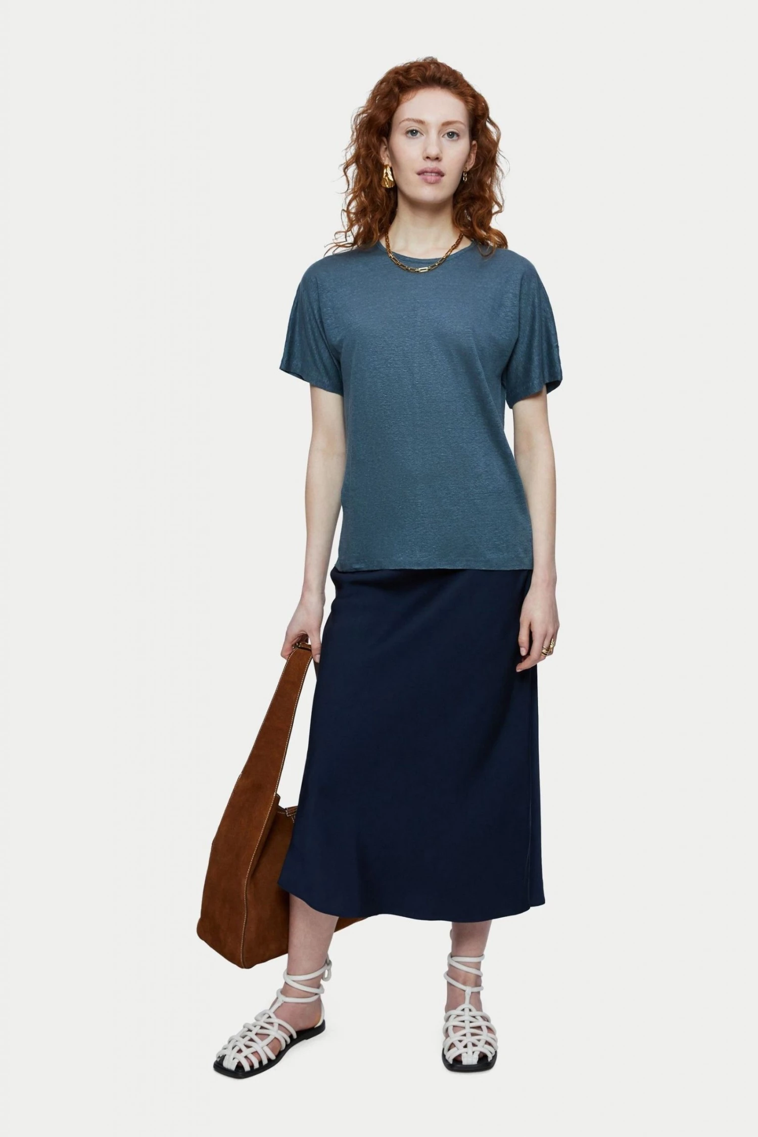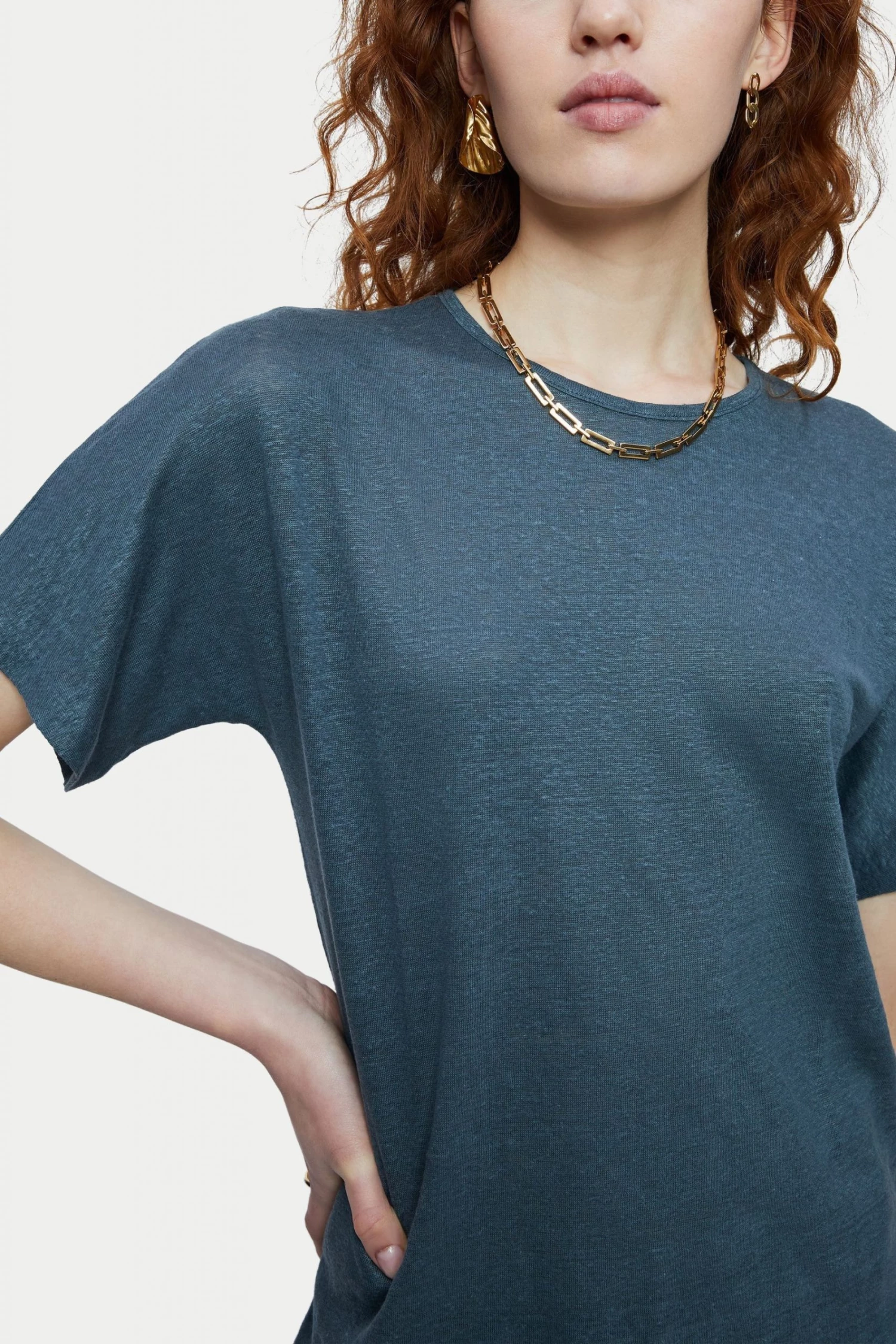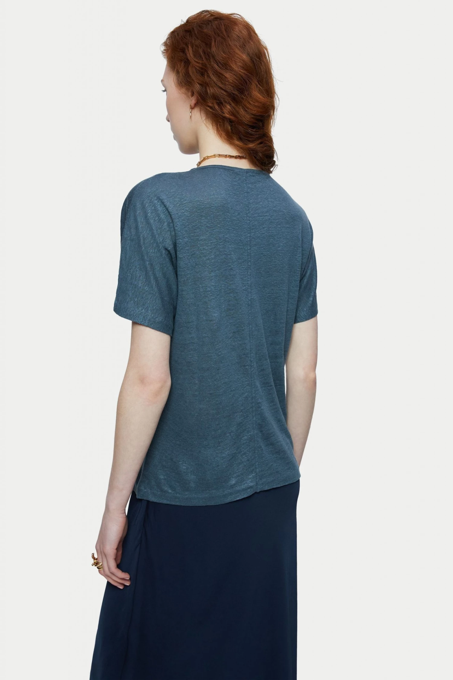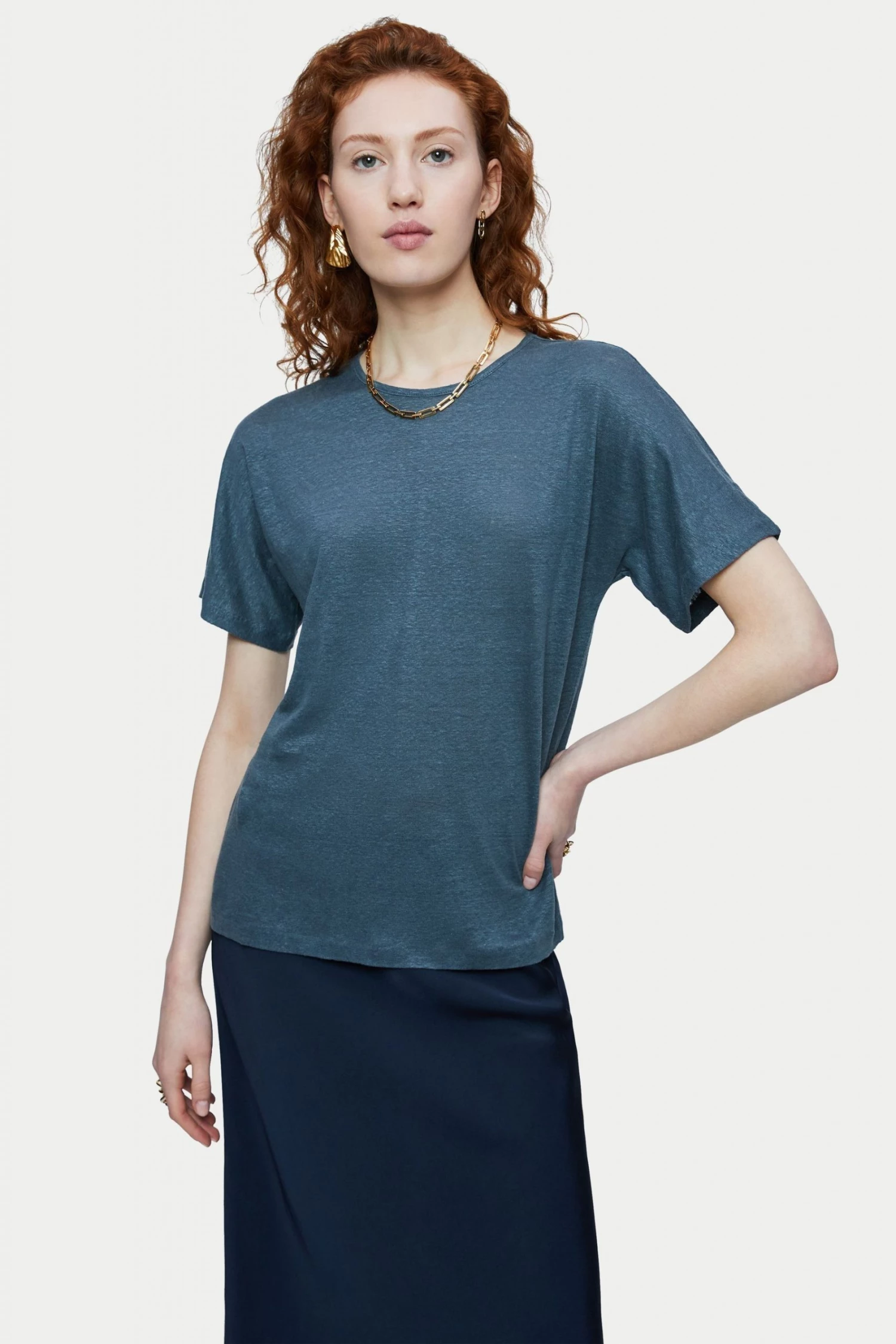 100% Portuguese linen short sleeve T-shirt. Designed with sleeve and body all cut from one piece for an easy and relaxed fit. The neckline is finished with a minimal slim self binding. Linen is a naturally sustainable fabric which feels cool and comfortable against the skin. An effortless piece to style with denim or flowy maxi skirts.