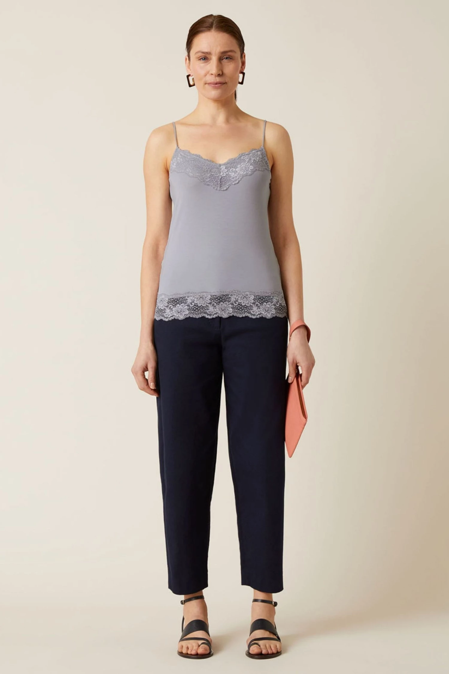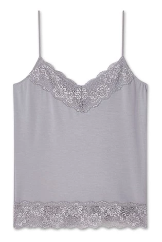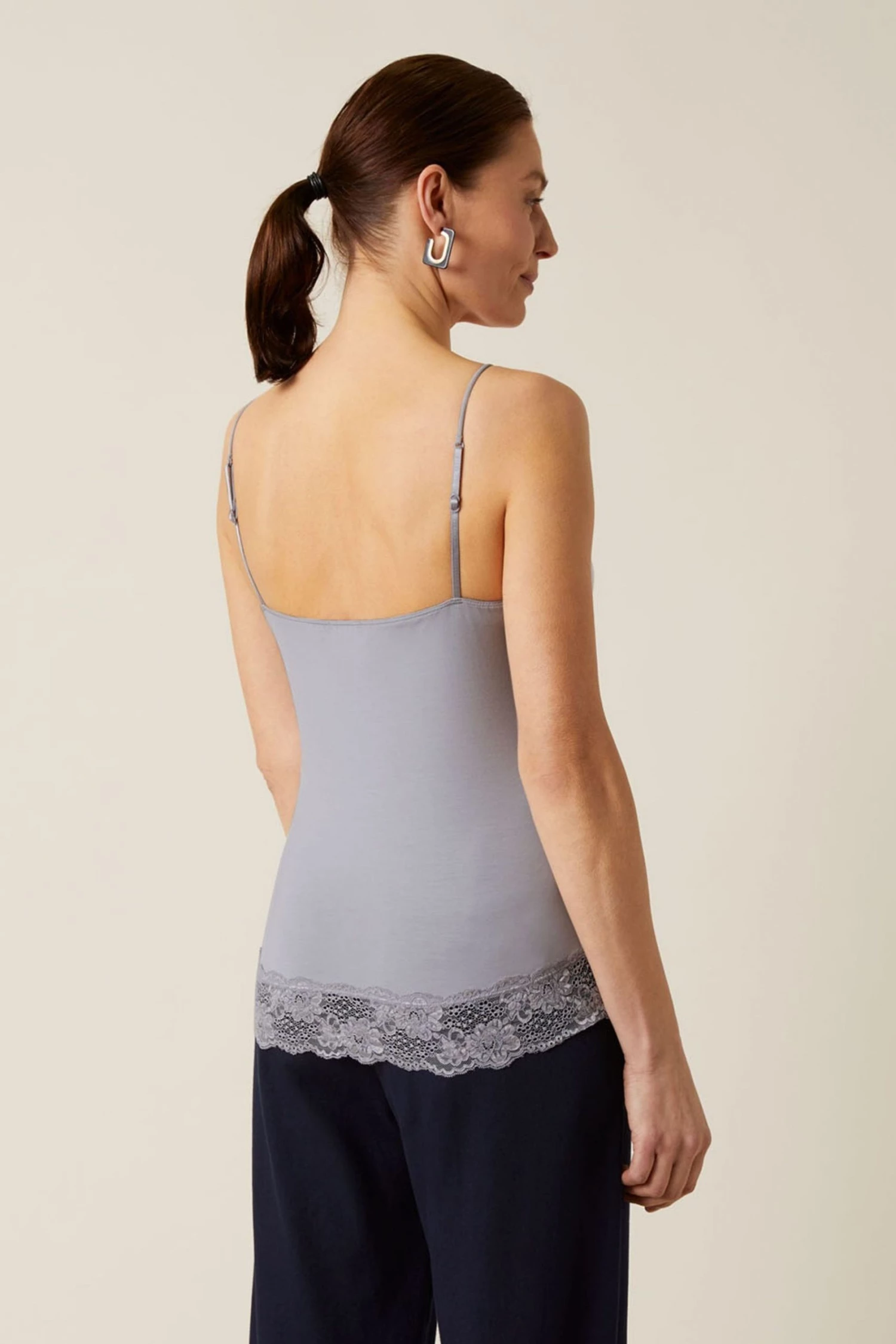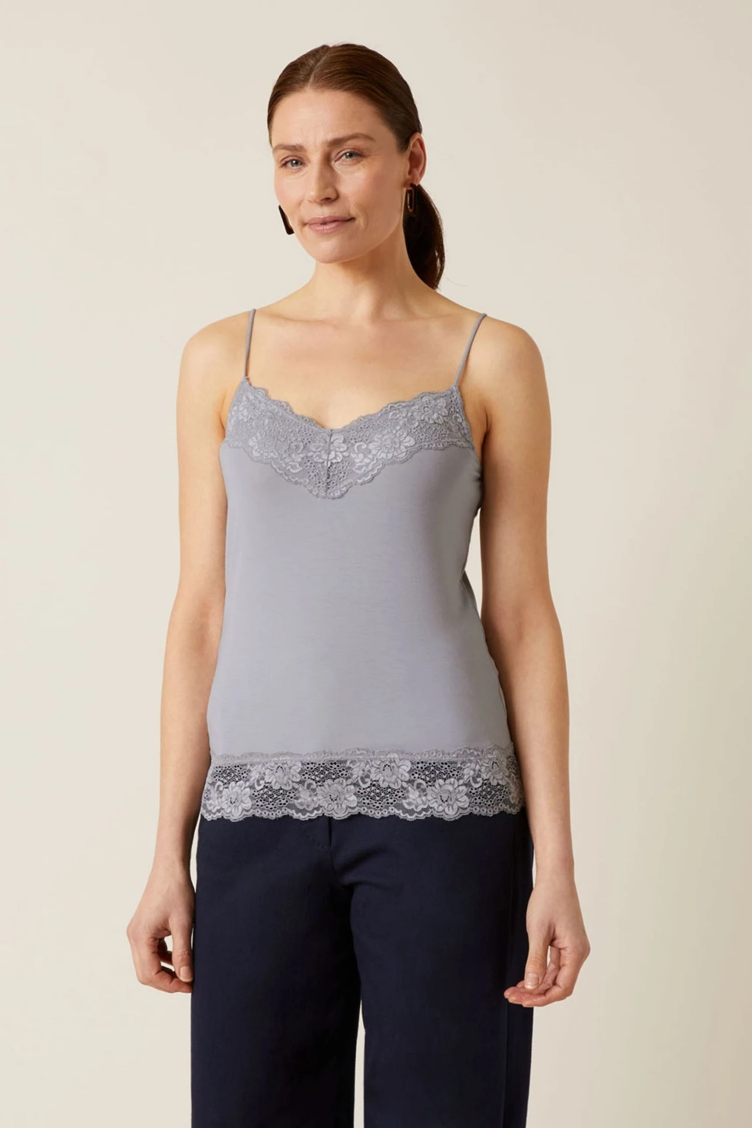Lace trim vest top. Soft modal jersey. Best-selling style. Slim adjustable straps. Layering piece.