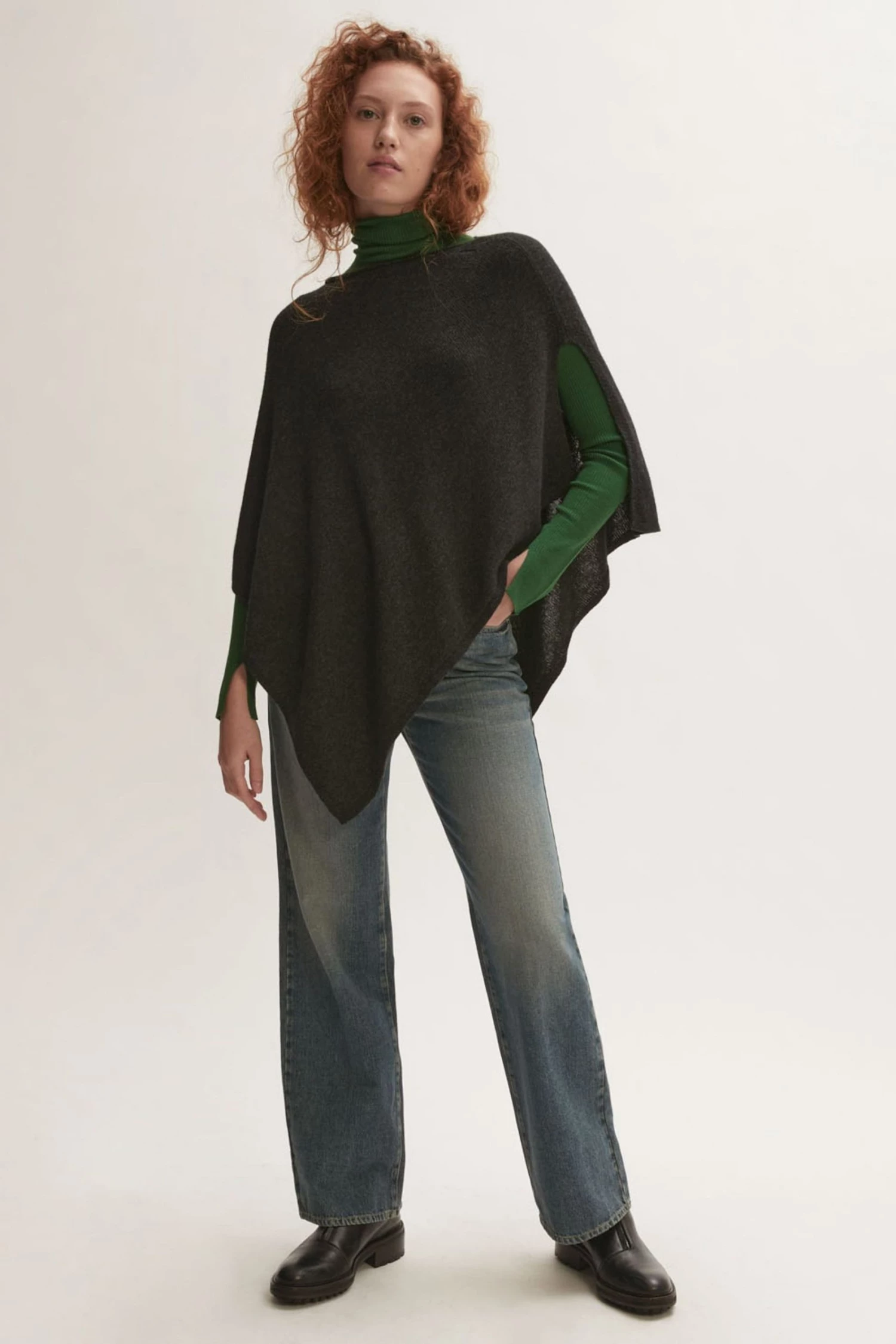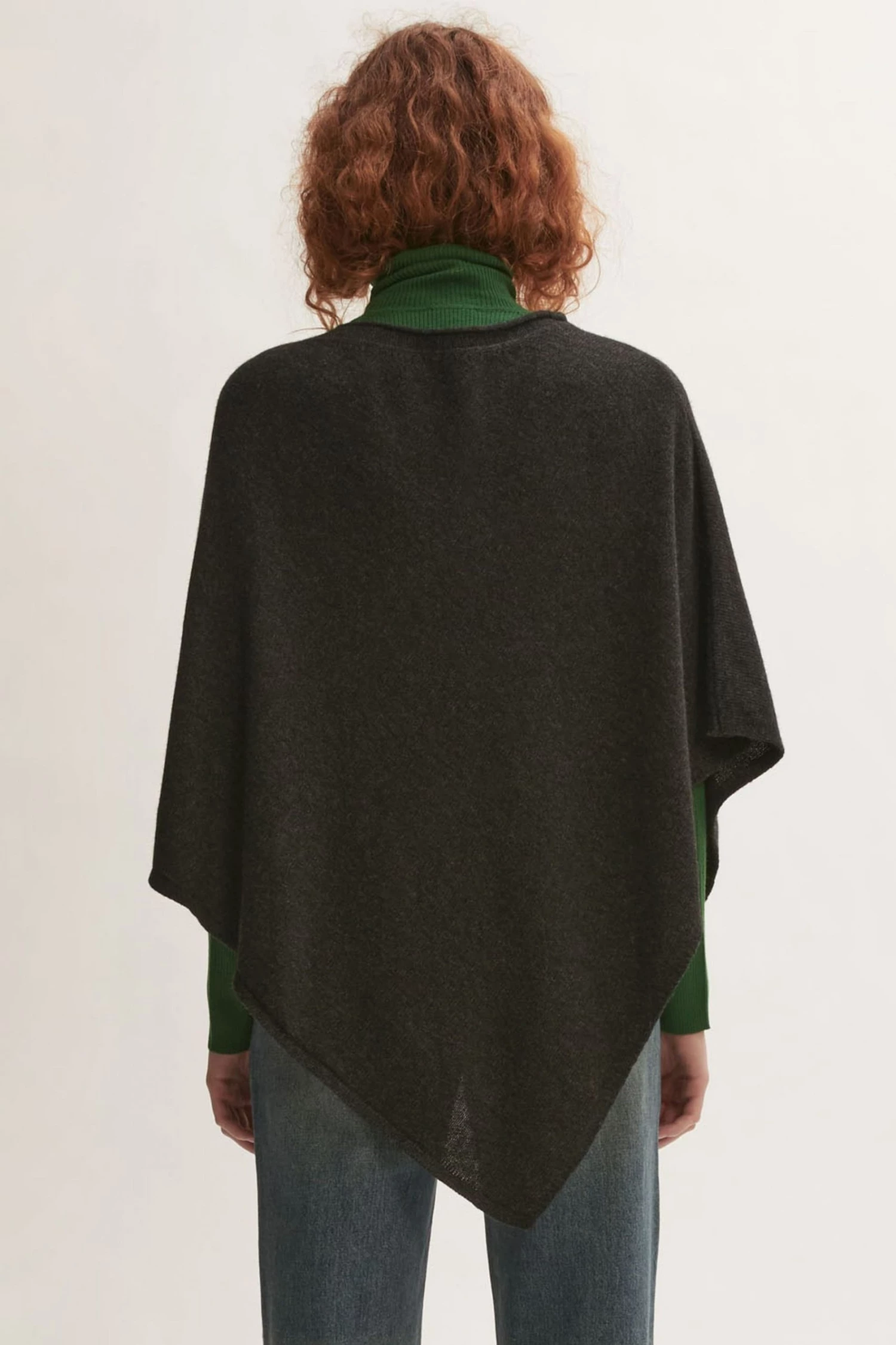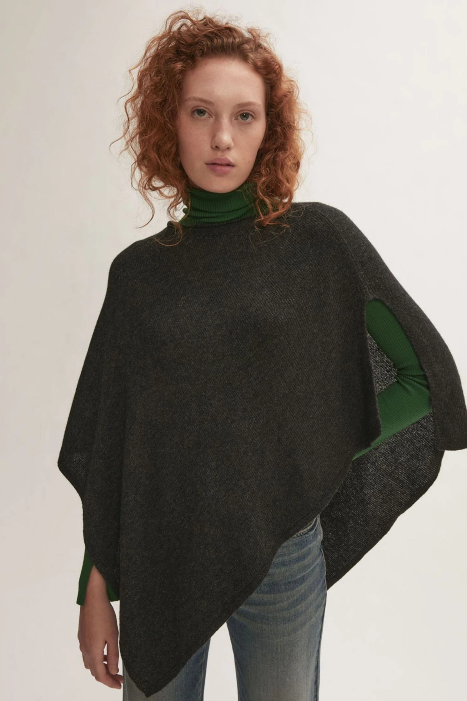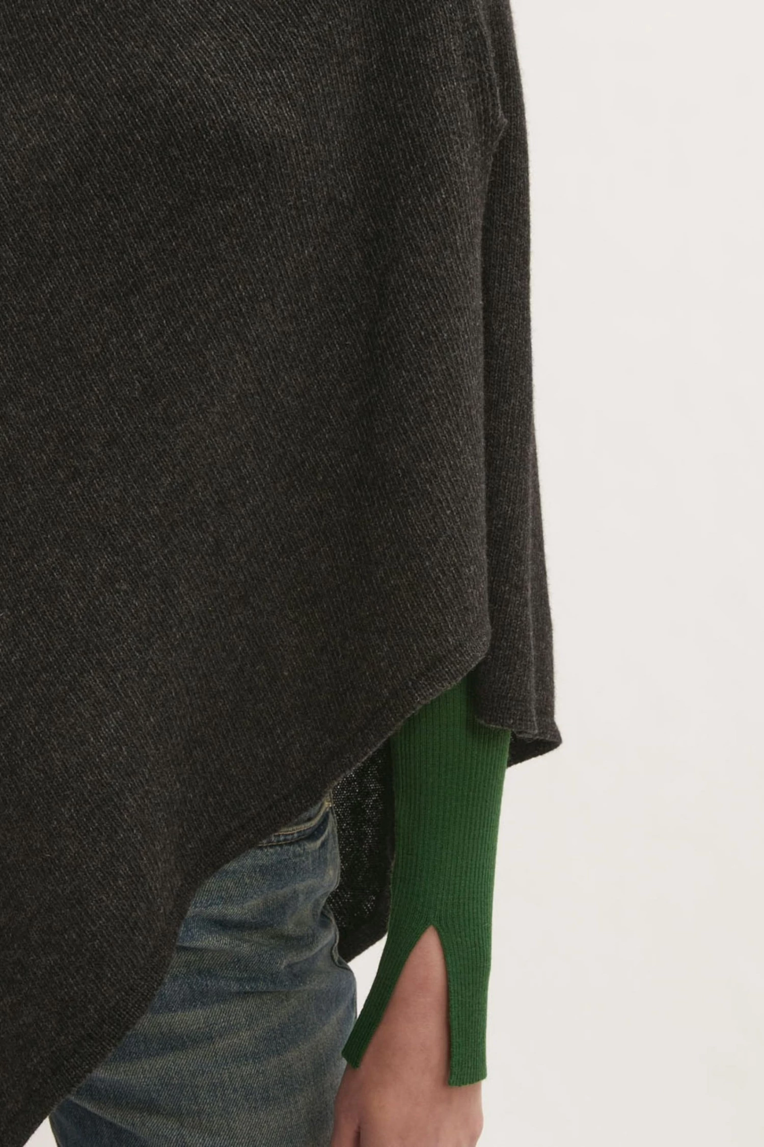 The classic poncho updated with new modern shape. Asymmetric back and front. Feminine open shoulder detail on one side. Roll edge finish on neckline. Made in Italy.