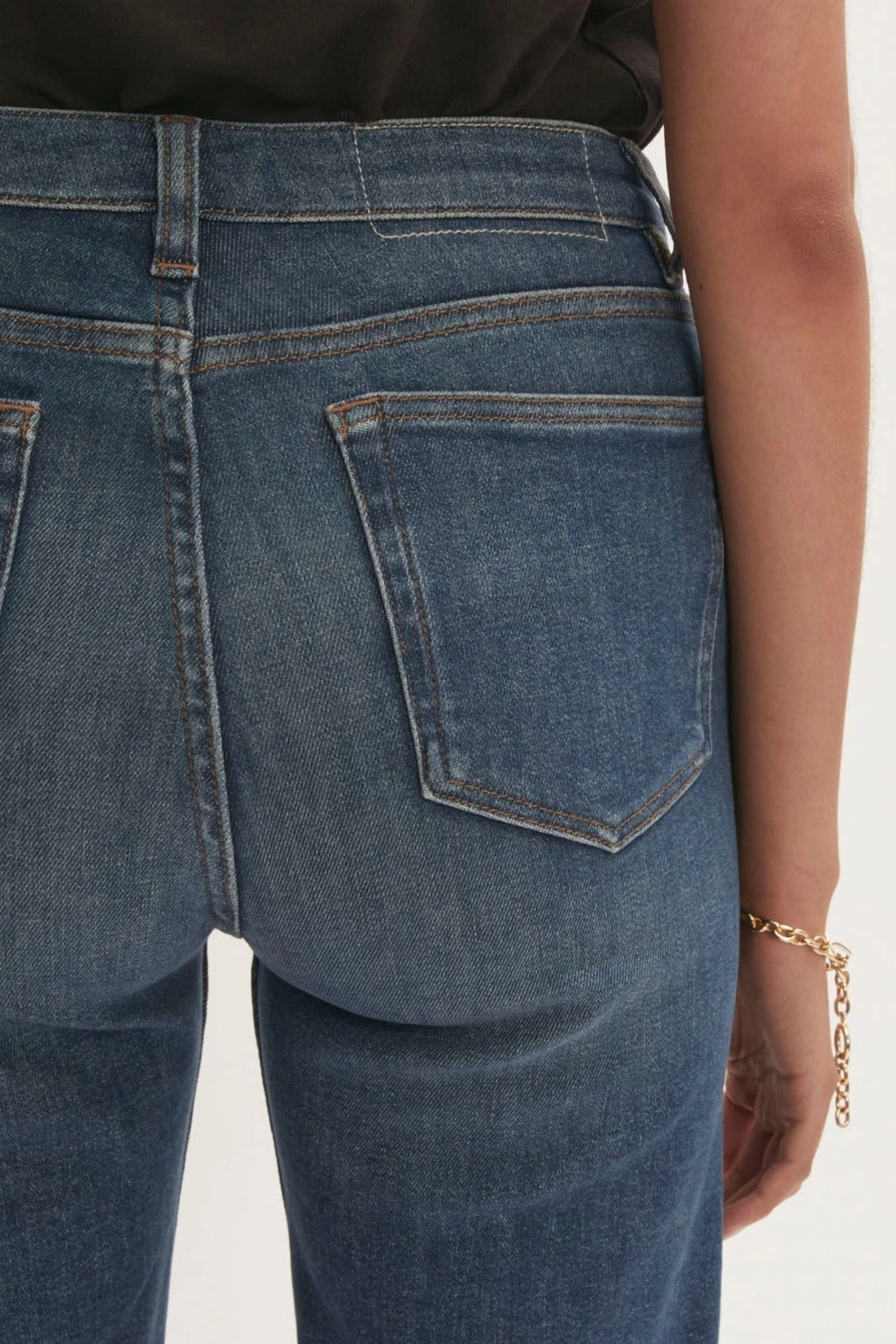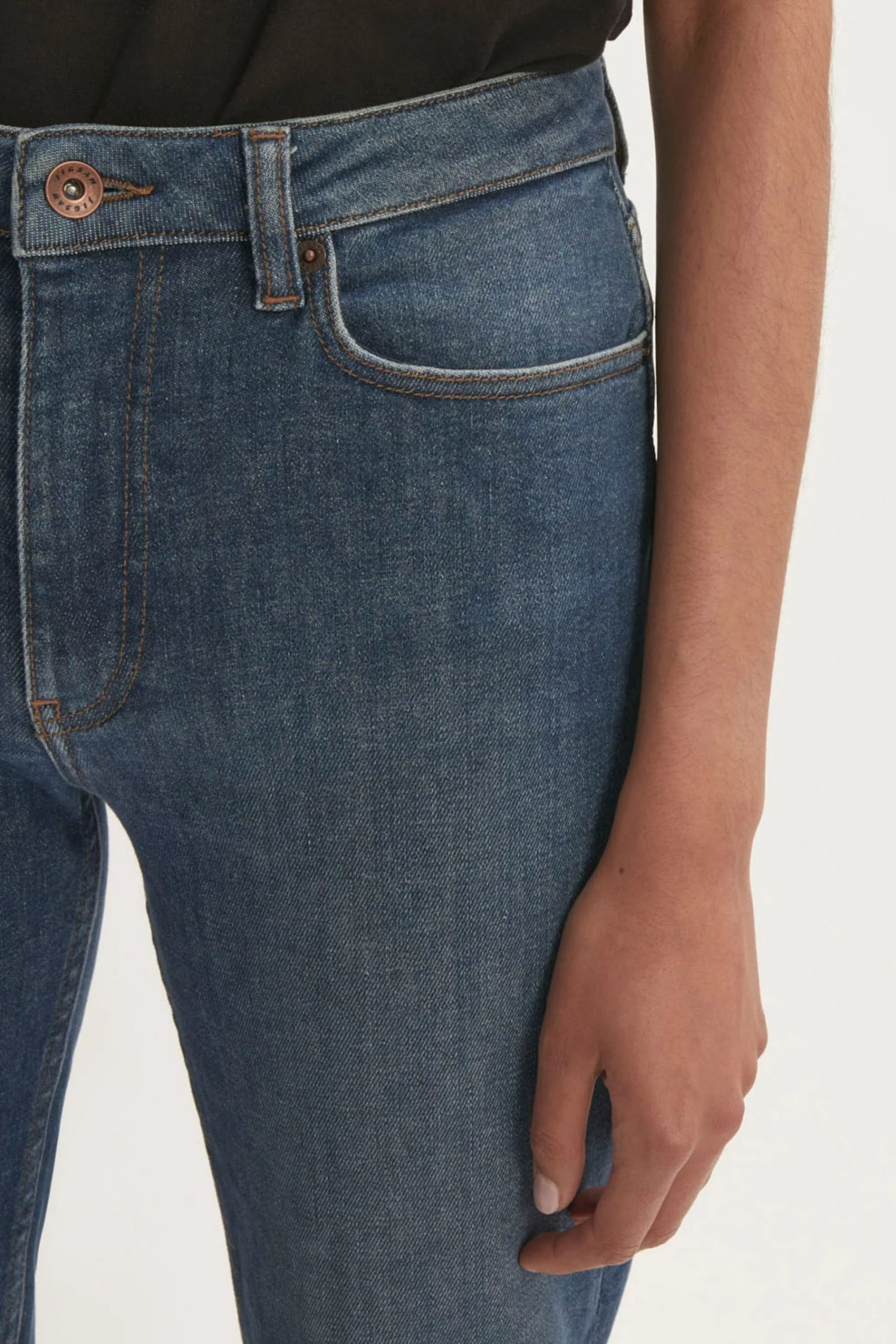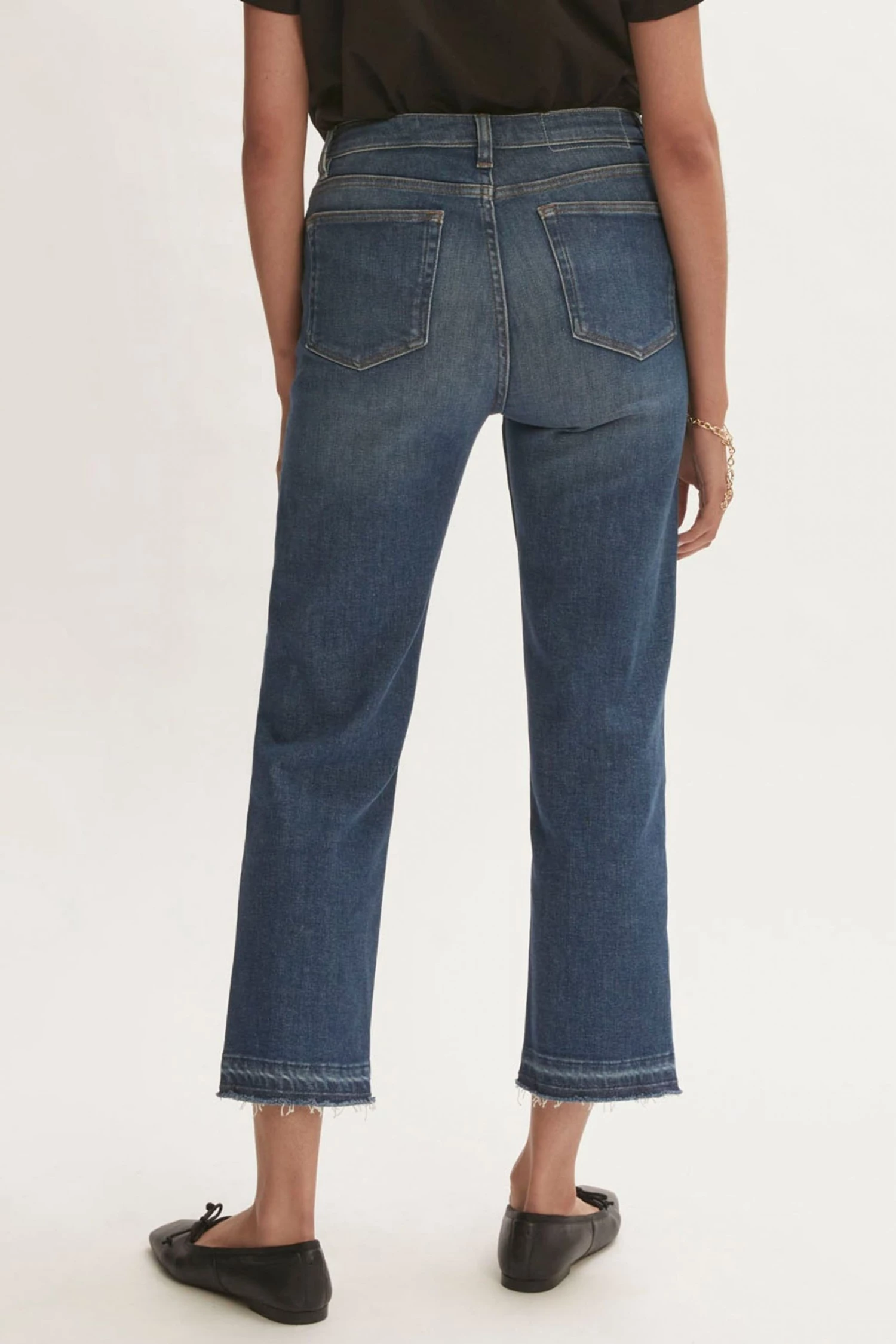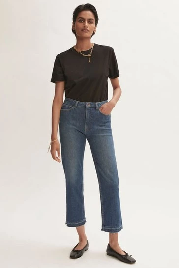 Classic mid-rise straight leg. Slim through the hips. Straight cut from hip to hem. High ankle crop length. Comfort stretch denim. Crafted in sustainable cotton, produced with recycled polyester sewing threads and zip tapes.