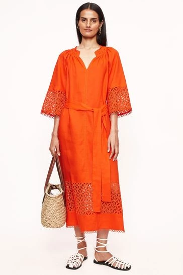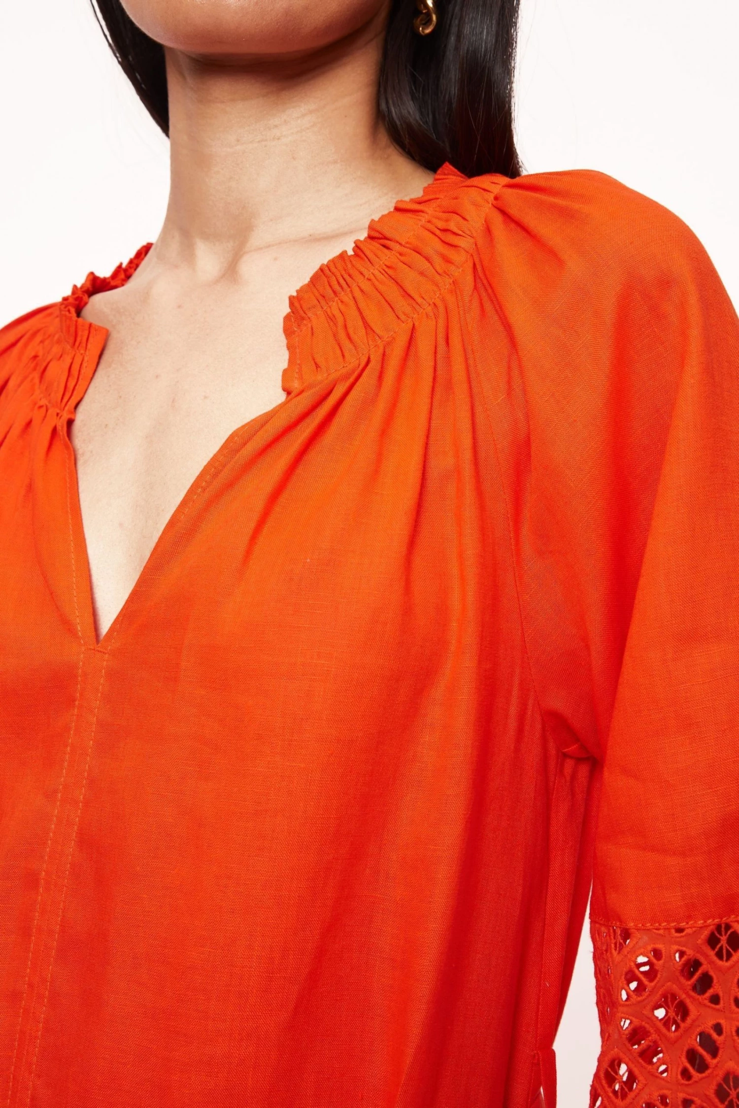 100% pure cotton and broidery anglaise dress. Loose easy fluid pop over dress with smocked neck detail and optional self tie belt. ¾ length sleeve and inserted tonal Broidery Anglaise on sleeve cuff and hem.