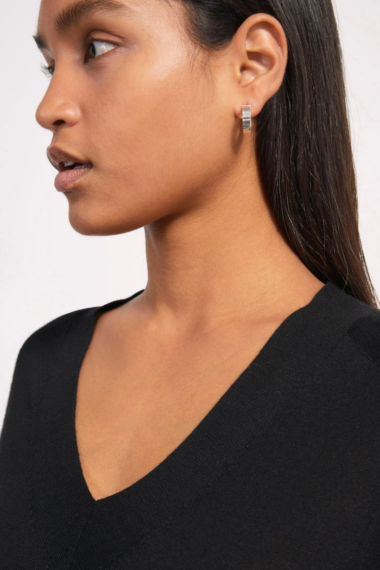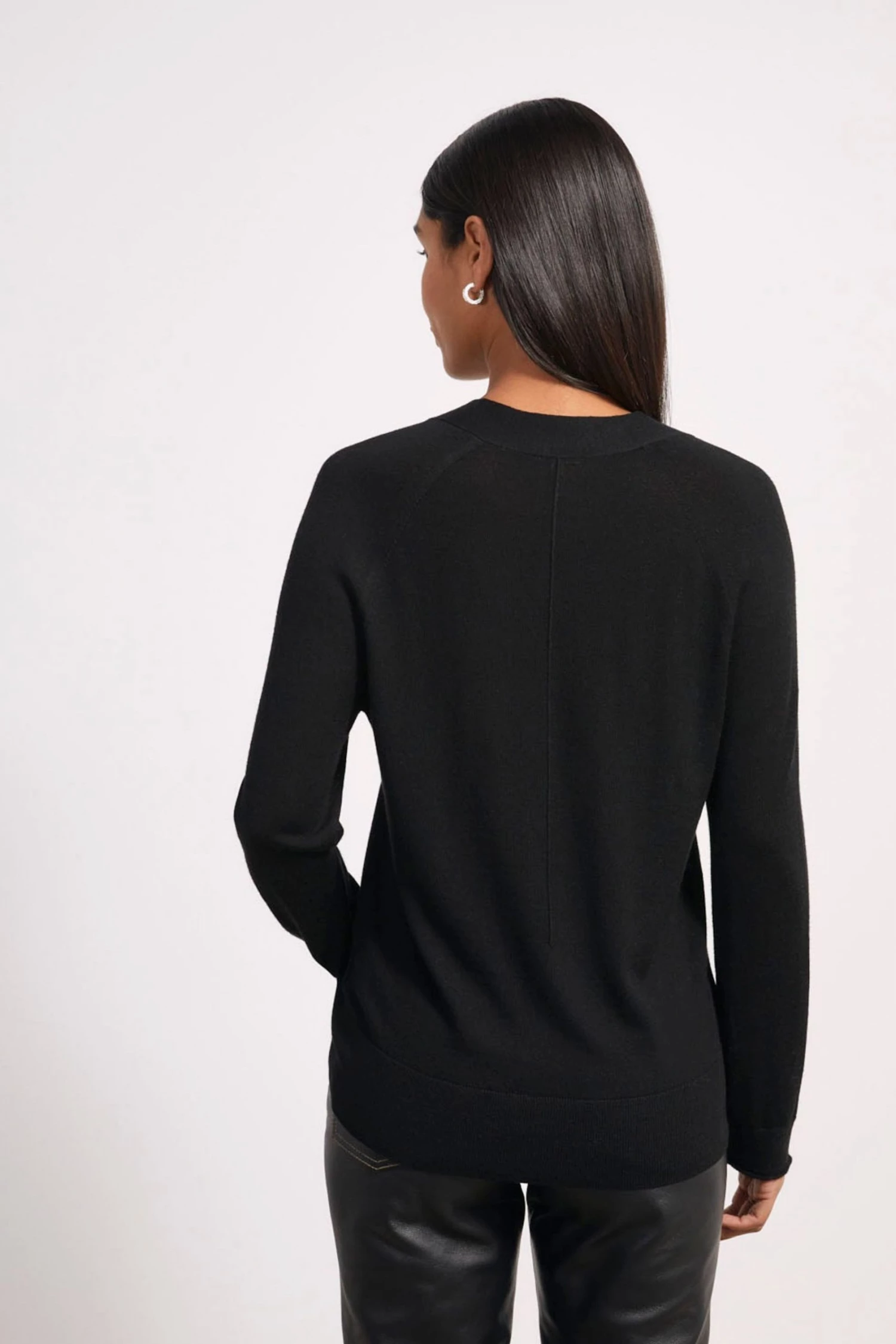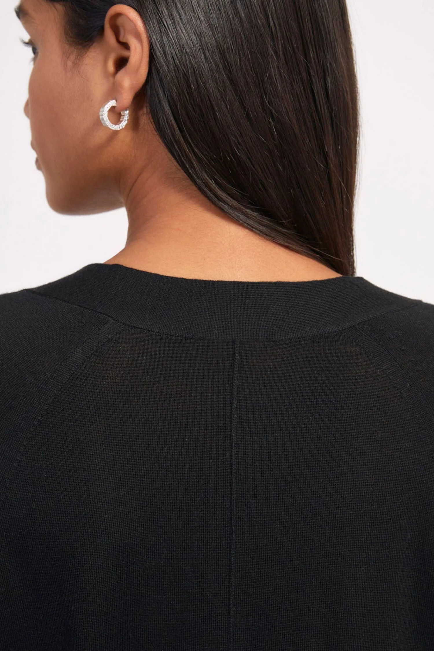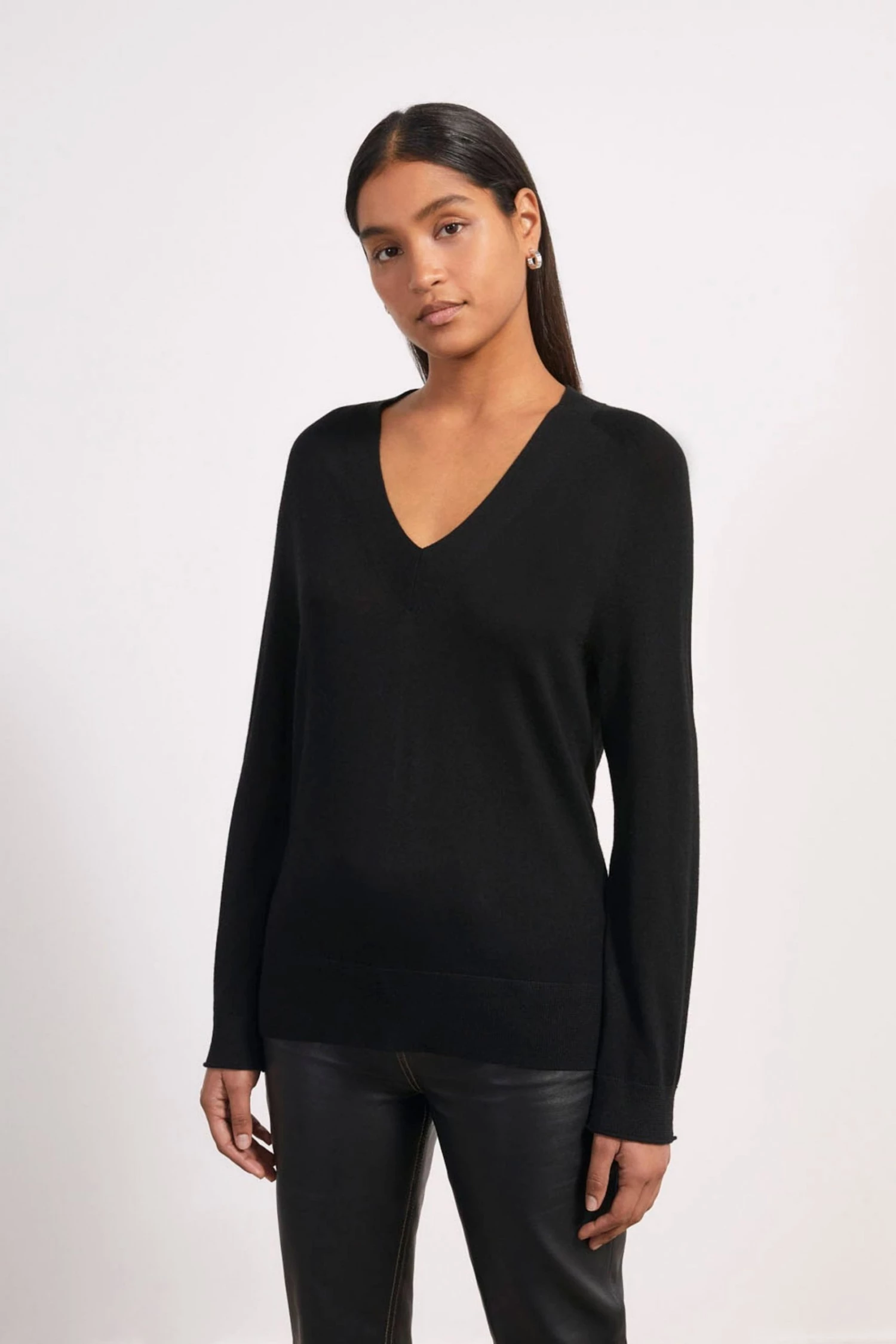 Slouchy V-neck jumper made from 100% ZQ Merino wool. Dropped shoulders, rolled edge cuffs and rib detail at the neckline and hem. Finished with exposed seam detail. Oversized fit for a warm and cosy feeling