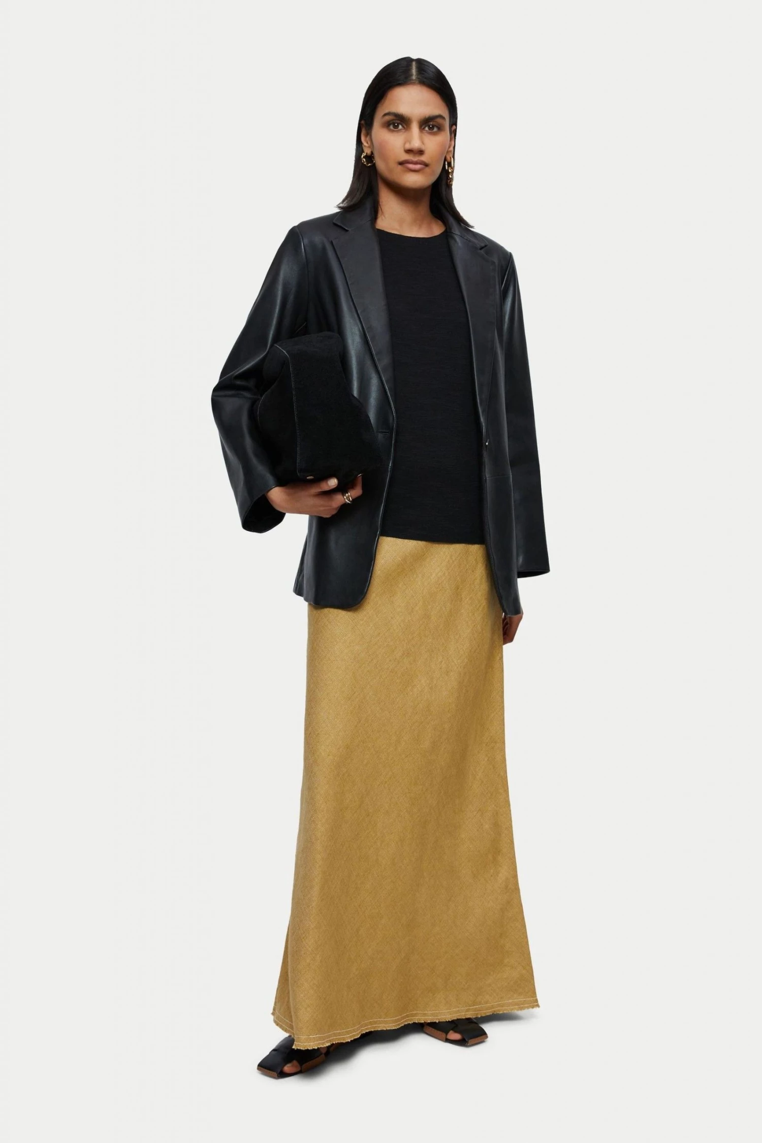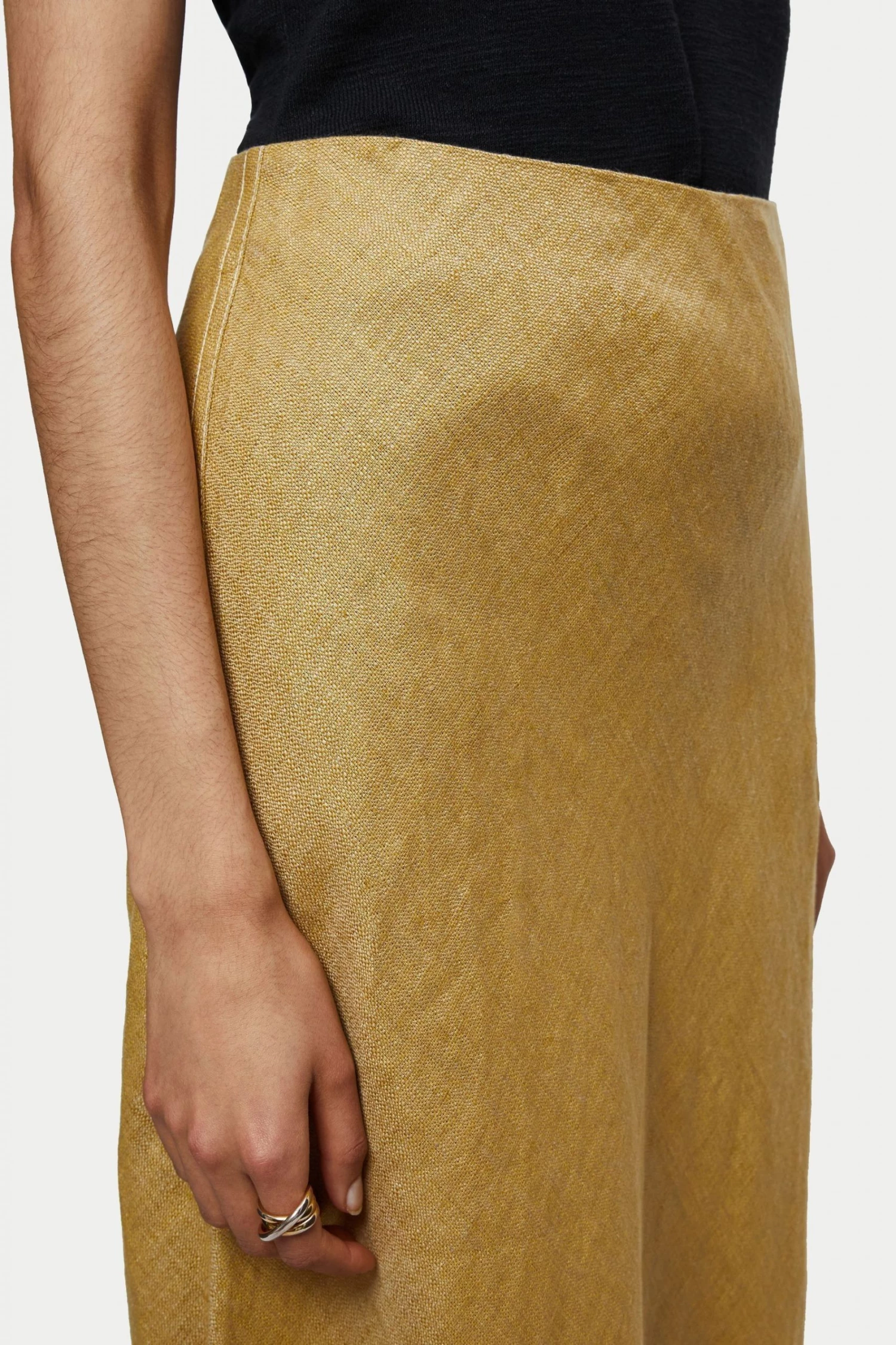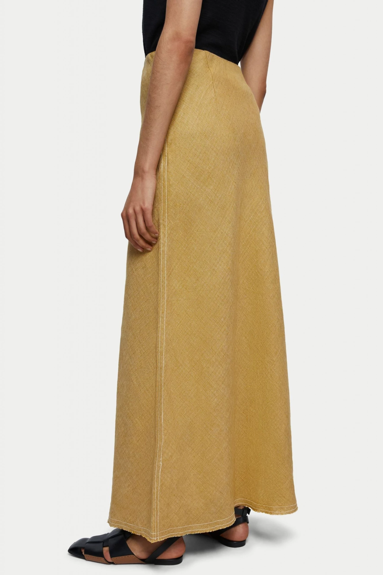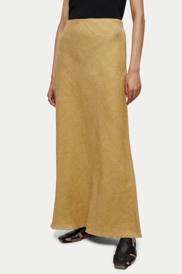 Stylish maxi skirt cut on the bias from 100% Linen with a cross dye weave. Designed with contrast twin stitch details and a raw cut hem. Features a hidden elastic waistband and invisible size zip for a comfortable fit. Style with a white T-shirt or knitted vest. This skirt is cut on the bias and has a comfy internal elasticated waist, customers may wish to size down 1 size.
